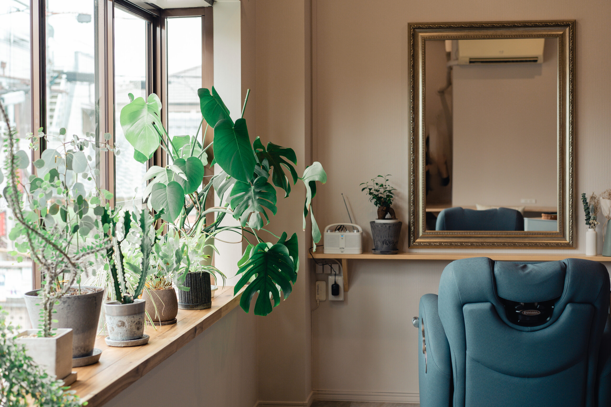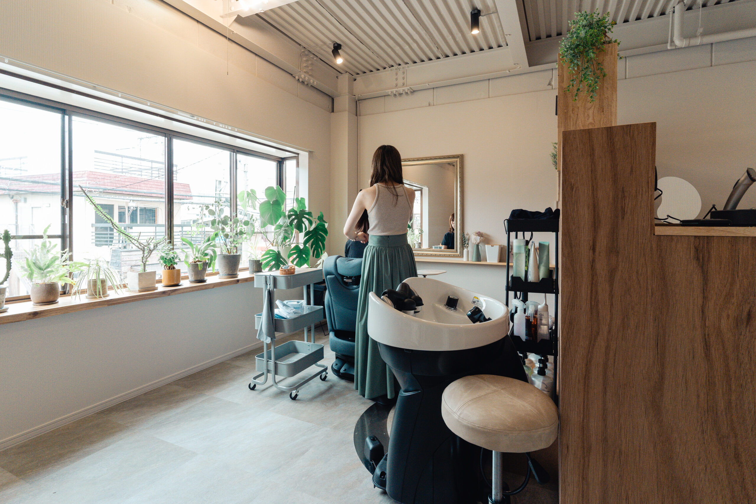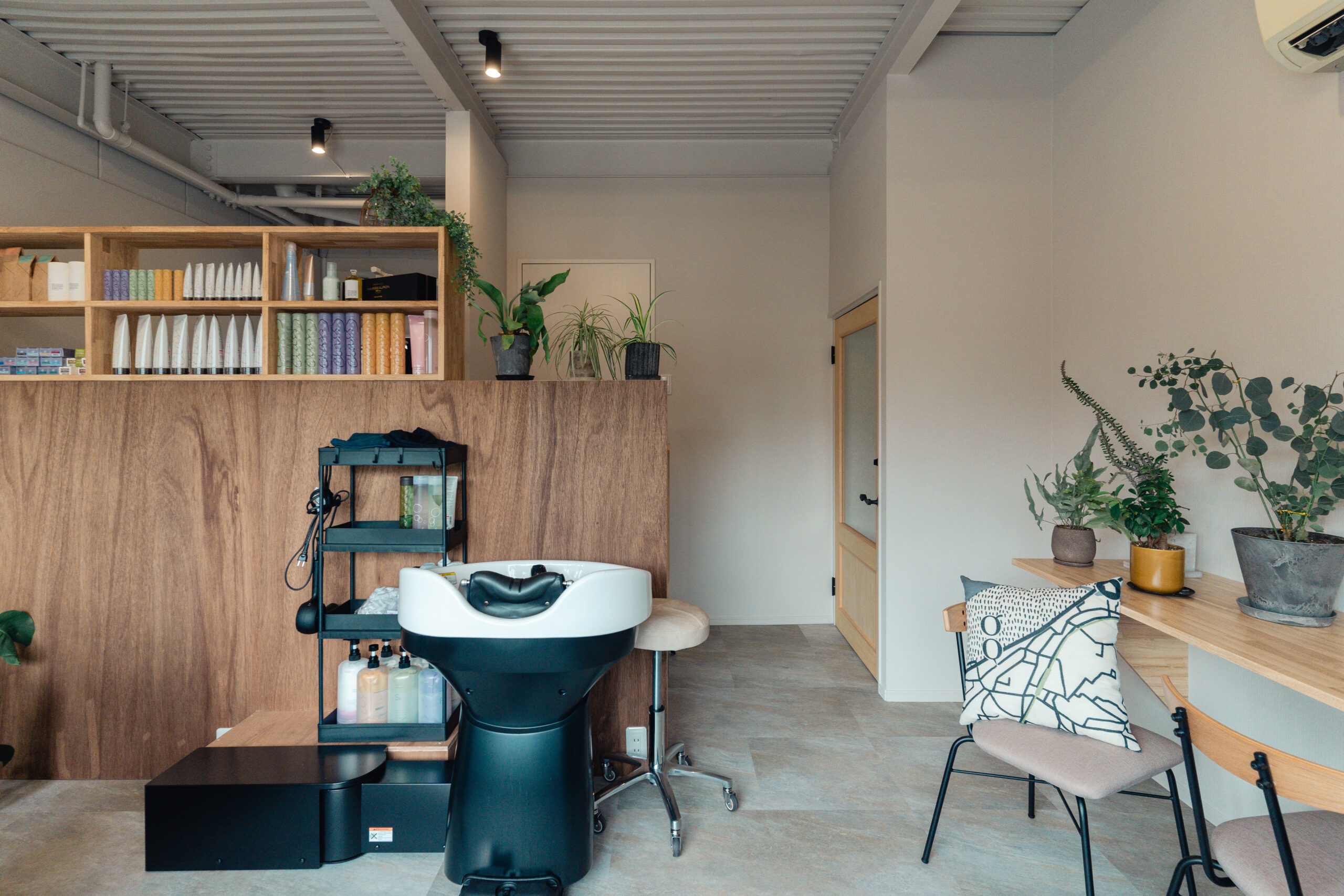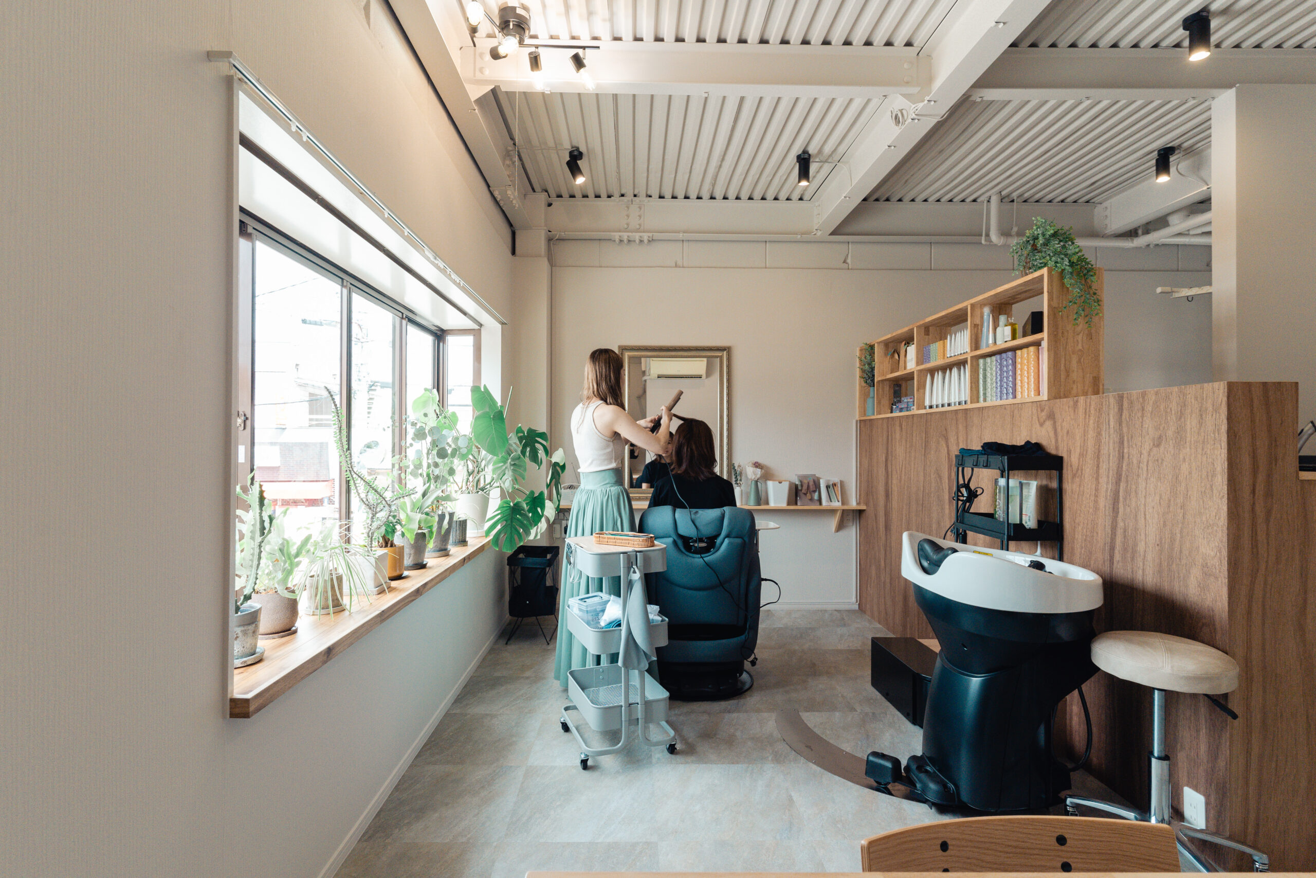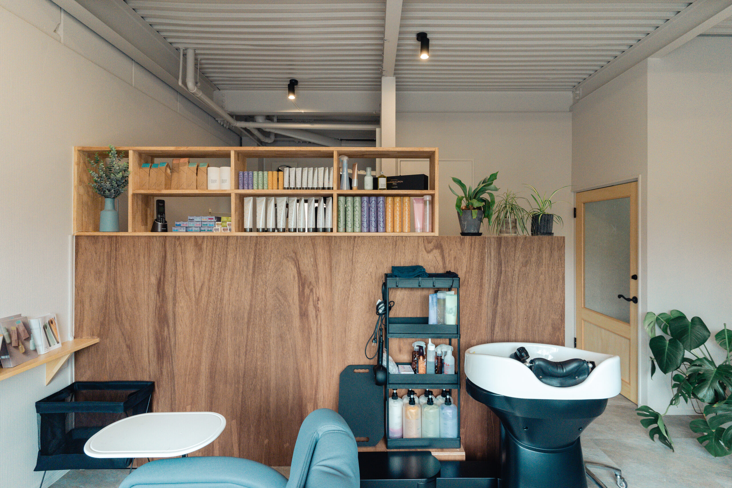 「髪を育てる美容室」をコンセプトにお客様の髪の悩みに寄り添えるサロンにしたいという想いを伺い、店内は既存を残しながらも温かみのあるホワイトで塗装、ラワン合板で造作した家具や無垢材を使用することでリラックスできる空間を目指しました。