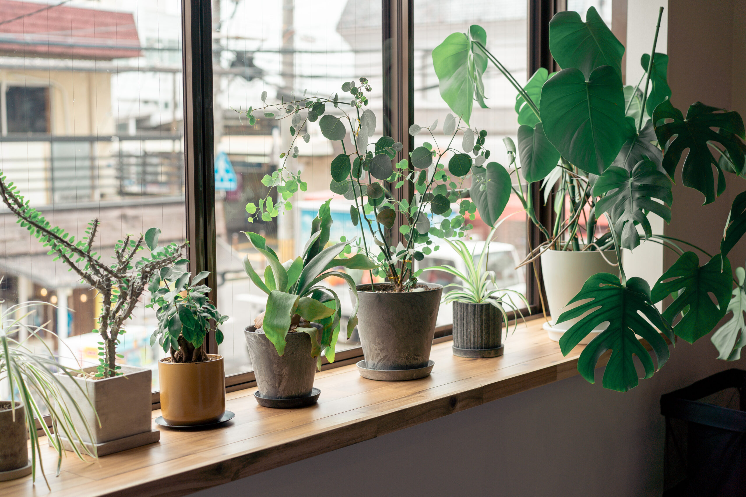 窓際の植物がよく育ち優しい光が注がれる場所は、お客様をご案内する席に。