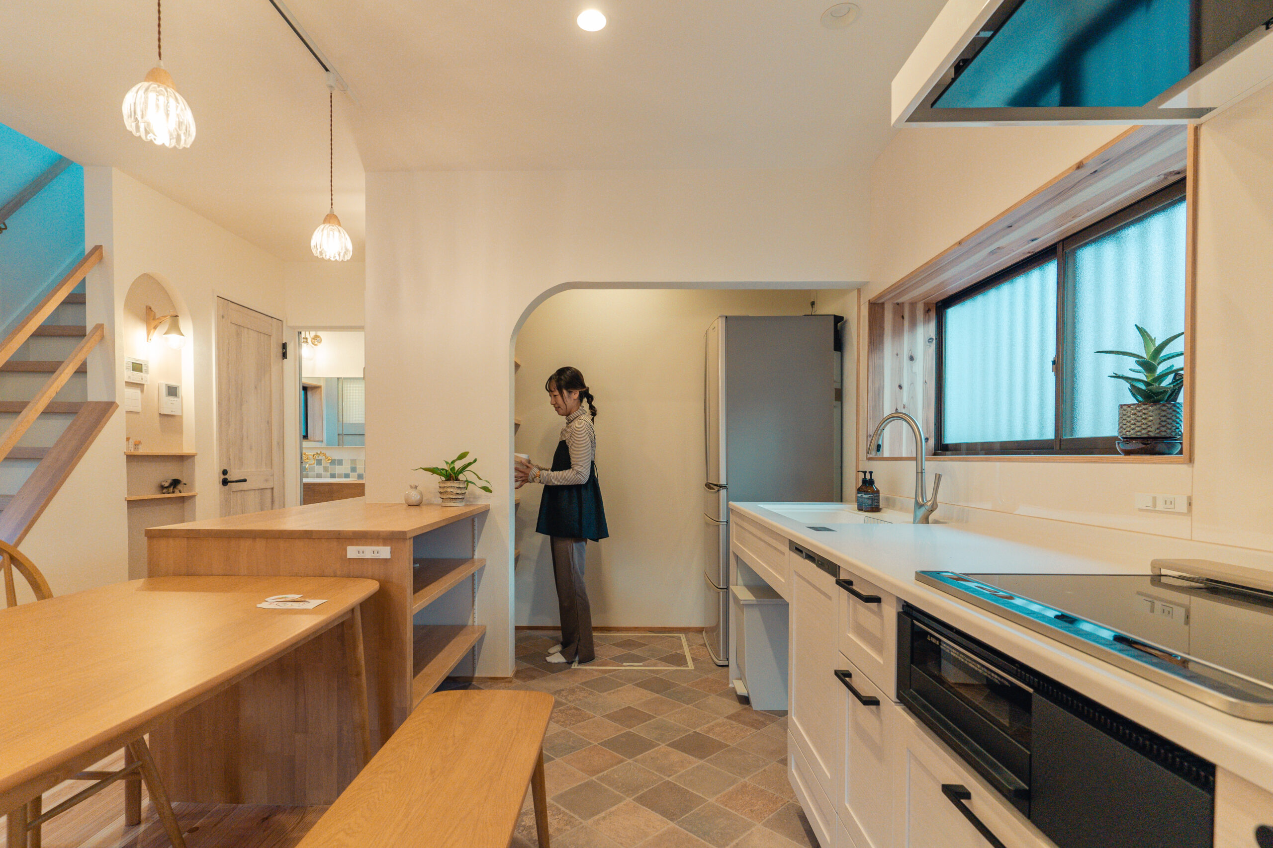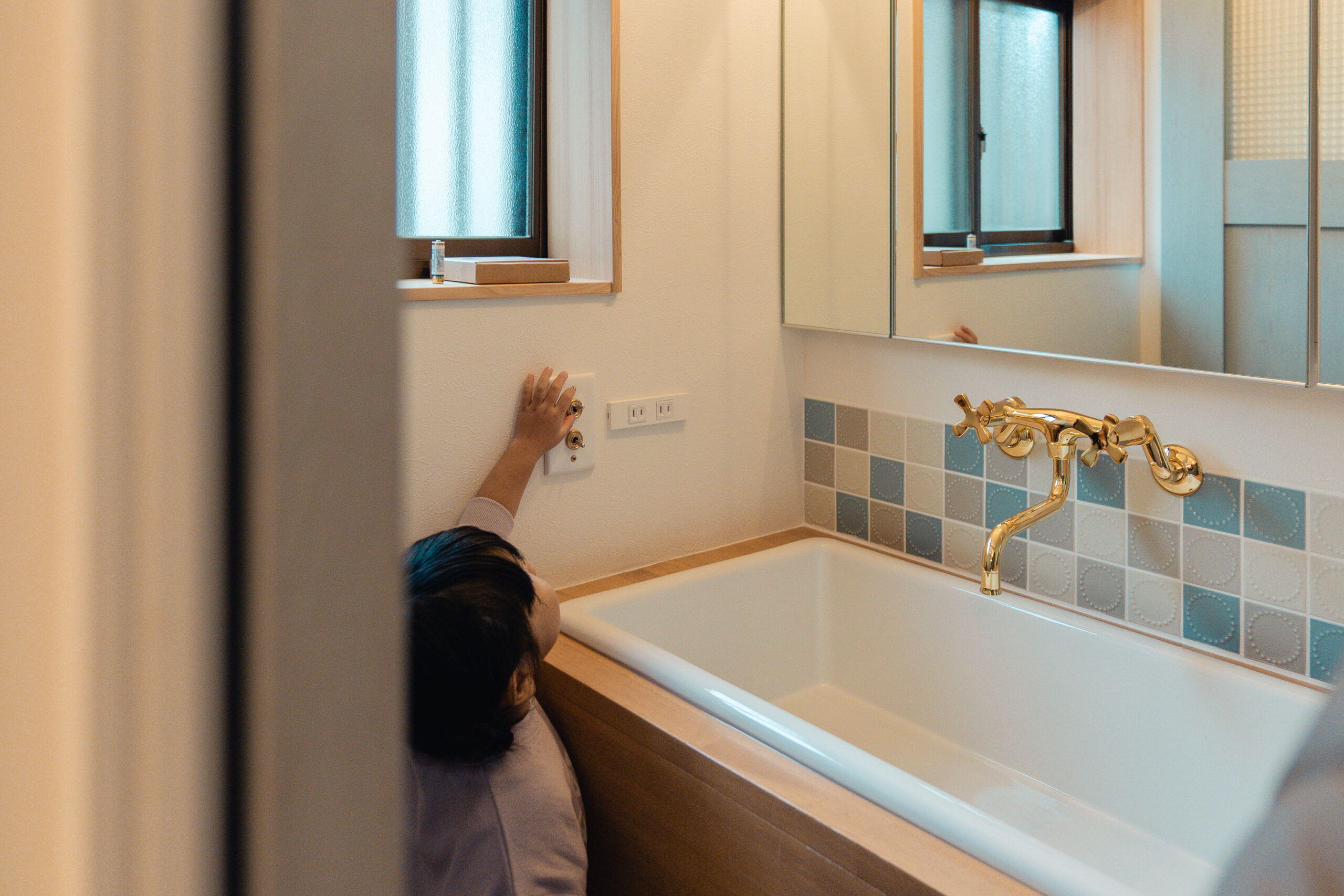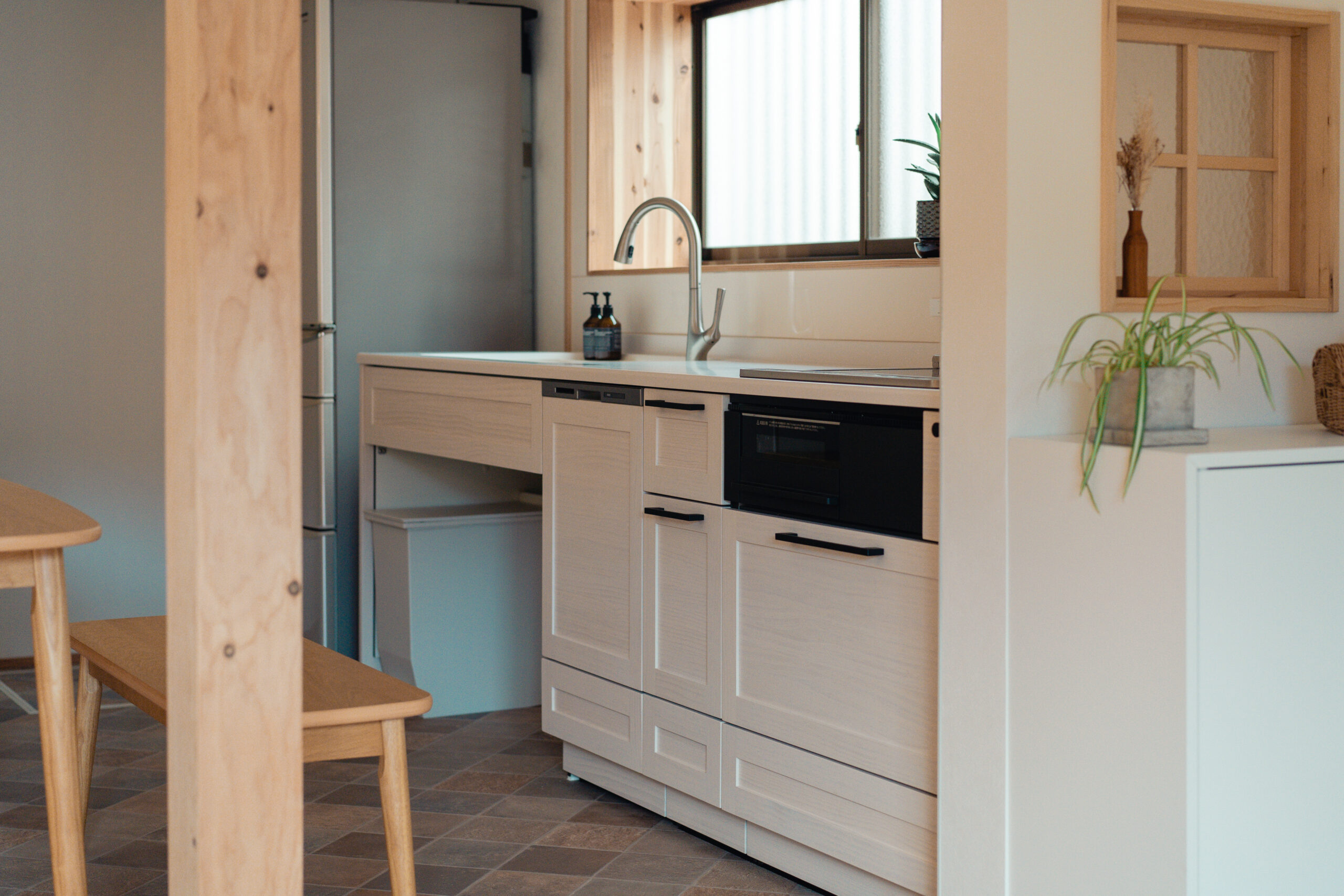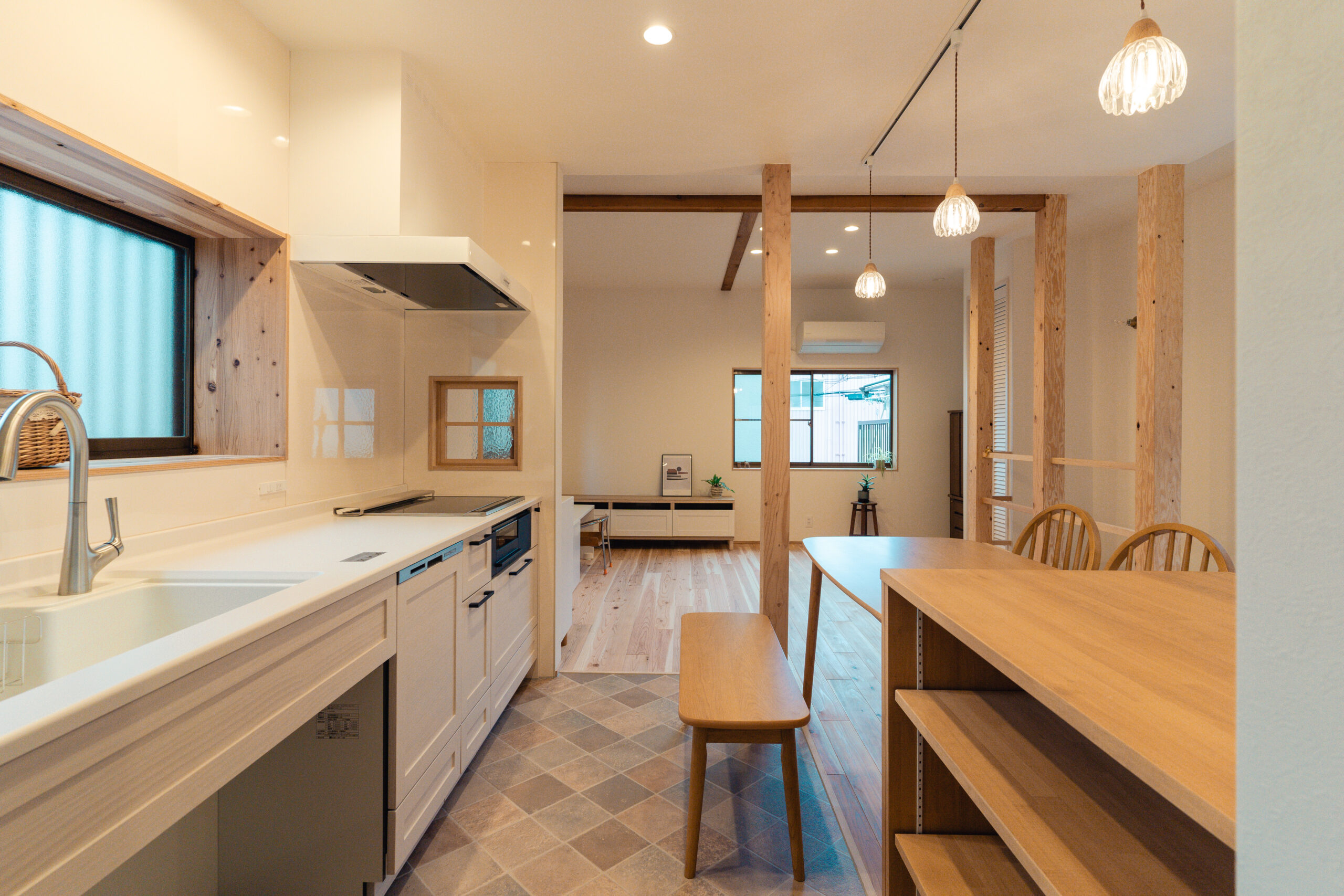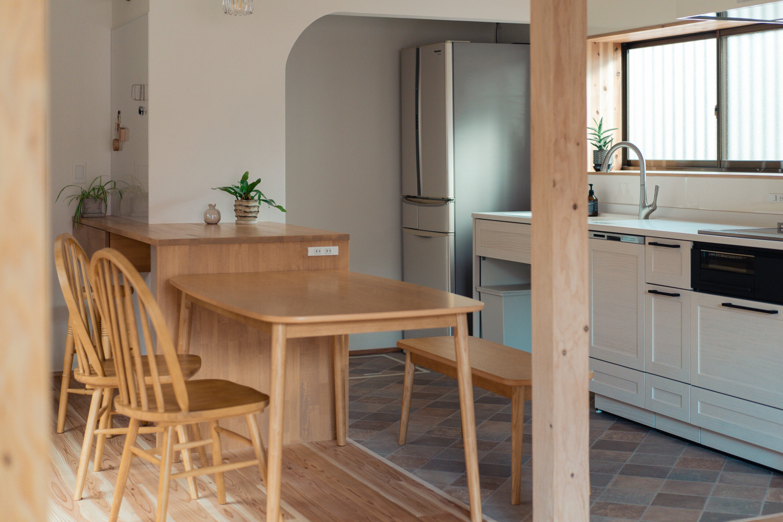 2階は家族の中心となるLDKです。LDKは壁をなくして、広々とした開放的な空間。元々一階にあった寒くて暗いお風呂は、断熱工事を施し2階に移動させました。お風呂と洗面所はLDKとつながっており、家事の効率を高めるとともに、家族が自然と集まりやすい配置とりました。ところどころ奥様の好みが取り入れられた可愛らしい空間となりました。