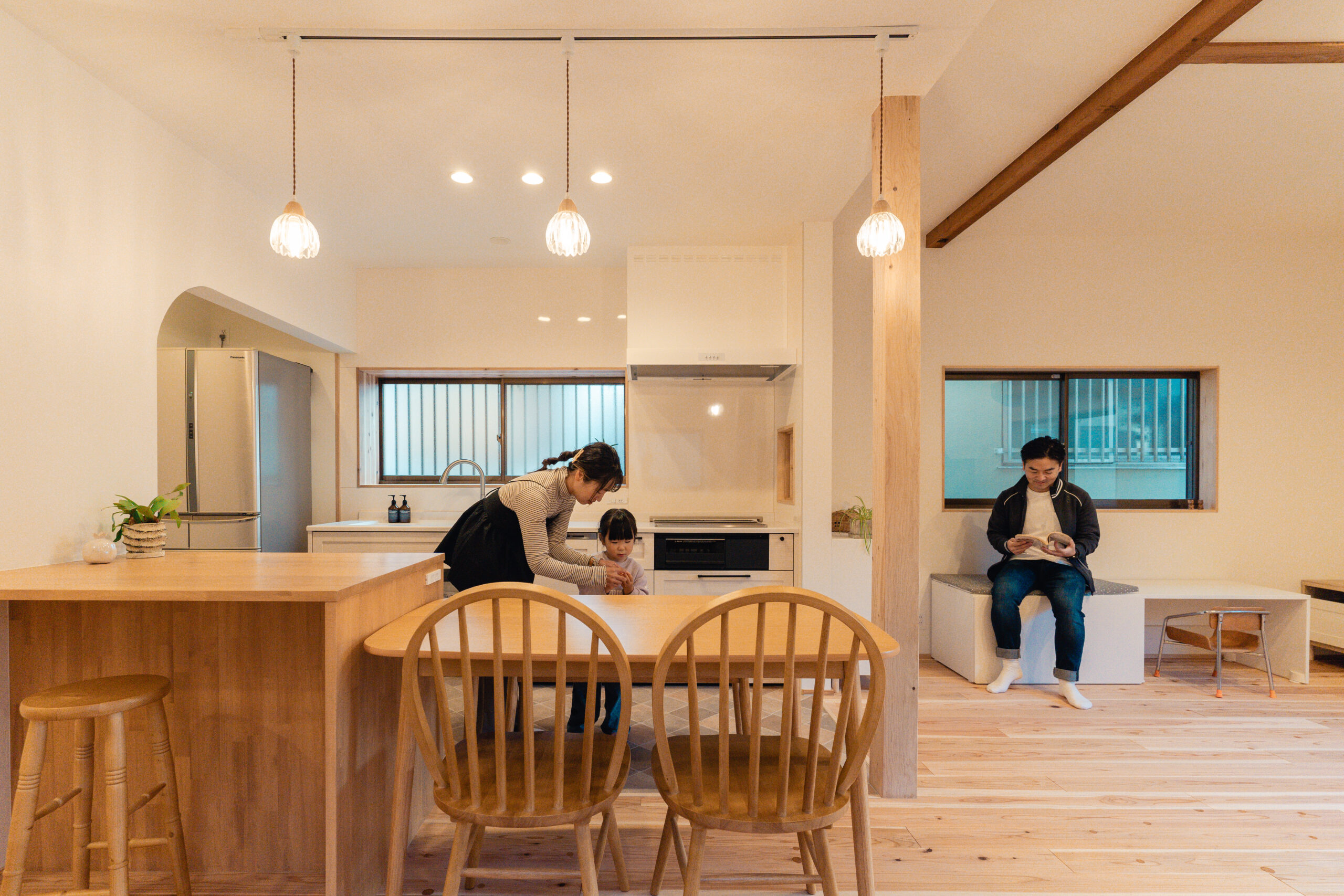 33年ほど前に建てられた木造家屋を現代の生活スタイルに合わせて改装しました。建物は3階建てで、ご両親から受け継いだものでした。夫婦はこの家に木のぬくもりと手触りを残しつつ、優しい雰囲気を持つ自分たち家族のための住まいを新たに作りました。