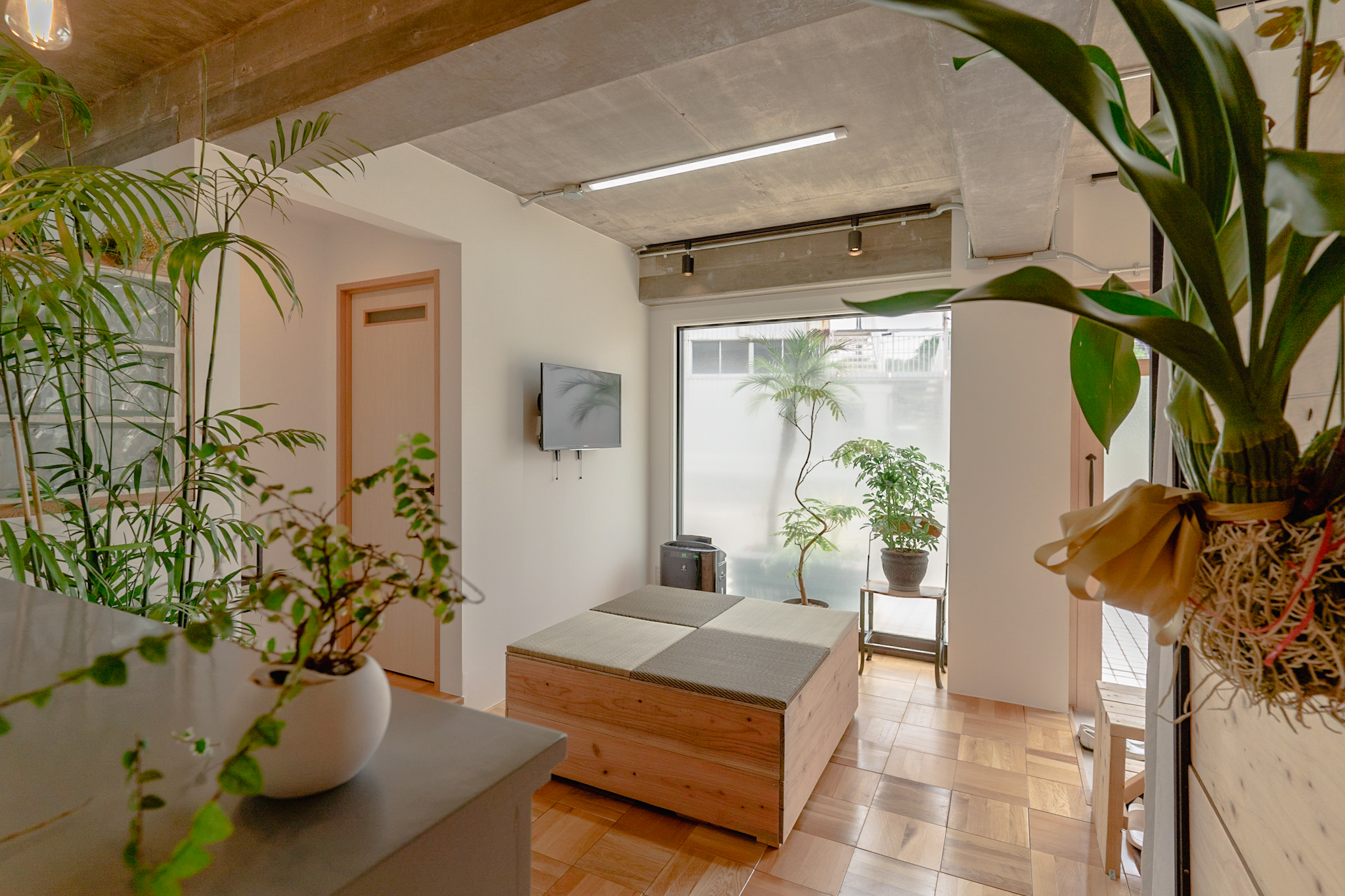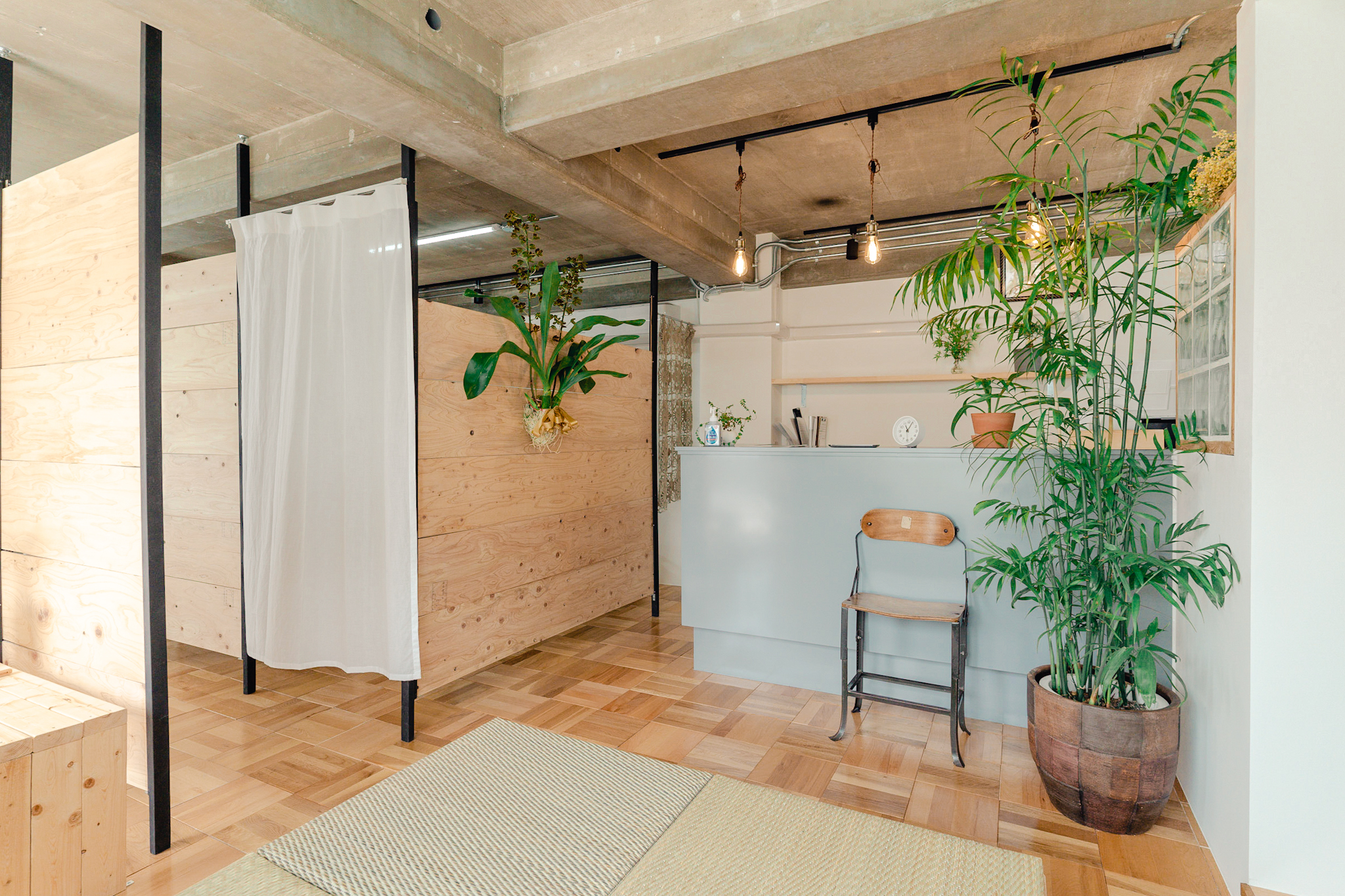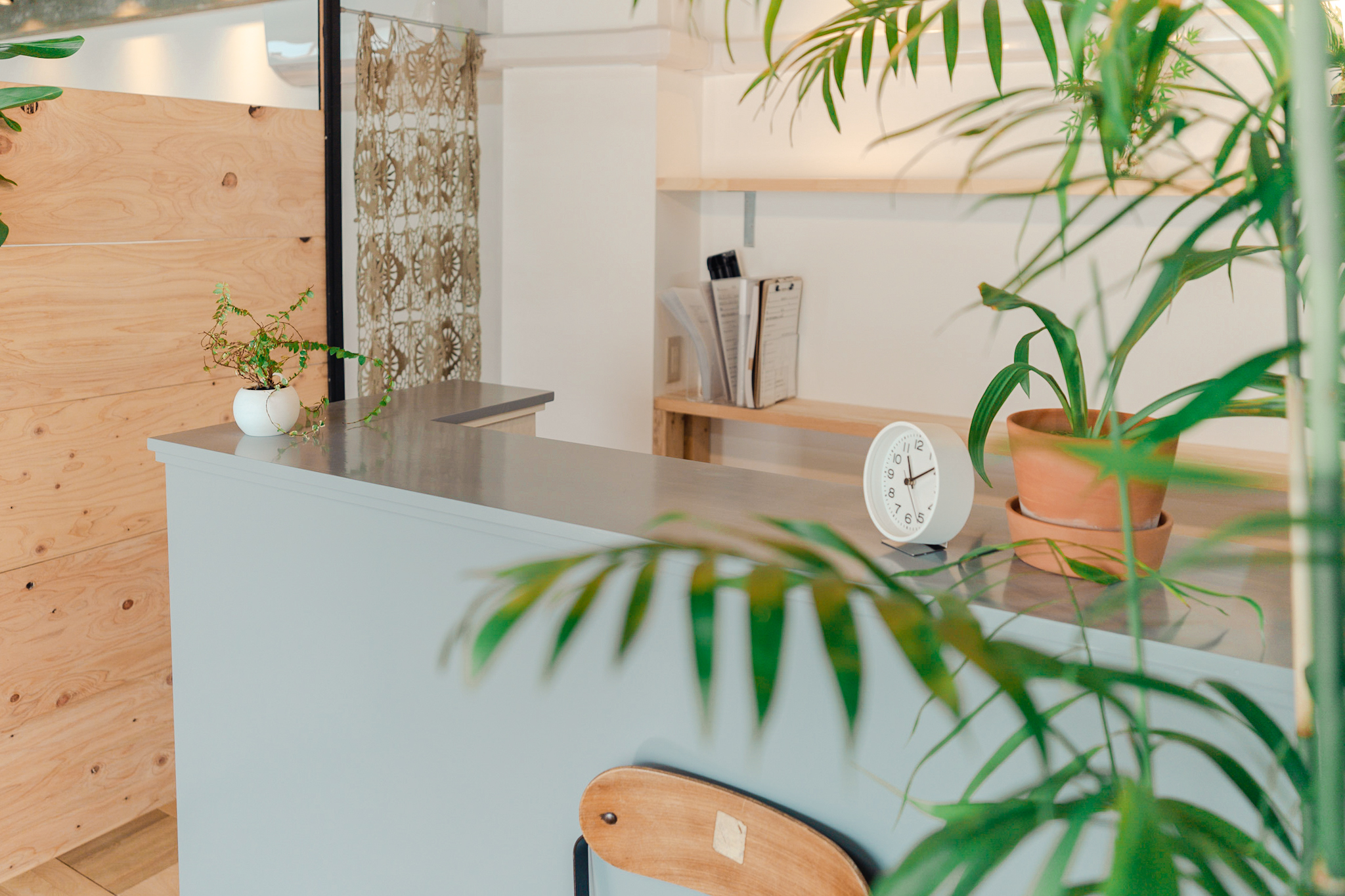 コンクリートの無骨な質感と木目や観葉植物の温かさが、来院されるお客様にとっても心地いい空間に仕上がったと感じています。