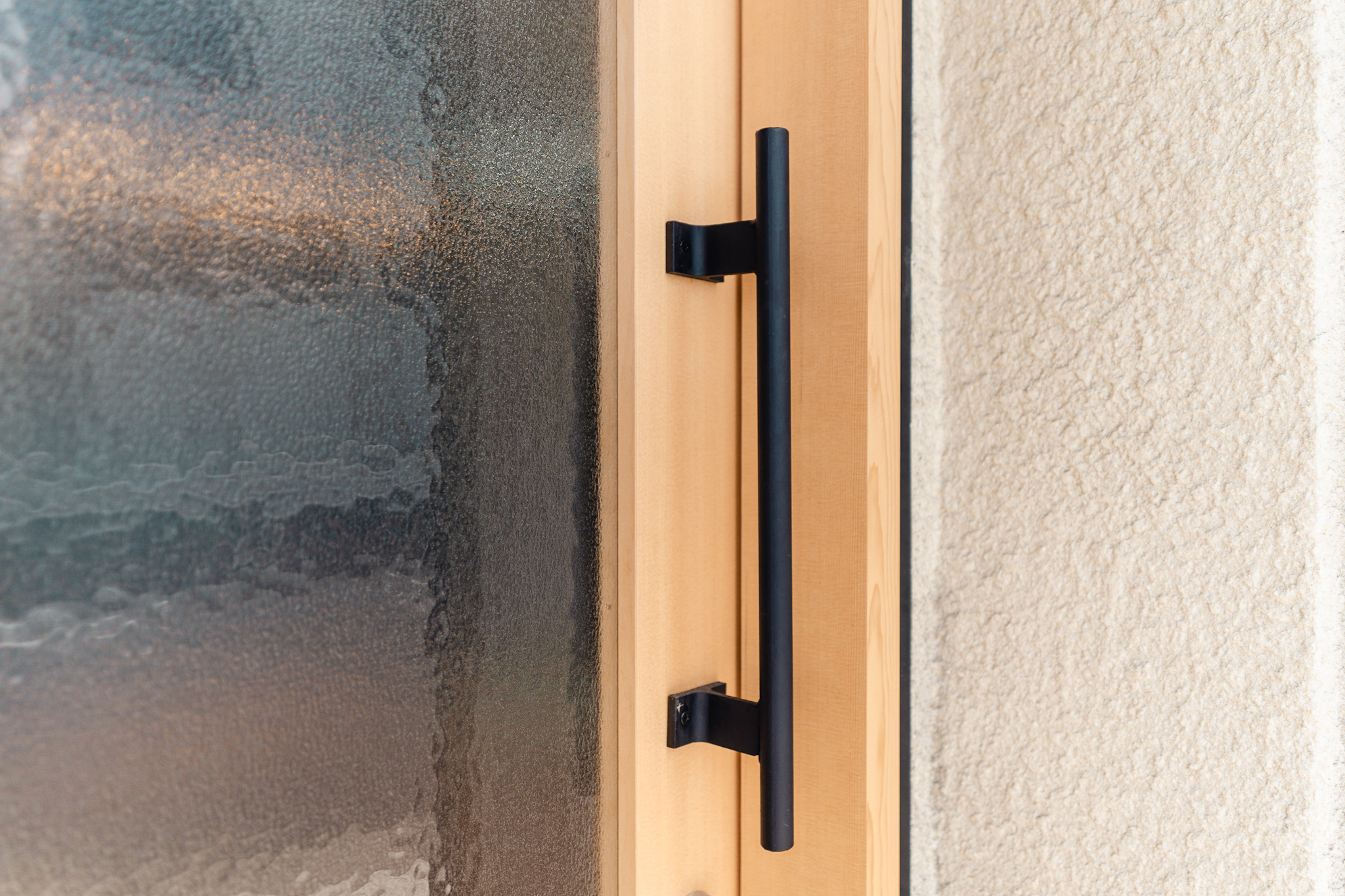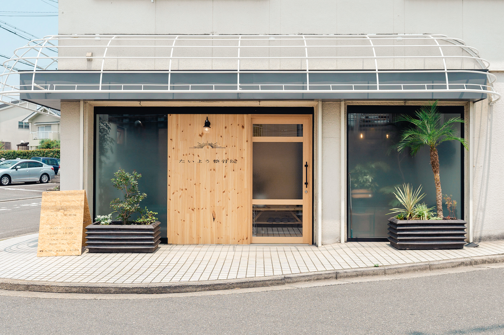 前面道路に対して2面がガラス張りとなっている外観を一部板張りとし、治療に来られる患者さんのプライバシーに配慮しました。