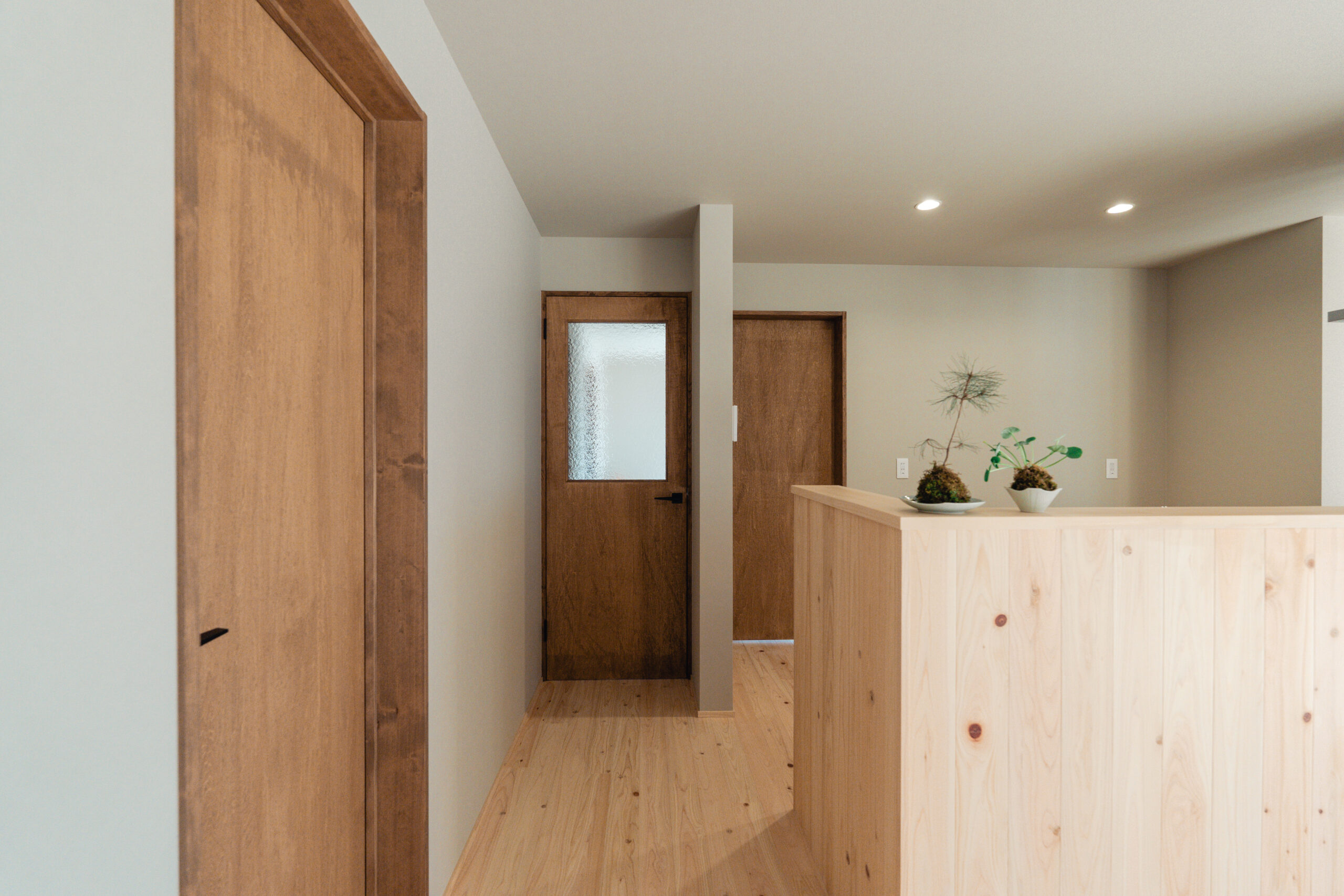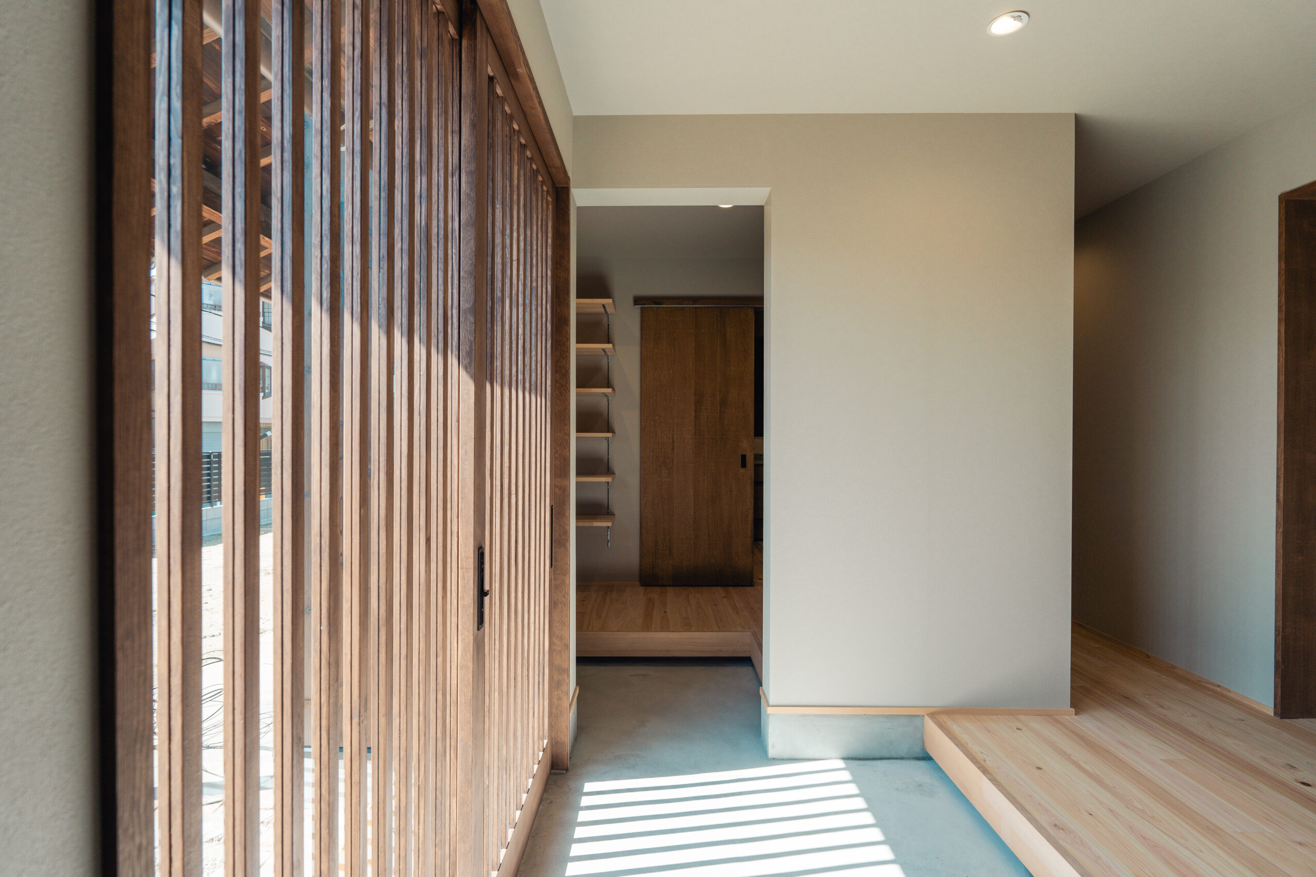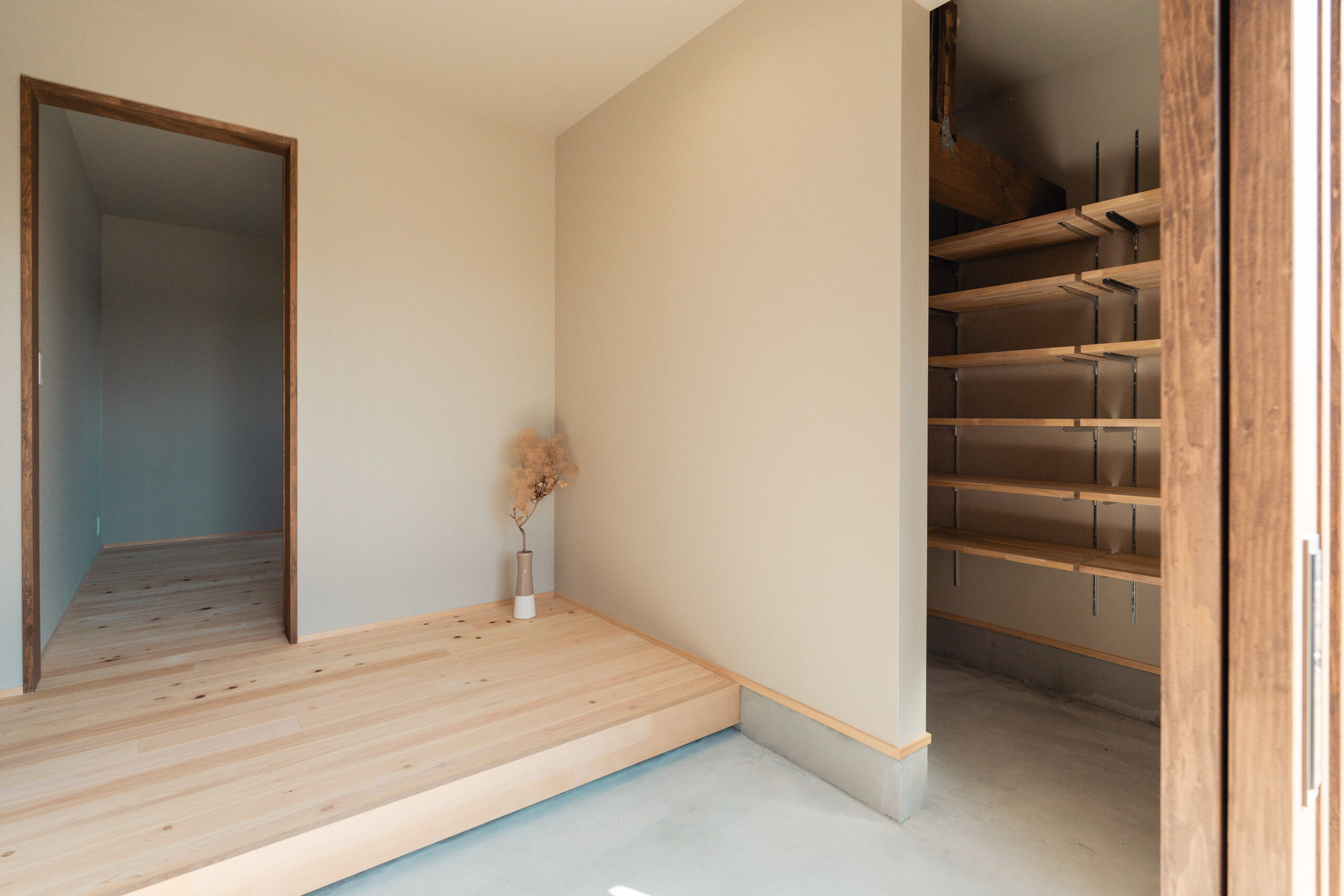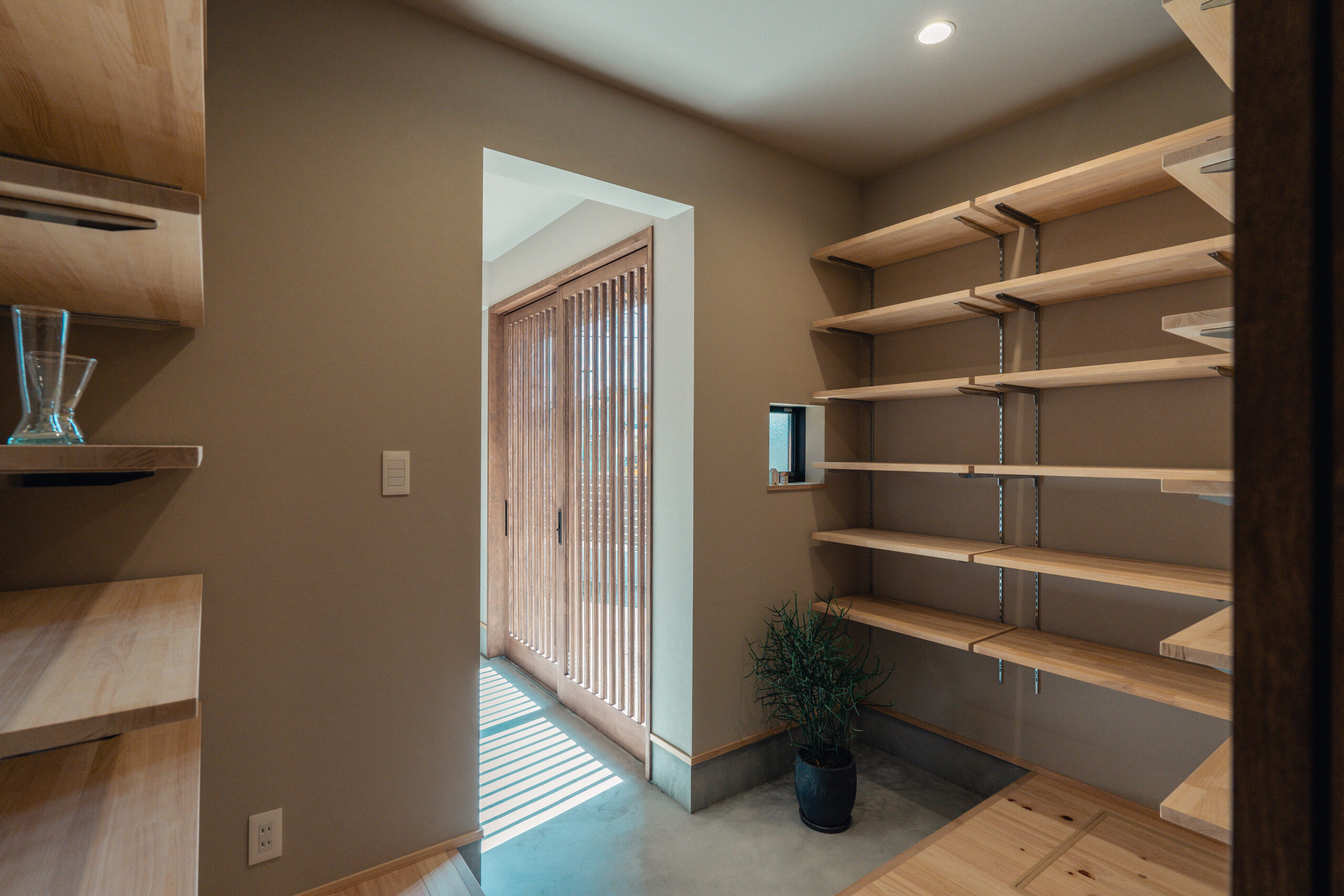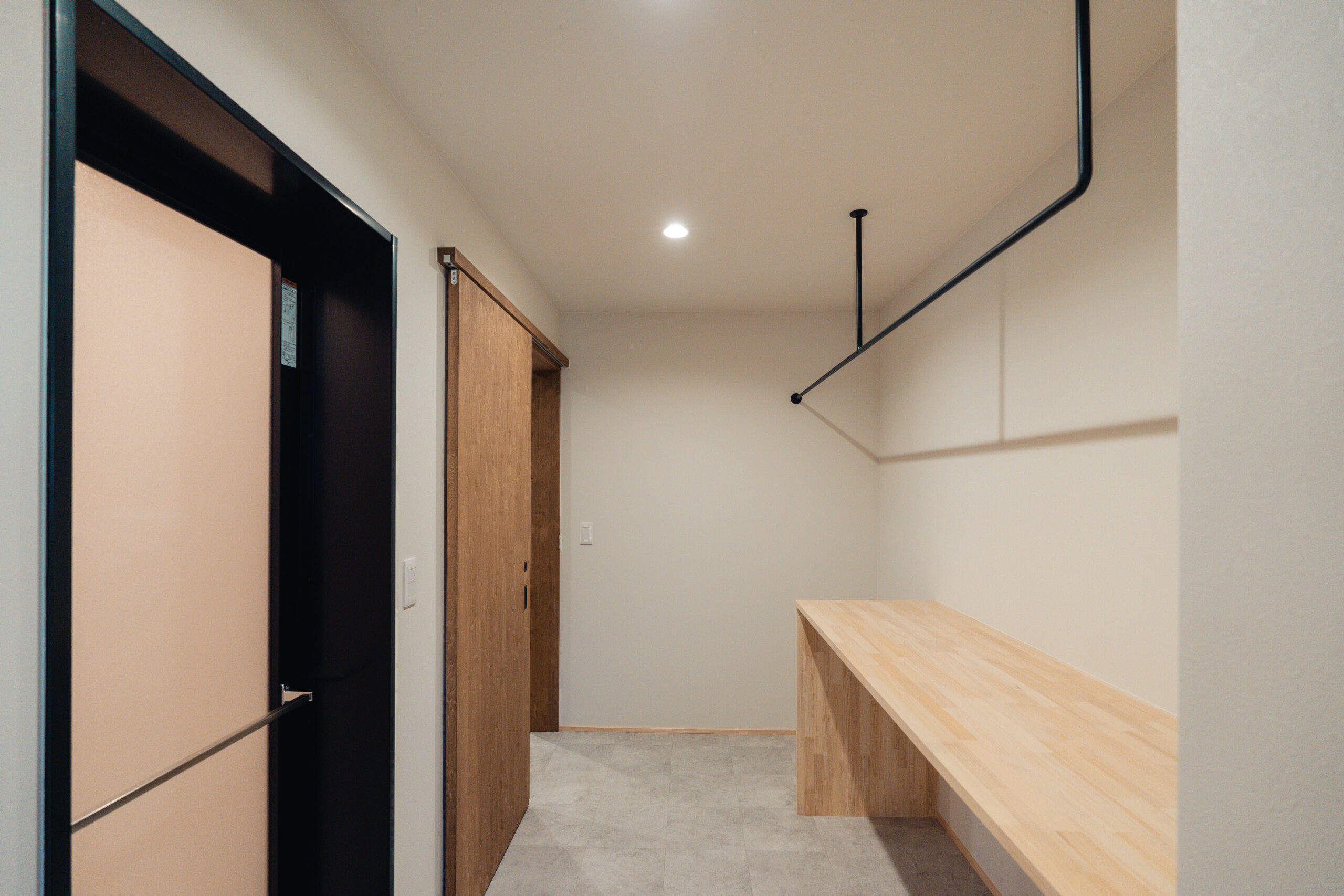 玄関から左右に土間収納を設け、左手の土間収納からはキッチンにつながっており、家事をスムーズに行うための導線が生まれています。