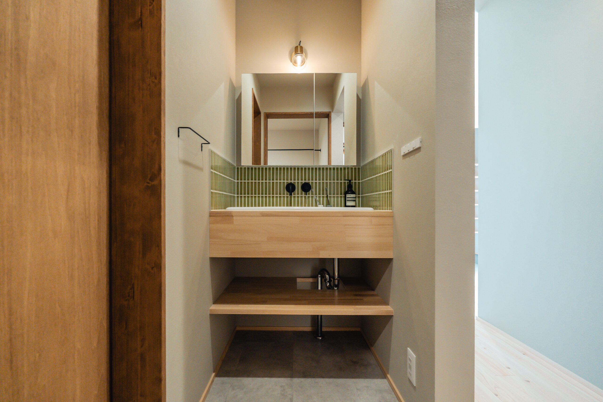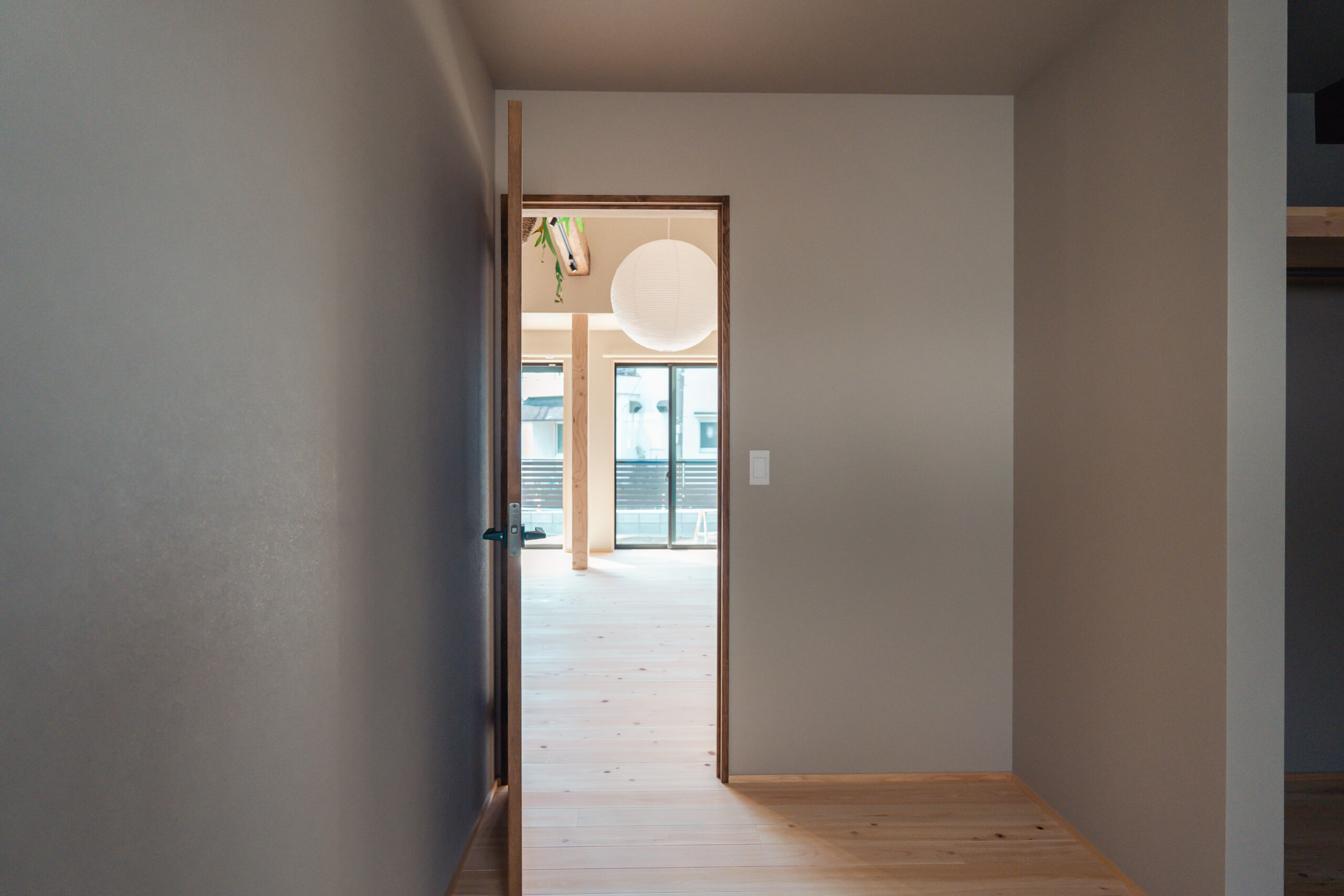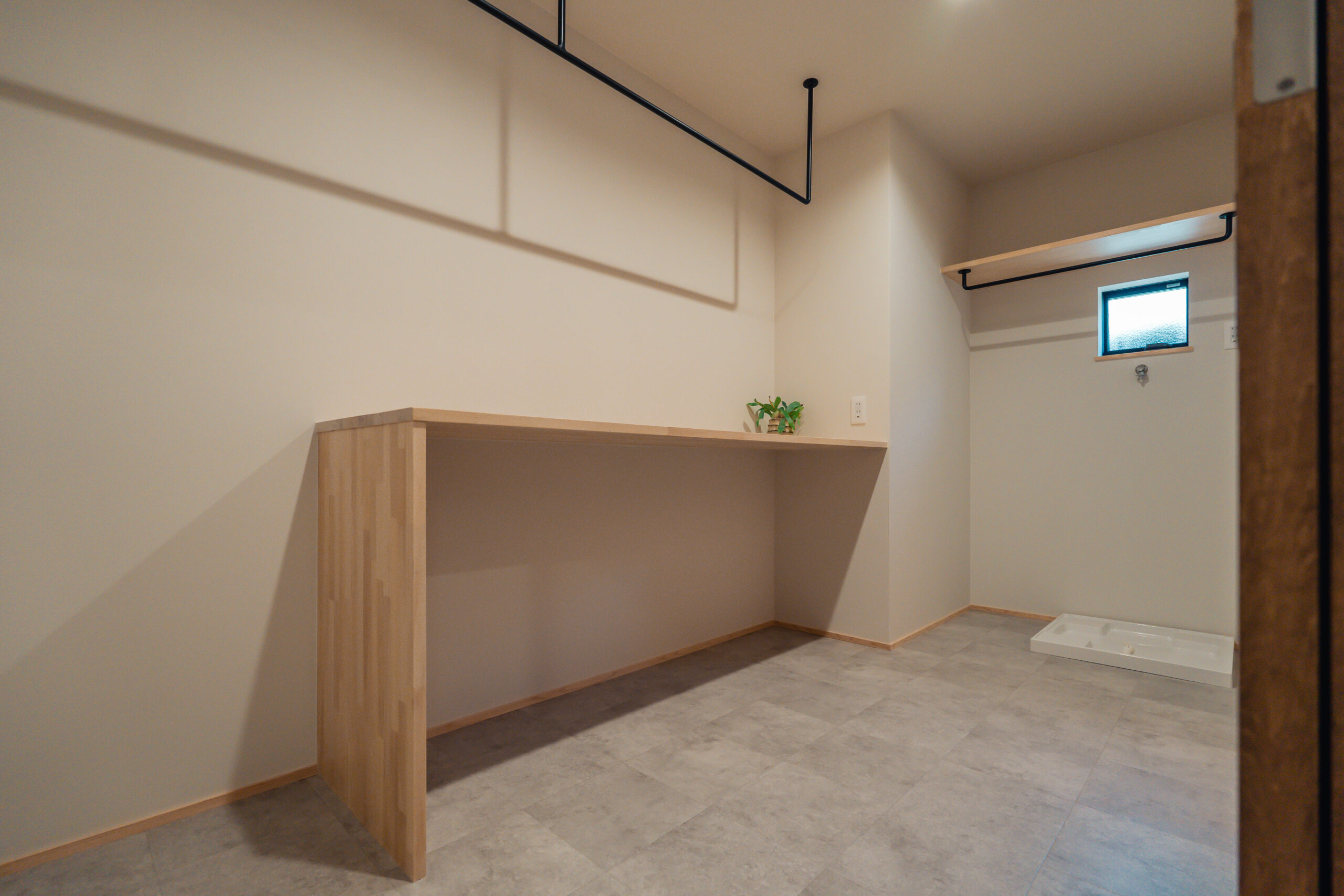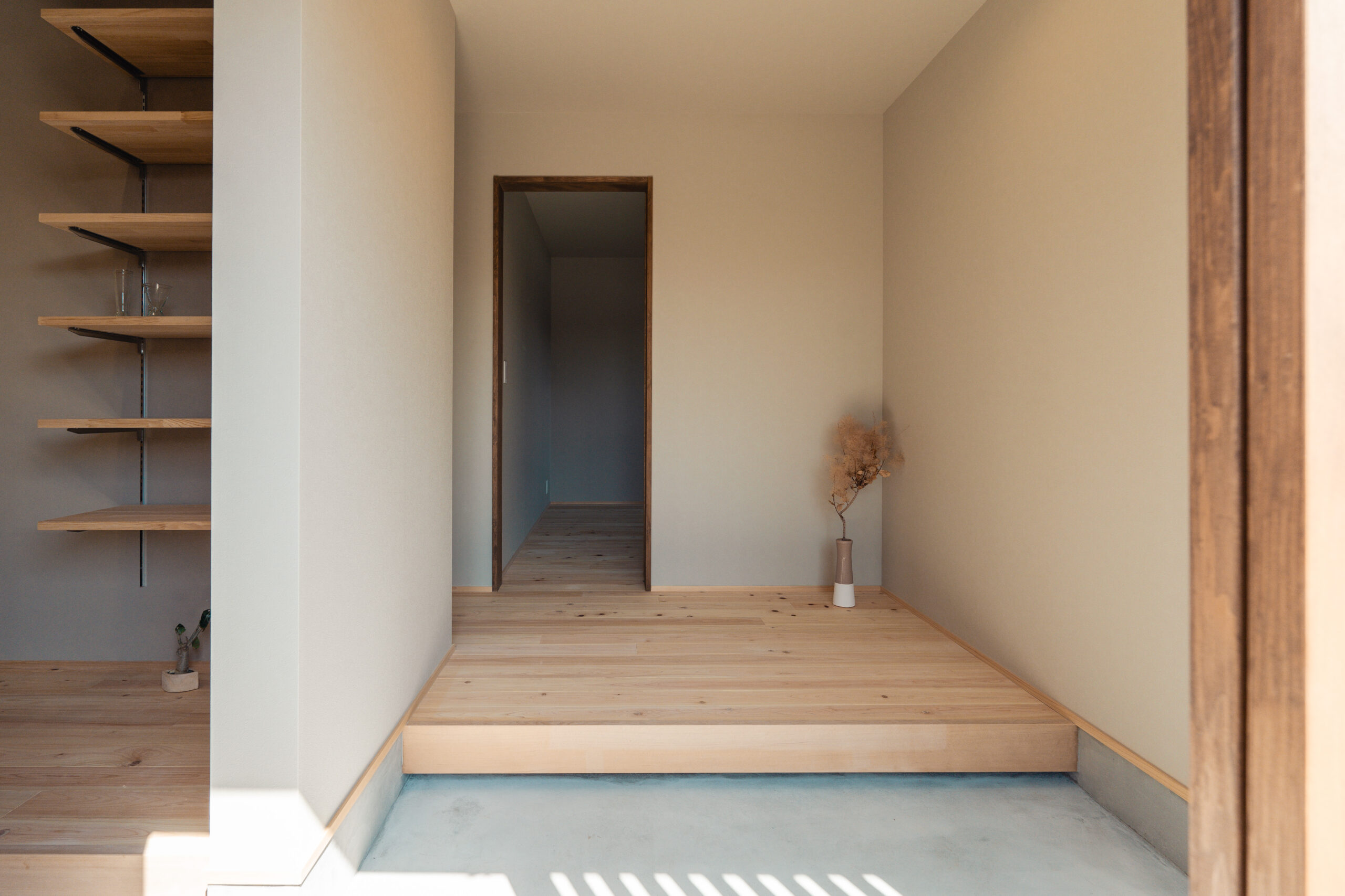 玄関から左右に土間収納を設け、左手の土間収納からはキッチンにつながっており、家事をスムーズに行うための導線が生まれています。