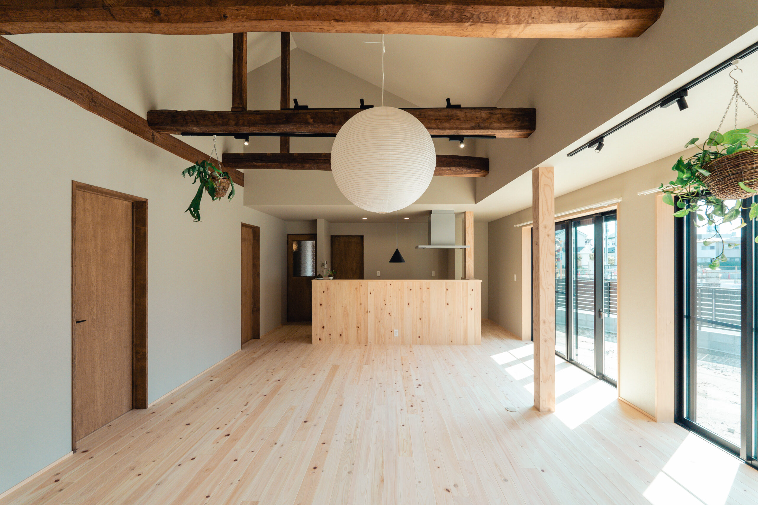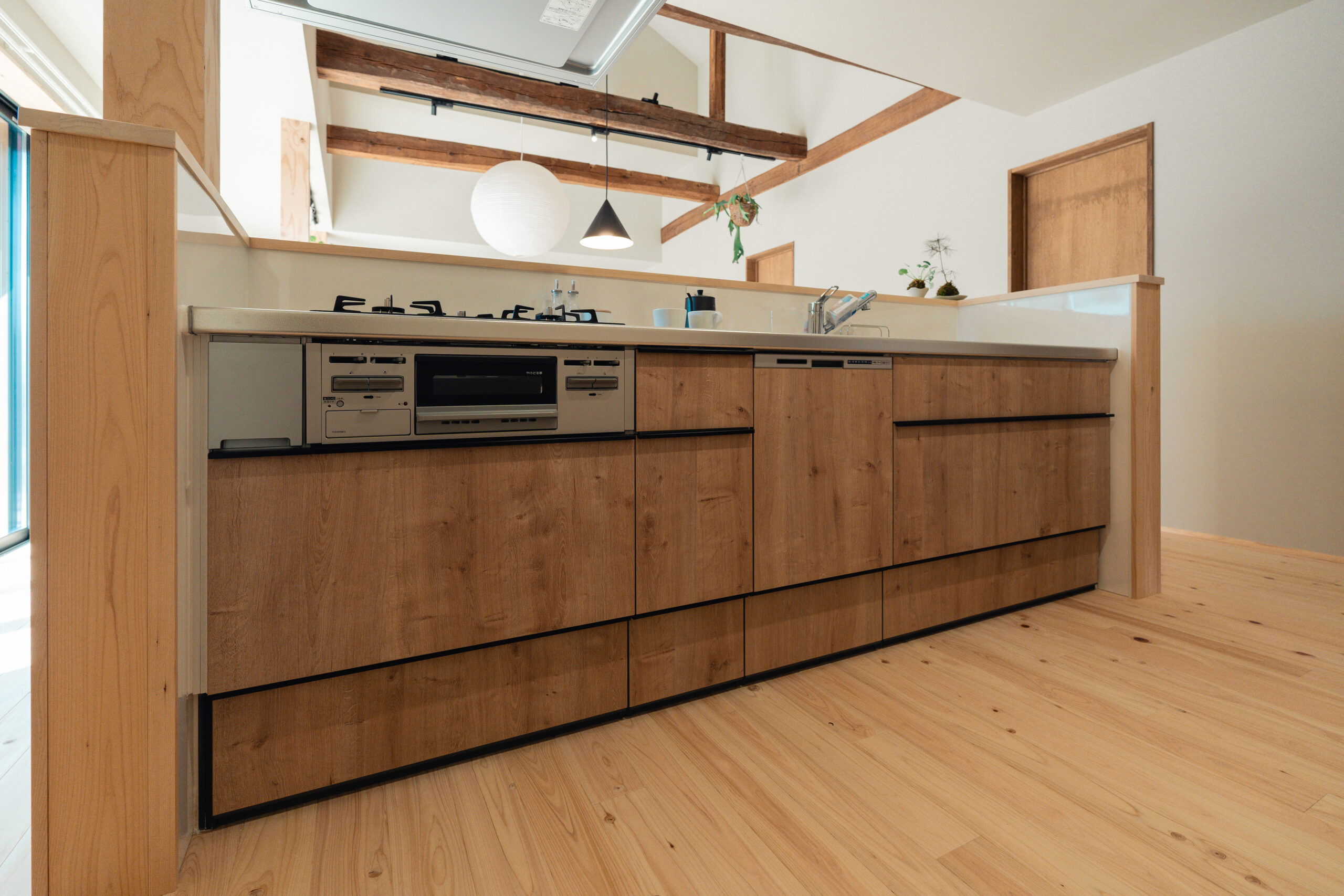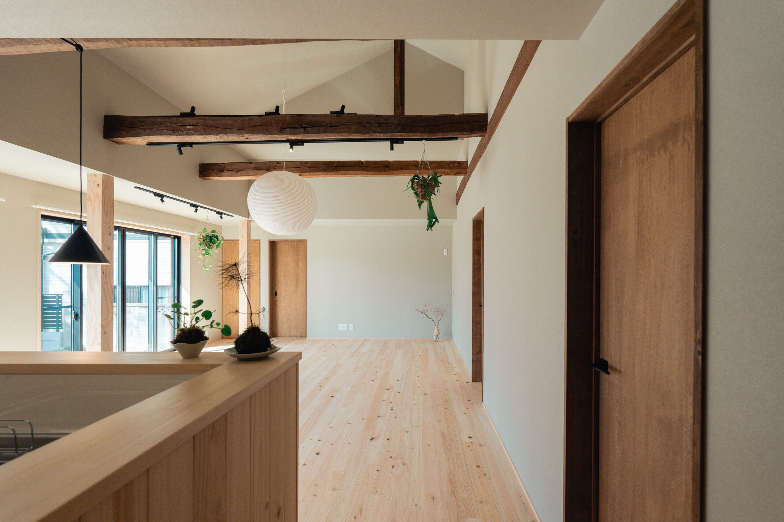 ヒノキの床と既存の柱梁のコントラストが空間に温かみと奥行きを与え、心地よく家族を大らかにつつんでくれる平屋の家となりました。