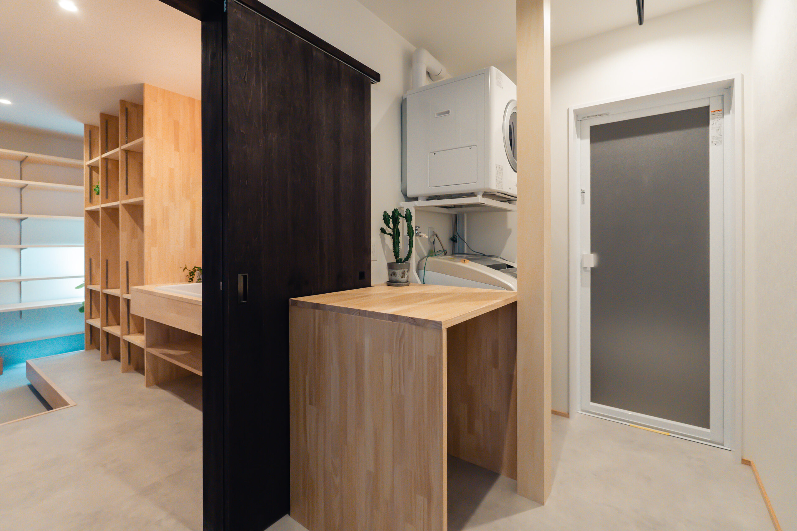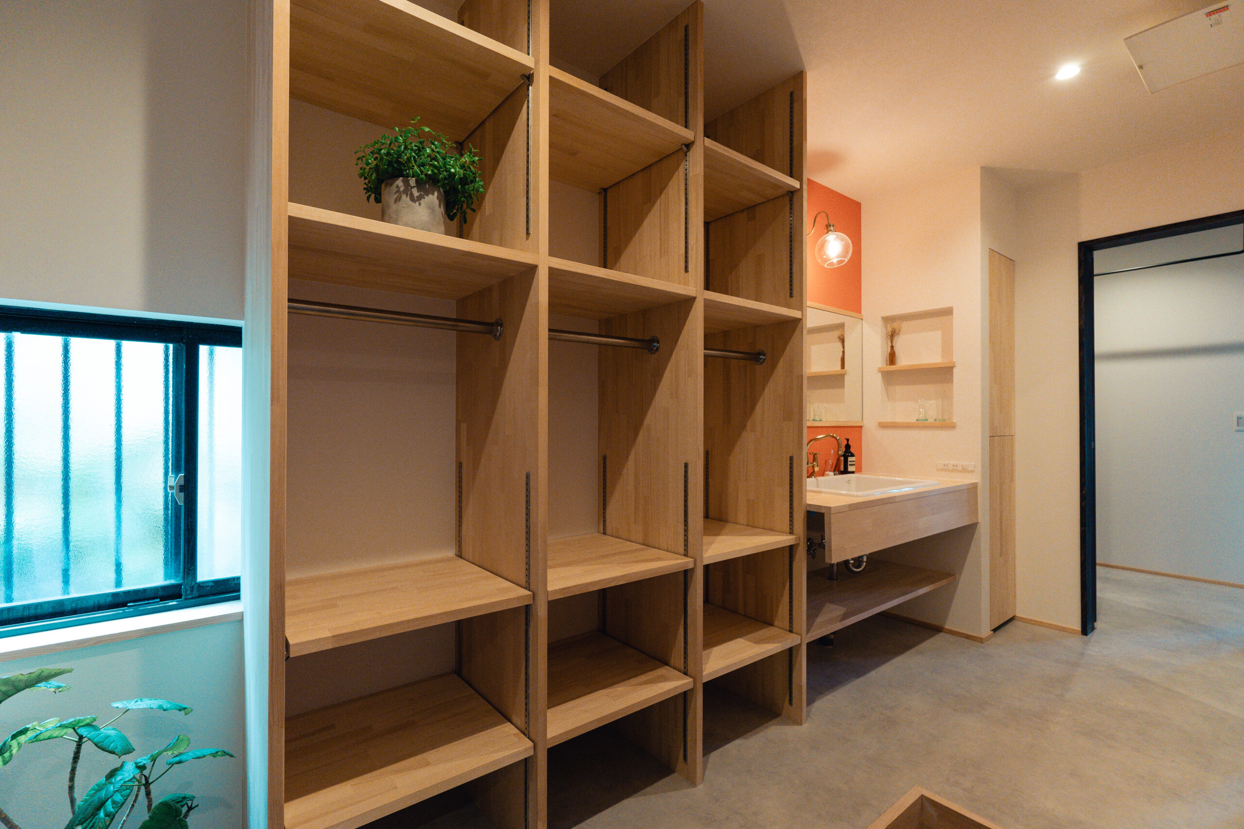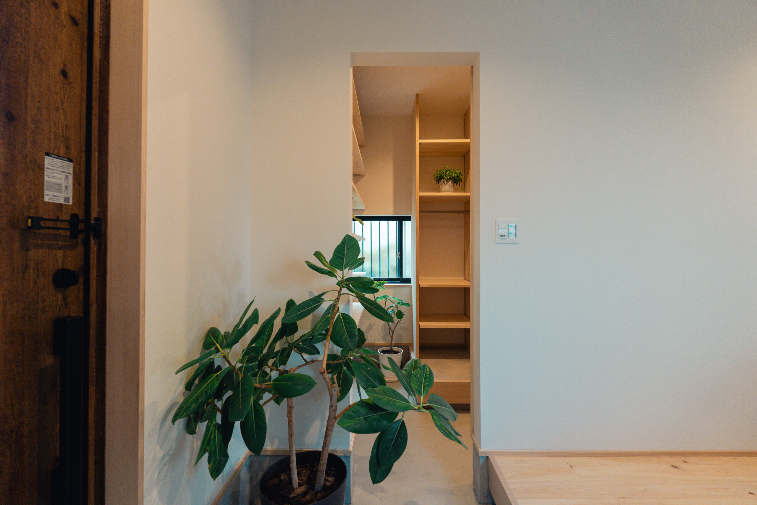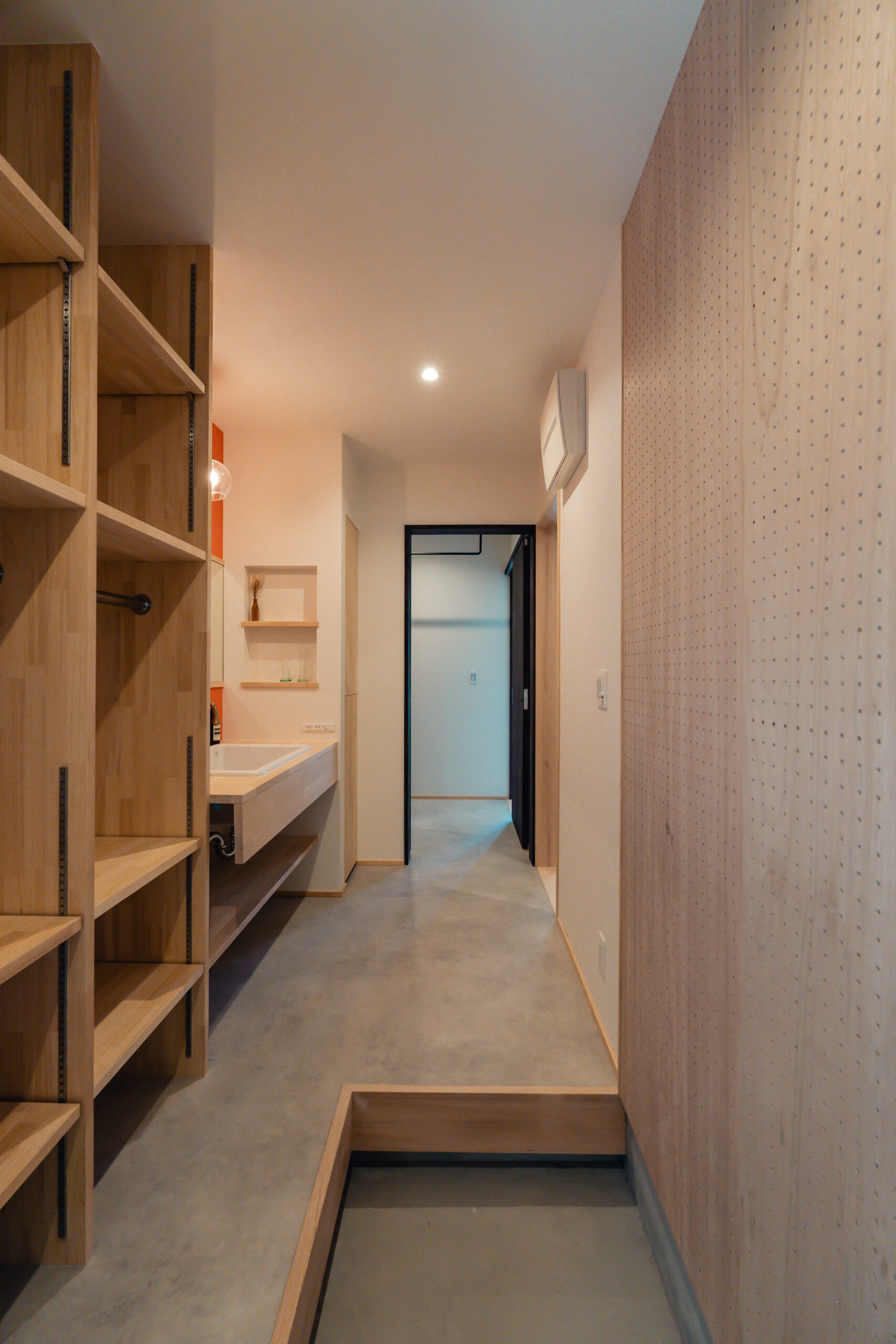 玄関から繋がる土間スペースには家族一人一人の収納を作っています。また、土間から洗面、脱衣室と繋がり、そのままLDKにもアクセスすることができる動線計画としています。