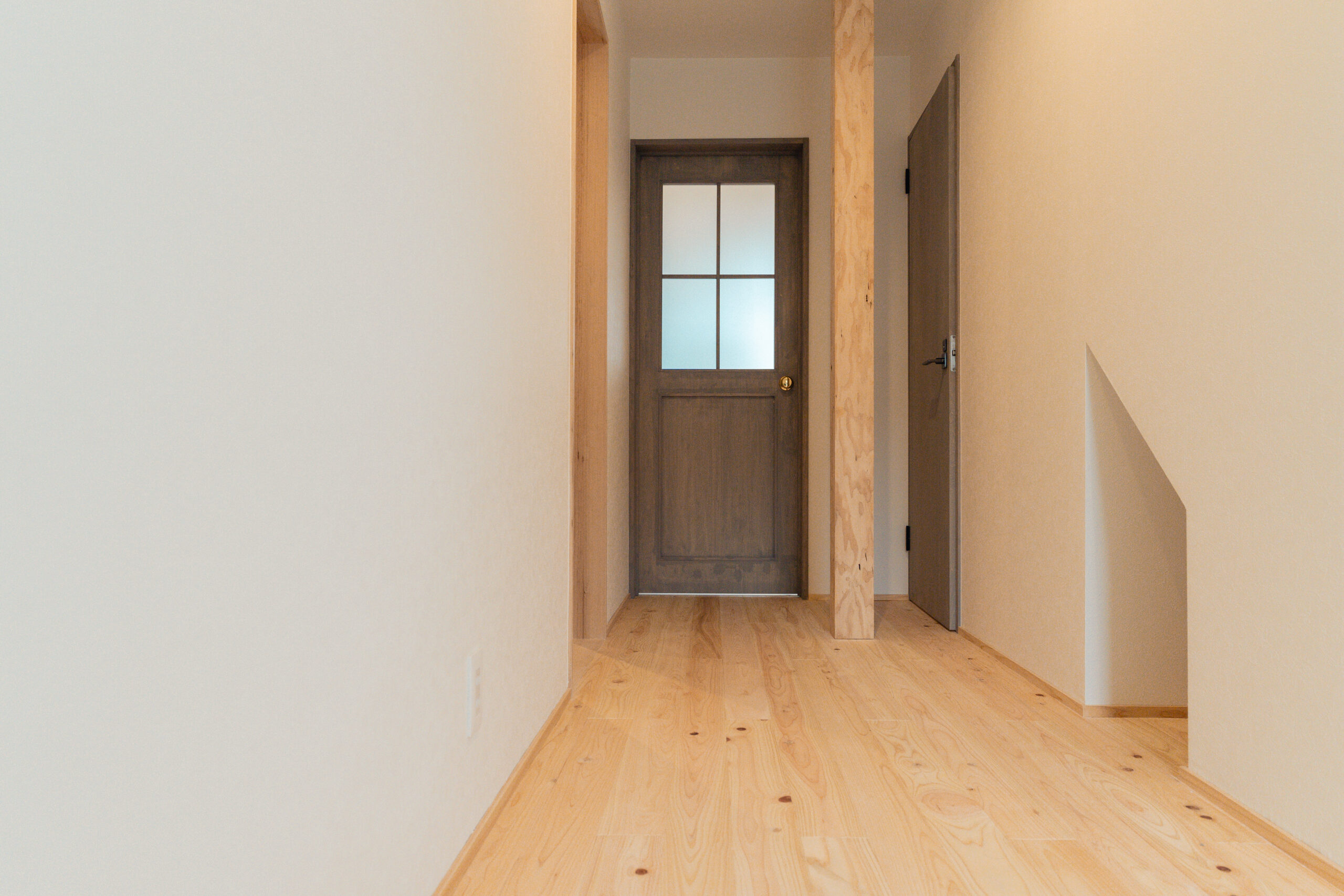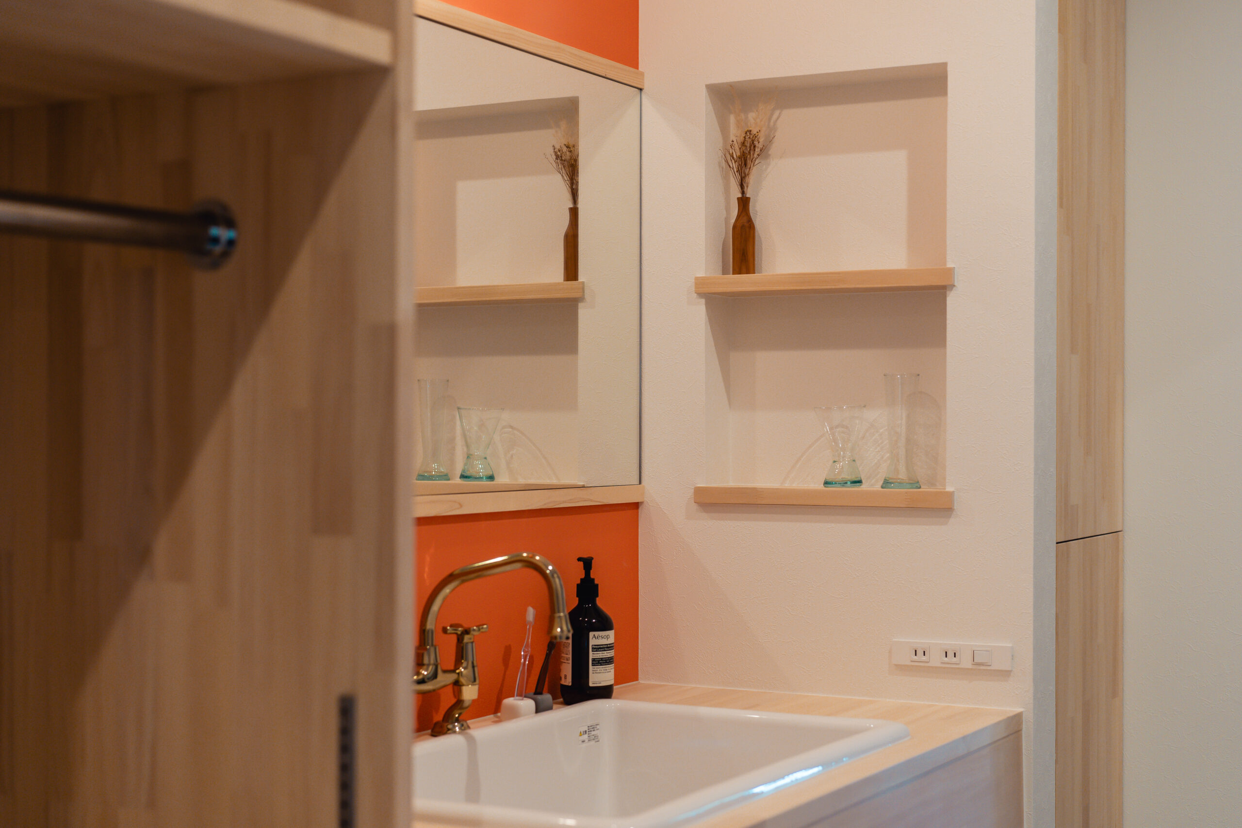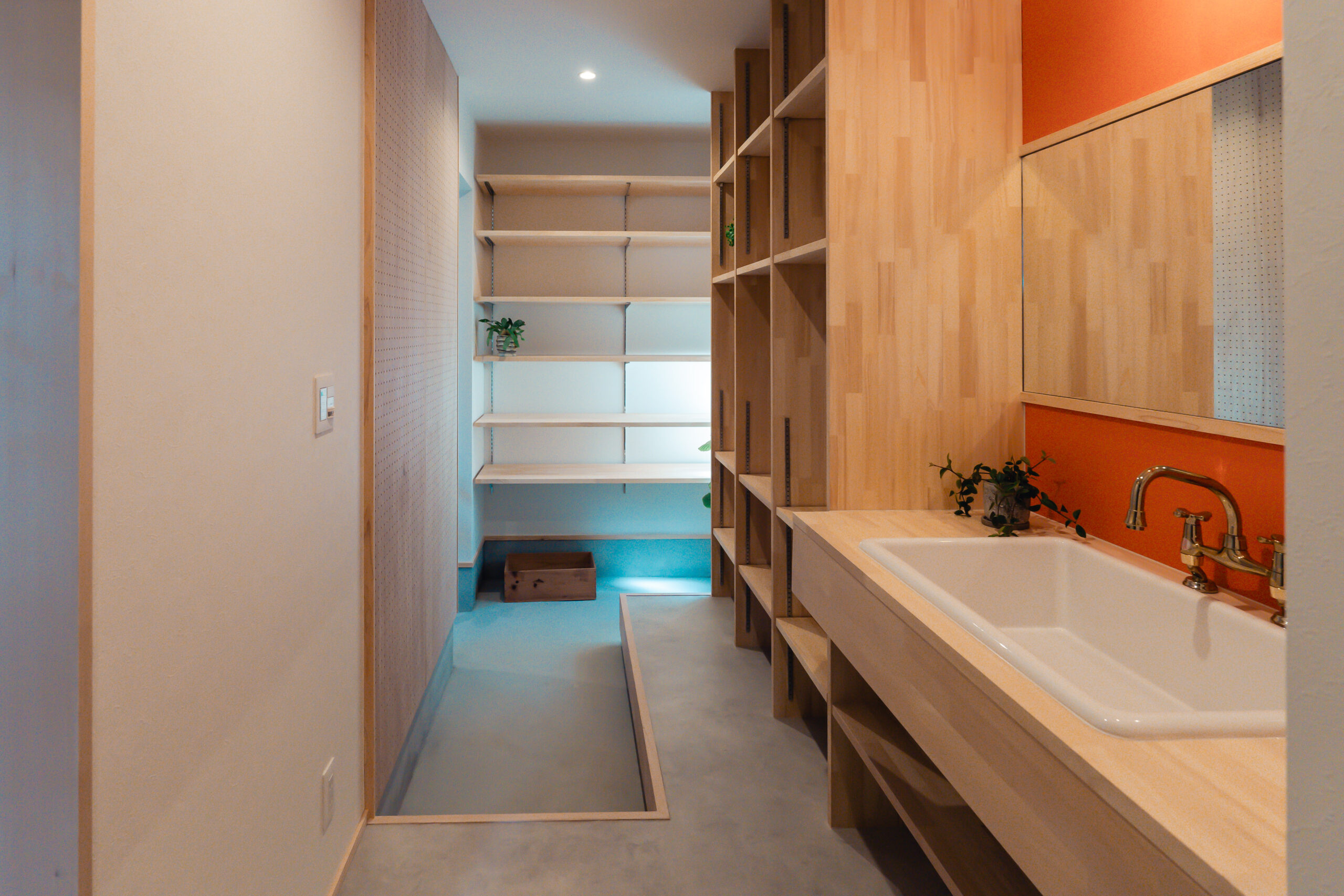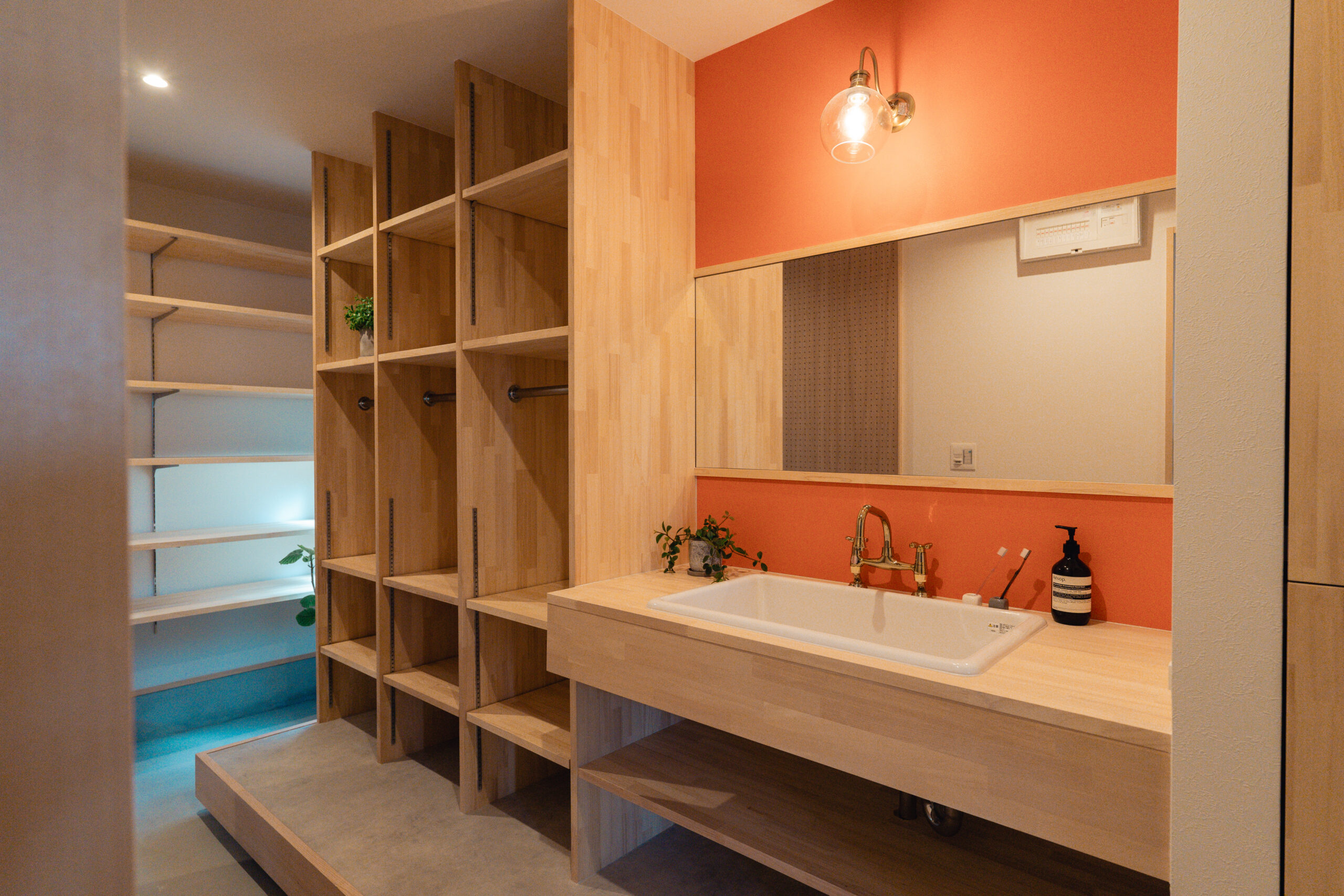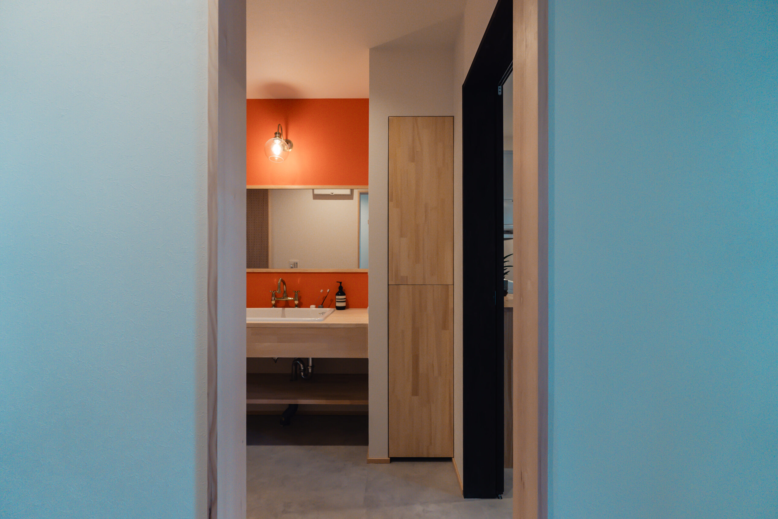玄関から繋がる土間スペースには家族一人一人の収納を作っています。また、土間から洗面、脱衣室と繋がり、そのままLDKにもアクセスすることができる動線計画としています。