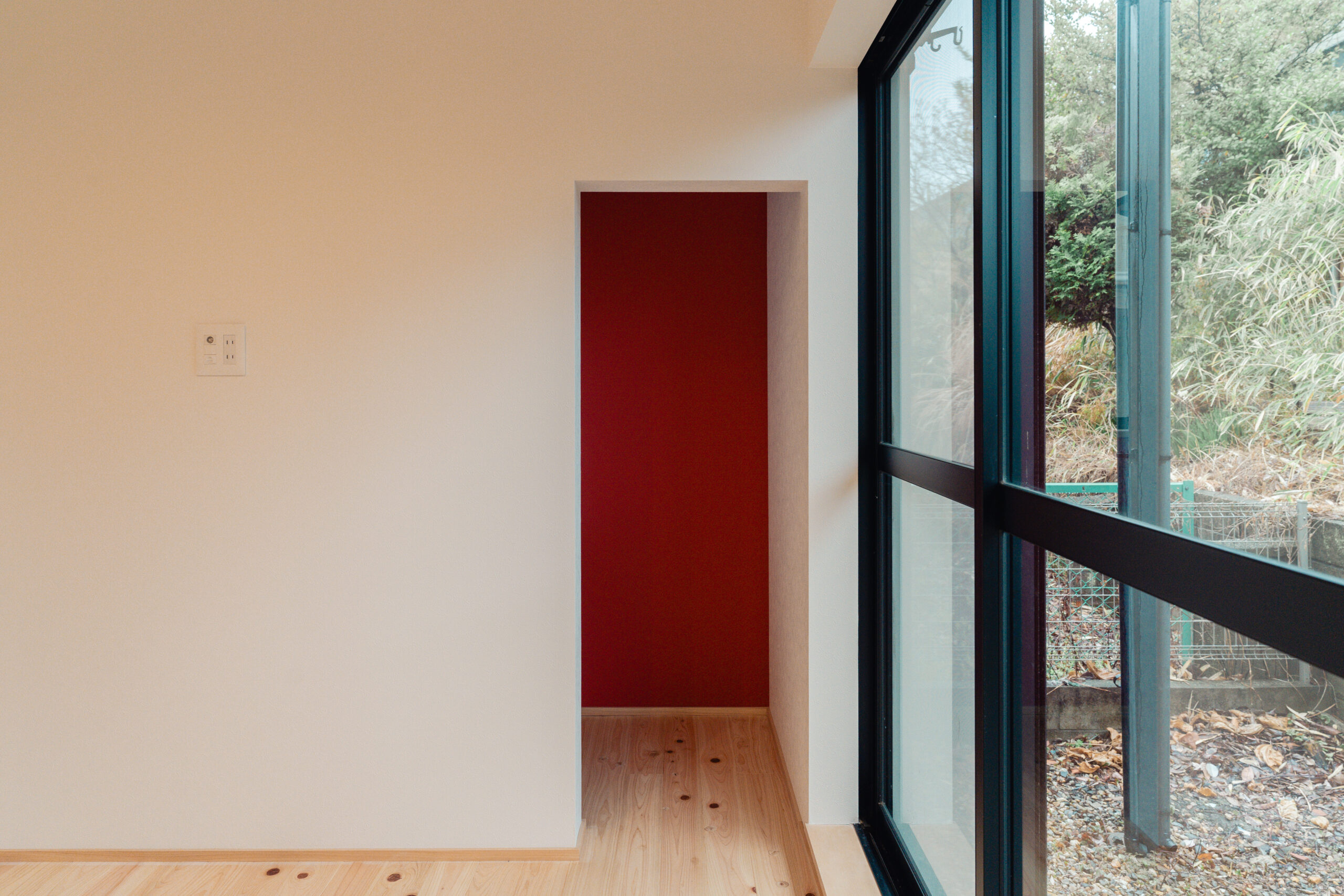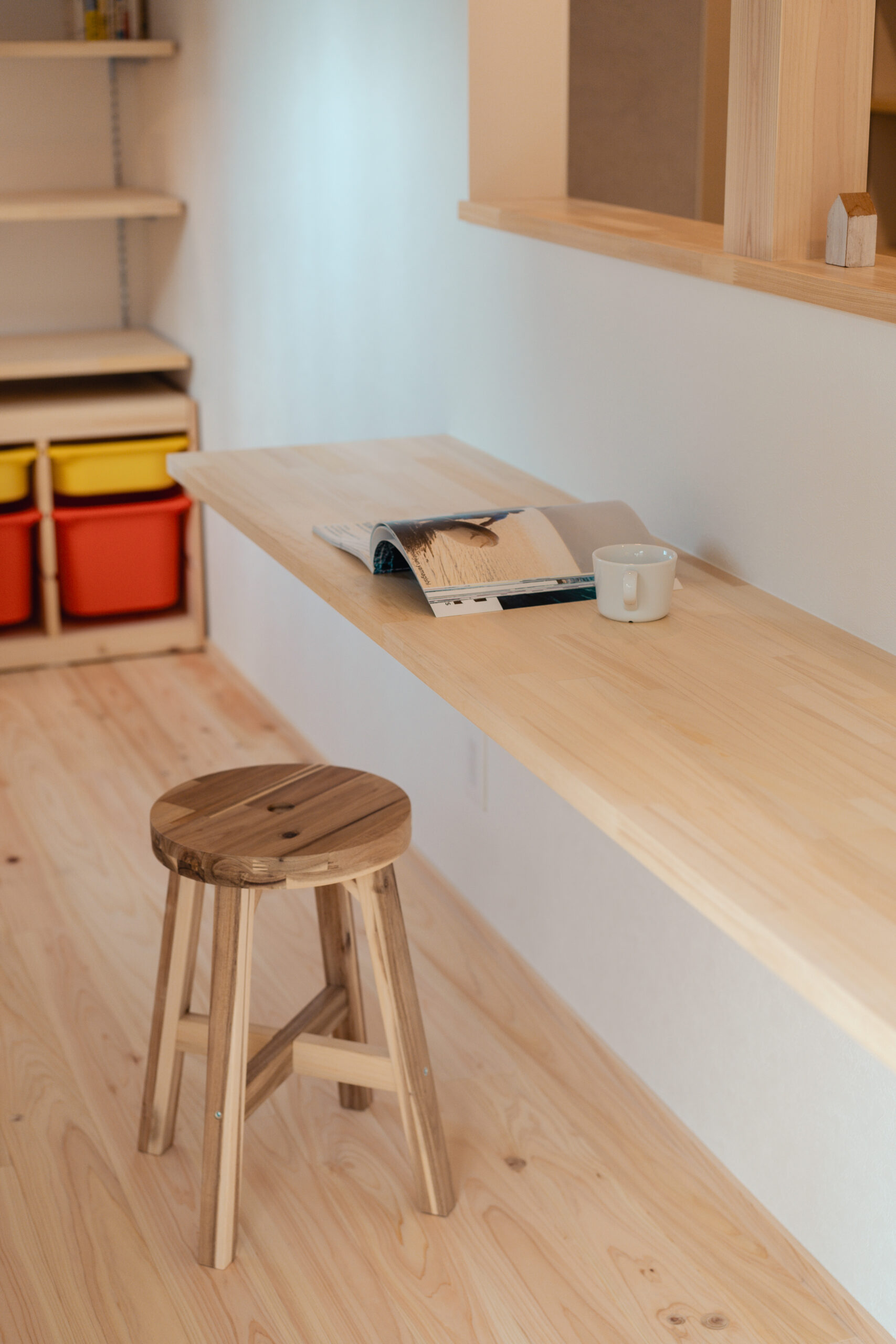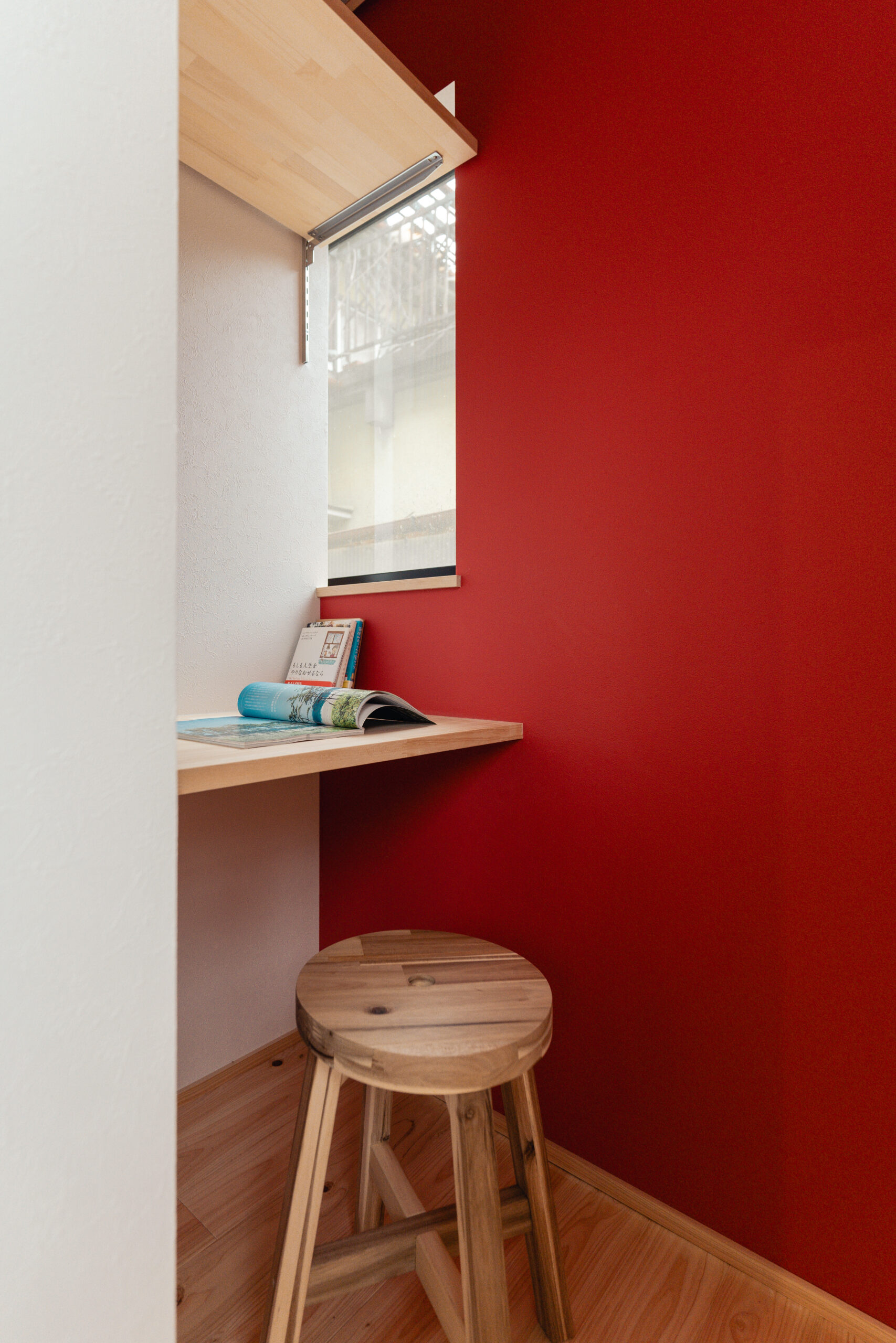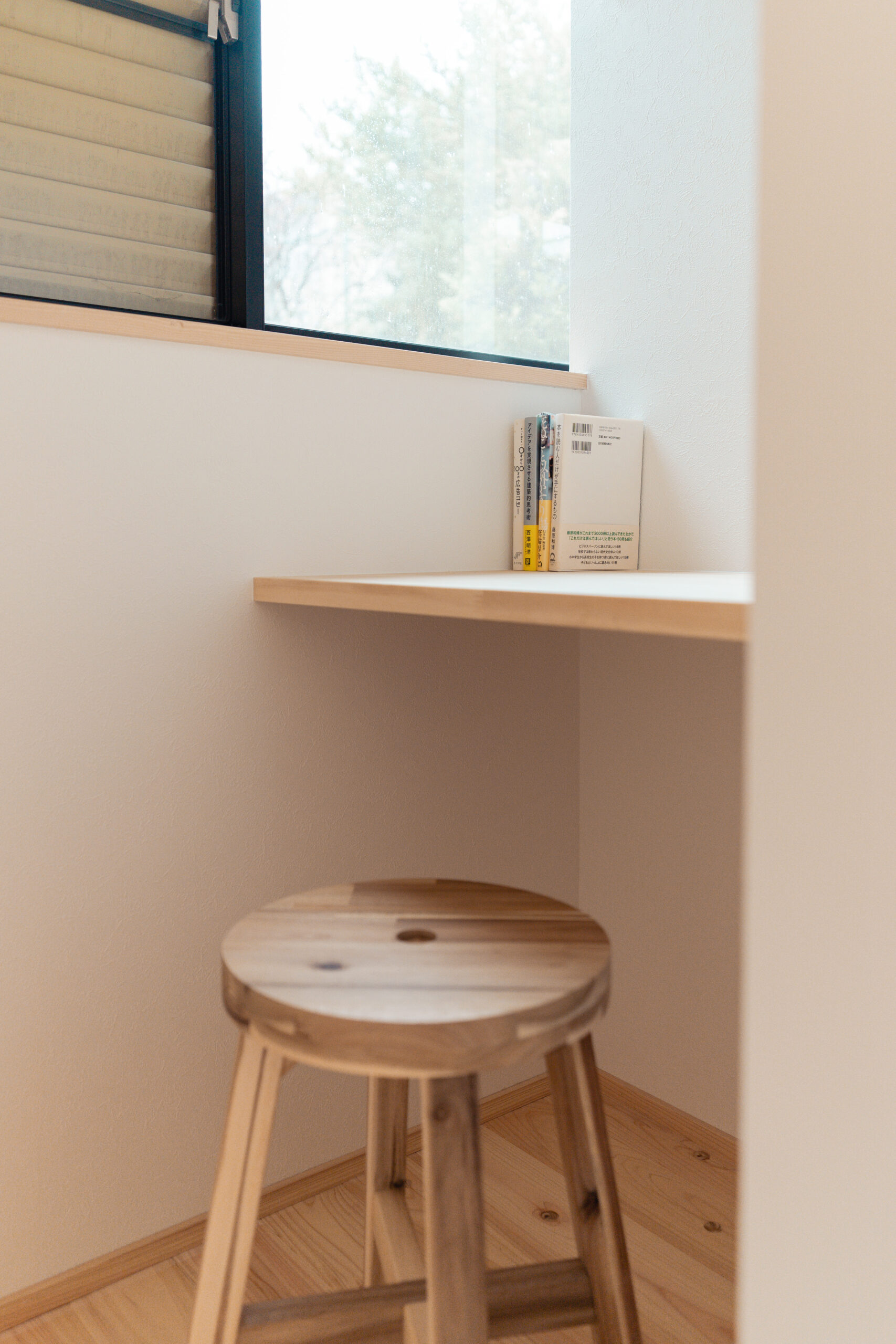 壁掛TVの裏にはご夫婦のための書斎スペースがあり、1人が座れるだけの限られた空間ですが、入り口の高さを低くすることでLDKからの存在感を無くし、書斎のプライバシーを確保しています。