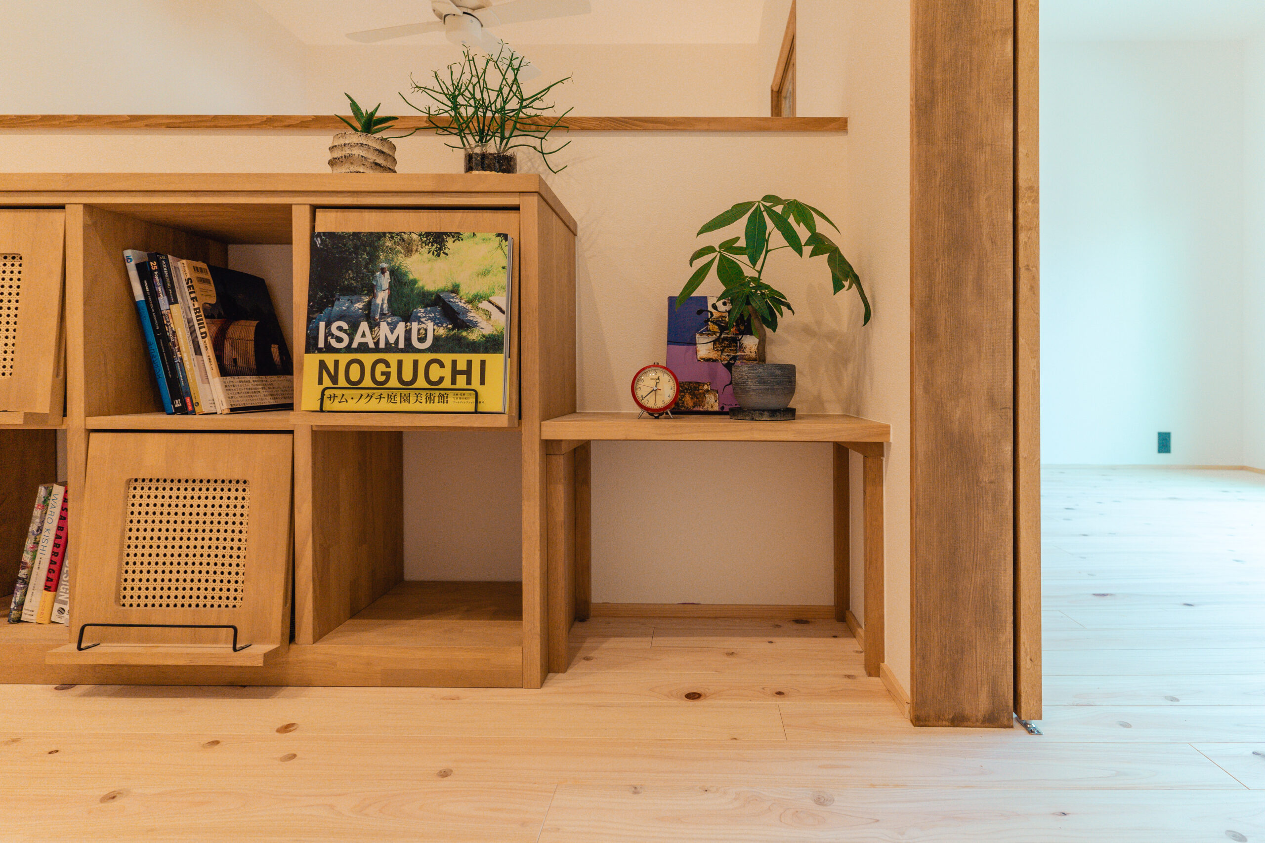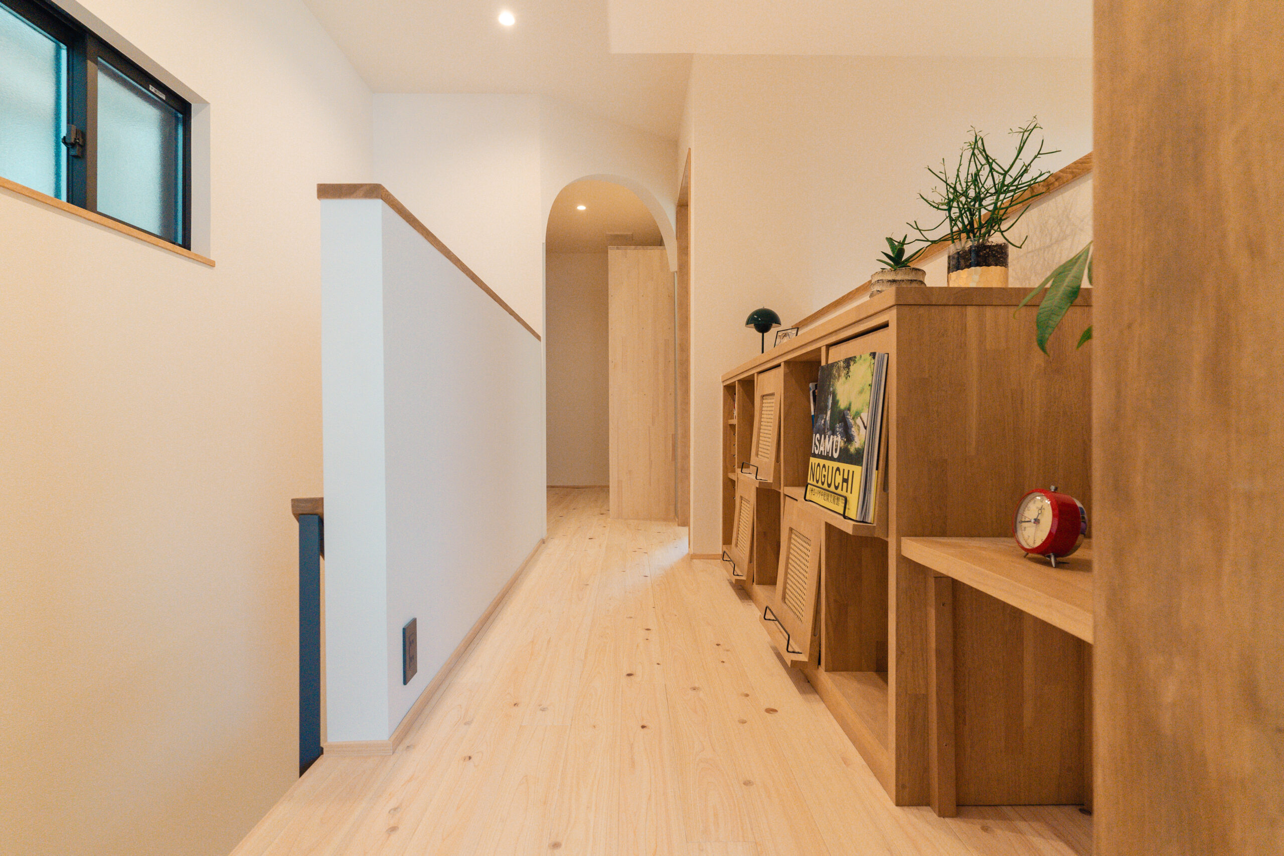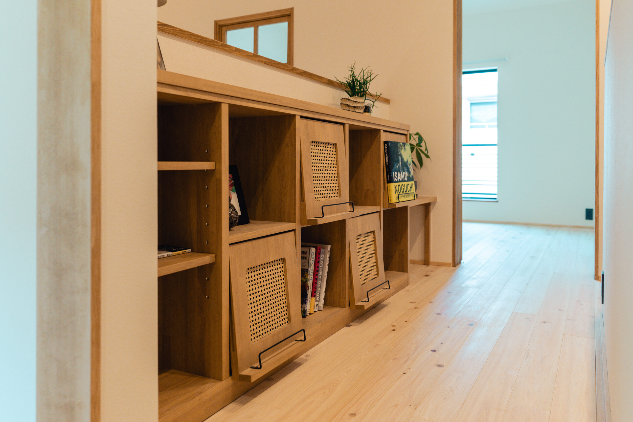 2階廊下にある造作家具はお施主様が製作されており、本棚兼ベンチ(読むスペース)となっています。吹き抜けに面しているため、どこにいても家族の気配を感じられる空間へ。