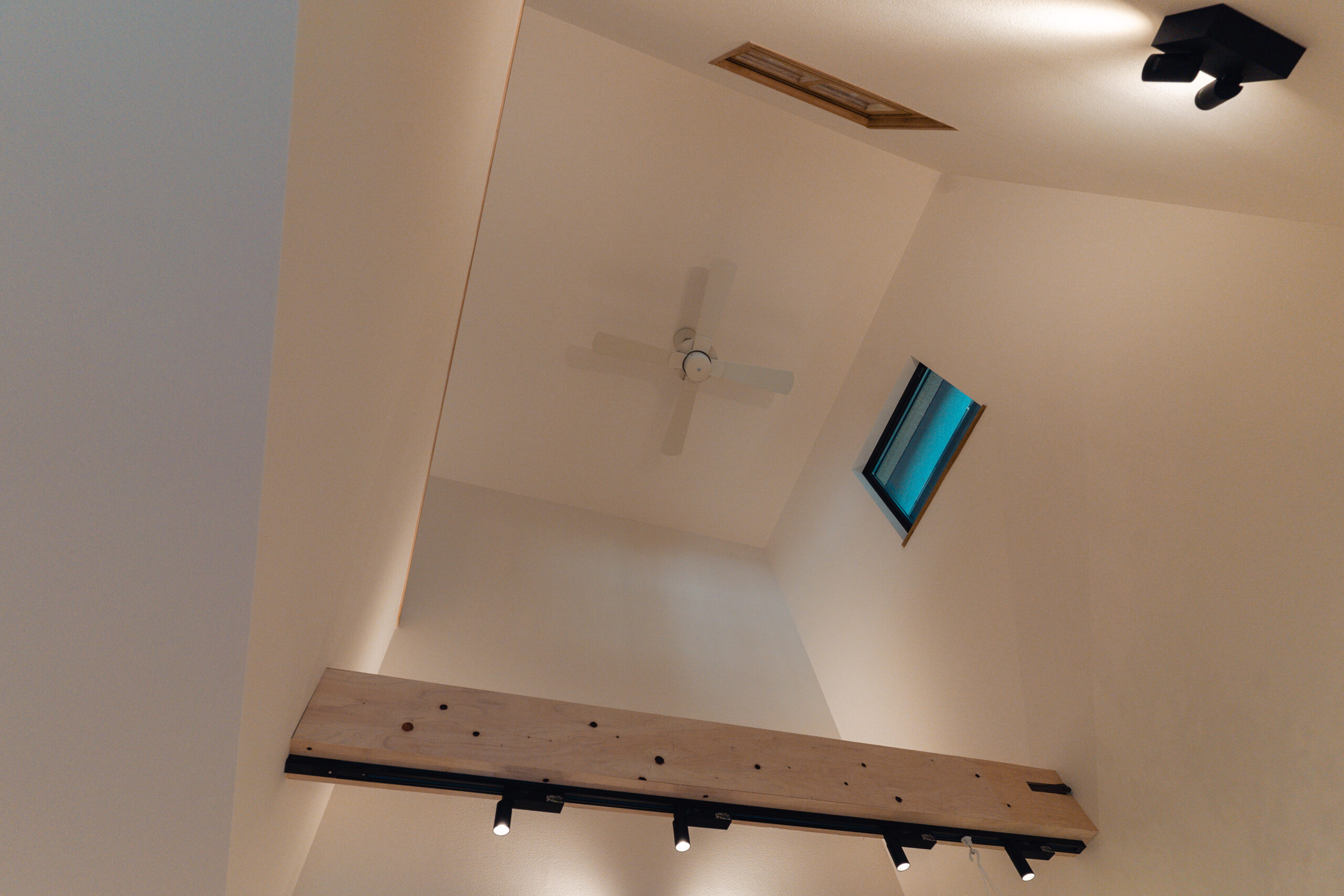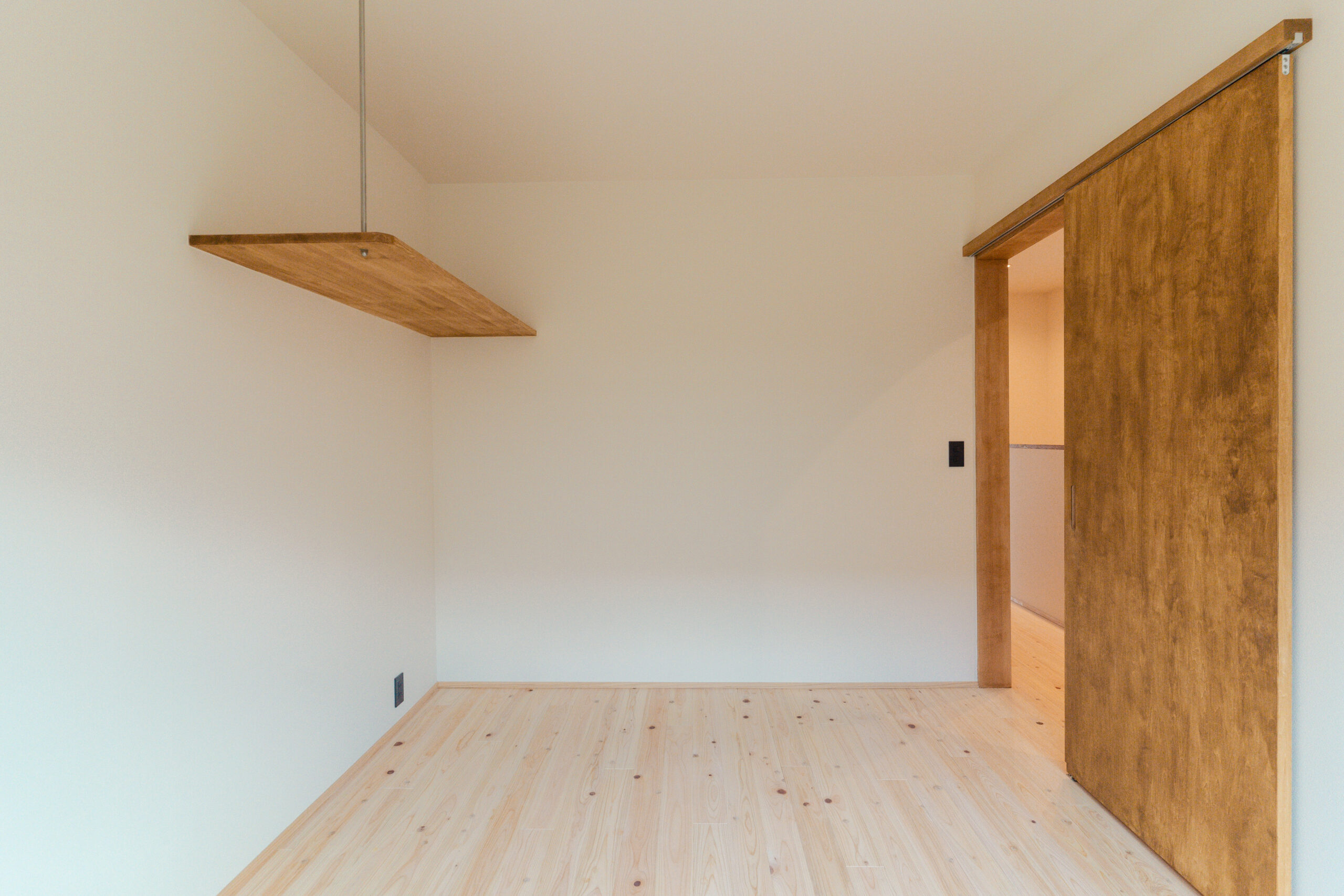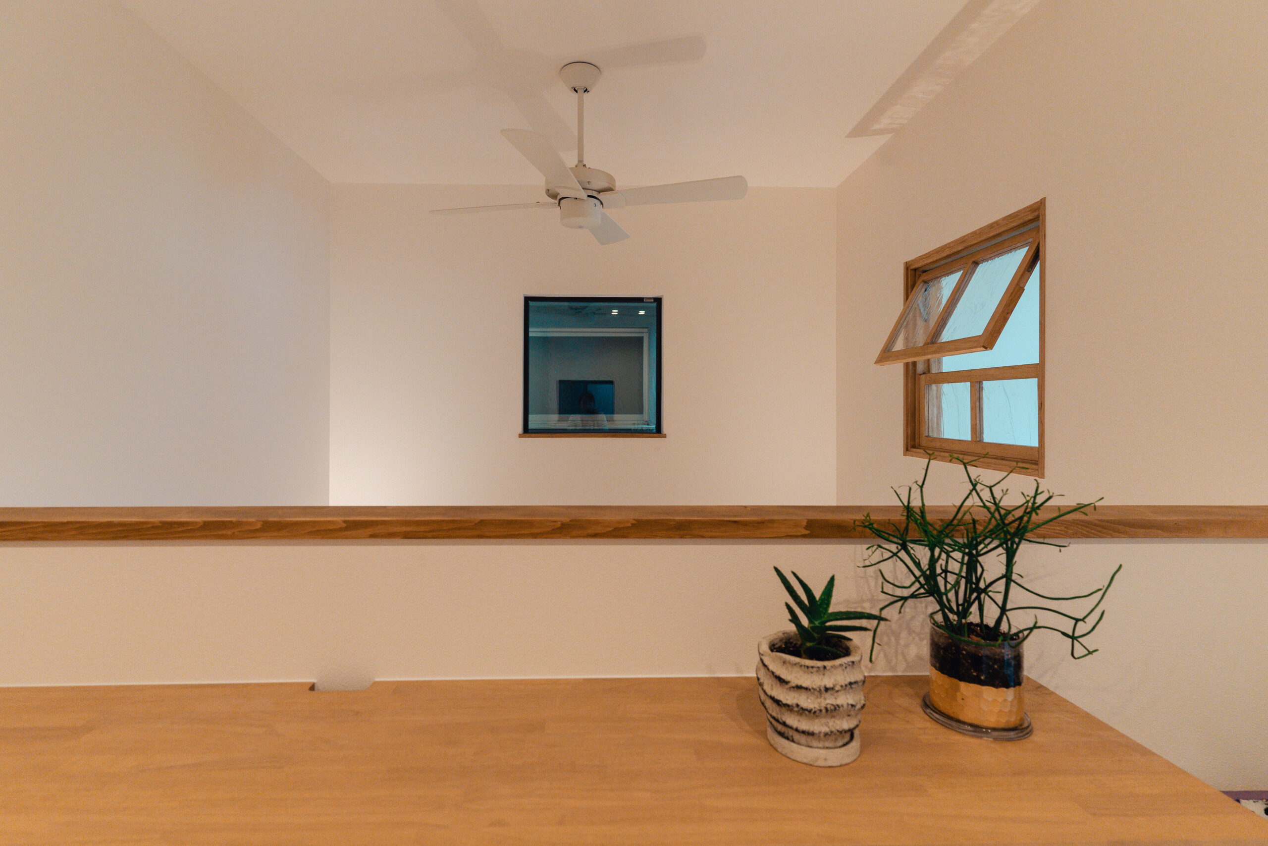 2階廊下にある造作家具はお施主様が製作されており、本棚兼ベンチ(読むスペース)となっています。吹き抜けに面しているため、どこにいても家族の気配を感じられる空間へ。