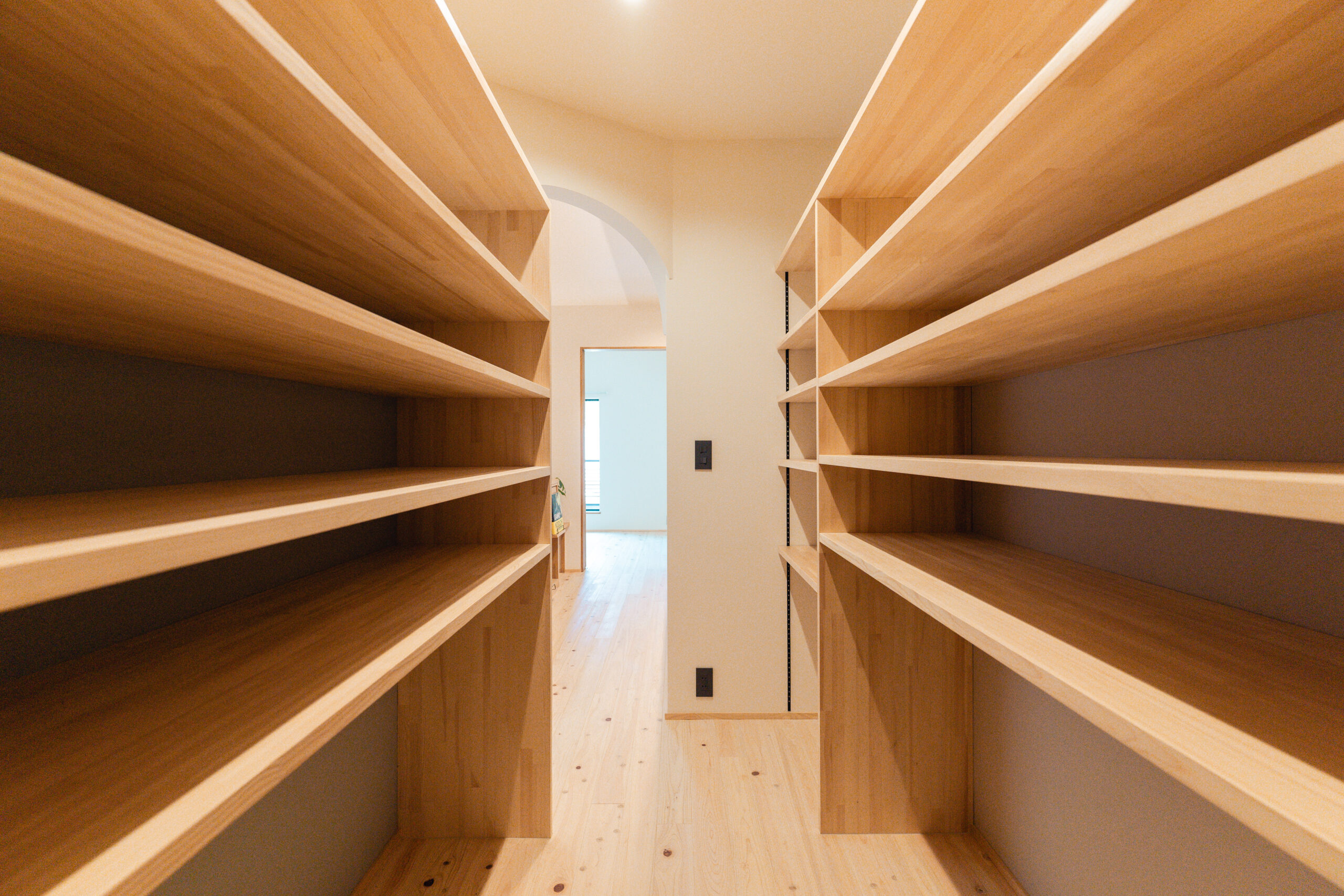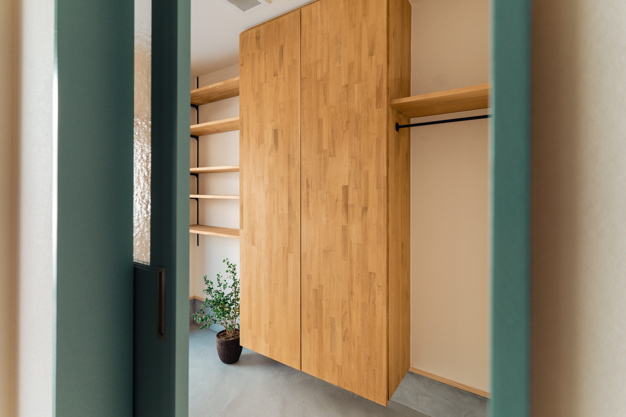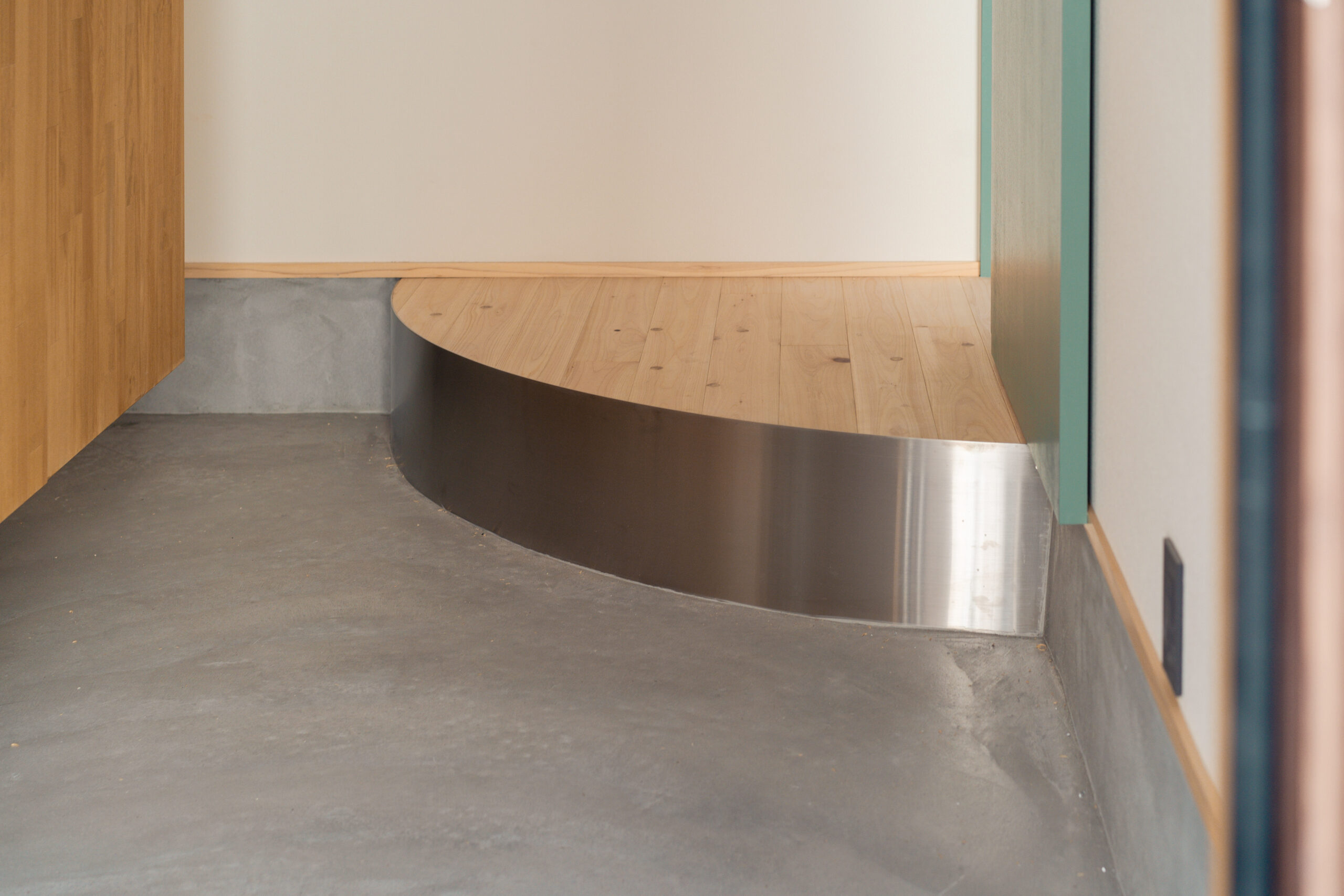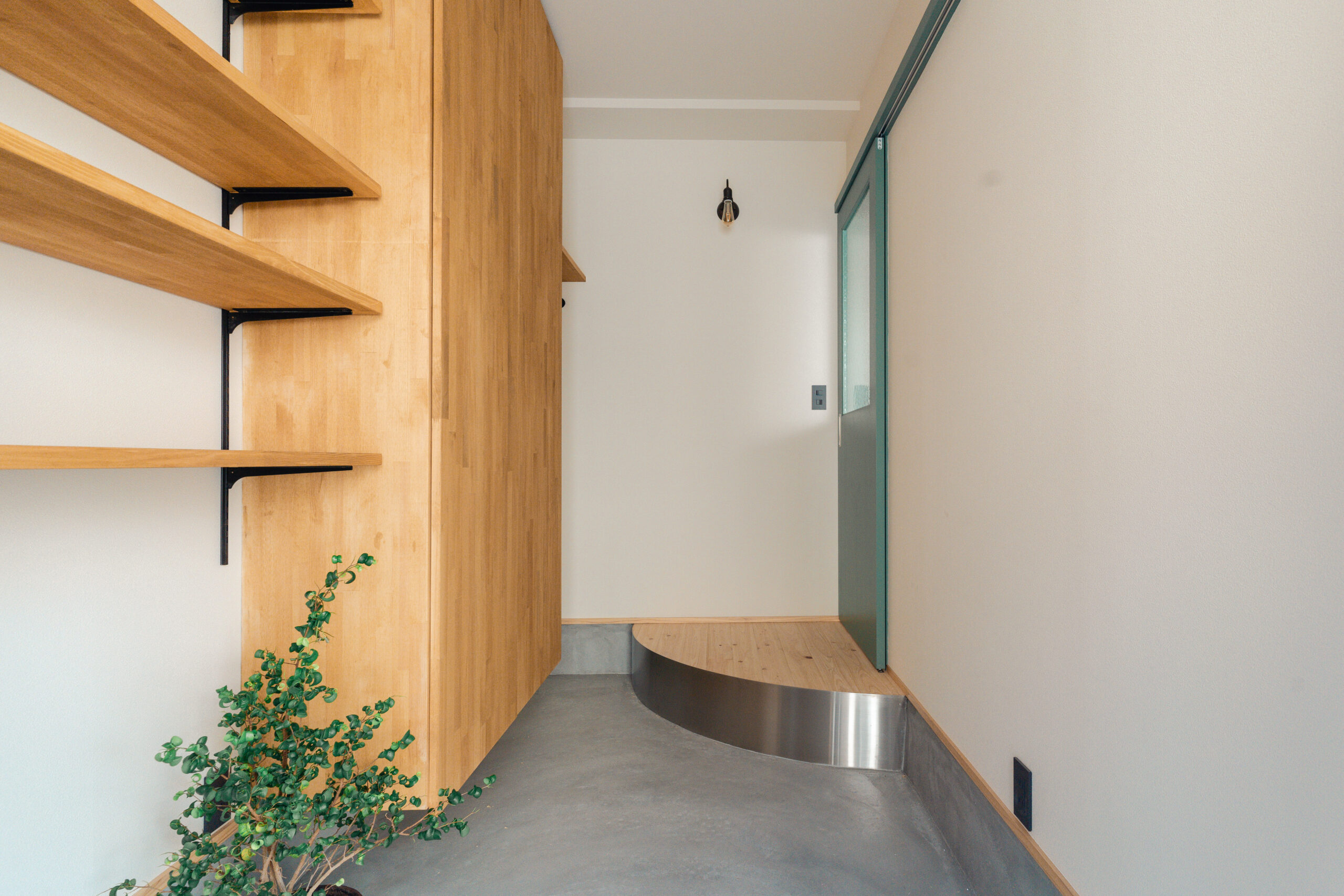 玄関は土間収納を兼用したスペースとし、R框はステンレス板で仕上げており、シャープな印象を演出しています。