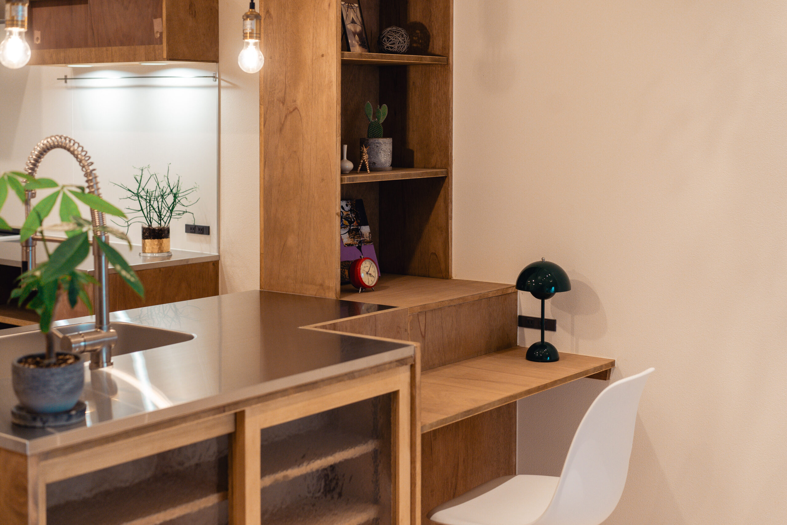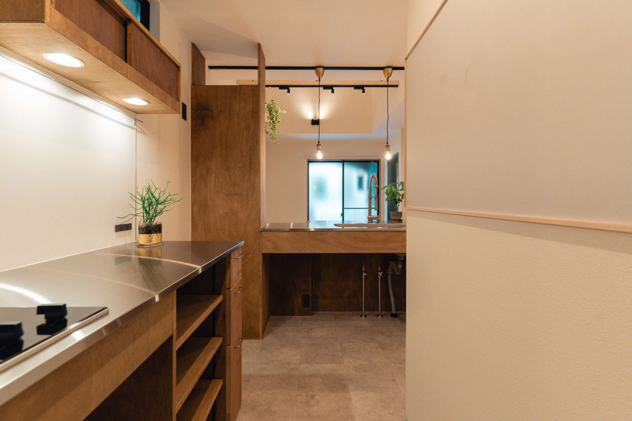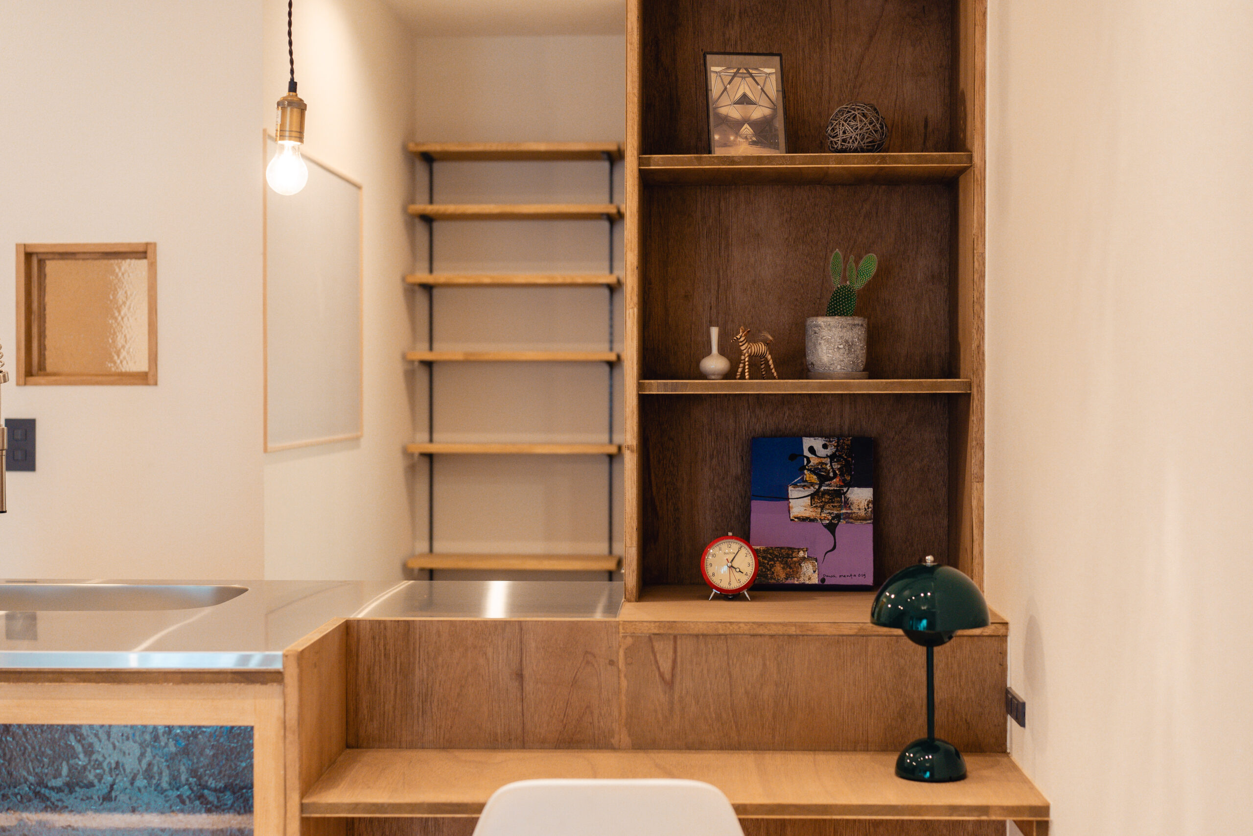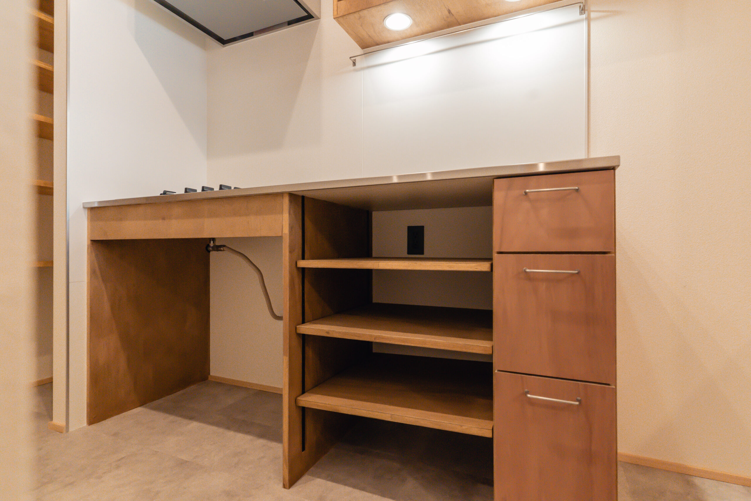 リビングは一部吹き抜けとし、元々使用されていた梁を見せており、リノベーションならではの仕上げです。階段下の造作家具はお施主様が手がけており、本や小物を置けるスペースとくつろげるスペースを兼ね備えています。キッチンは造作で製作しており、リビング側は作業台としても機能するデザインです。