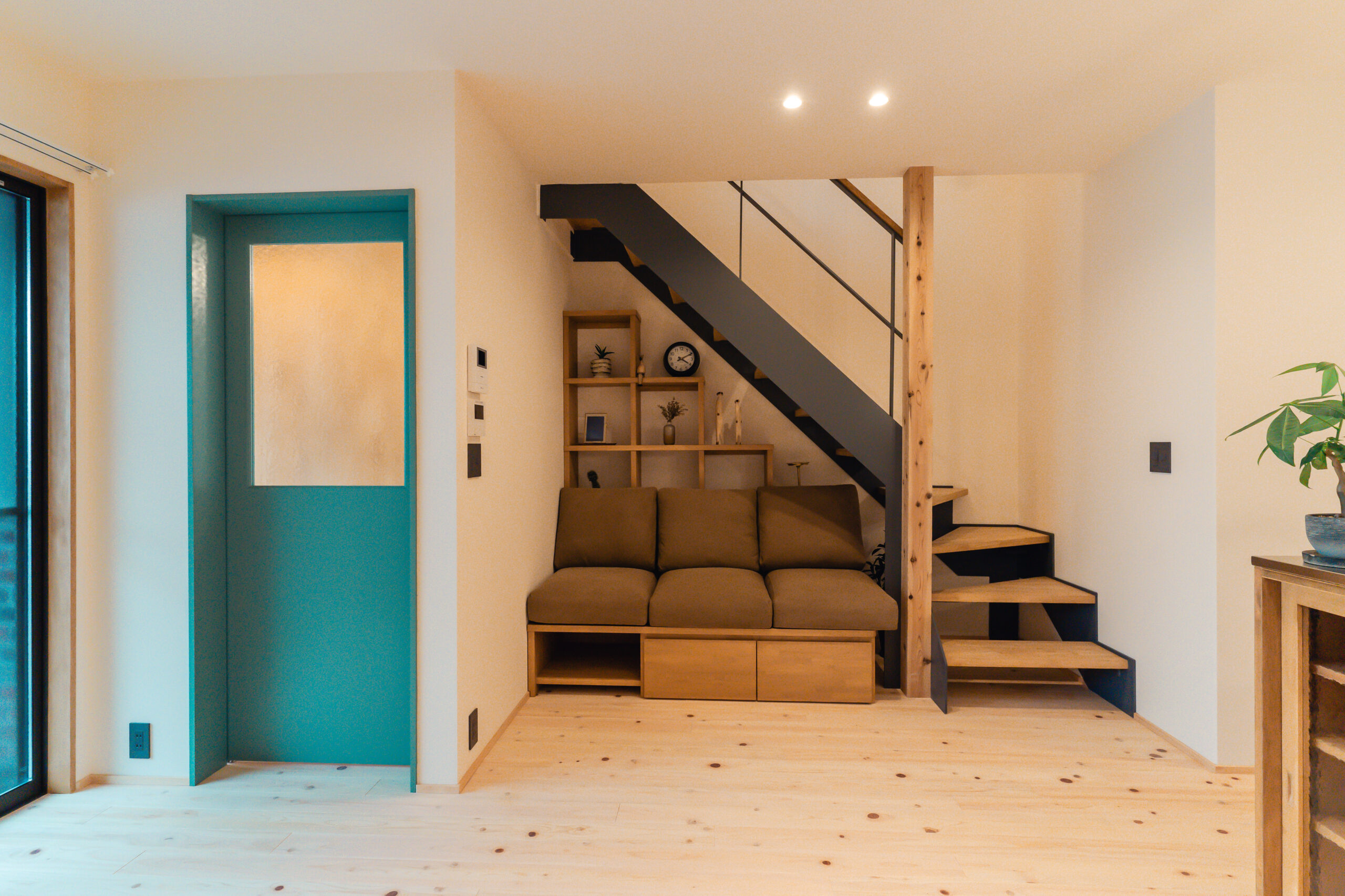 リビングに入る扉はカラーを入れアクセントとし、視覚的な楽しさを感じられます。