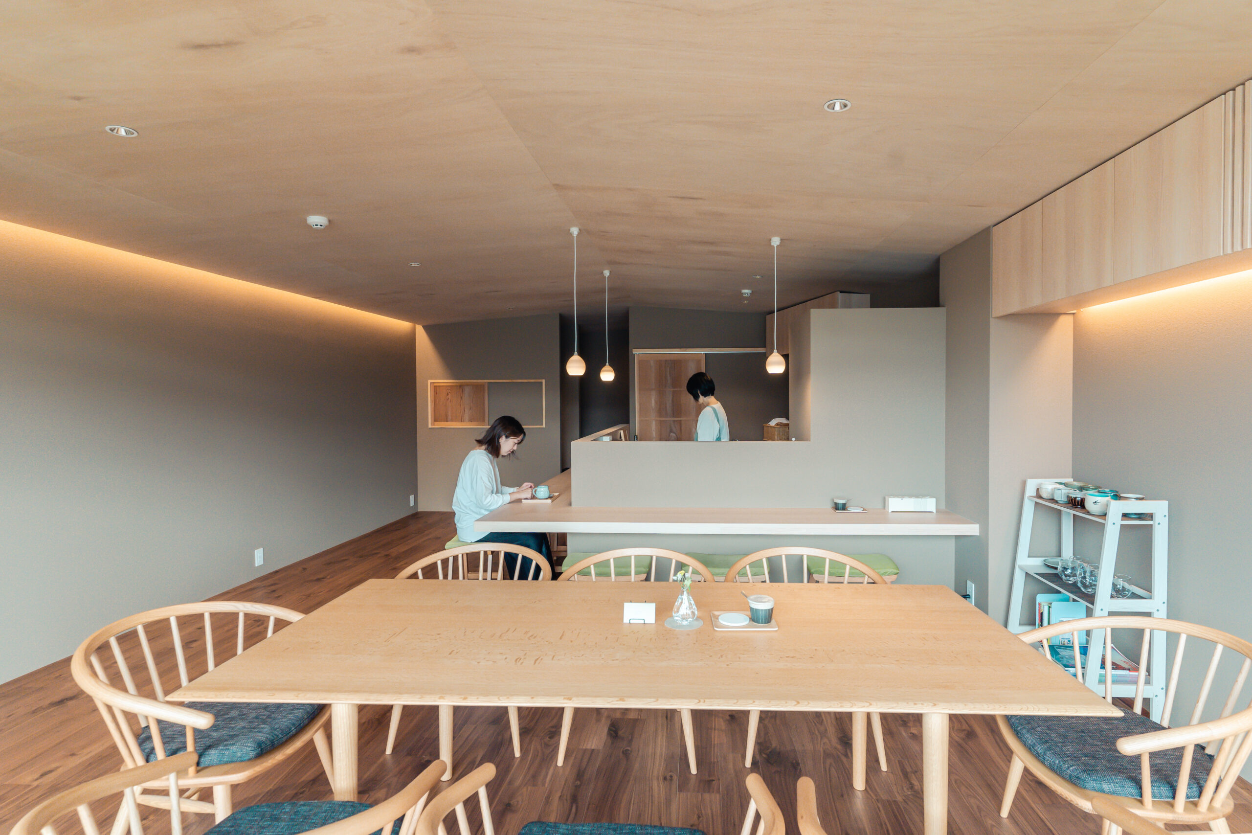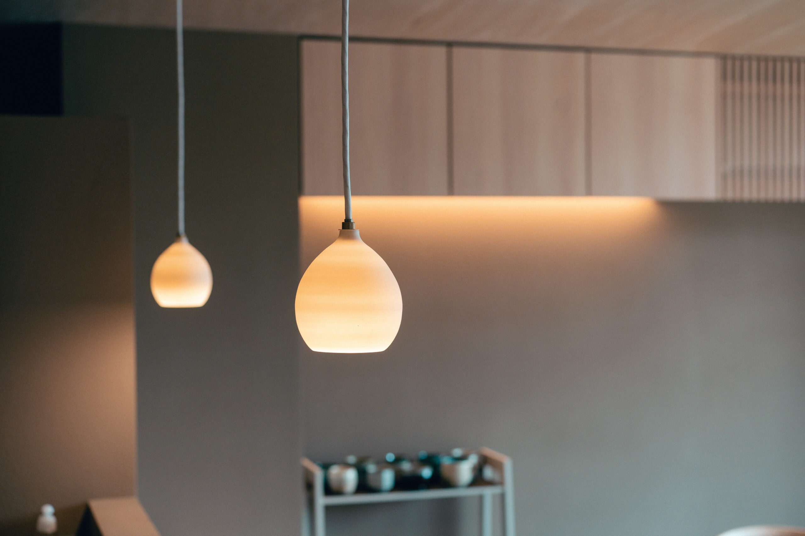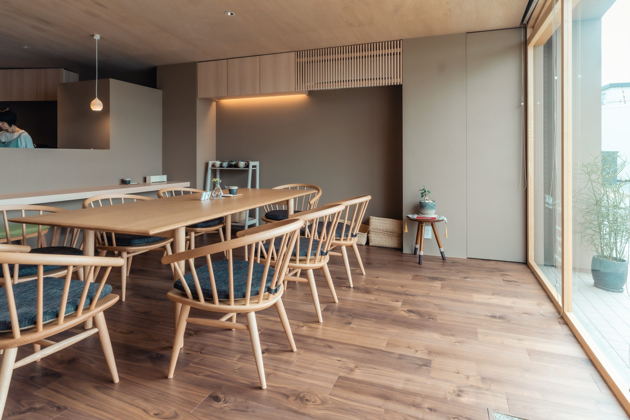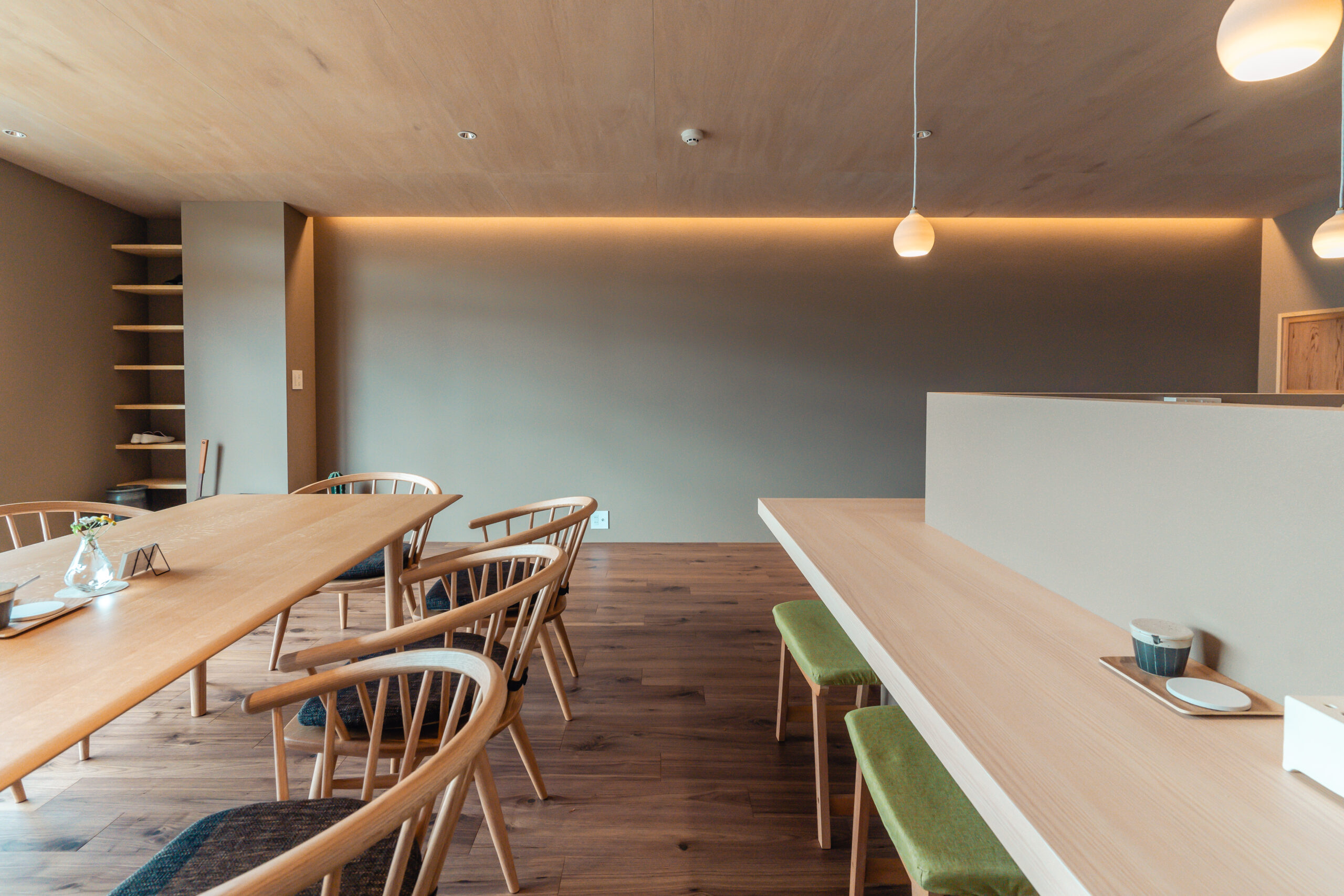 NUKは、ヨガ教室、料理教室、カフェなど多様な用途に対応できる柔軟なスペース、間接照明を中心に柔らかな光で空間を包み込みます。ペンダント照明には手作りの温もりを感じさせる卯山窯の陶器を採用し、空間に個性を加えています。