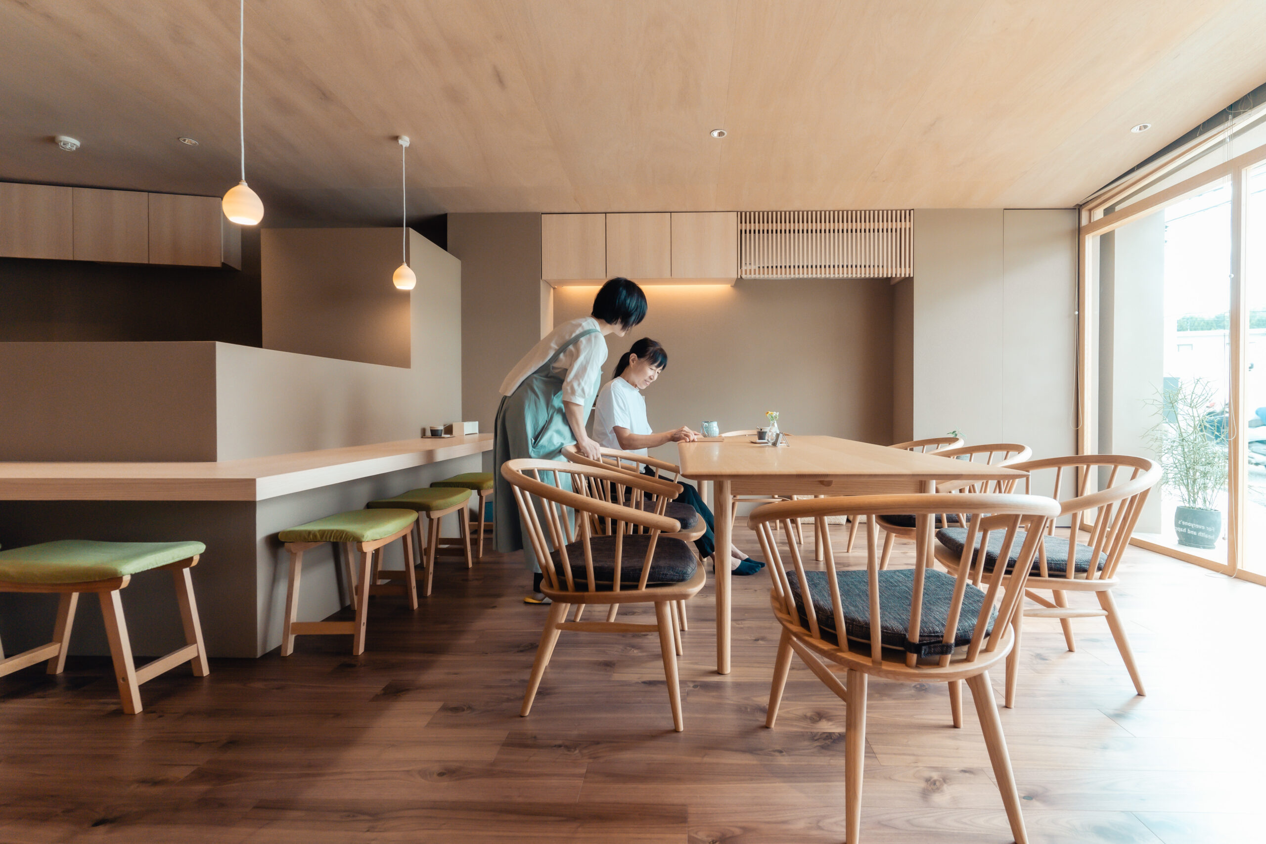 デザインは、伝統的な切妻屋根を基に、内外に統一した素材を使用して一体感を演出。緩やかな勾配屋根が空間全体を包み、年齢を問わず居心地の良さを感じられるよう工夫しました。