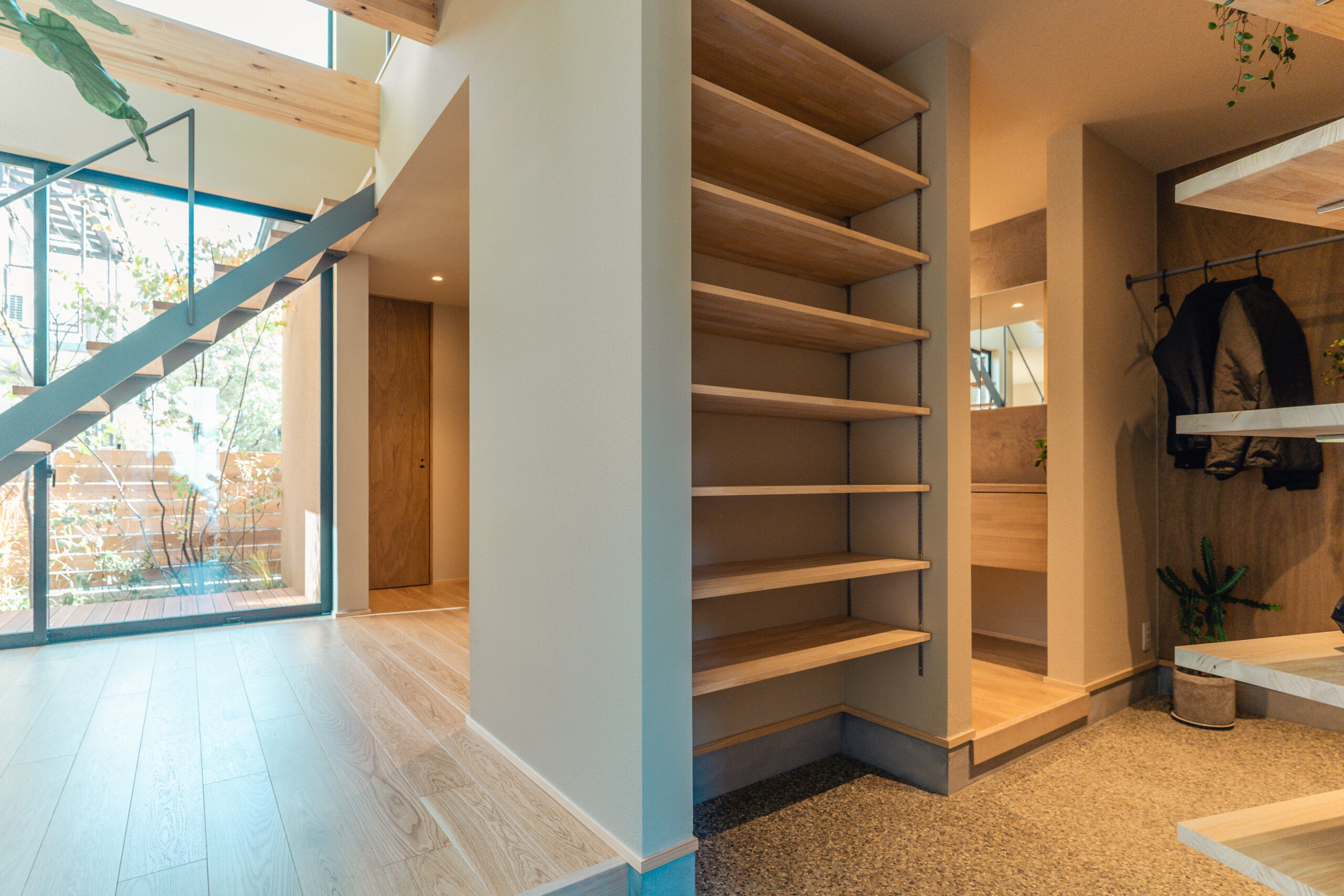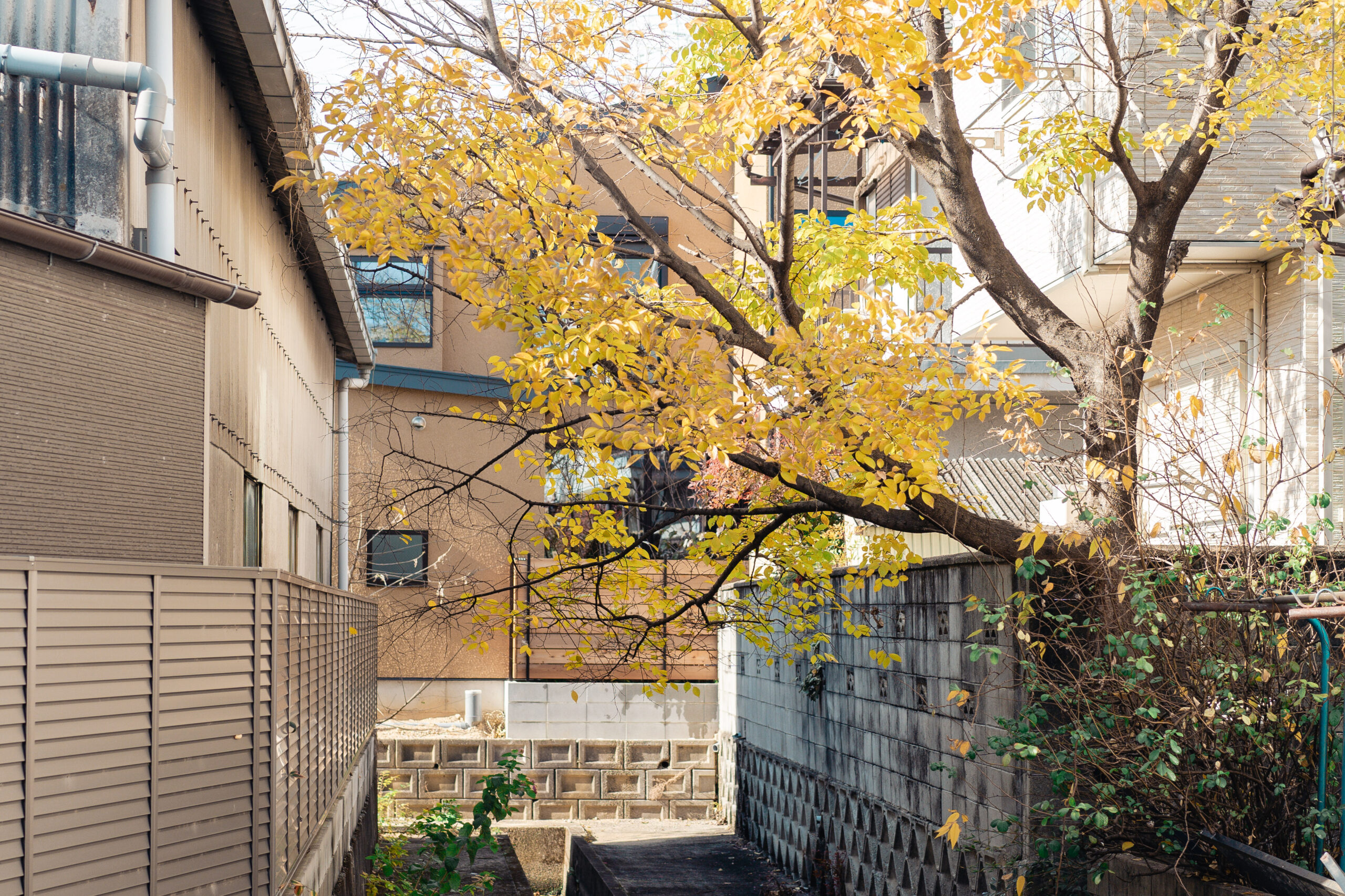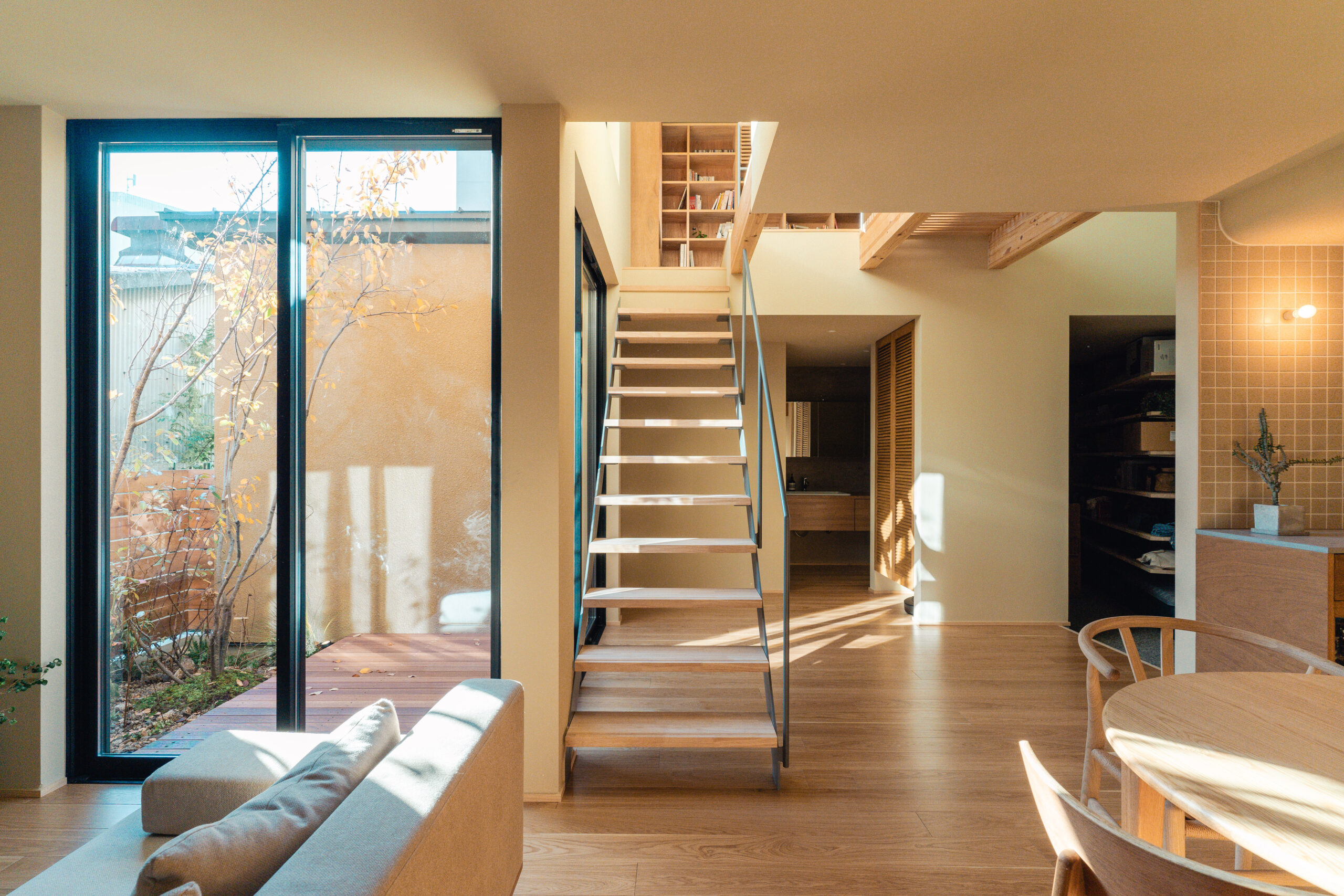 暮らしの中に「外」を感じられる時間を生むことがこの家のコンセプトであり、根幹である。中庭にはジューンベリー・ブルーベリー・ハクサンボクなどが植わり、春には実や花を求めて虫や鳥がやってくる、秋には紅葉や落ち葉が揺れる光景を目にする。日常の中でふとした変化に対する気づきや日々の新しさを感じられる場所を目指した。