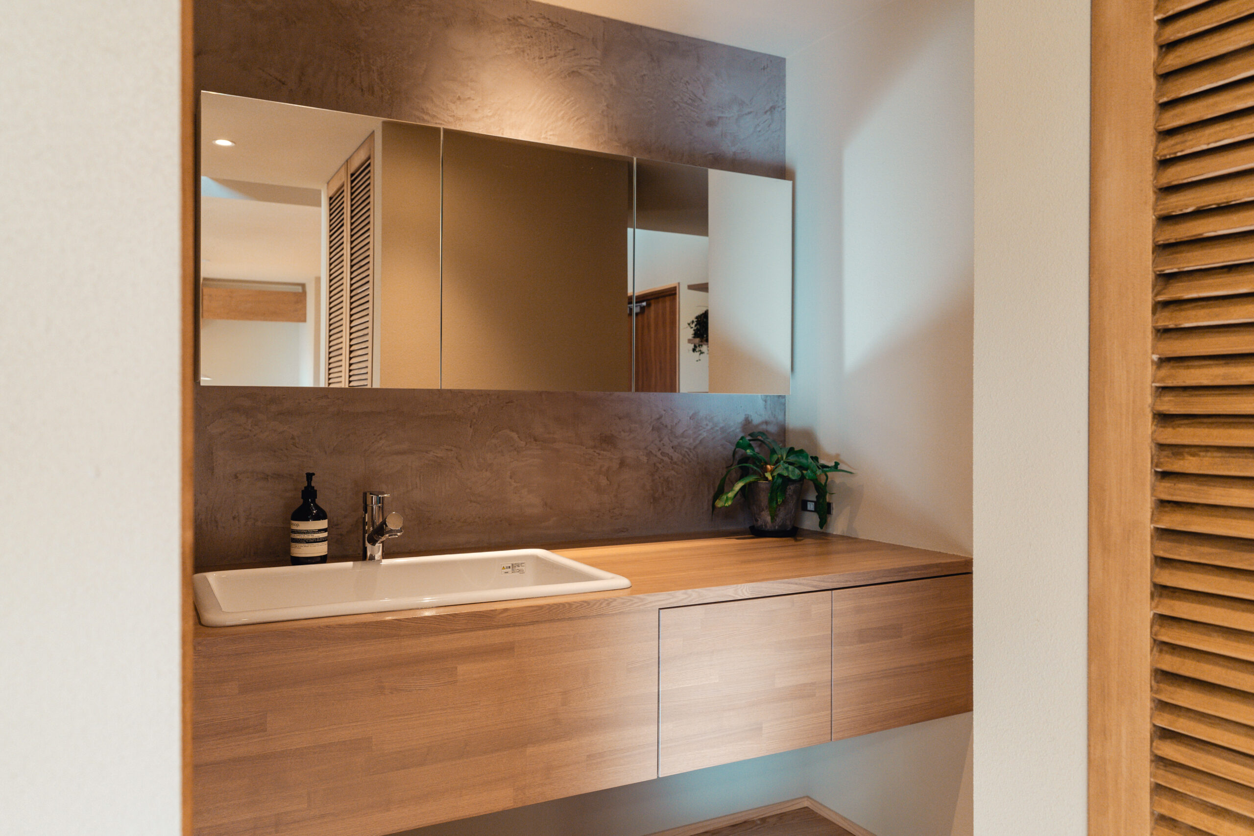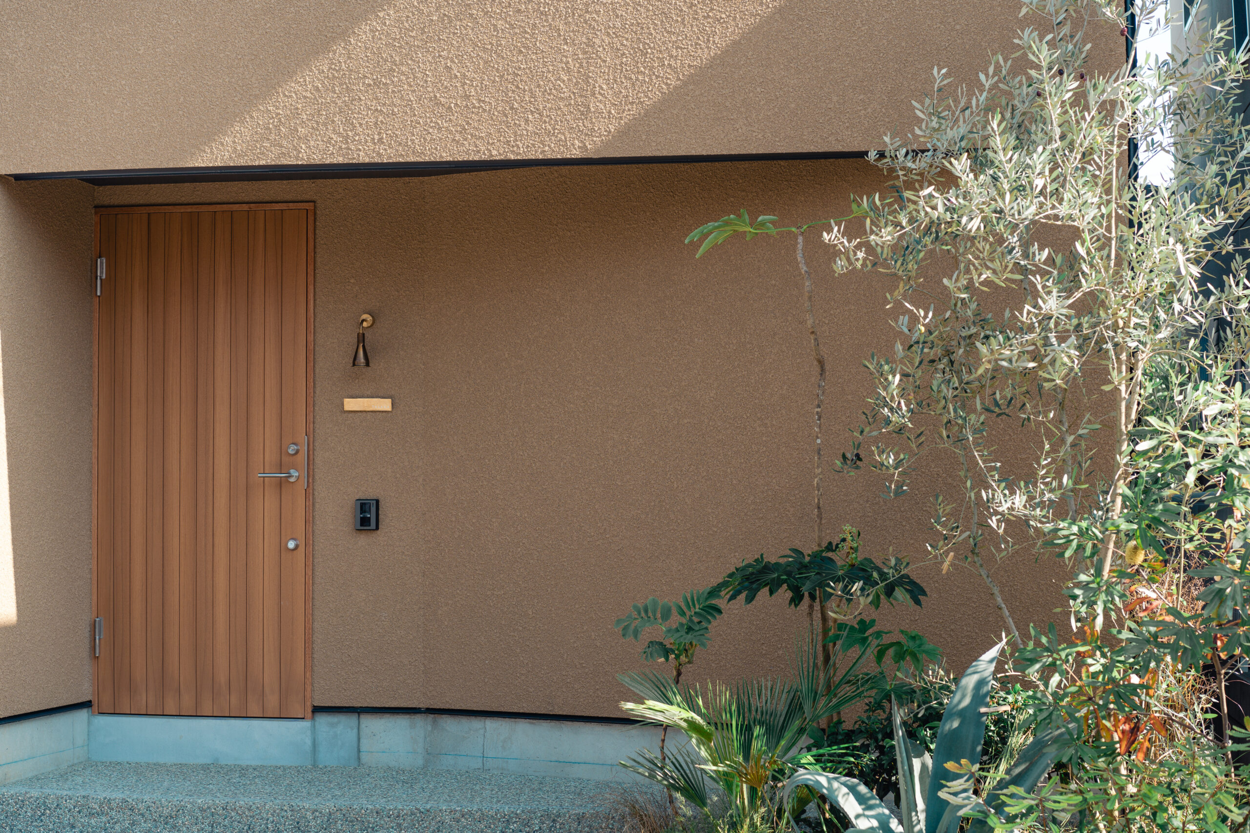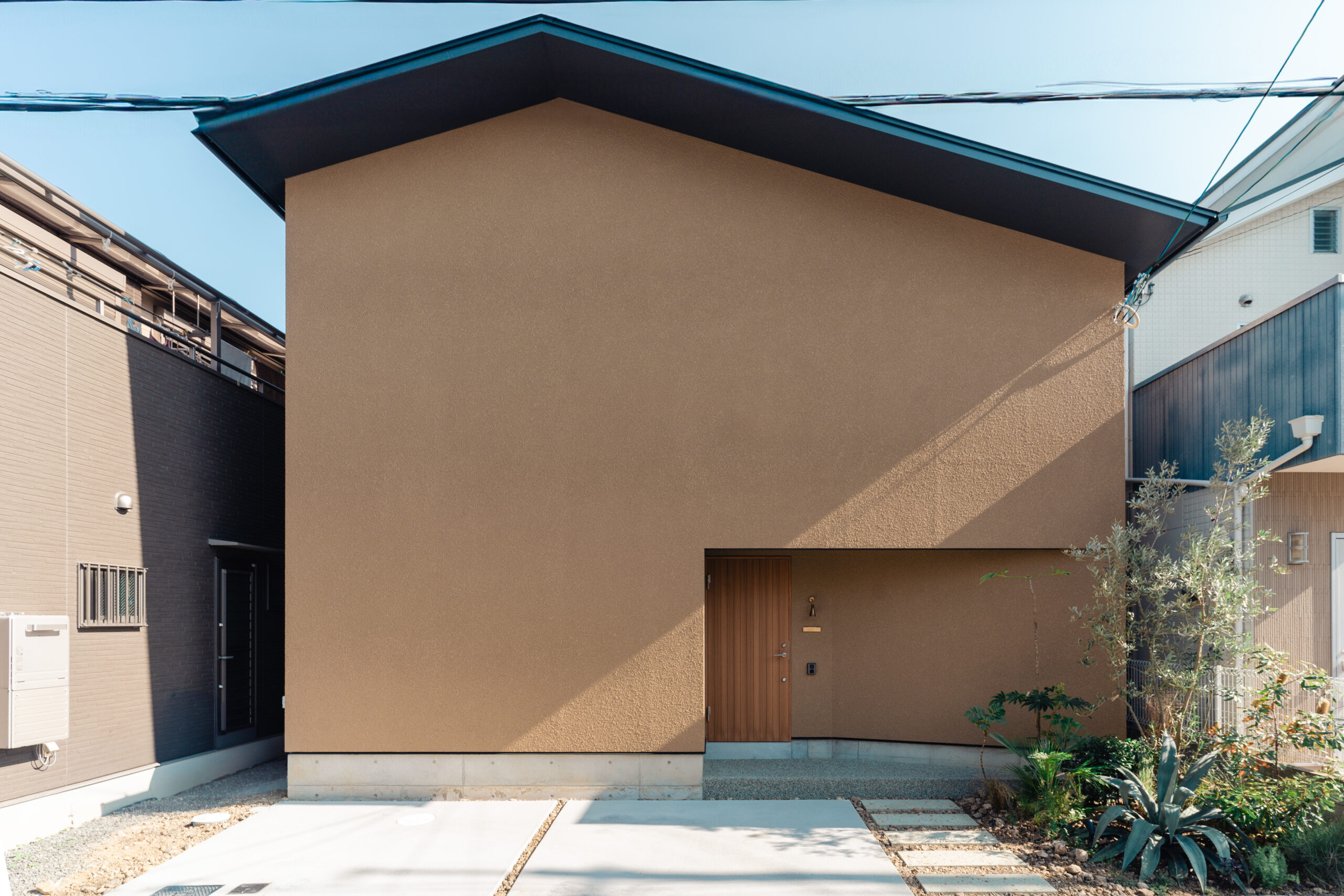 土地にある「土」によって動物の住処が作られたような、自然に近い質感を作るために外壁は土色の荒粒吹付塗装とした。アプローチに植わる常緑樹は夕方になると外壁に影を落とし、アシンメトリーにかけた切妻屋根の影と共に陰影は時間によって変化する。