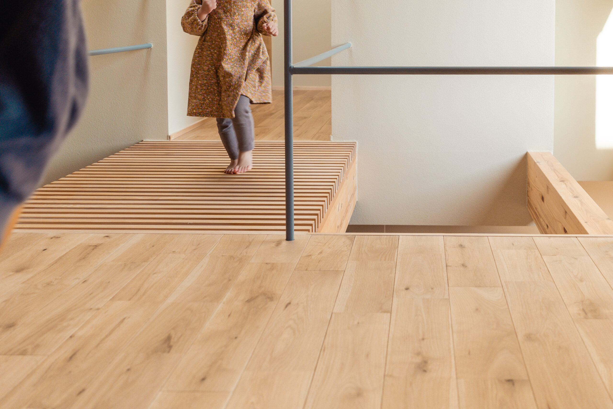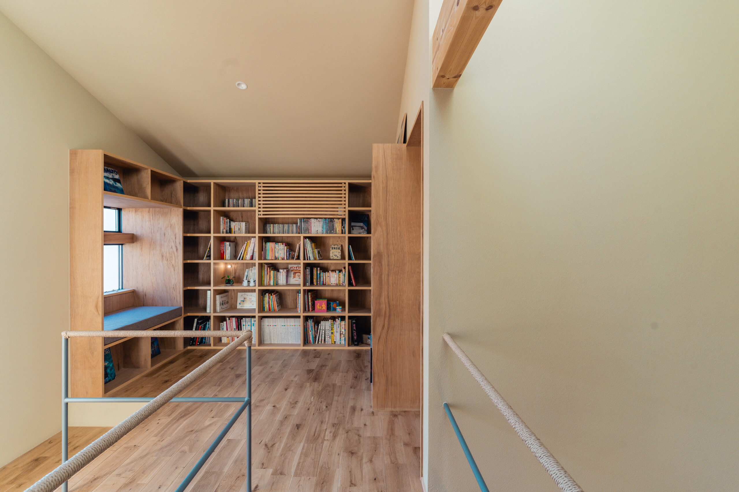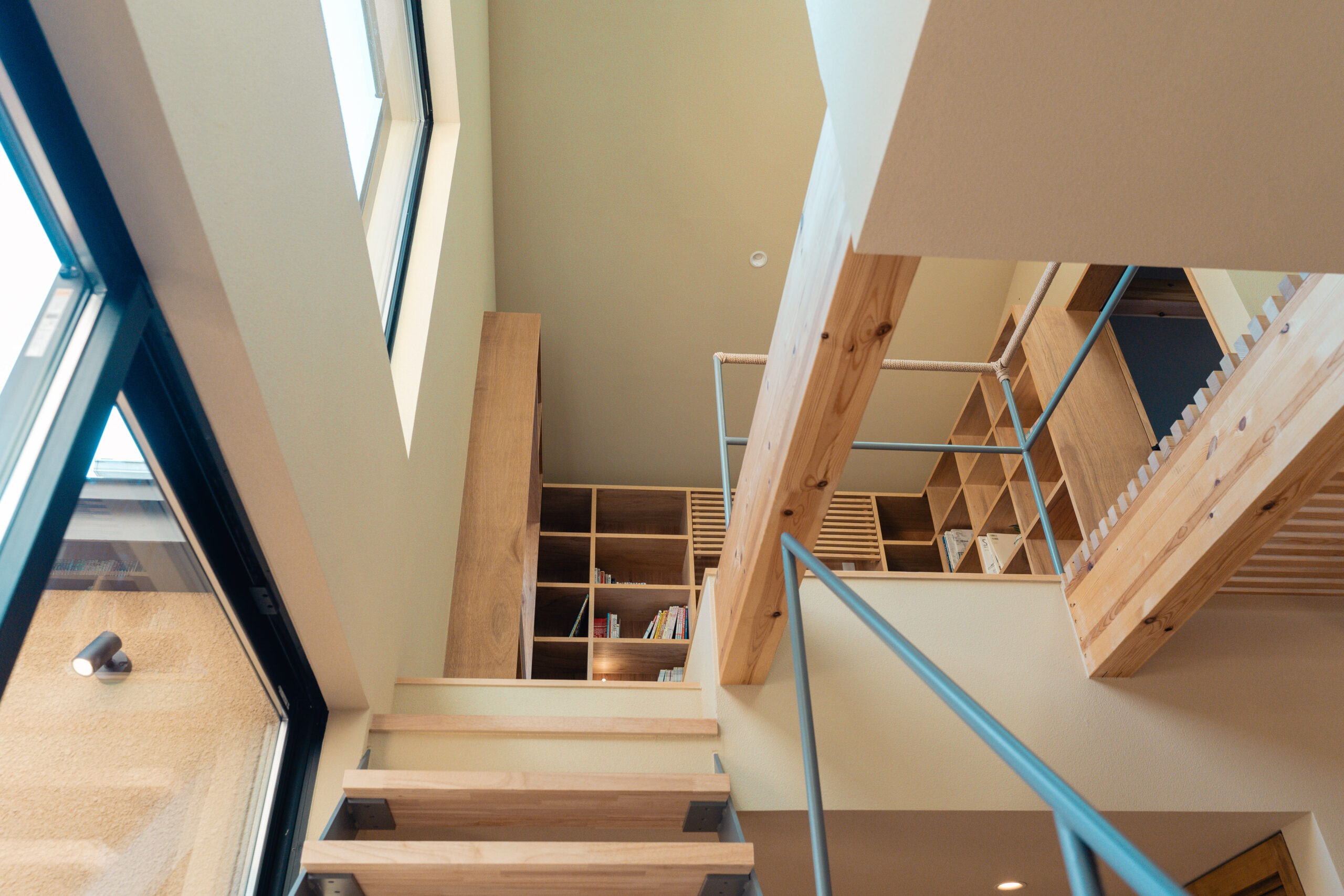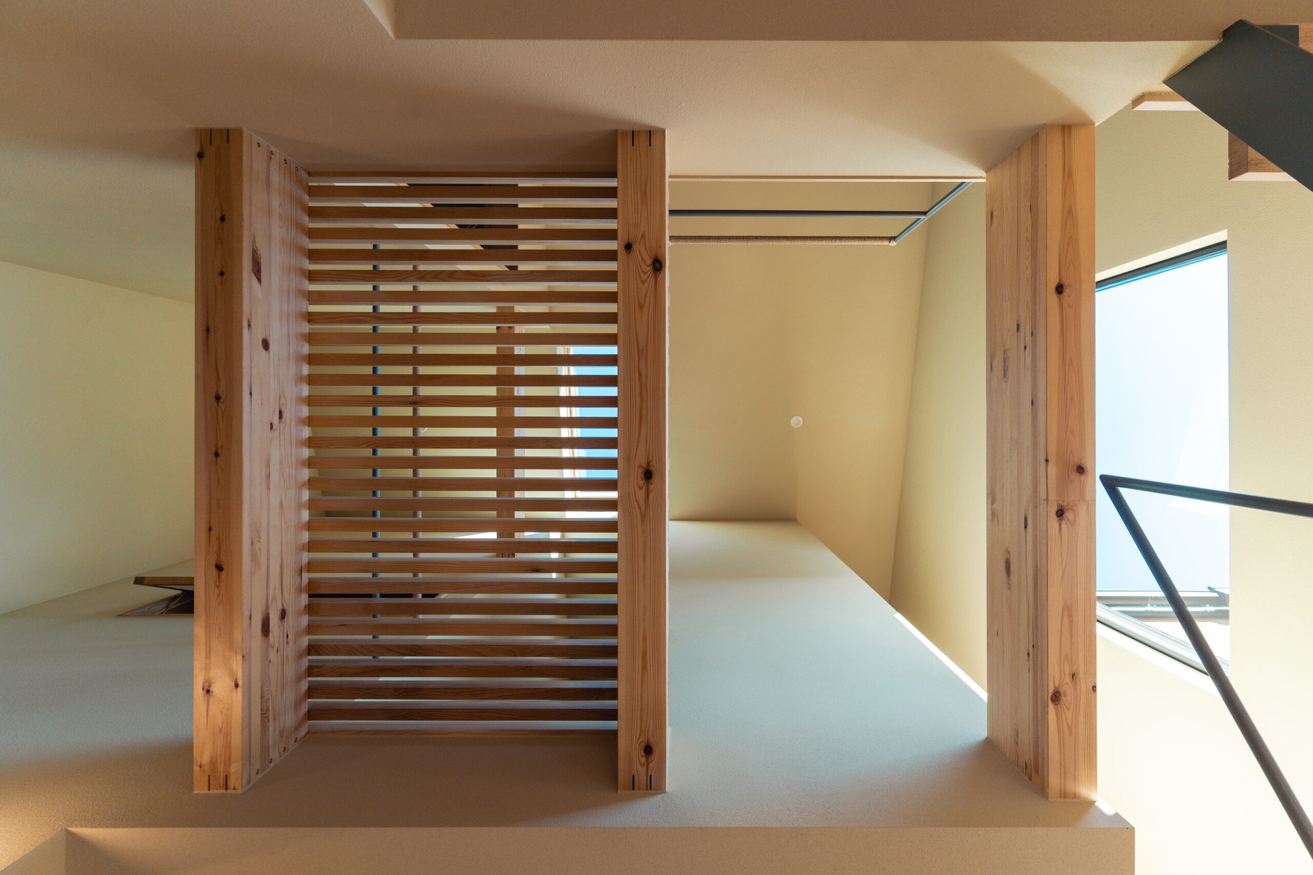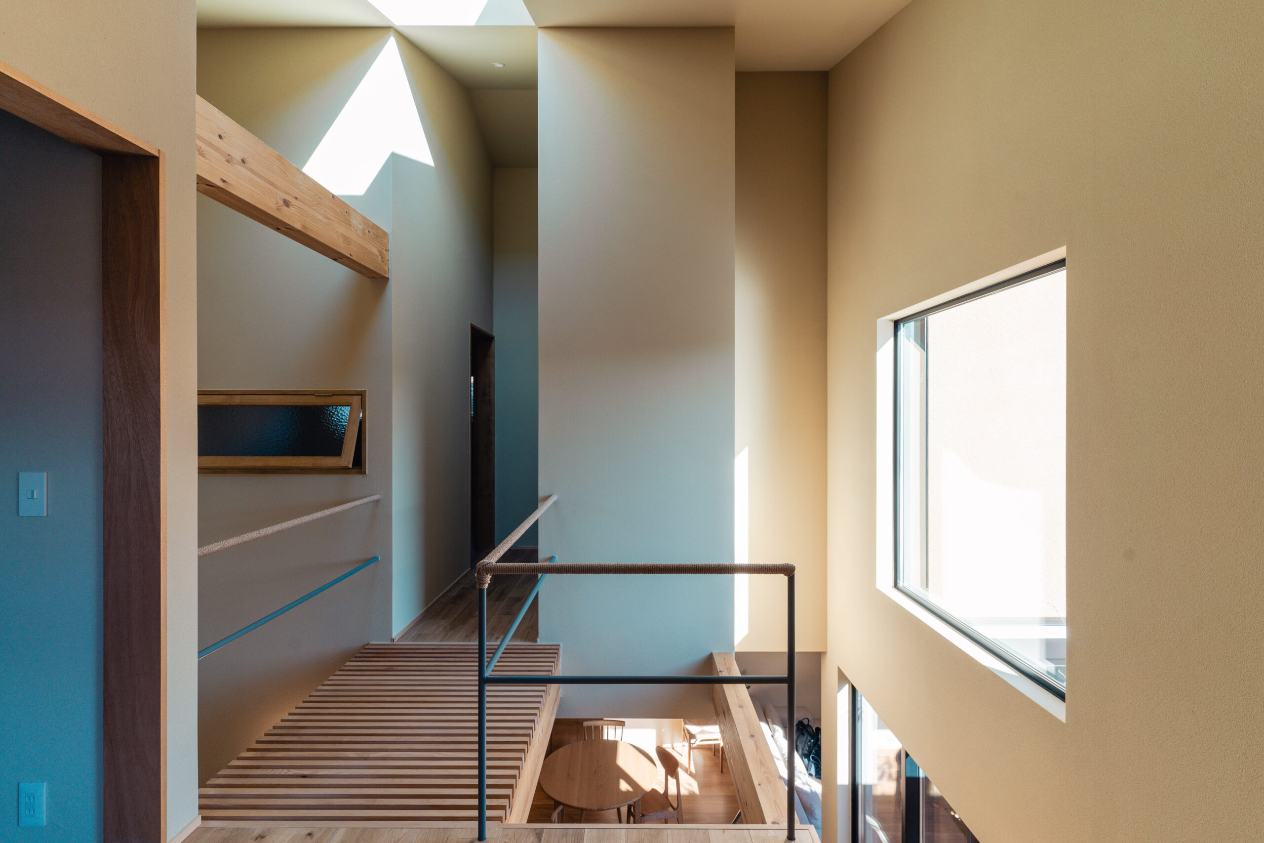 2階の空間は軸線を吹き抜けすることでトップライトからの光が1階まで届く。吹き抜けによって分かれたフロアは格子状の渡り廊下によって開放的に連続させた。