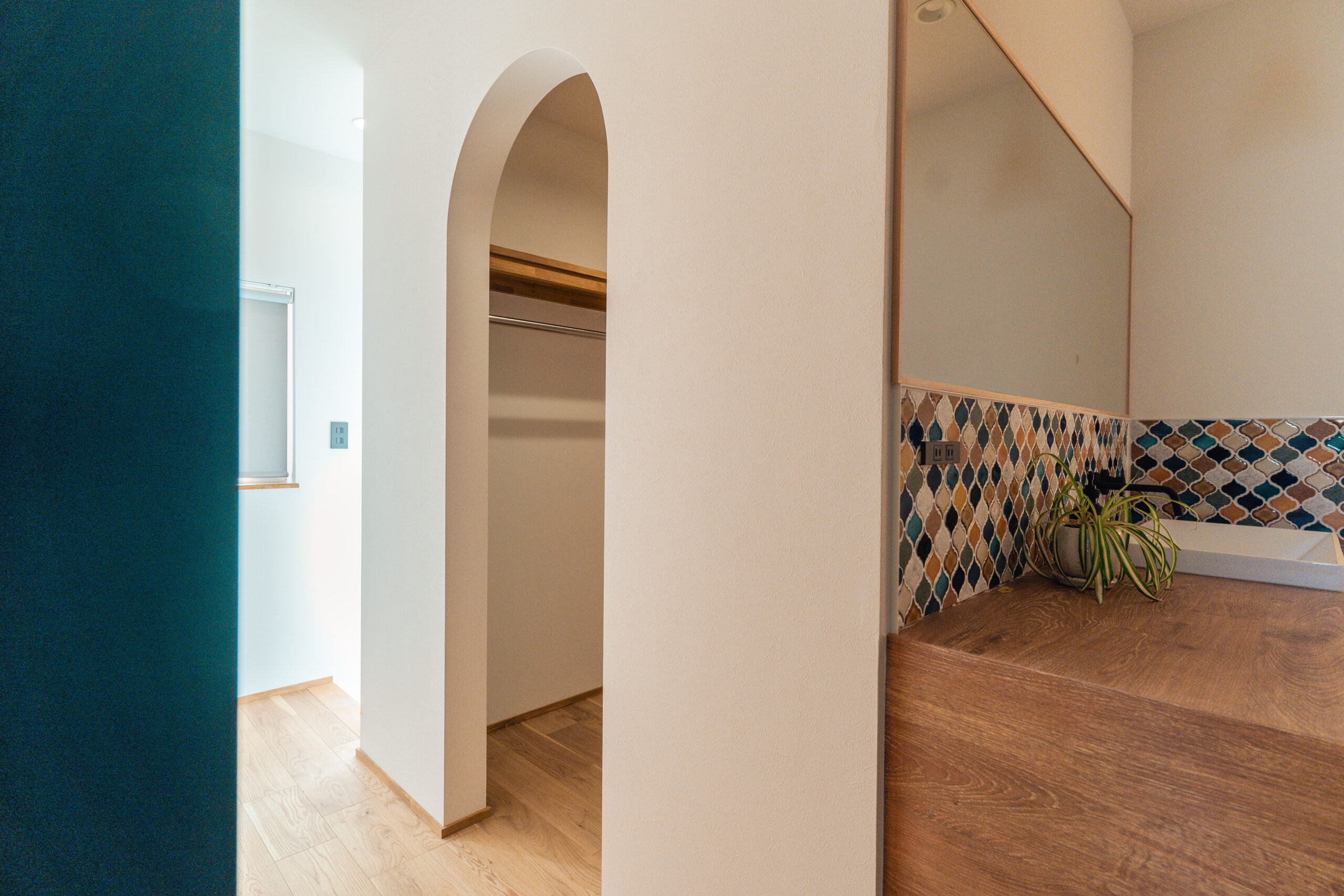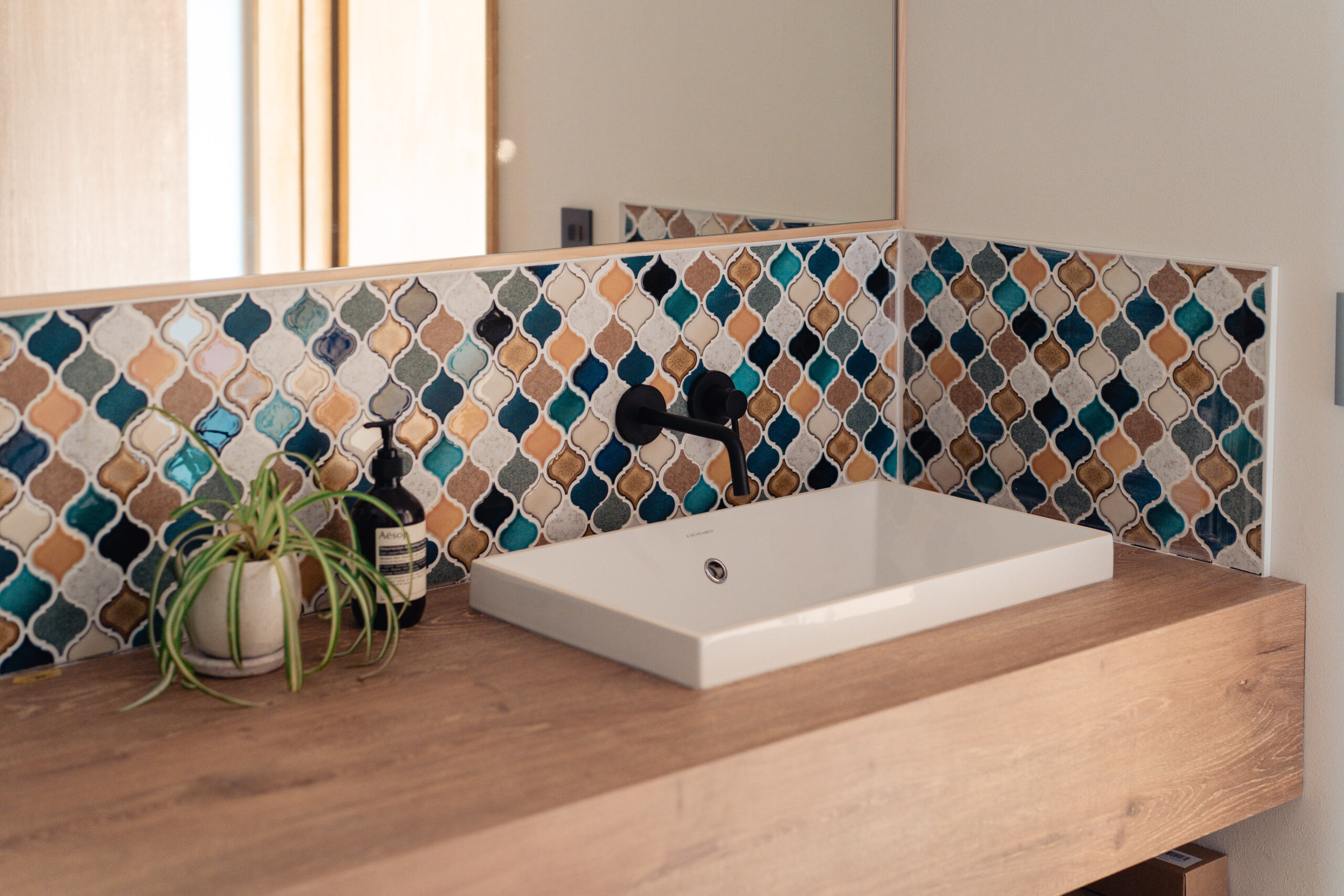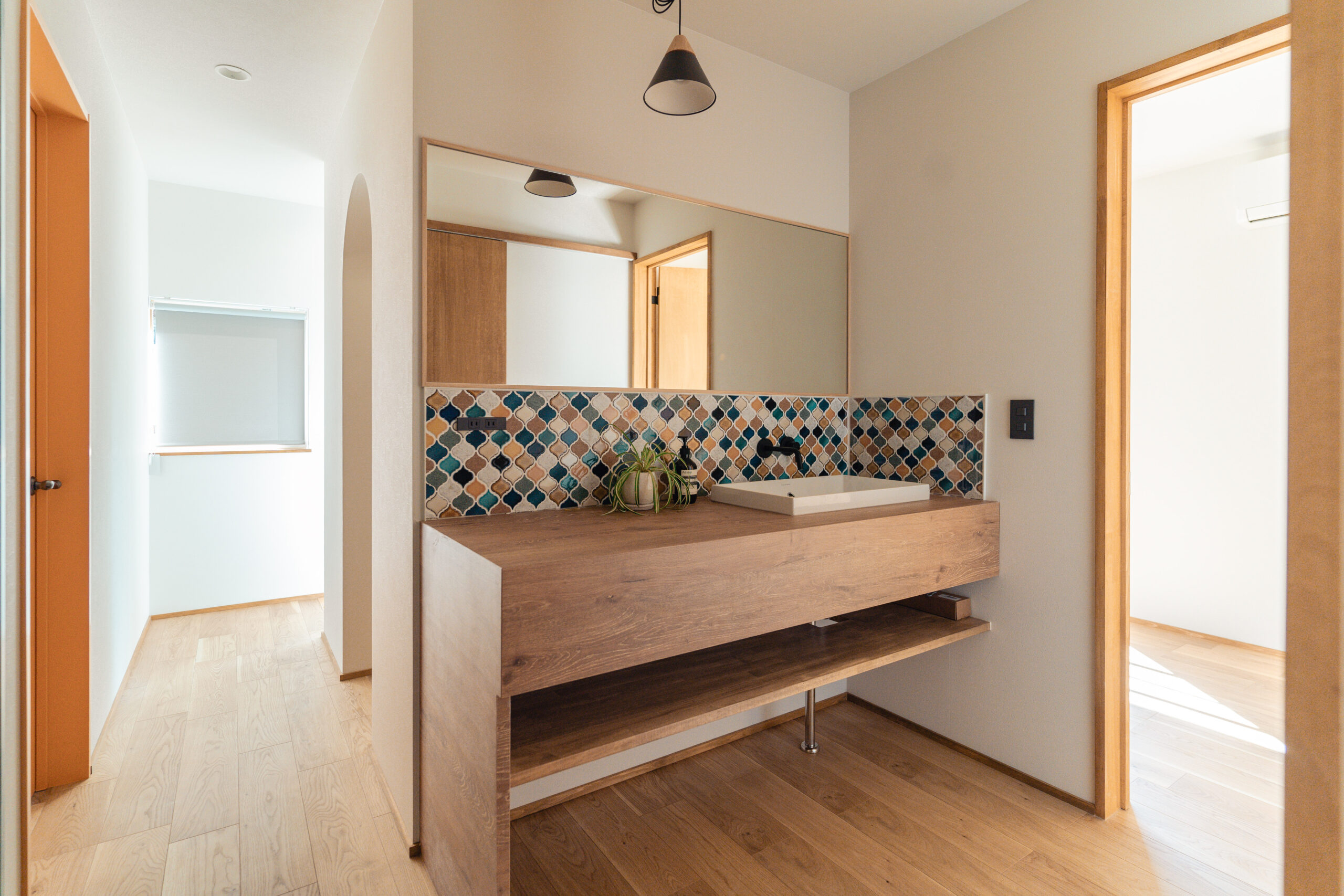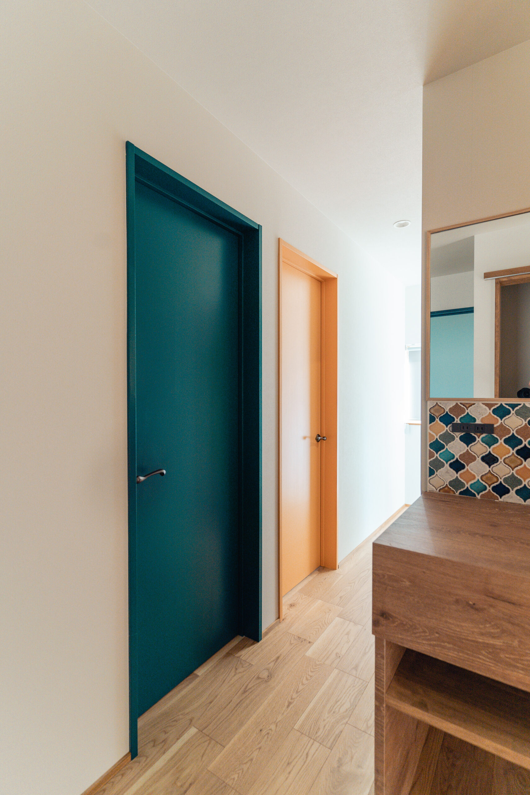 キッチンや洗面には、鮮やかなカラフルなタイルを使用。ドアや造作建具も個性的でありながら、家全体の調和を考えたデザインに仕上げました。どこを見ても、家族の個性が感じられる色使いが魅力です。