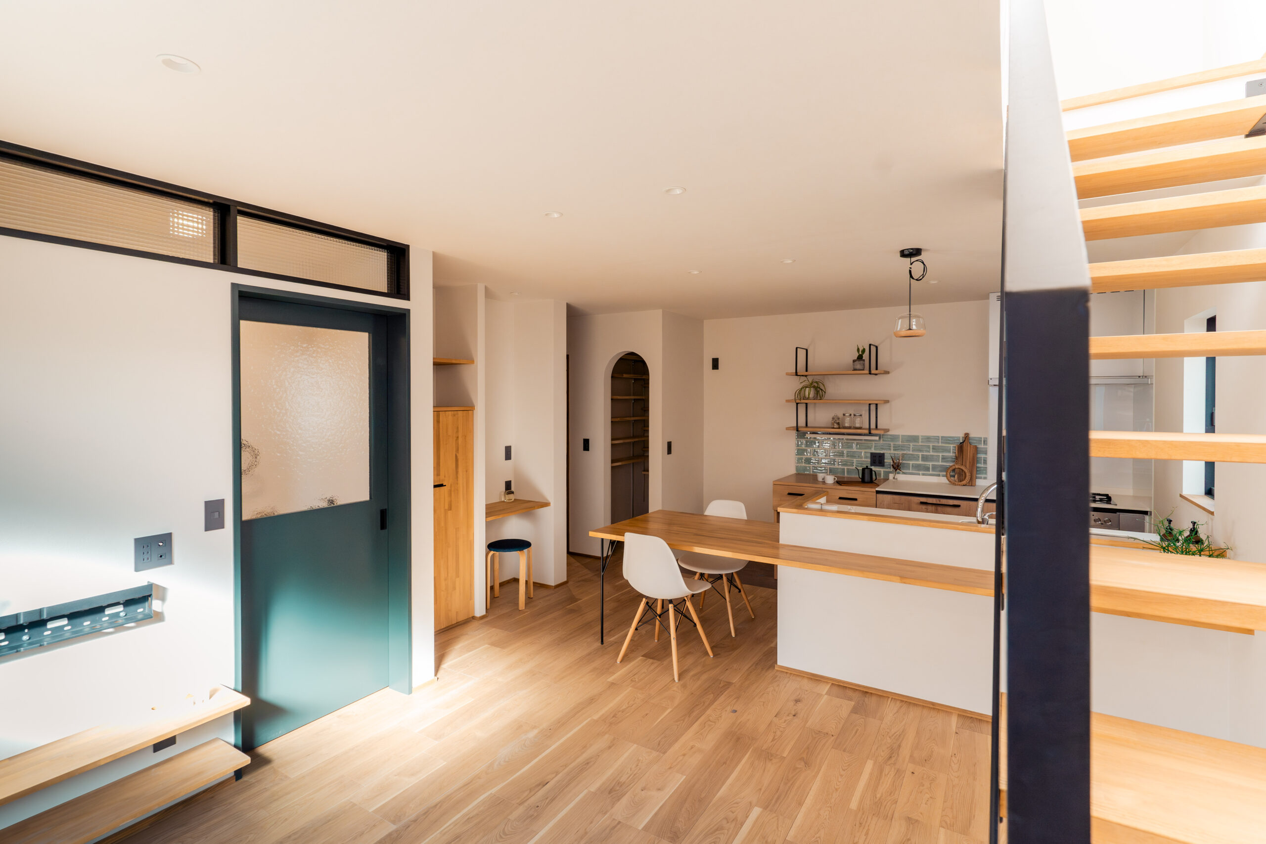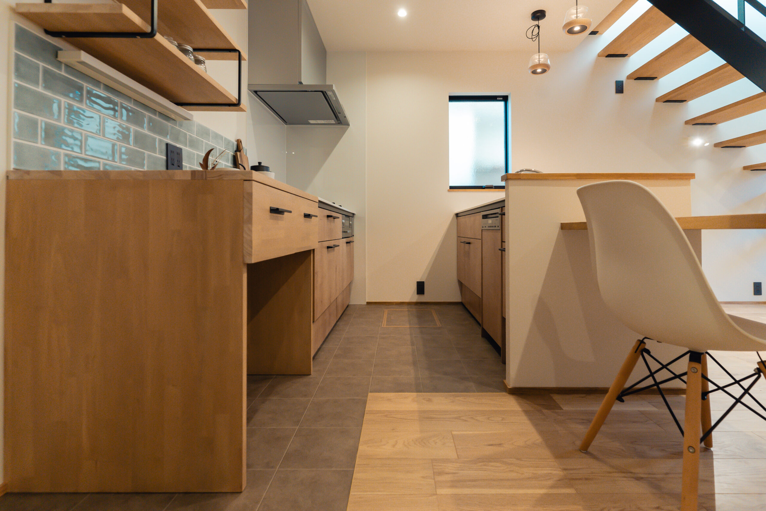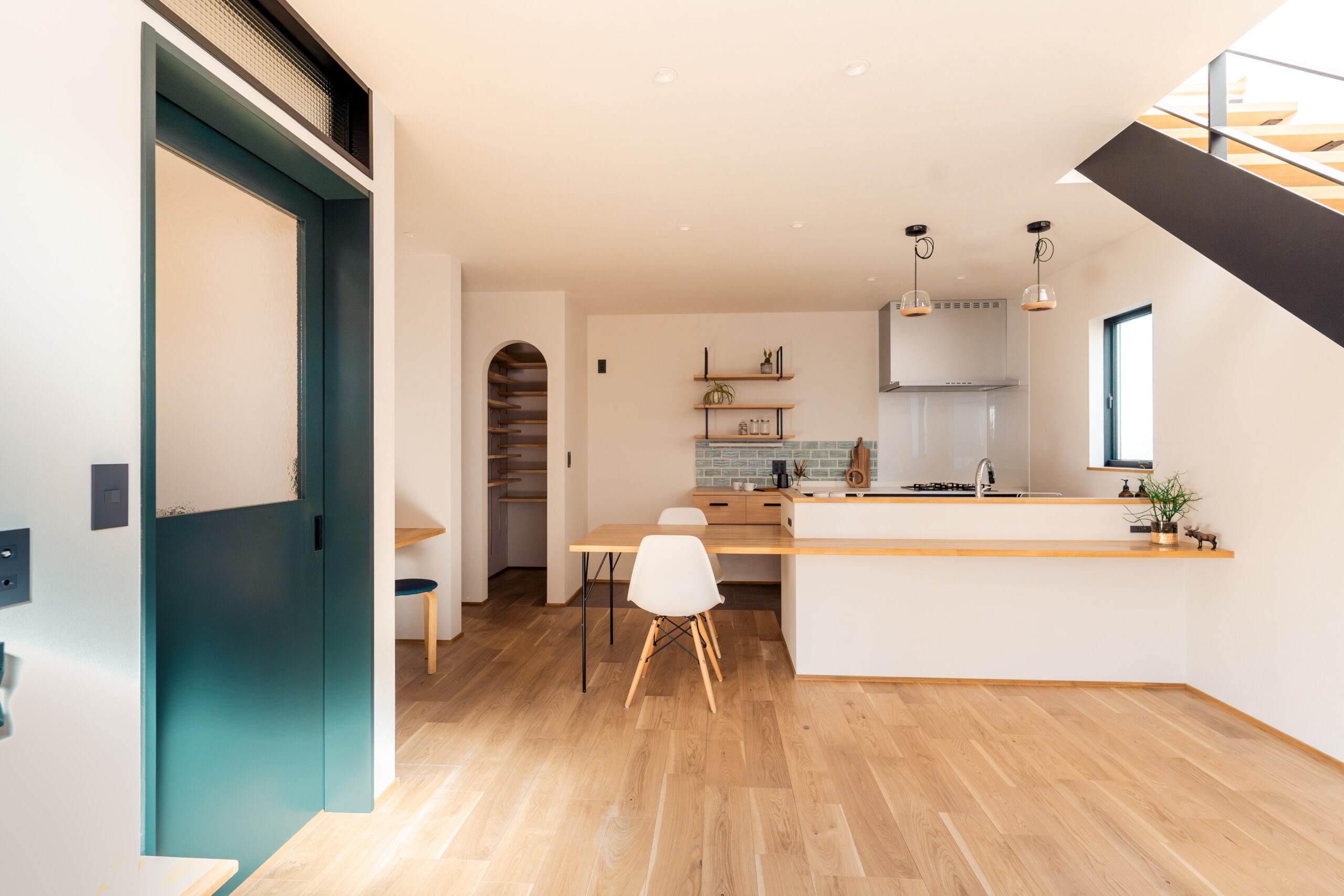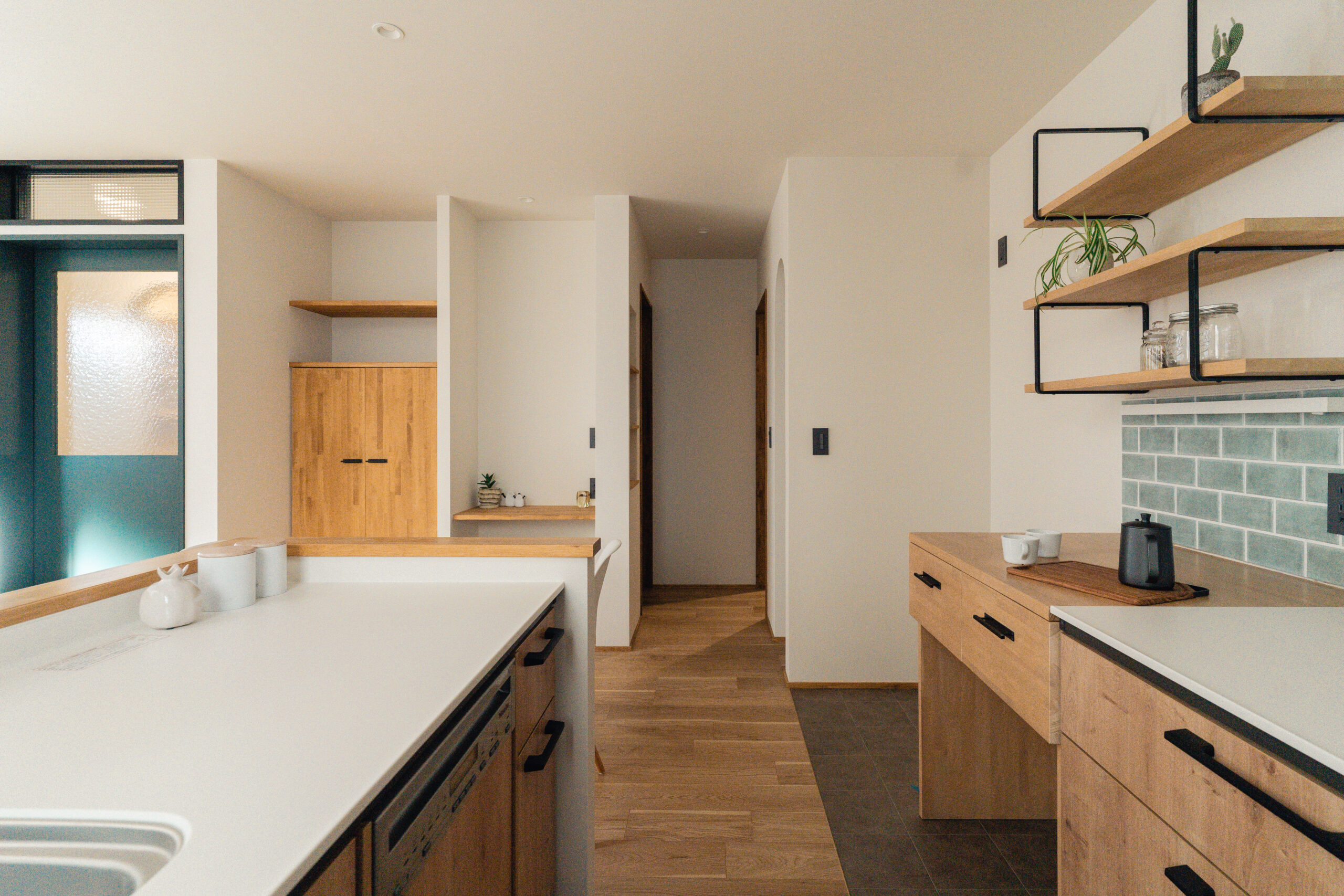 キッチンや洗面には、鮮やかなカラフルなタイルを使用。ドアや造作建具も個性的でありながら、家全体の調和を考えたデザインに仕上げました。どこを見ても、家族の個性が感じられる色使いが魅力です。