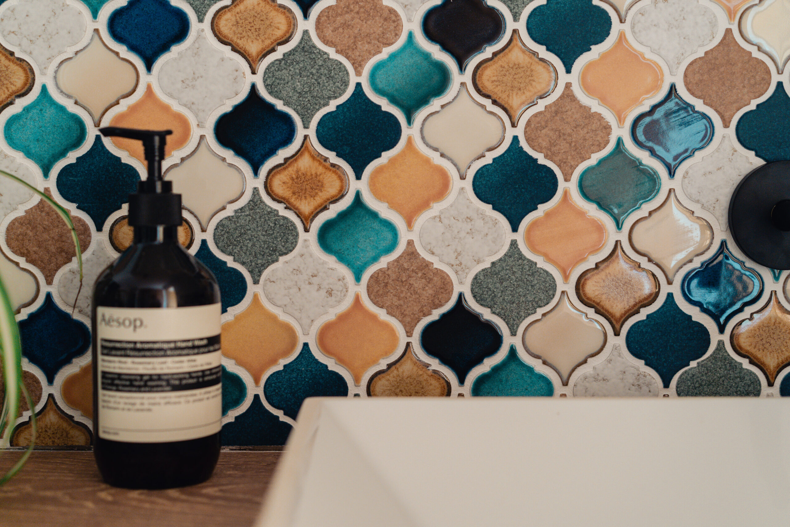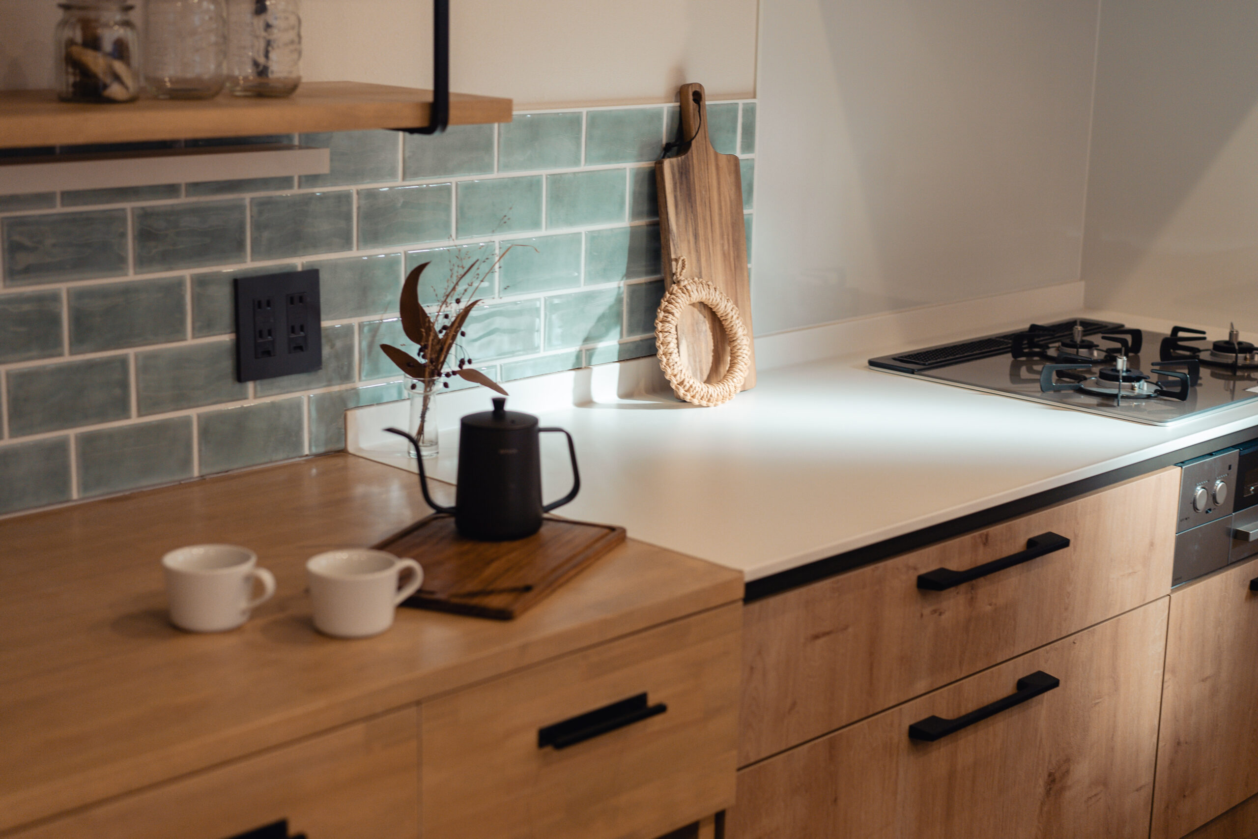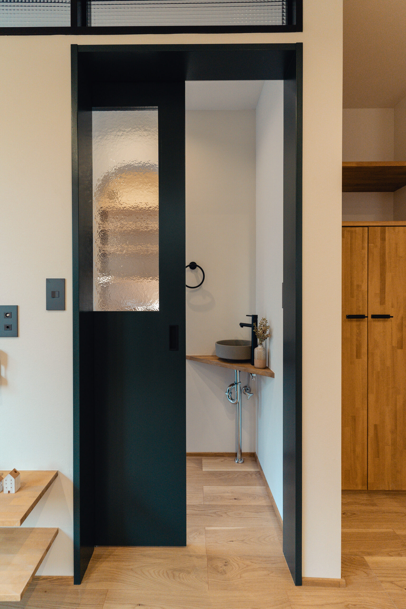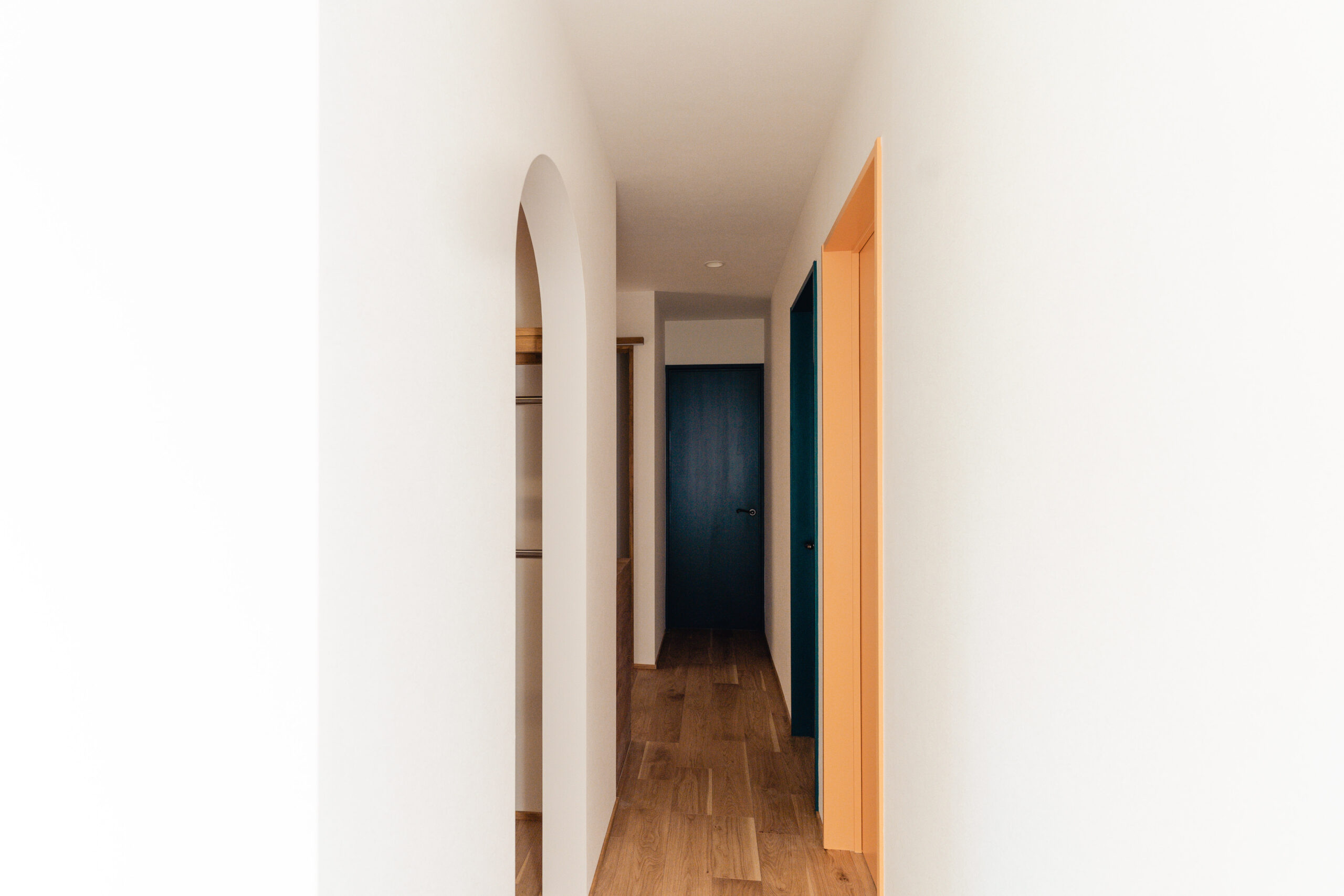キッチンや洗面には、鮮やかなカラフルなタイルを使用。ドアや造作建具も個性的でありながら、家全体の調和を考えたデザインに仕上げました。どこを見ても、家族の個性が感じられる色使いが魅力です。