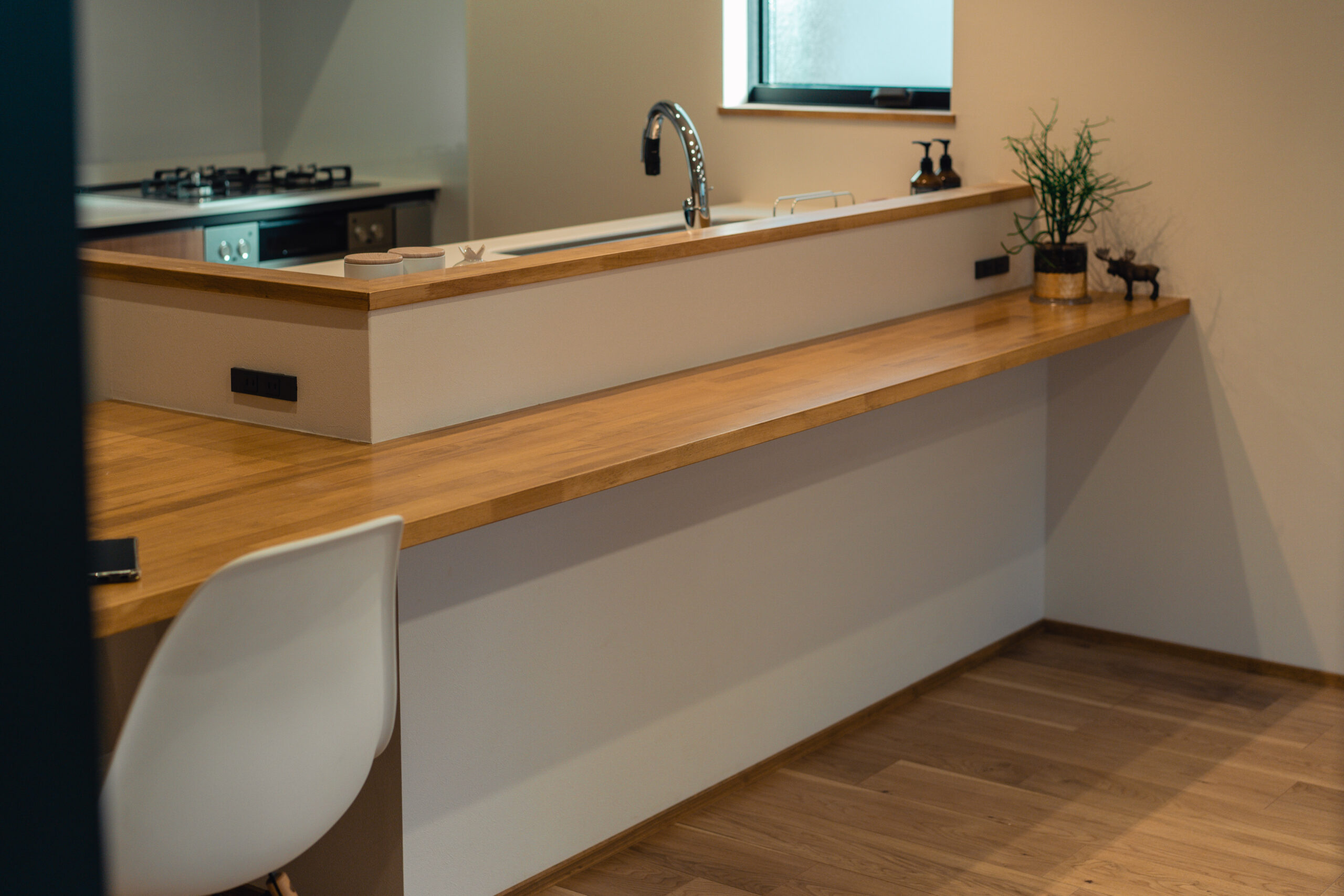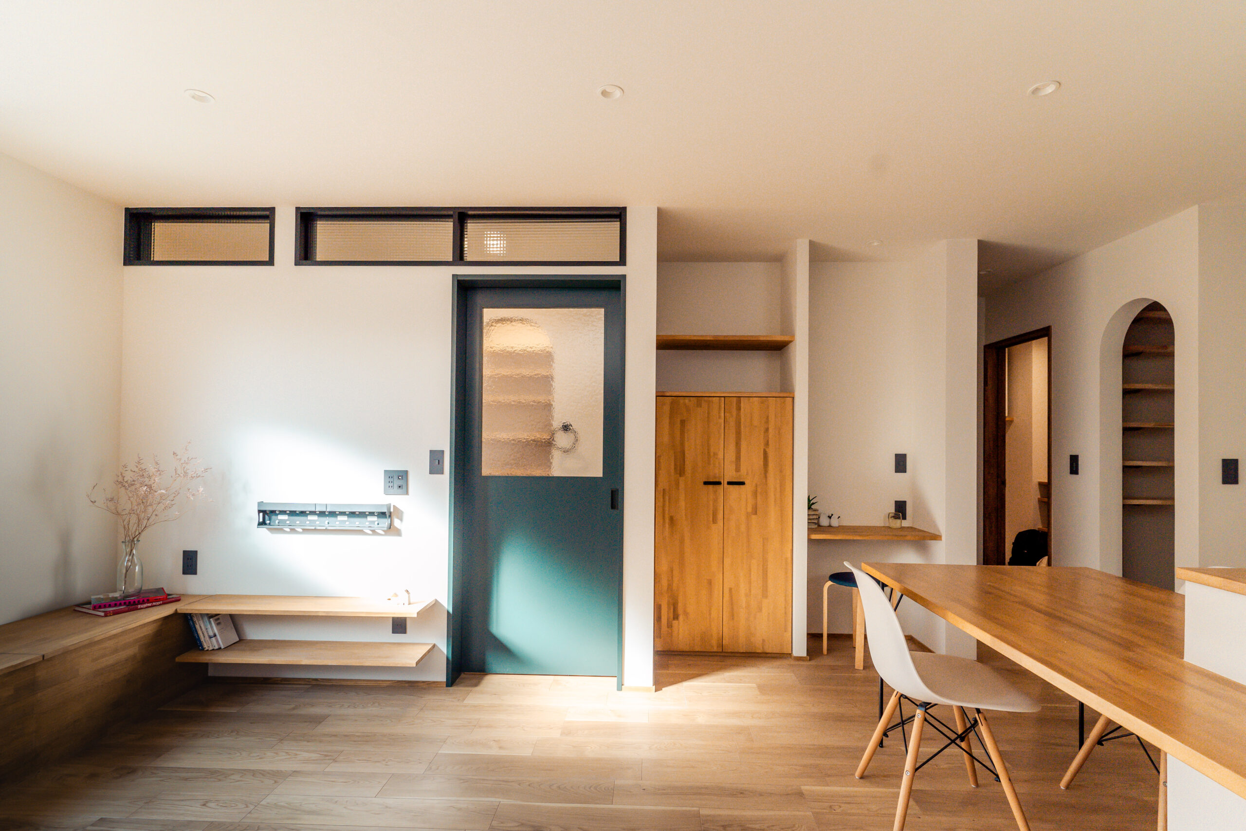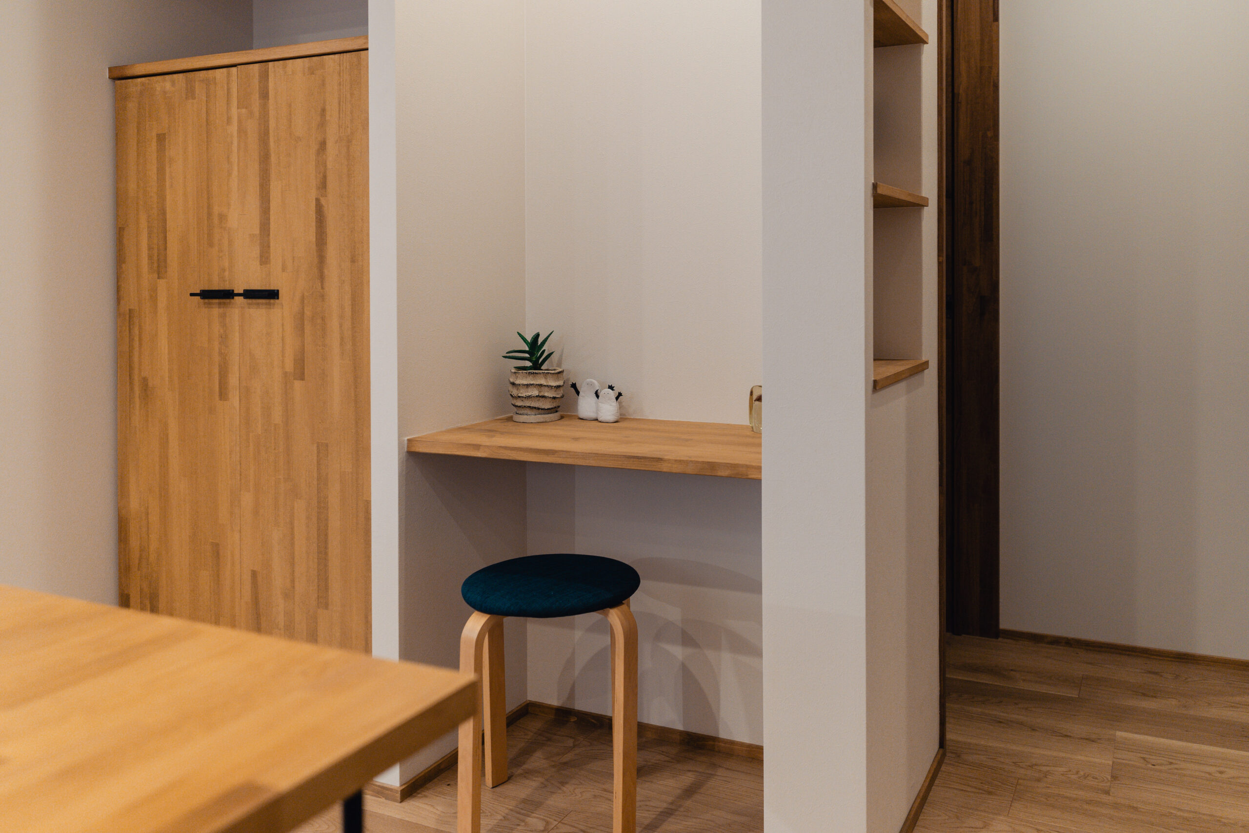 家族のライフスタイルを考慮し、収納機能を兼ね備えた造作のワークスペースを設置。リモートワークや家事の合間にも使える便利なスペースとなり、生活の中で必要な物を整理整頓しやすくしています。
