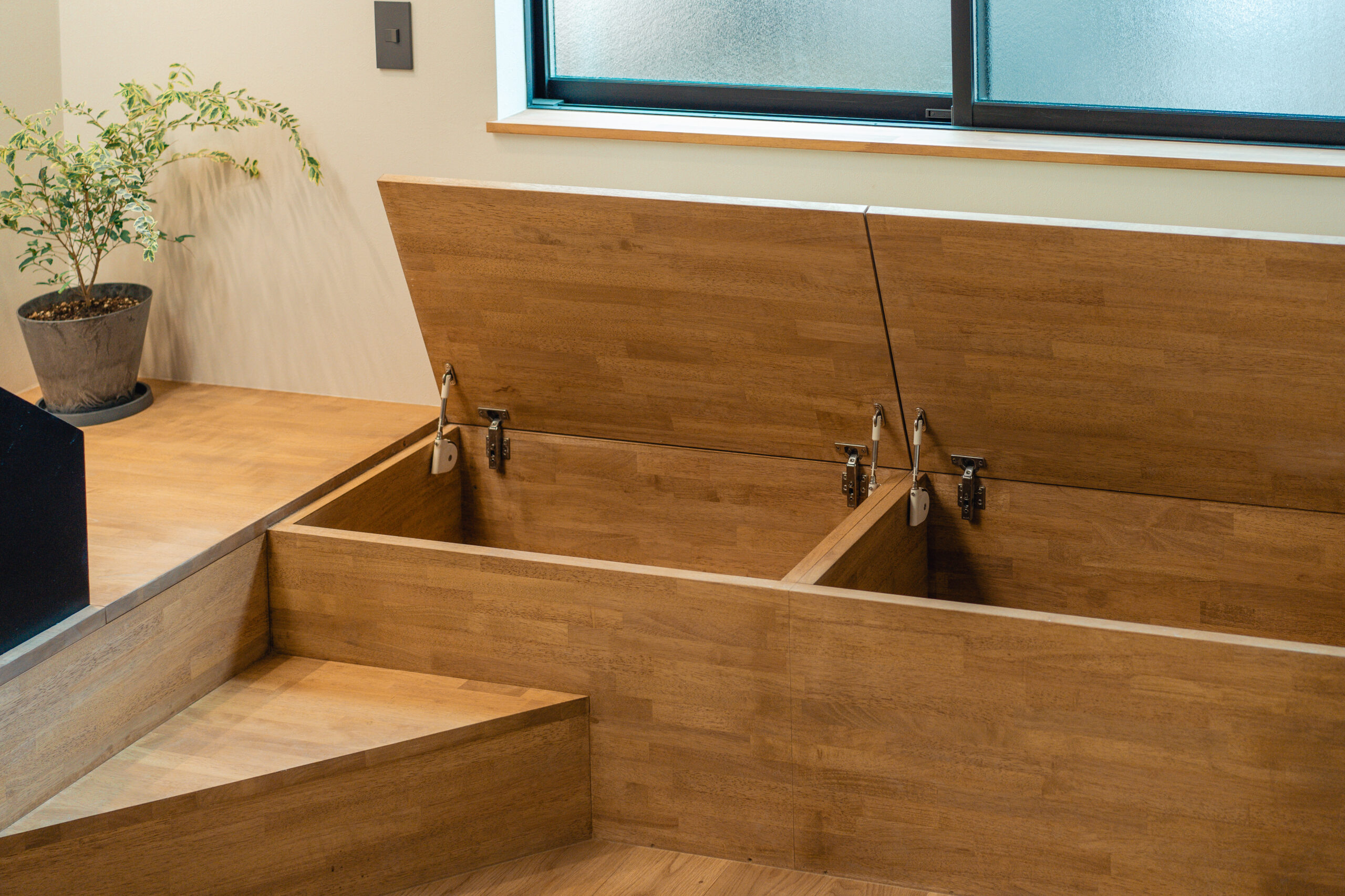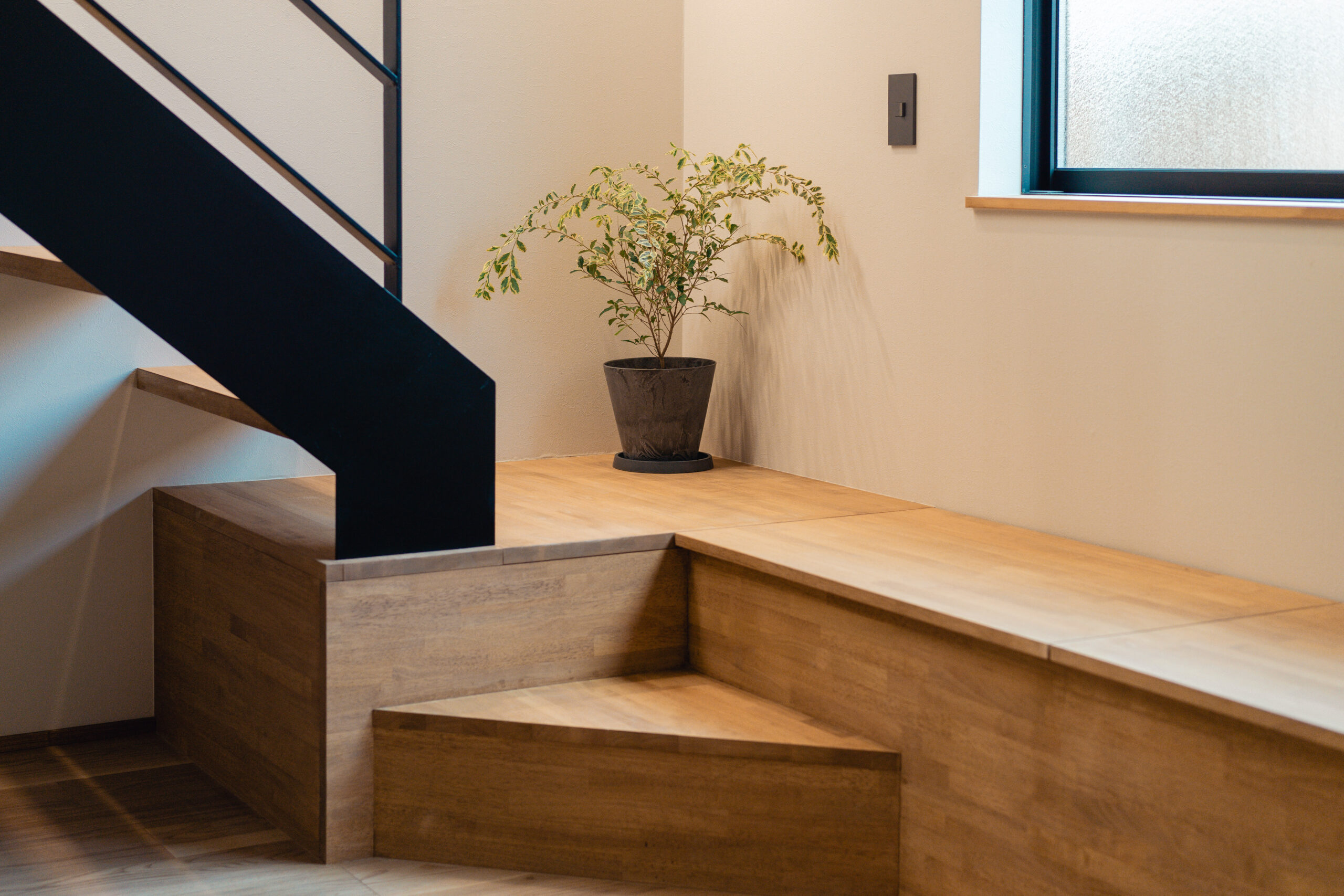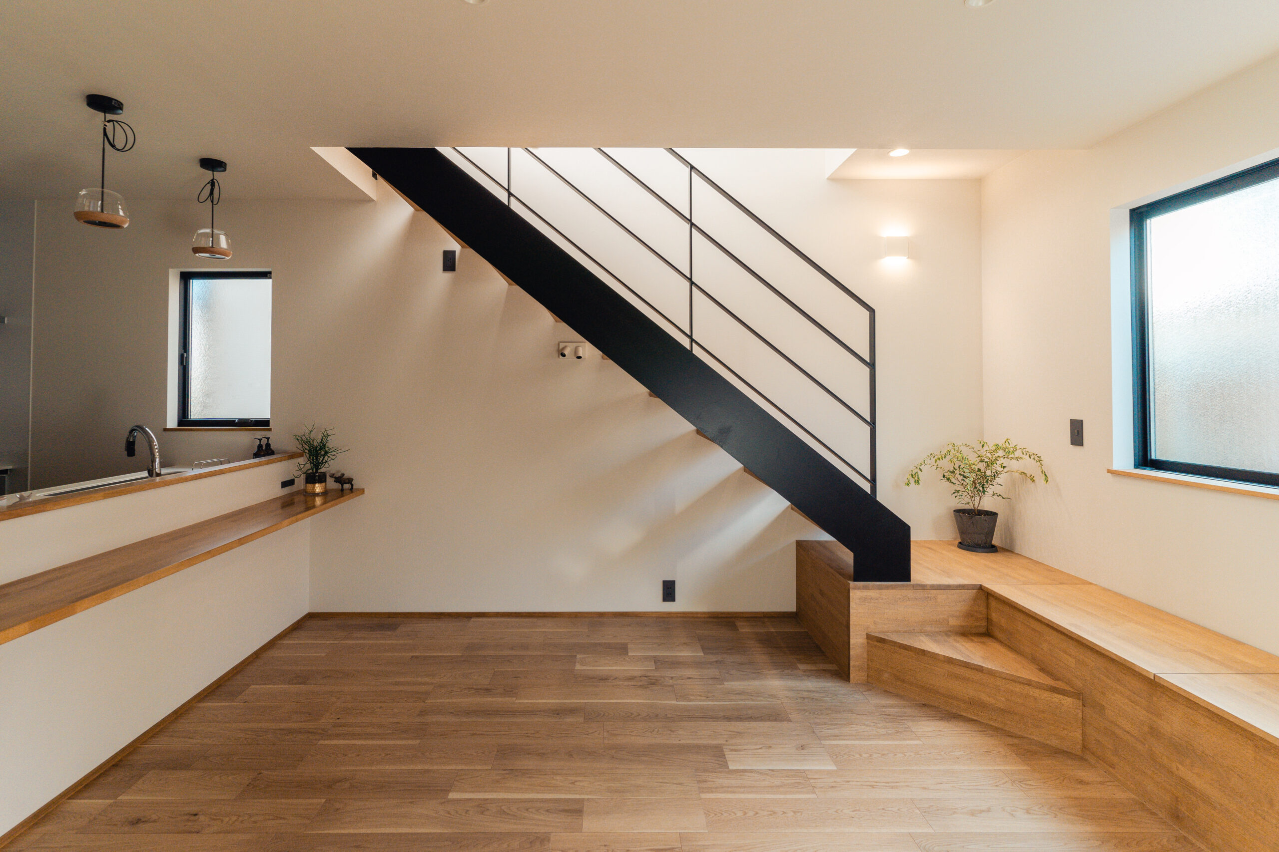 2階への階段部分に造作ベンチを配置することで、家族が自然に集まる場所を演出しました。階段と一体化したデザインが、スペースを有効活用し、家の中に動きと温かみを加えています。
