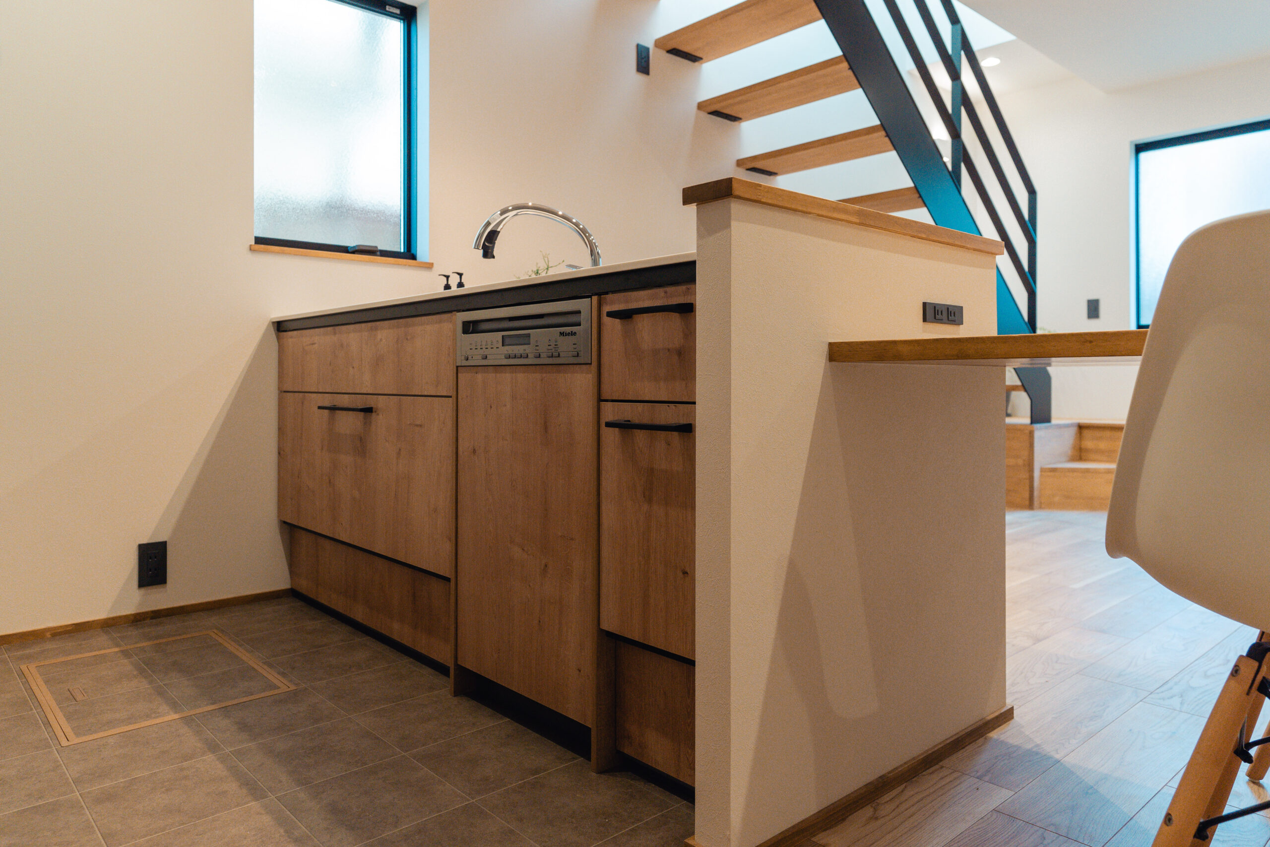 キッチンの腰壁とダイニングカウンターをつなげることで、家事の動線を効率化。料理をしながら家族とのコミュニケーションを楽しむことができる、新しい形の「家事楽」を実現しました。