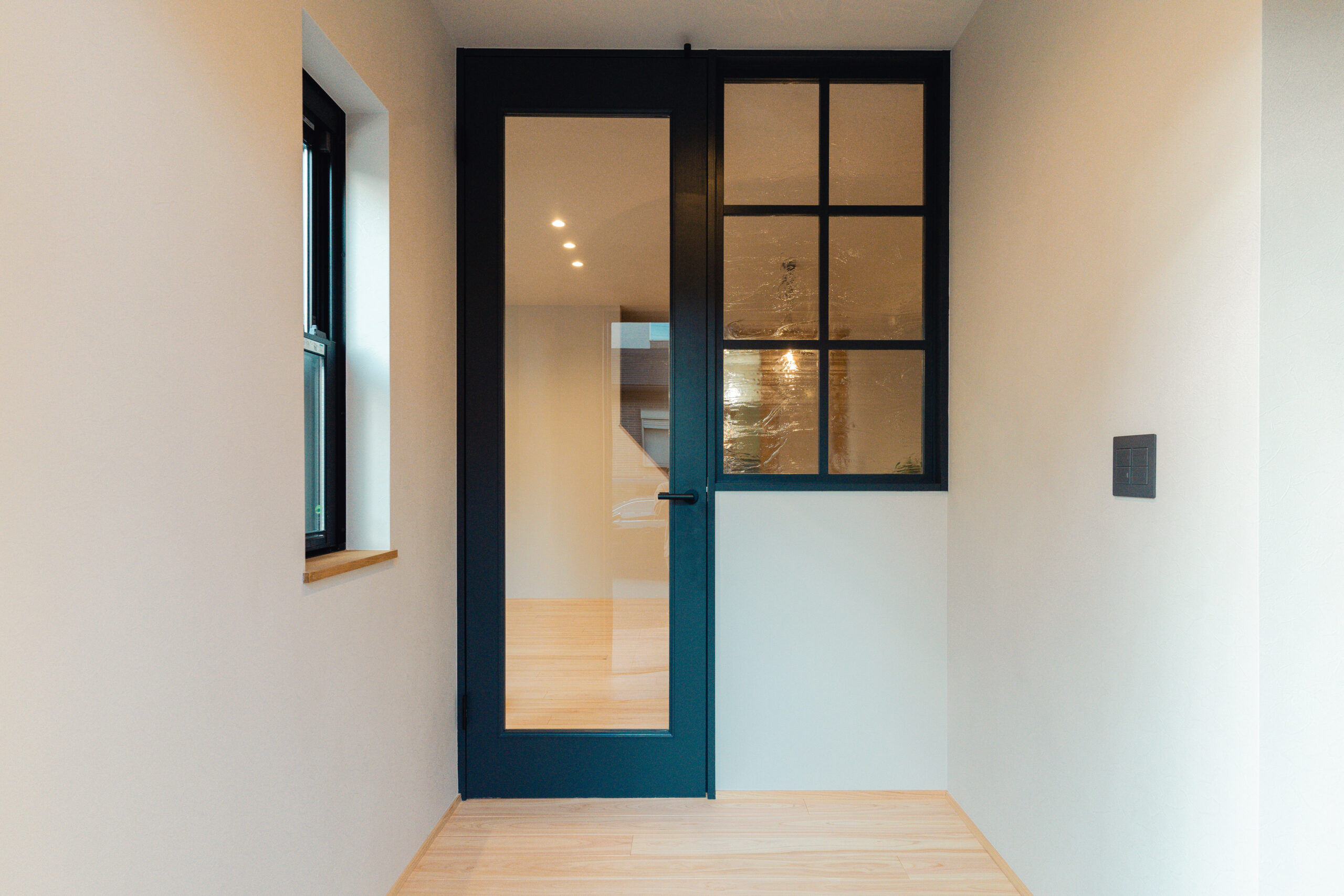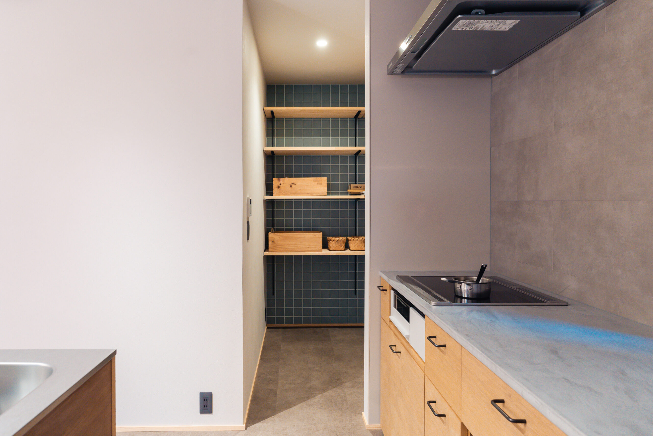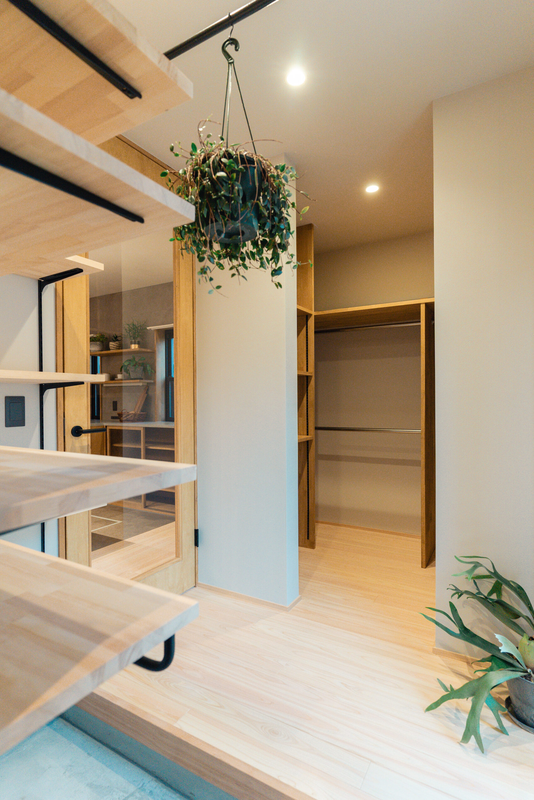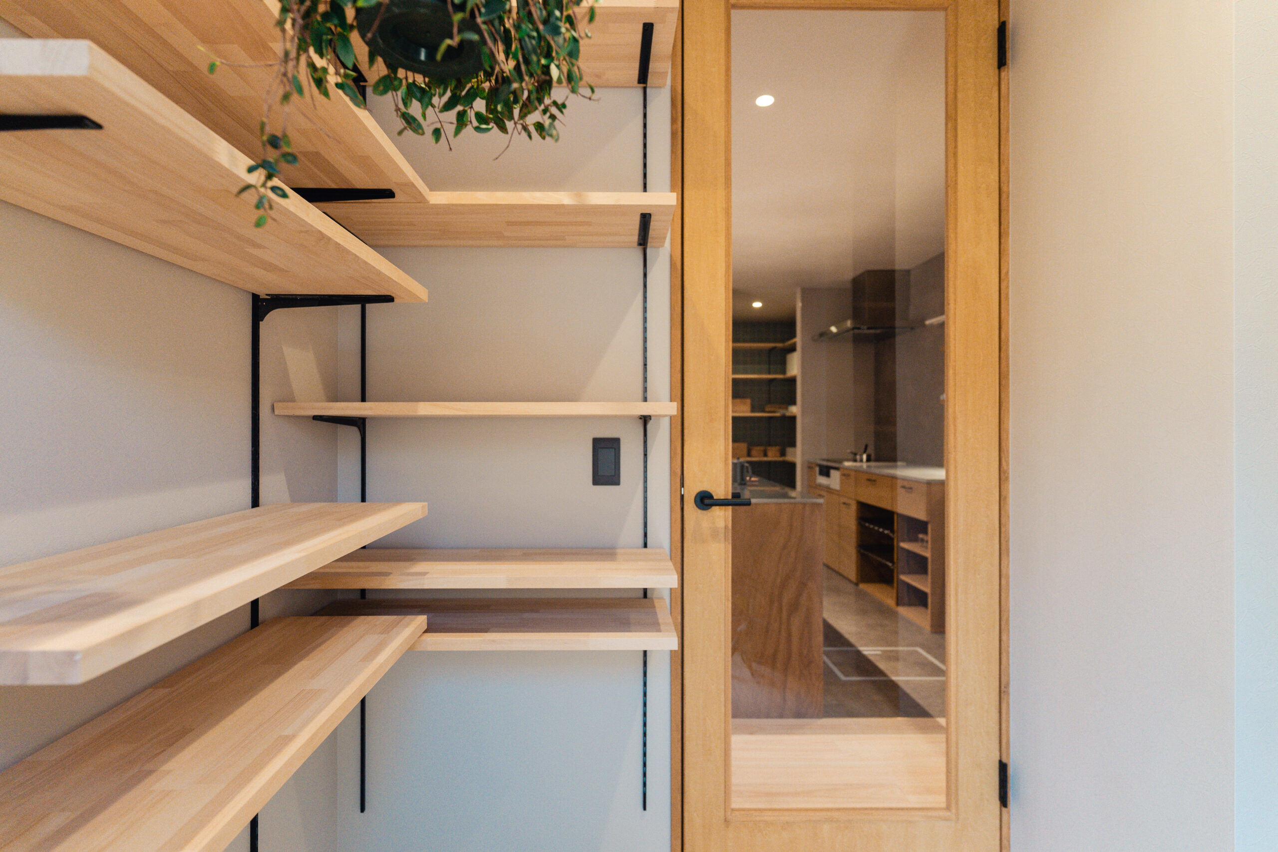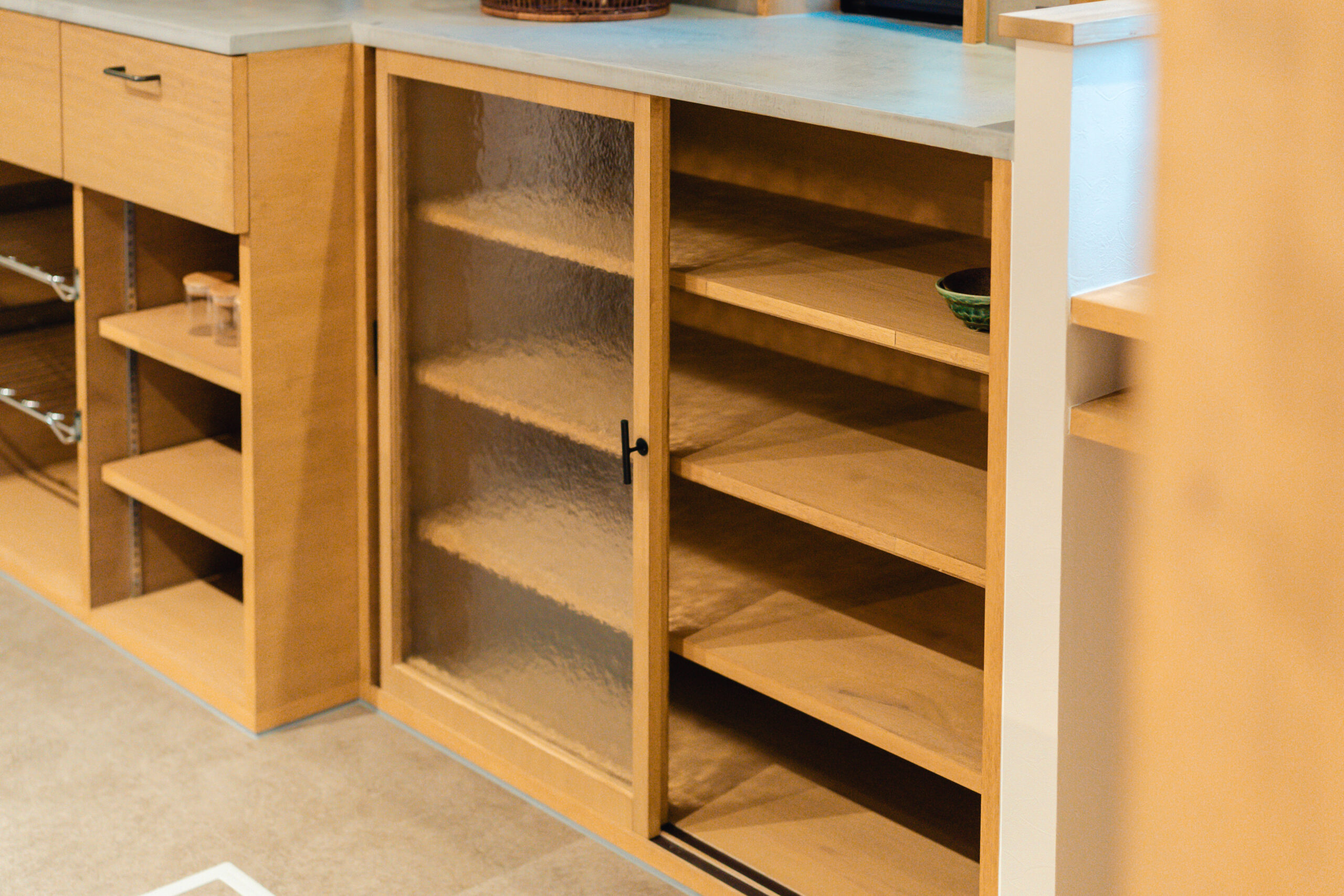 また、キッチンだけでなく、家全体の収納スペースにもアイデアが盛り込まれており、片付けやすさが考慮されています。その他にも、ハイドアを用いることで視線を遮りながらも開放感を損なわずに空間を仕切ることができ、部屋全体のつながりを感じながらもプライバシーの確保された空間となりました。