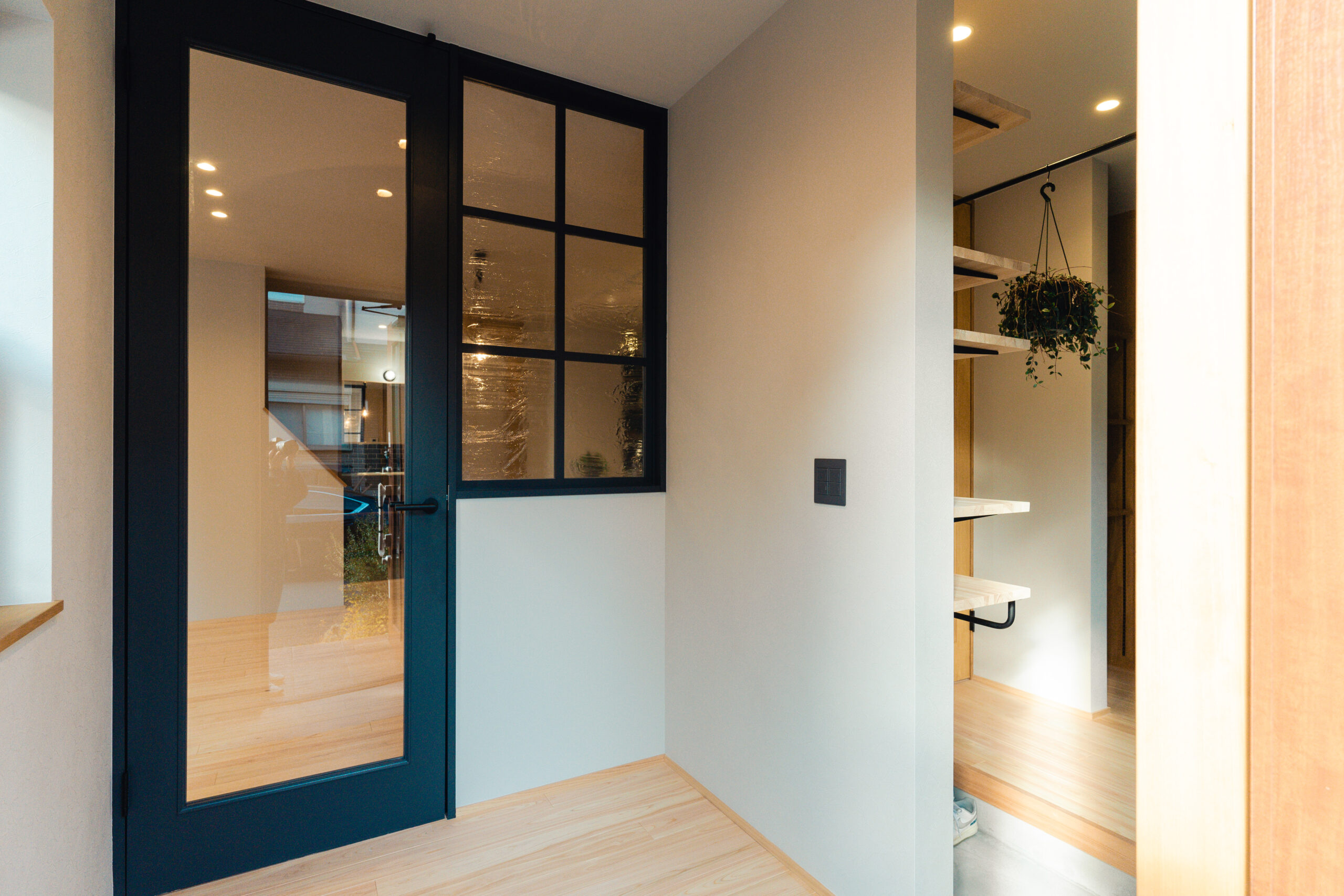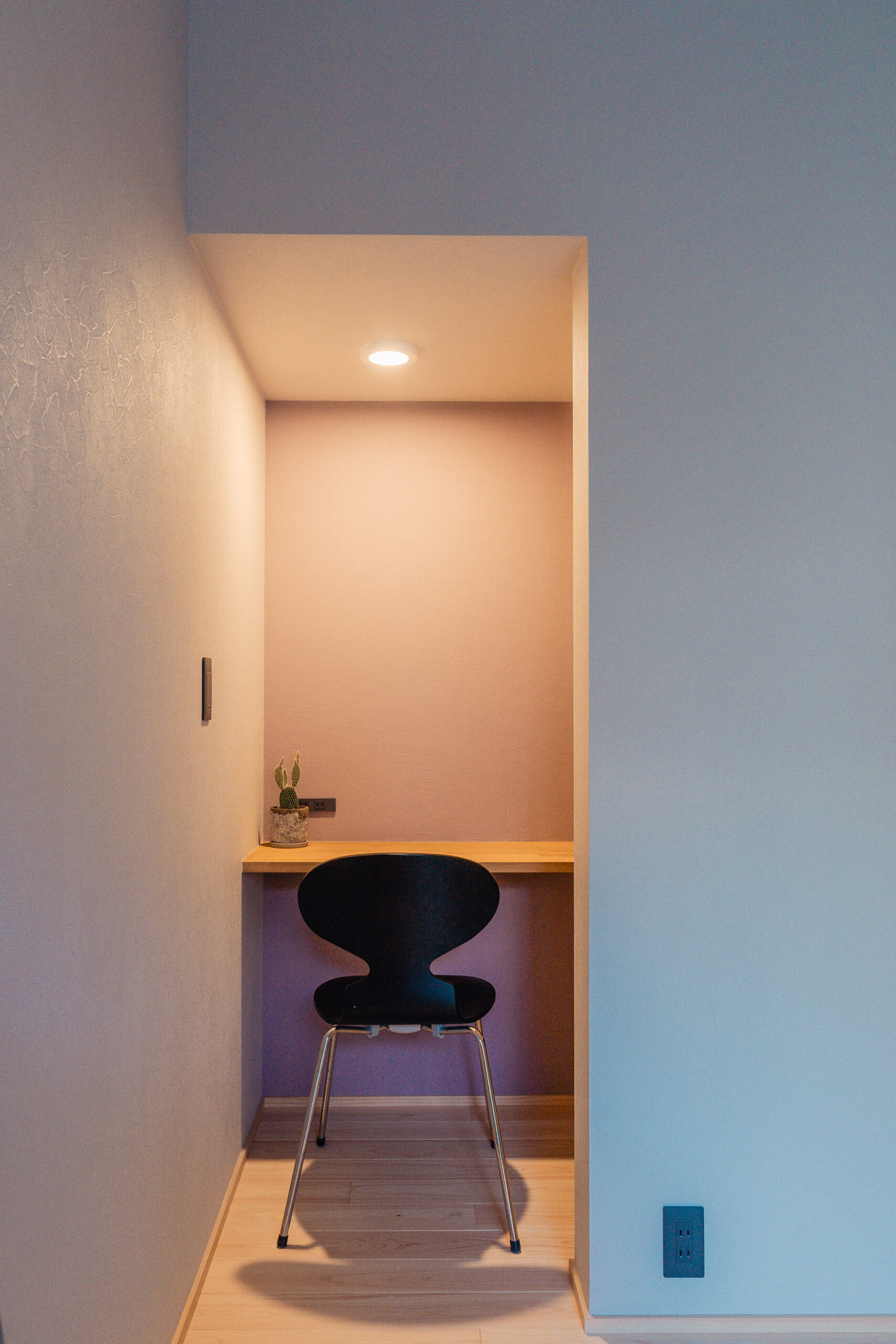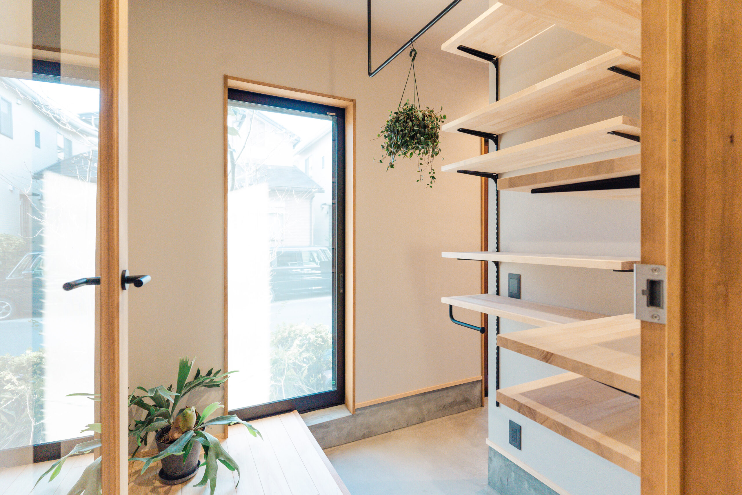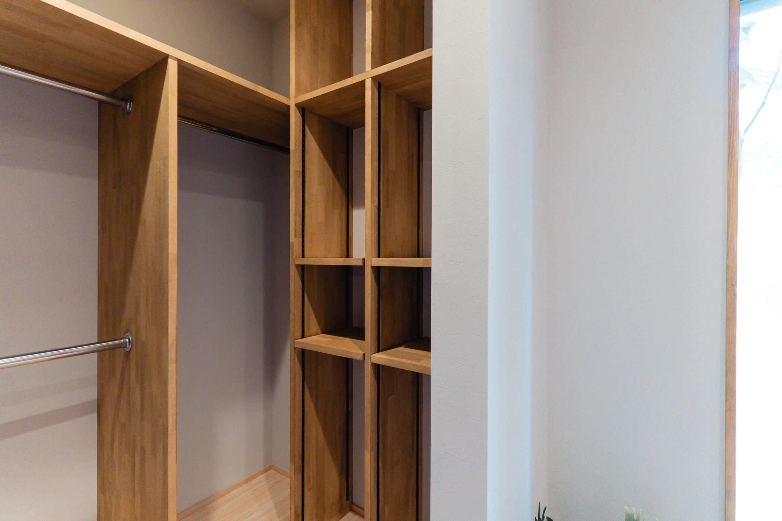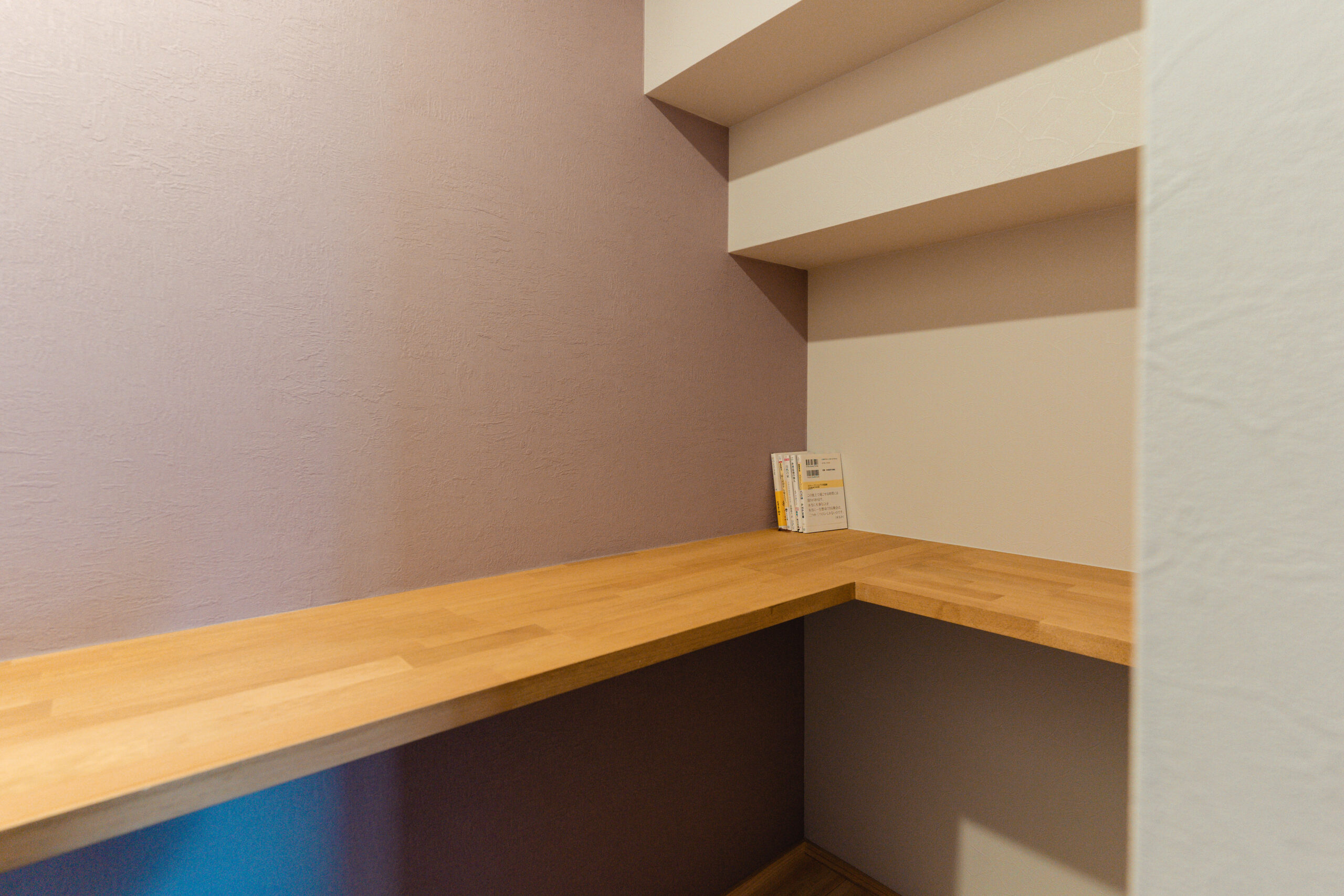 また、キッチンだけでなく、家全体の収納スペースにもアイデアが盛り込まれており、片付けやすさが考慮されています。その他にも、ハイドアを用いることで視線を遮りながらも開放感を損なわずに空間を仕切ることができ、部屋全体のつながりを感じながらもプライバシーの確保された空間となりました。