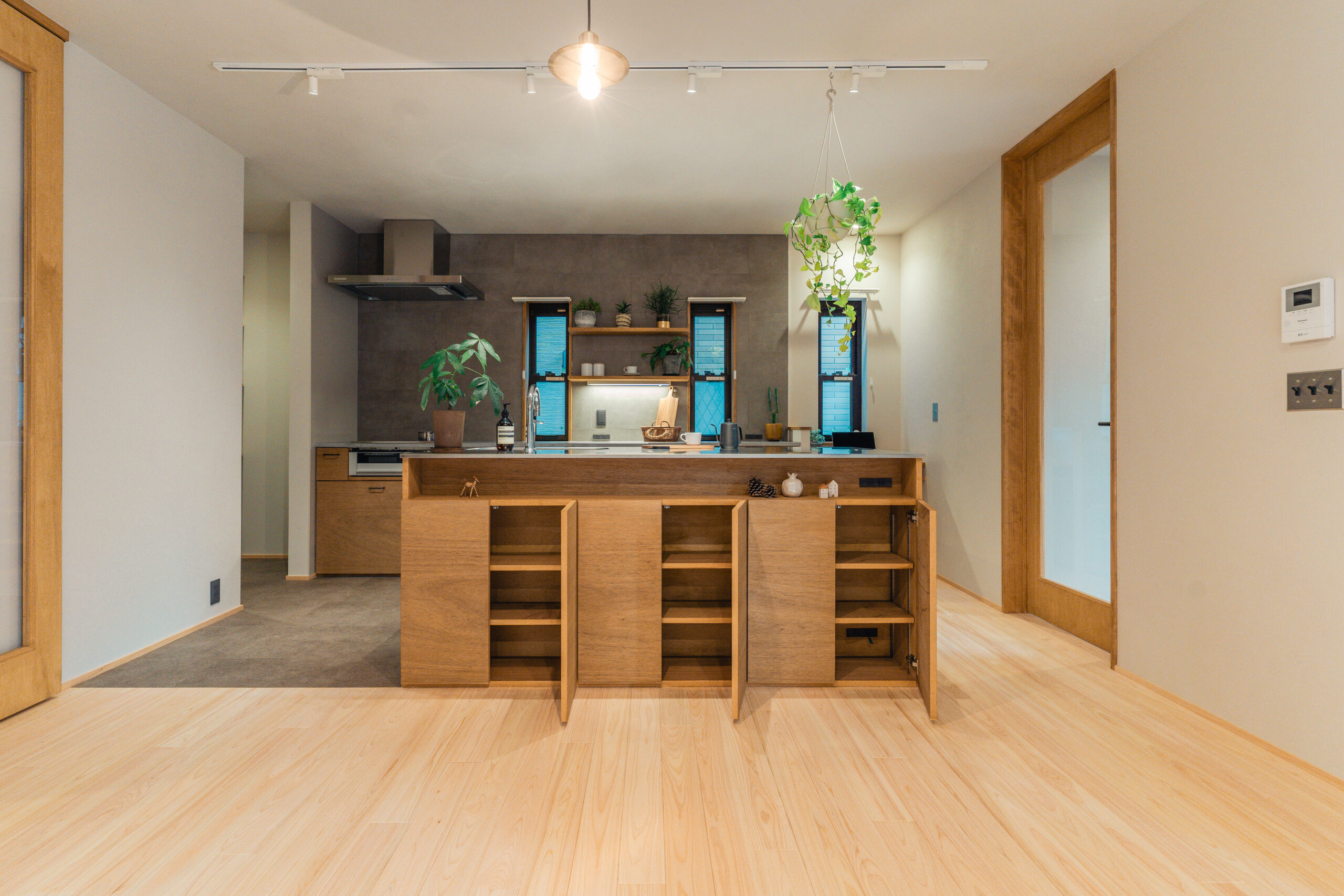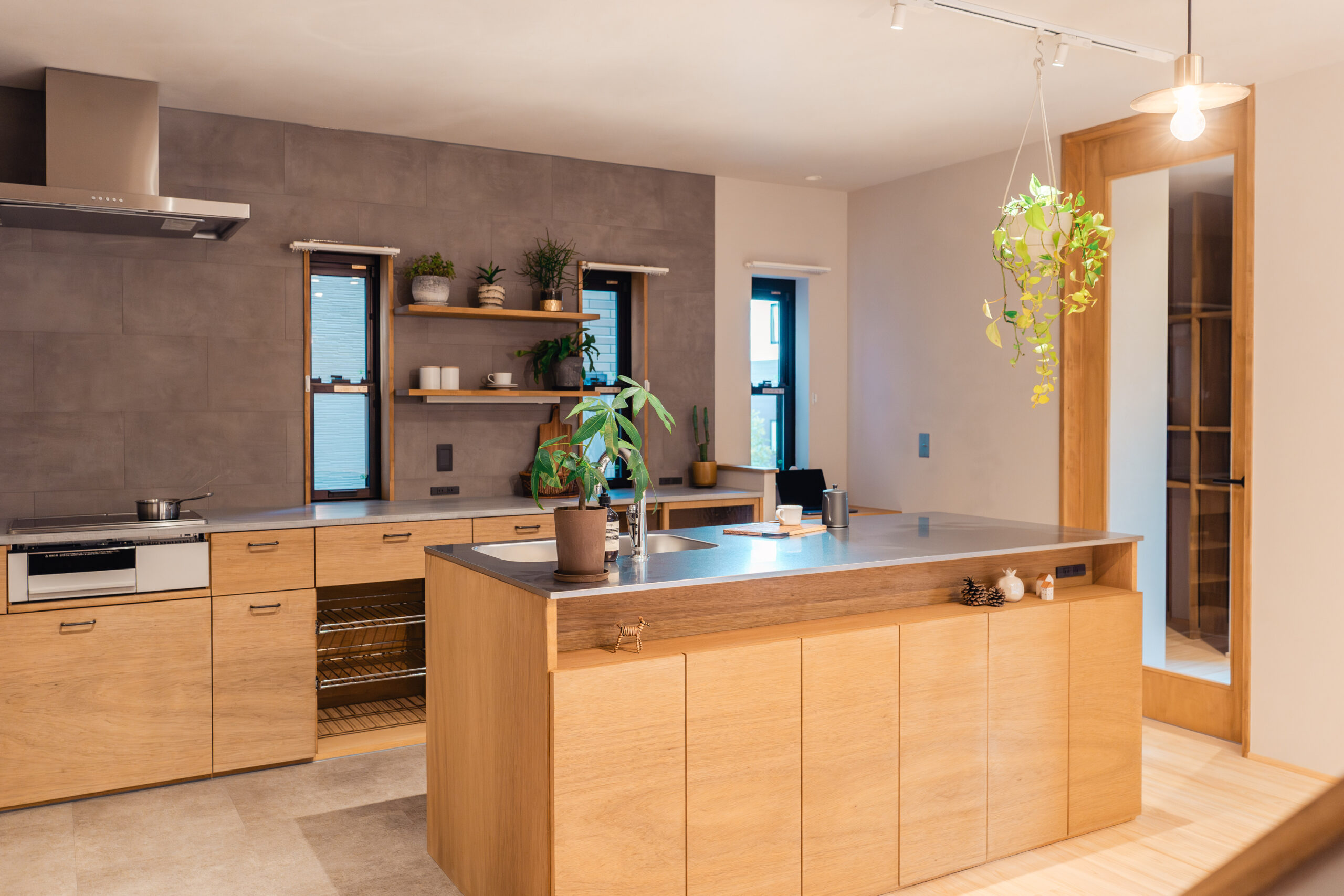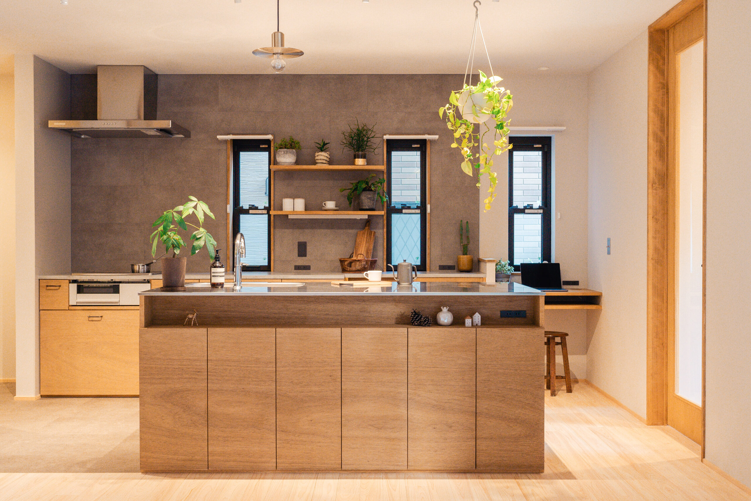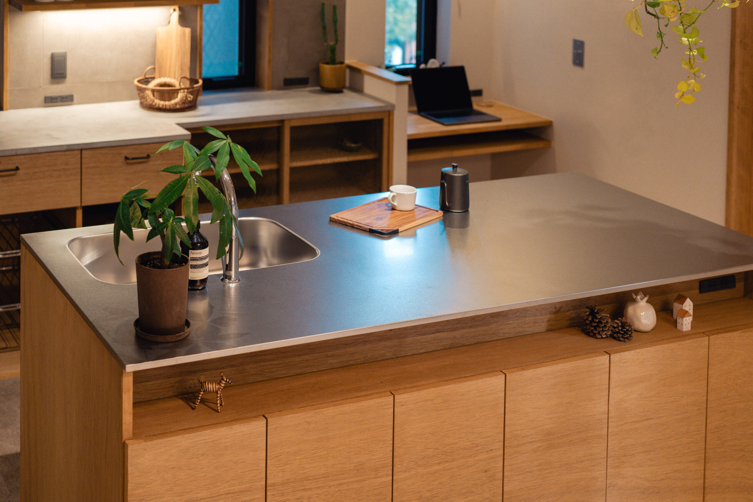 施主様のこだわりであるオーダーメイドで設計された造作キッチンは、機能性とデザイン性を兼ね備えており、日々の家事が楽しくなる工夫が満載です。収納や作業スペースの配置が使いやすさを考慮して最適化され、すっきりとしたシャープな空間を保ちながら、効率的な動線で料理がしやすくなっています。家族みんなで使用することをイメージしながらデザインしています。