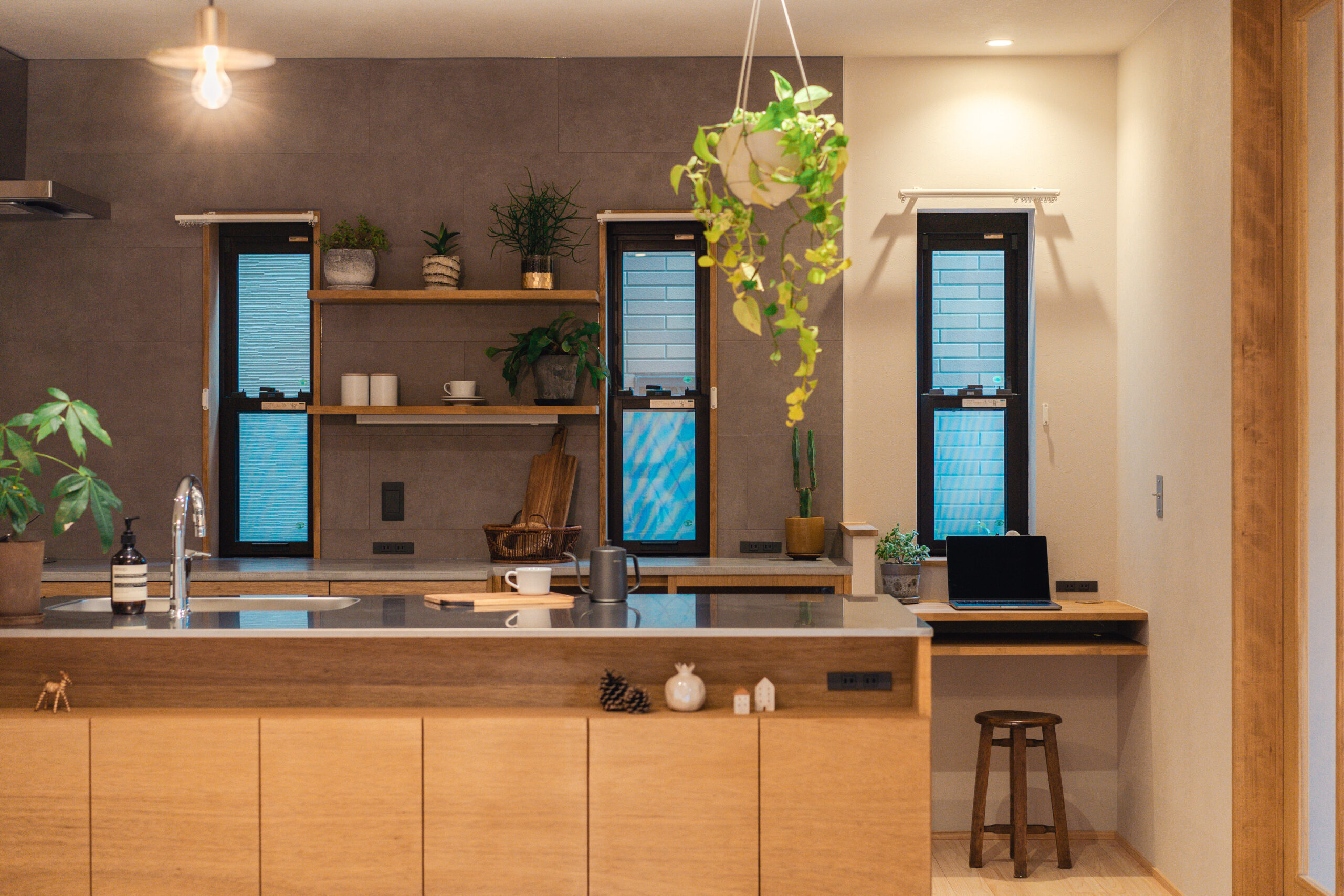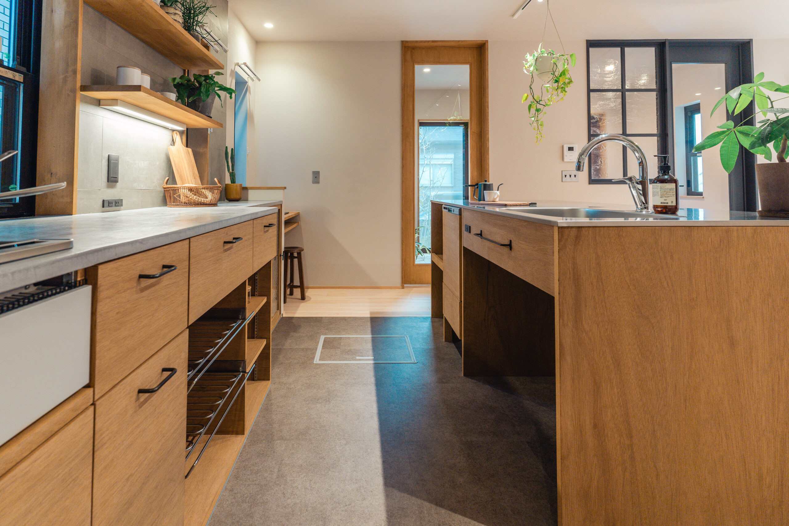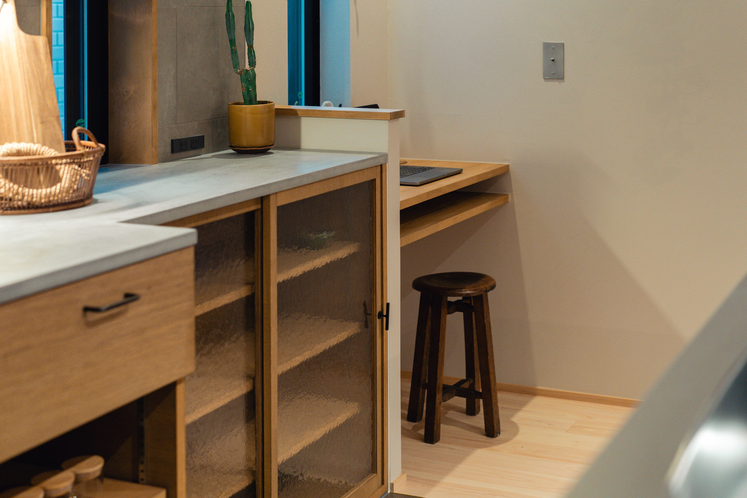 施主様のこだわりであるオーダーメイドで設計された造作キッチンは、機能性とデザイン性を兼ね備えており、日々の家事が楽しくなる工夫が満載です。収納や作業スペースの配置が使いやすさを考慮して最適化され、すっきりとしたシャープな空間を保ちながら、効率的な動線で料理がしやすくなっています。家族みんなで使用することをイメージしながらデザインしています。
