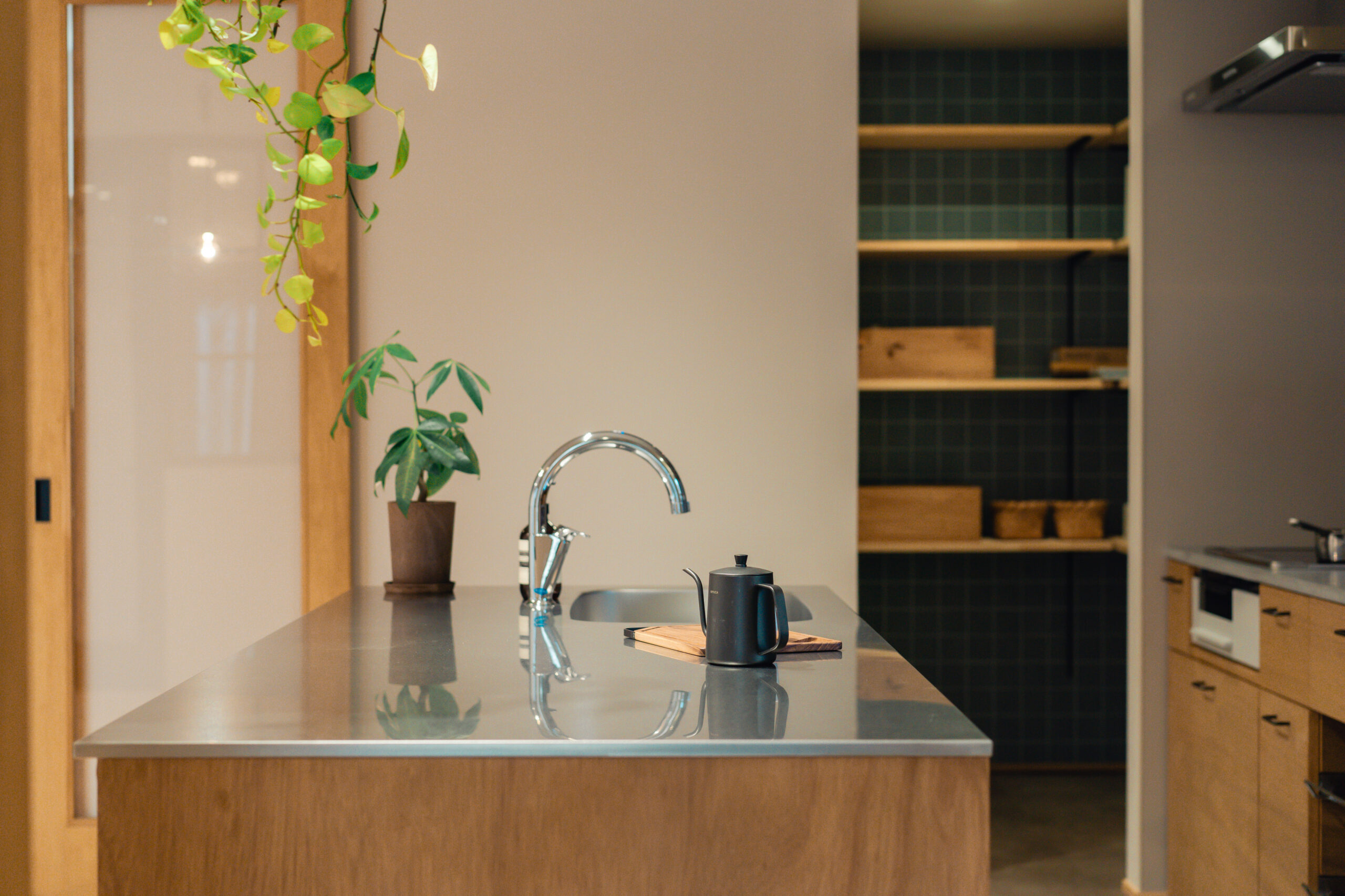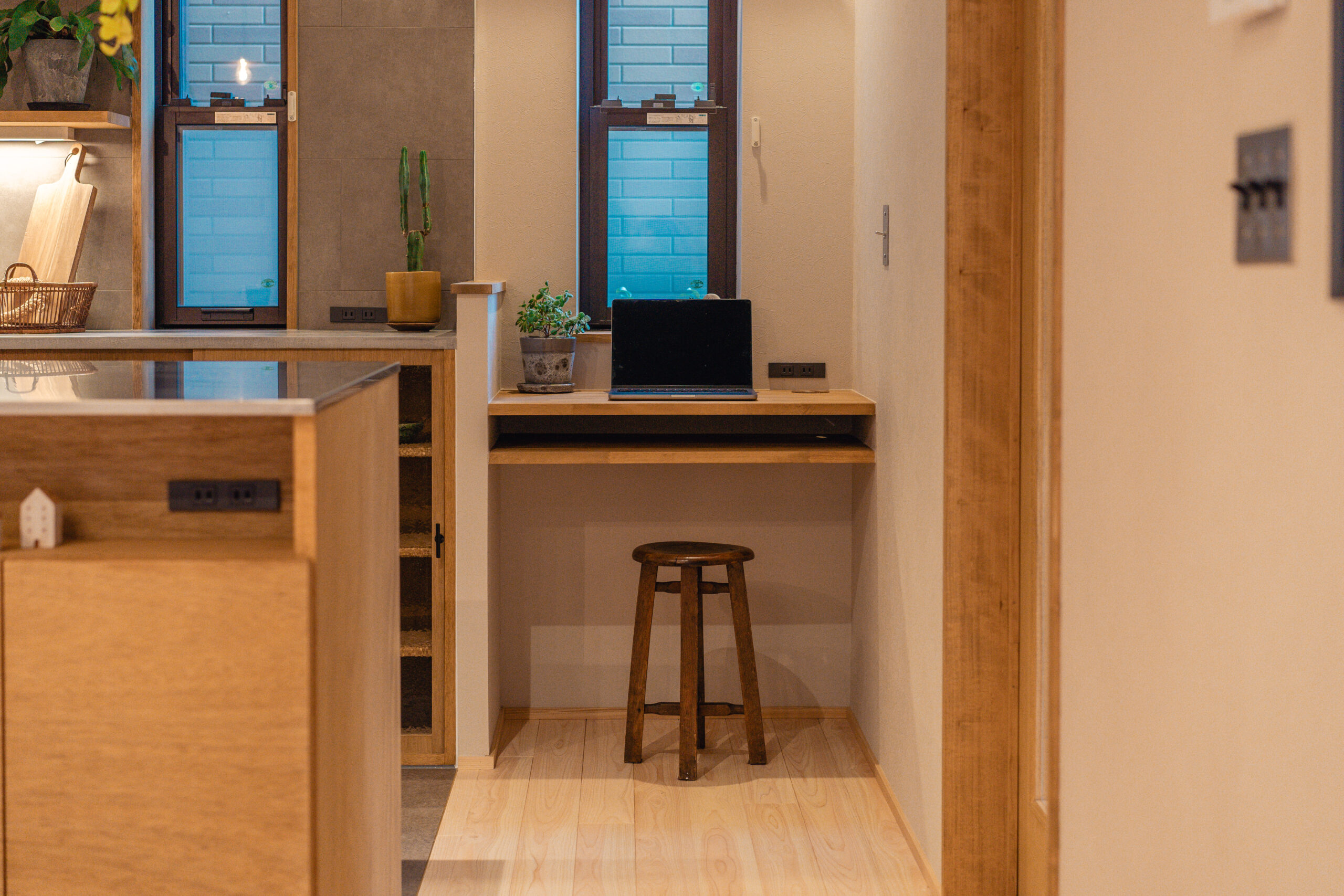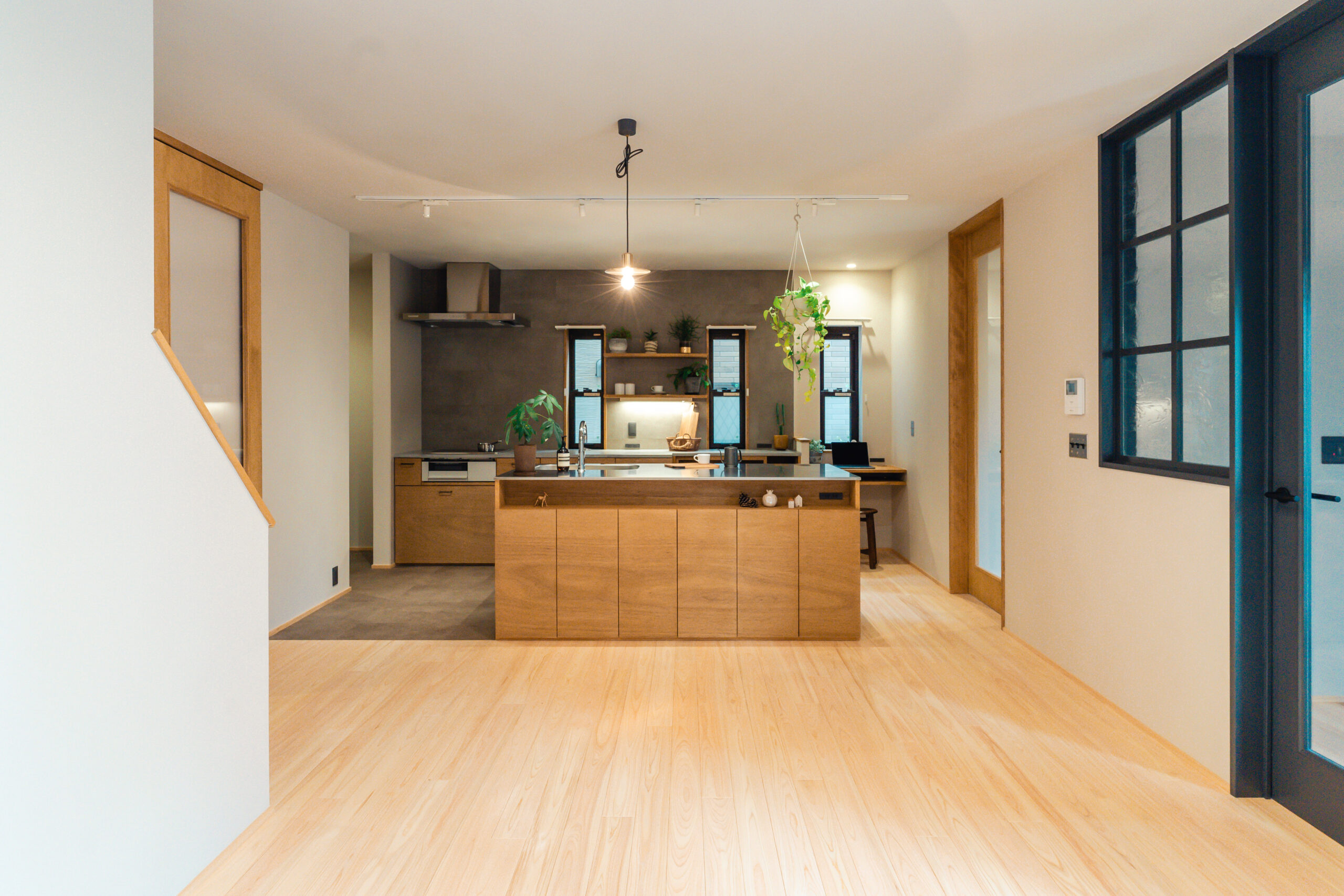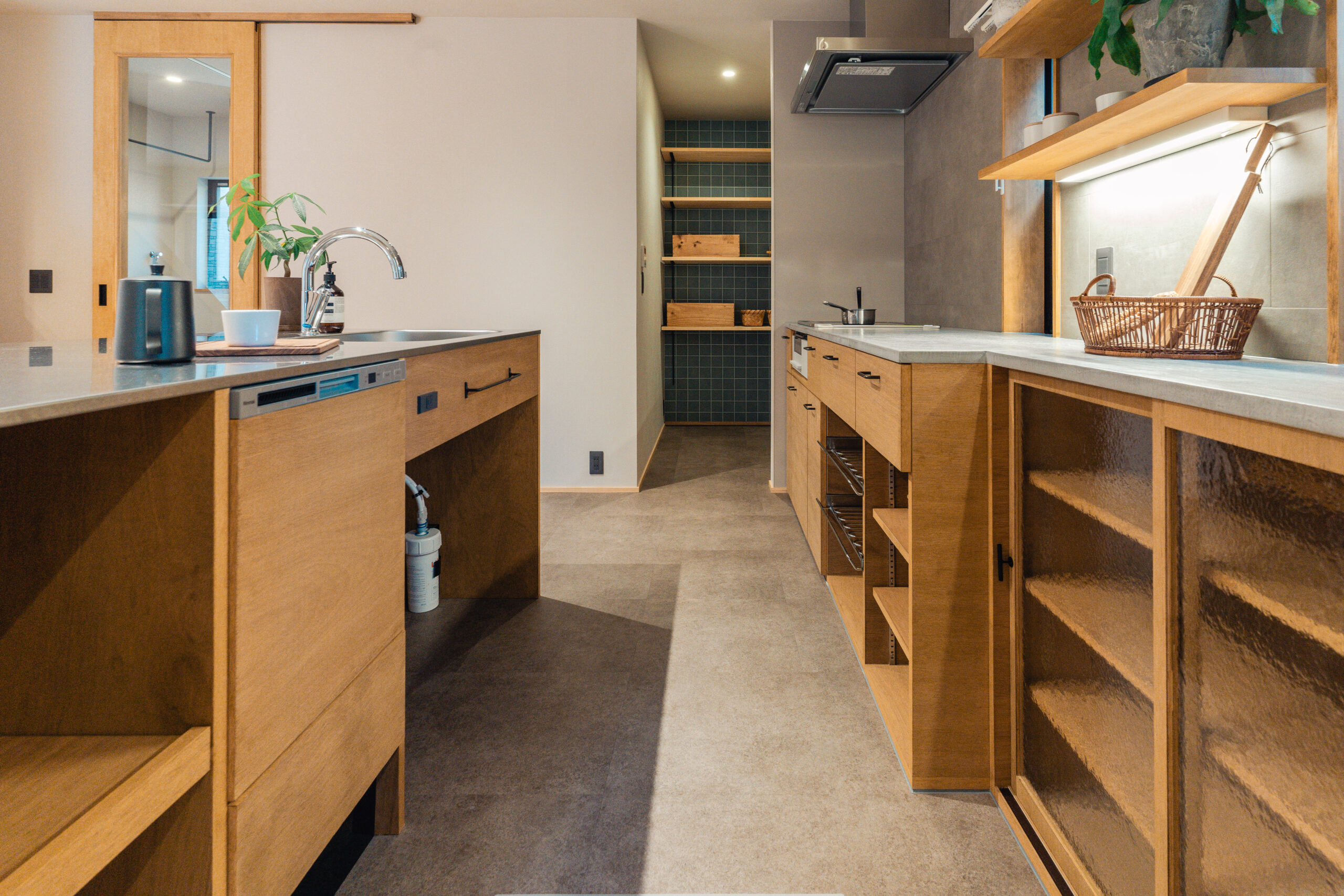 施主様のこだわりであるオーダーメイドで設計された造作キッチンは、機能性とデザイン性を兼ね備えており、日々の家事が楽しくなる工夫が満載です。収納や作業スペースの配置が使いやすさを考慮して最適化され、すっきりとしたシャープな空間を保ちながら、効率的な動線で料理がしやすくなっています。家族みんなで使用することをイメージしながらデザインしています。