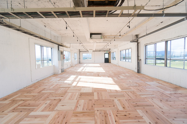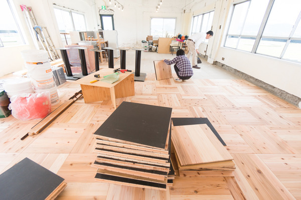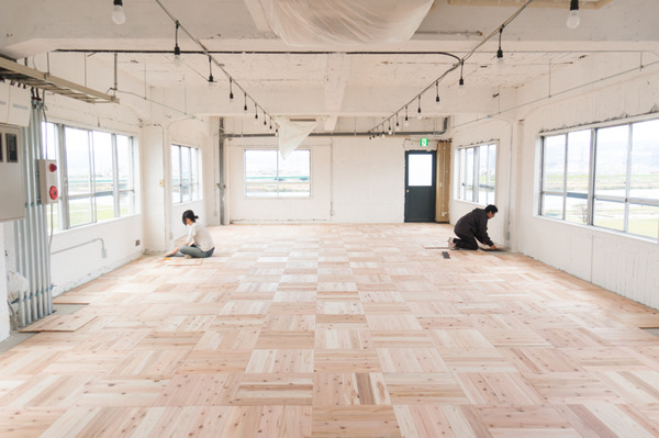 店舗デザイン鍵屋別館で運営している「枚方つーしん」のひらばを、ひらつーの皆さんとユカハリ・タイルのDIYを致しました。使用したのは、弊社の事務所でも使用している岡山の「森の学校」さんのユカハリ・タイル。スギ、ヒノキ、その他色々なバリエーションがあります。裏面がゴムになっている商品で、そのまま置いて敷き詰めていけるんです。店舗の床、フローリングの上に置いてもいいんです。気軽に無垢の木を楽しめる優れモノ。この広いフロアをみんなで頑張って敷き詰めていきました。部屋の広い面積を占める床、これを敷くだけでガラリと空間に温かみがでました。皆様、お疲れさまでした!