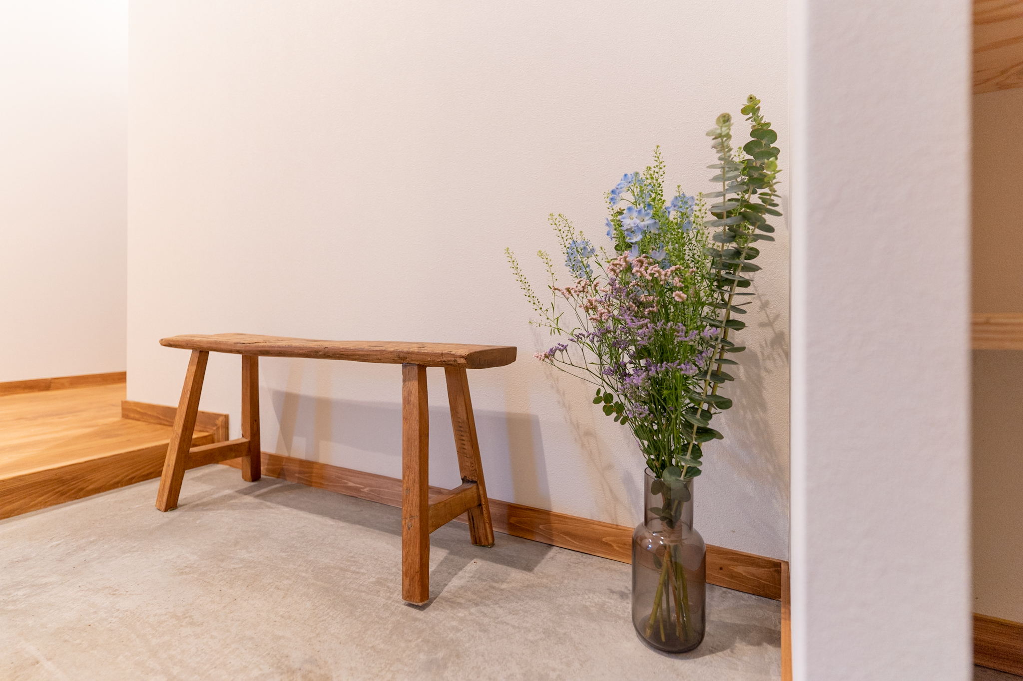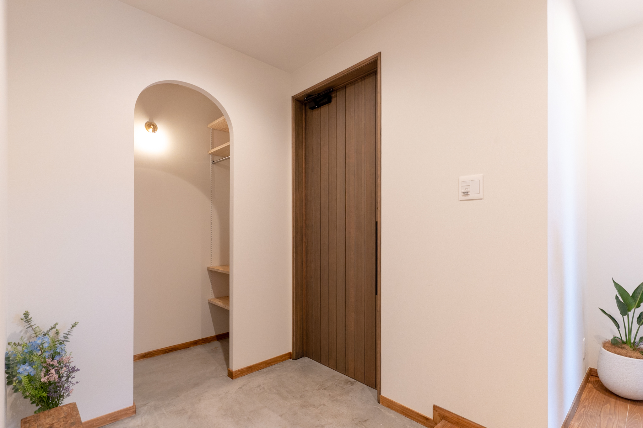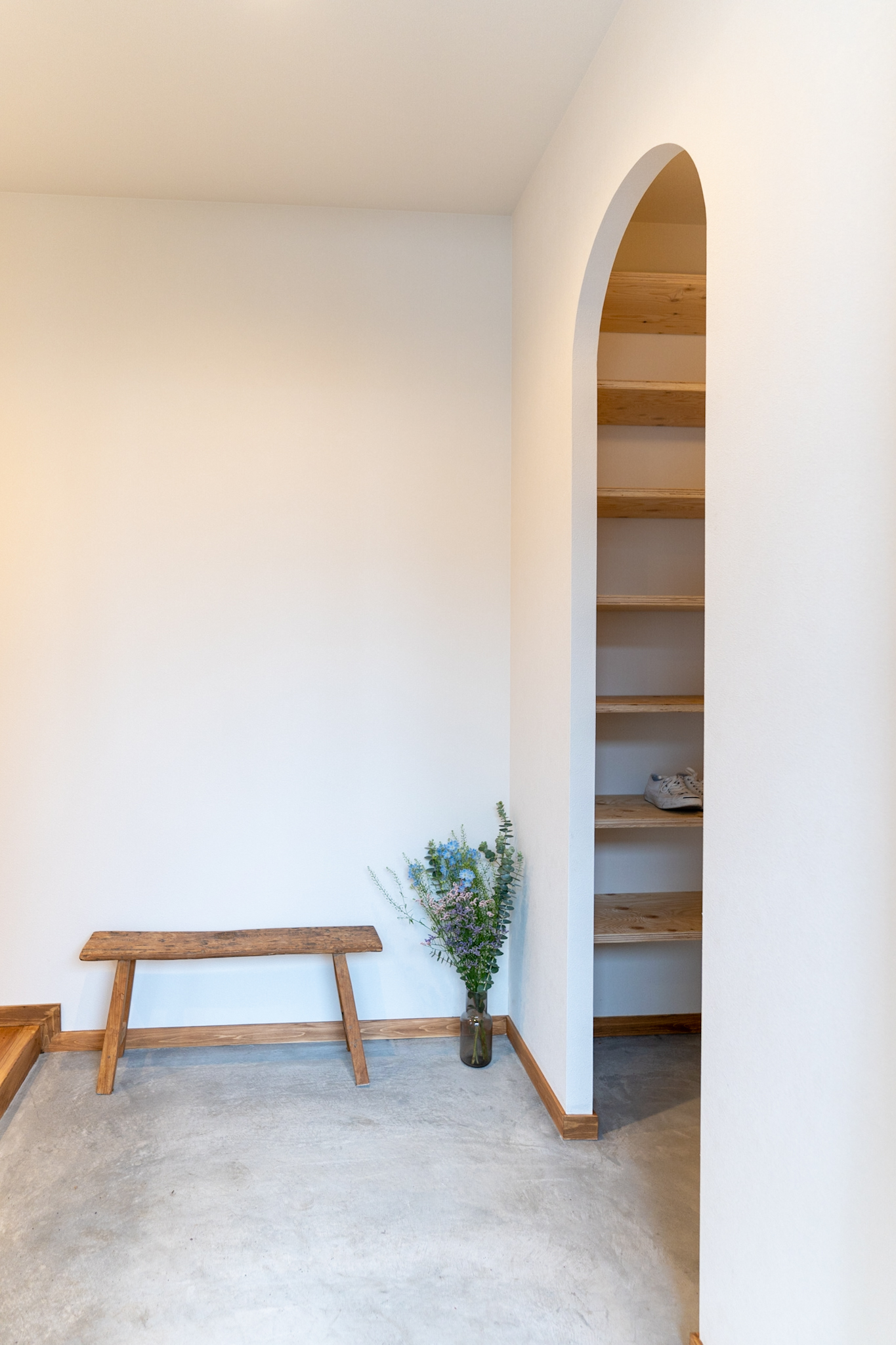 キッチン横にはアーチ開口のパントリー、玄関にはシューズクローゼット、寝室にもウォークインクローゼット、の3つの大きな収納を確保しました。