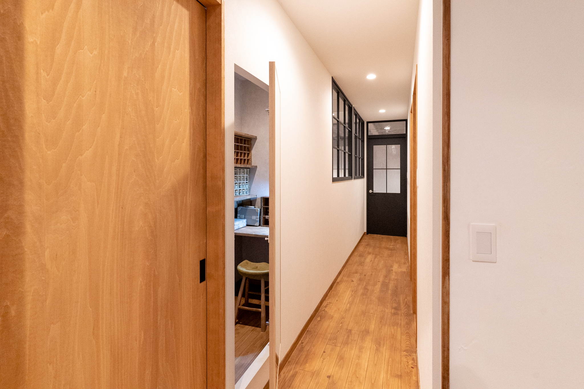 廊下とLDKをつなぐ壁には大きな室内窓を設け、広々と感じる空間に。黒色の建具やキッチンのアイアンフレームが空間を引き締めています。