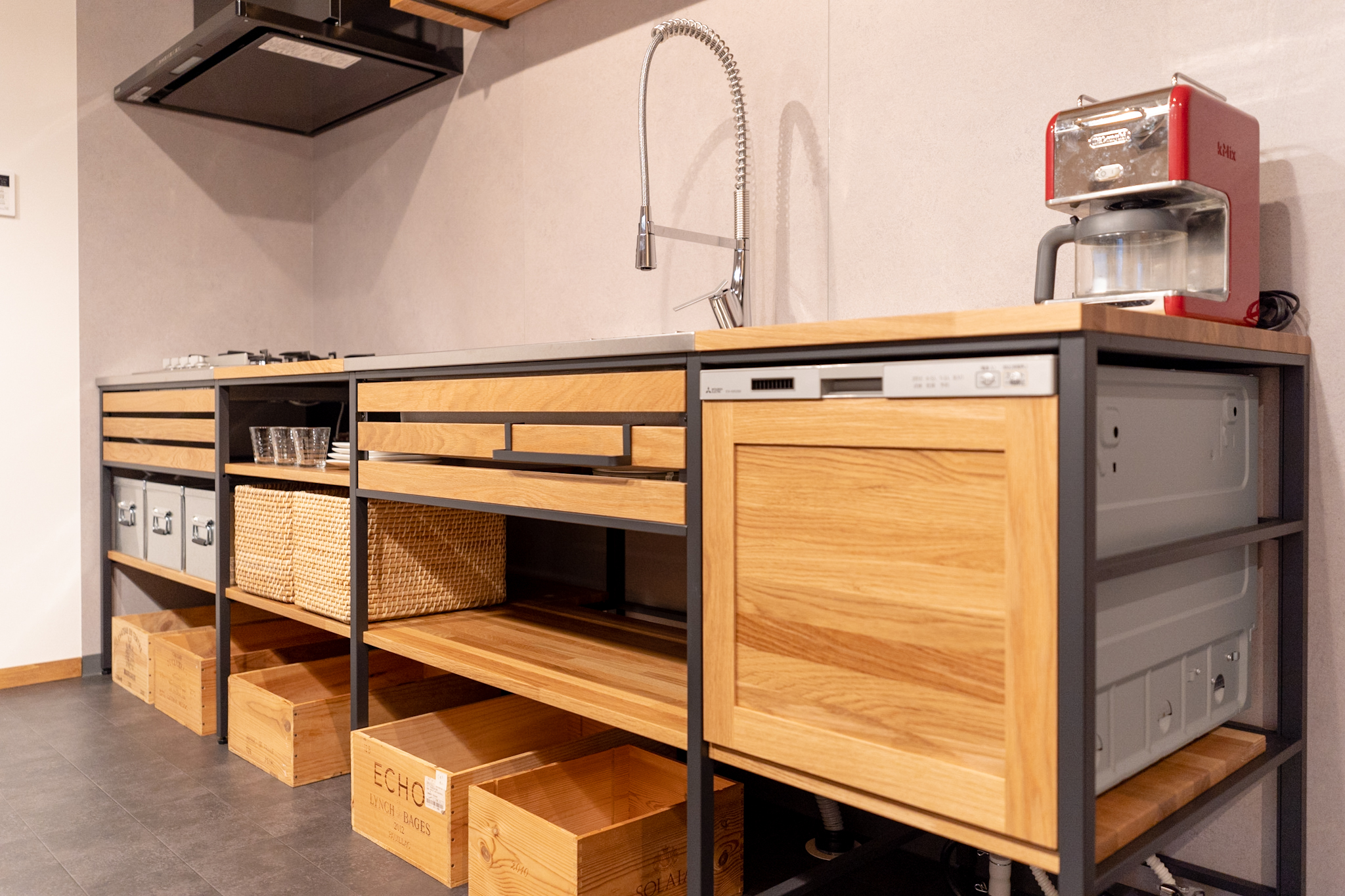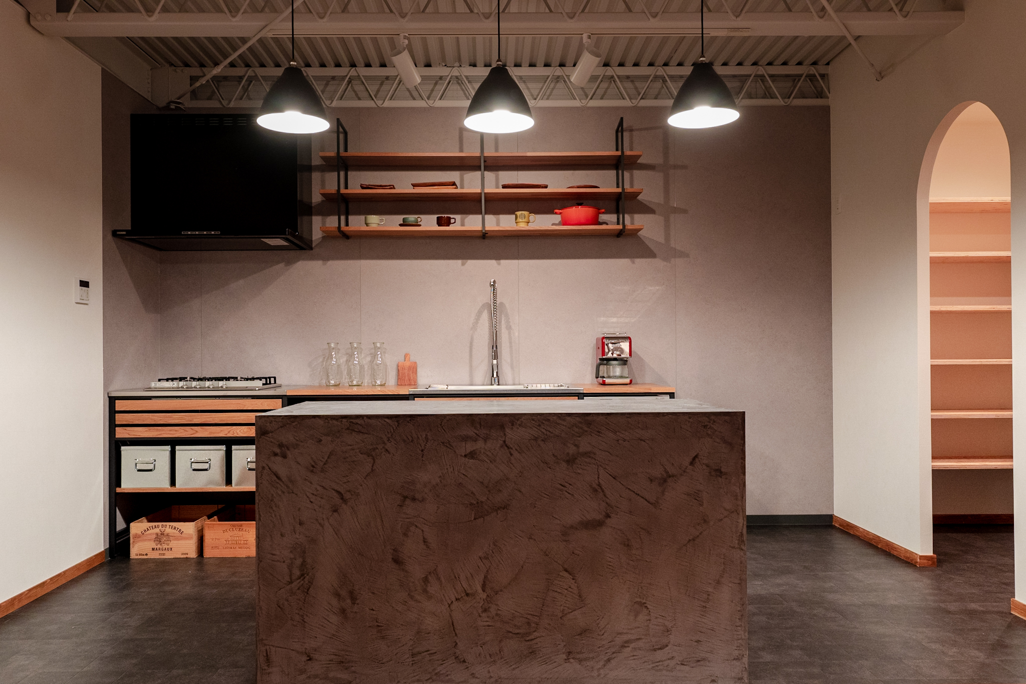造作のキッチン作業台や洗面台はモールテックスを使用。