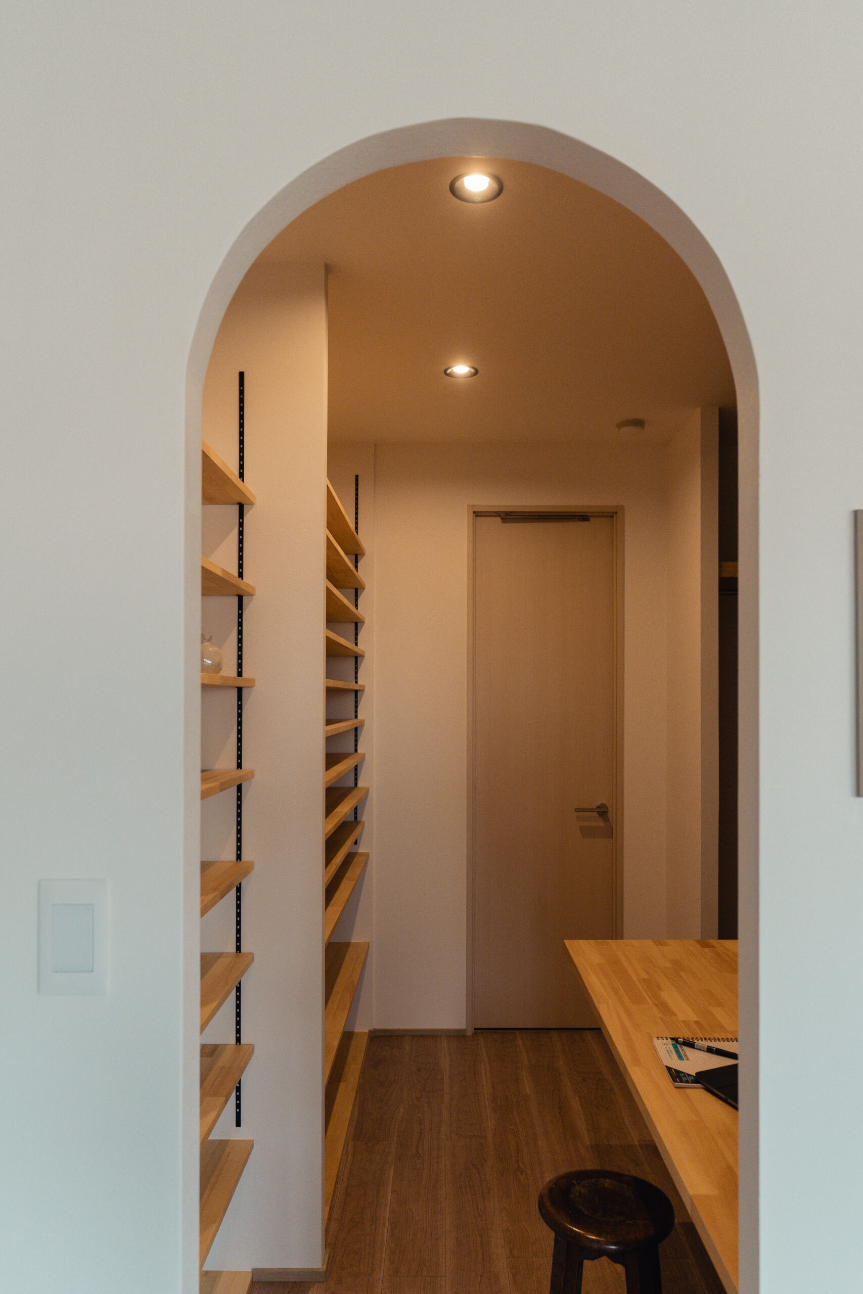 本棚はCDのアートワークが映えるデザインとし、小さな通り道は愛猫が自由に移動できる遊び心のあるつくりとしました。