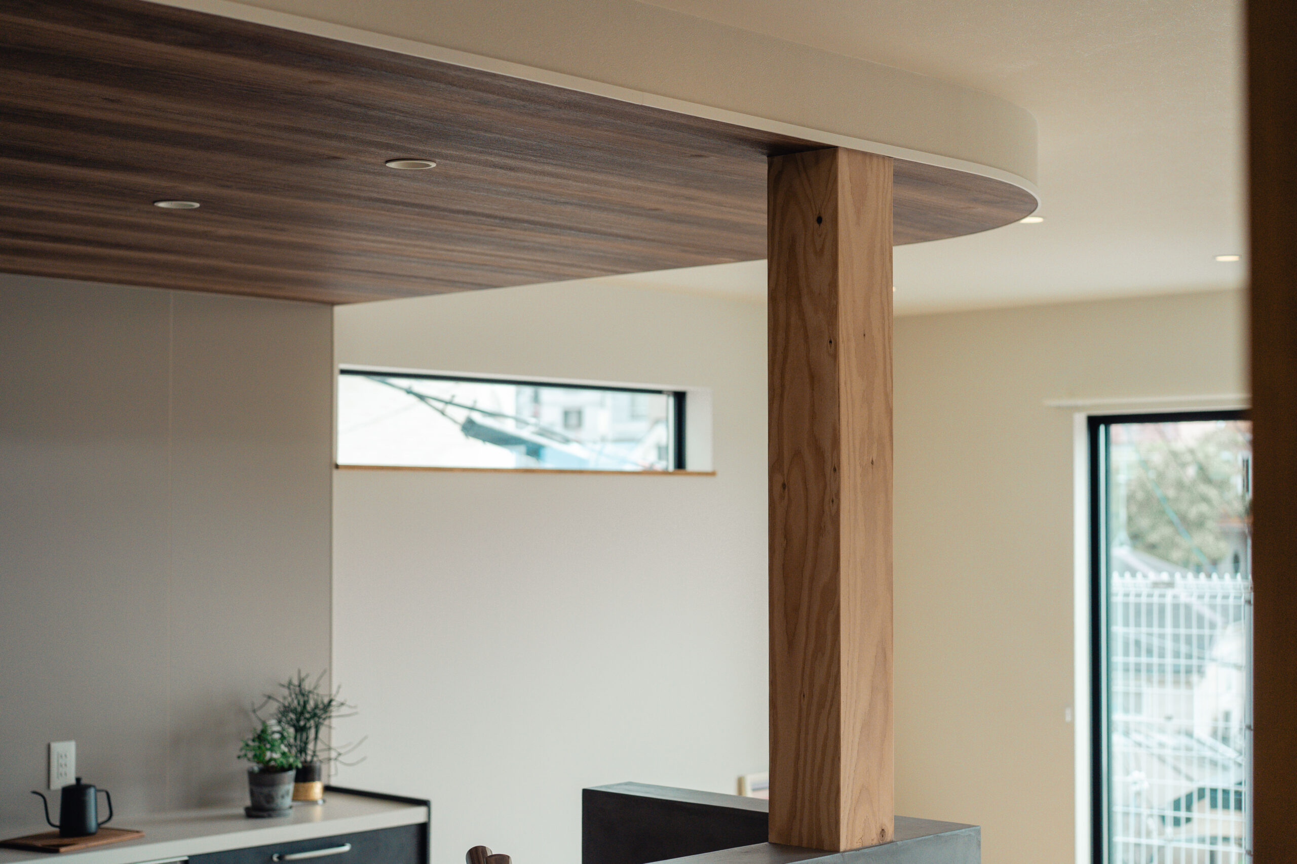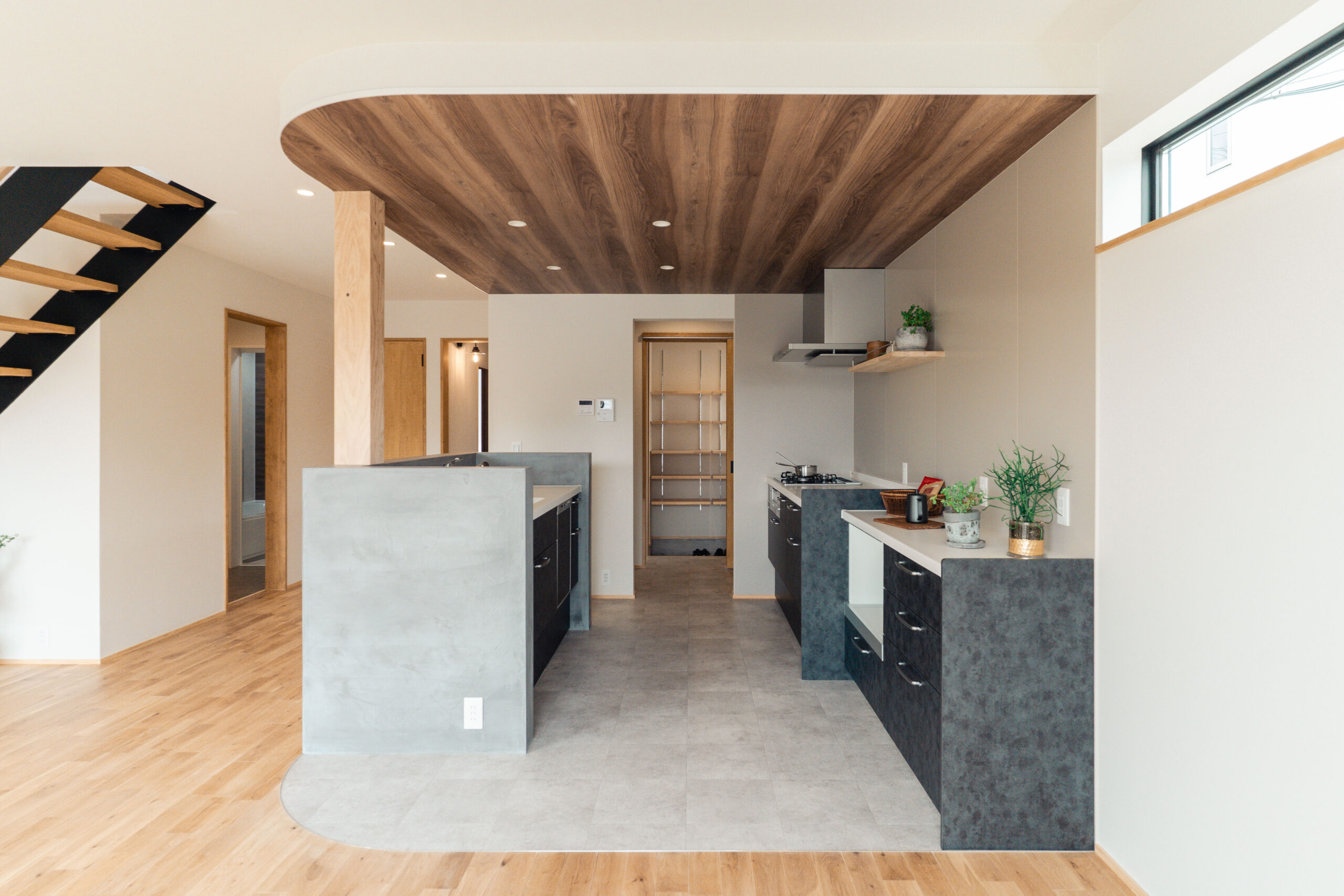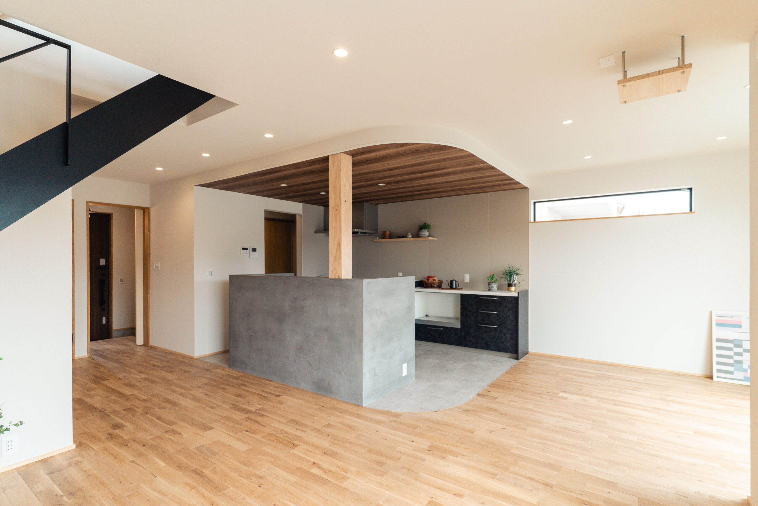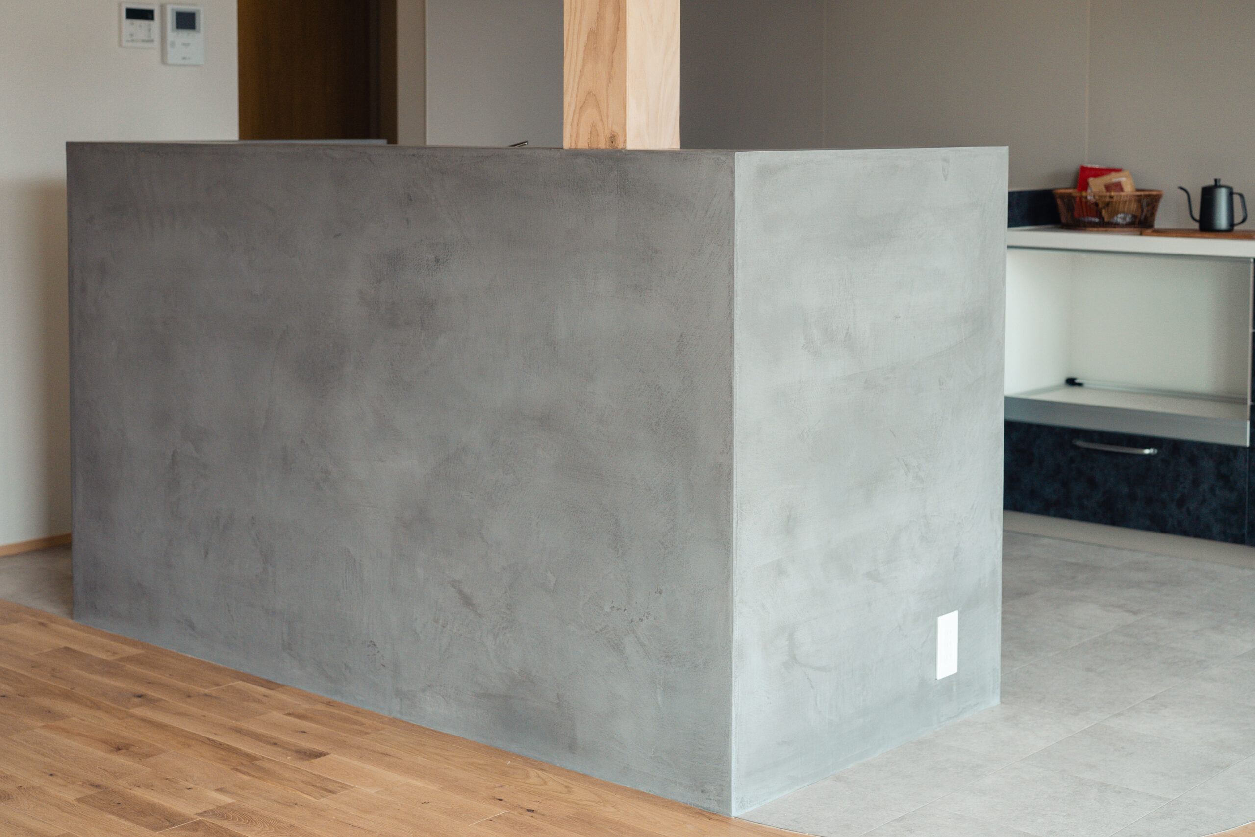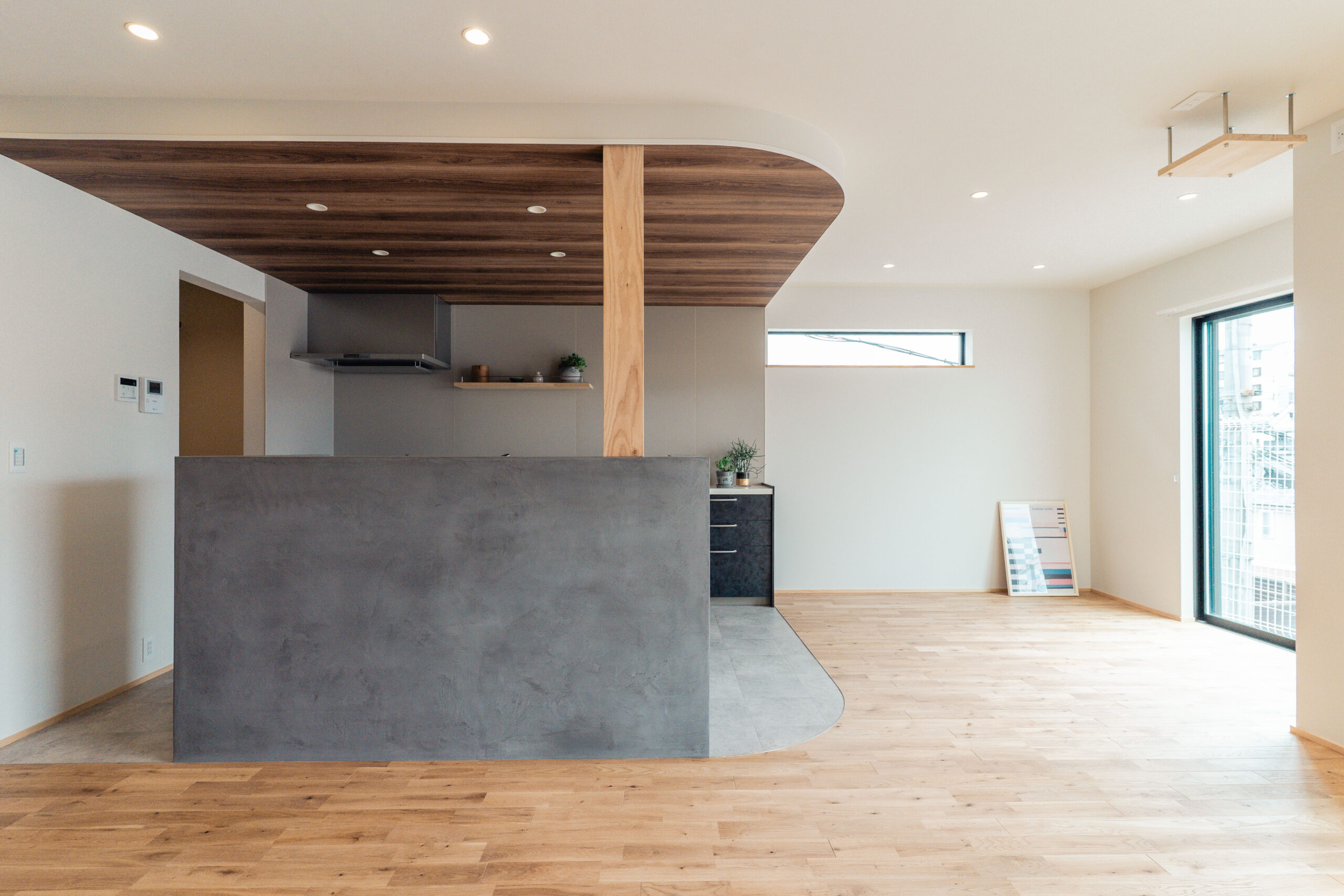 キッチンの腰壁にはモールテックスを使用し、下がり天井と床のカーブを活かしたデザインで、リビングとの一体感と空間にアクセントを加えました。