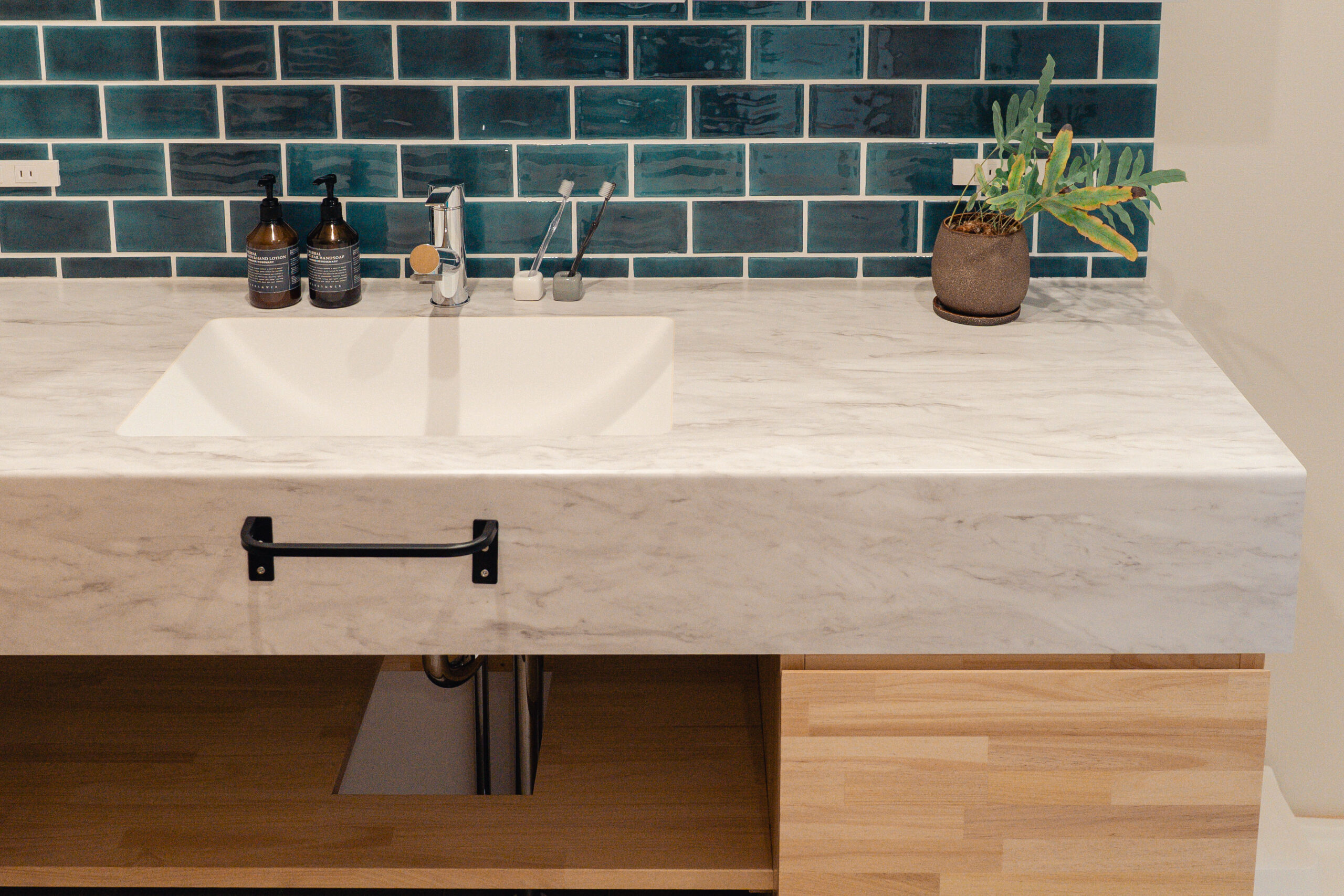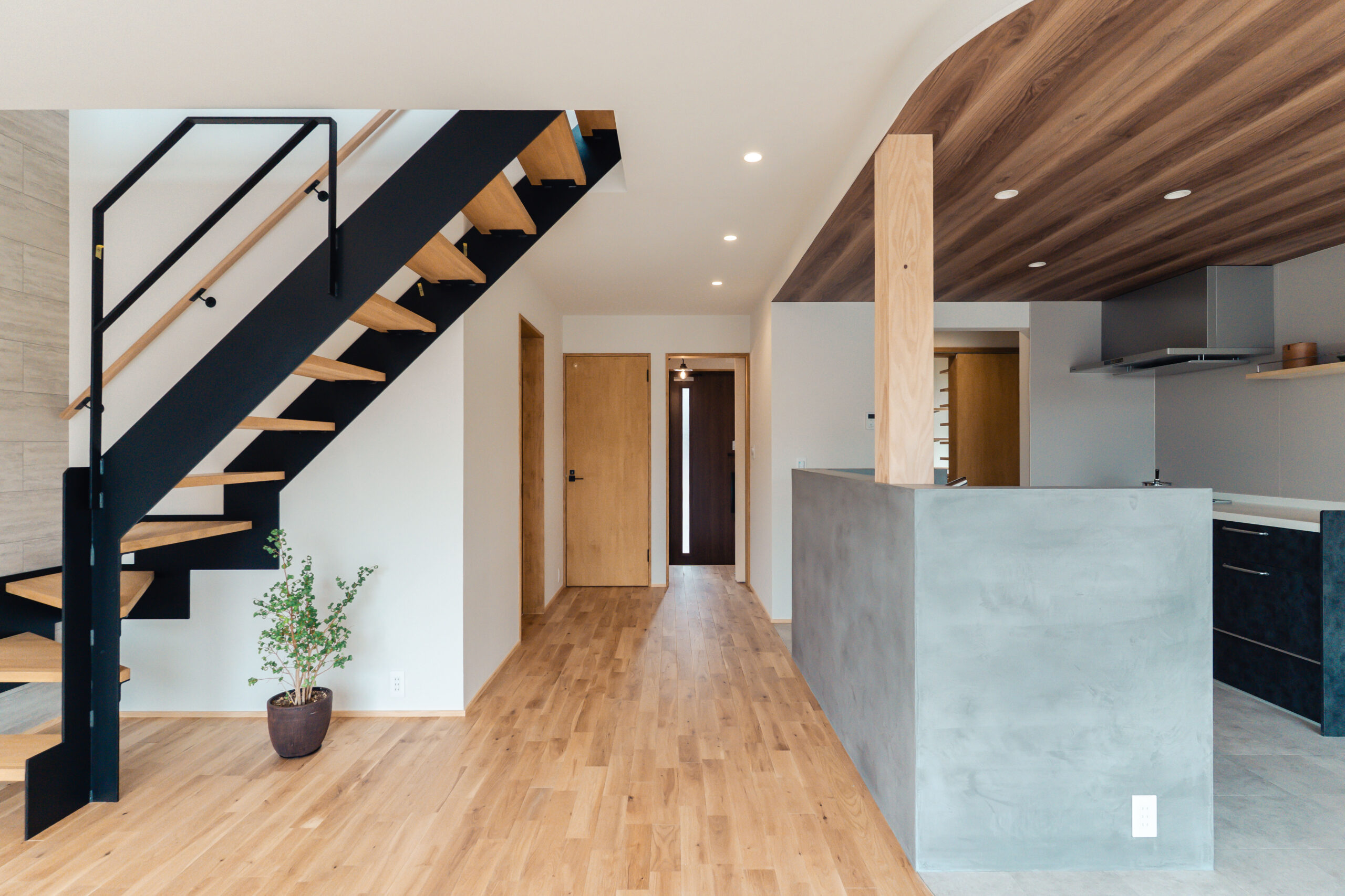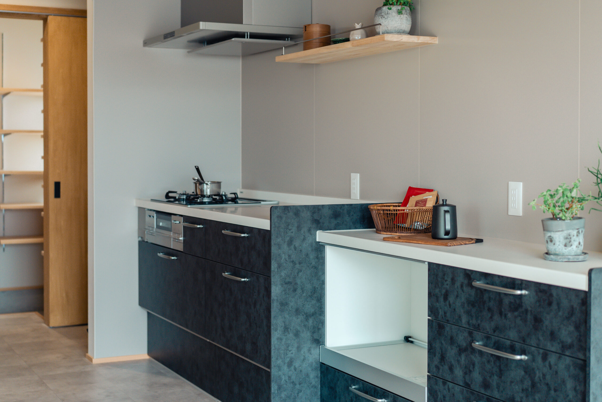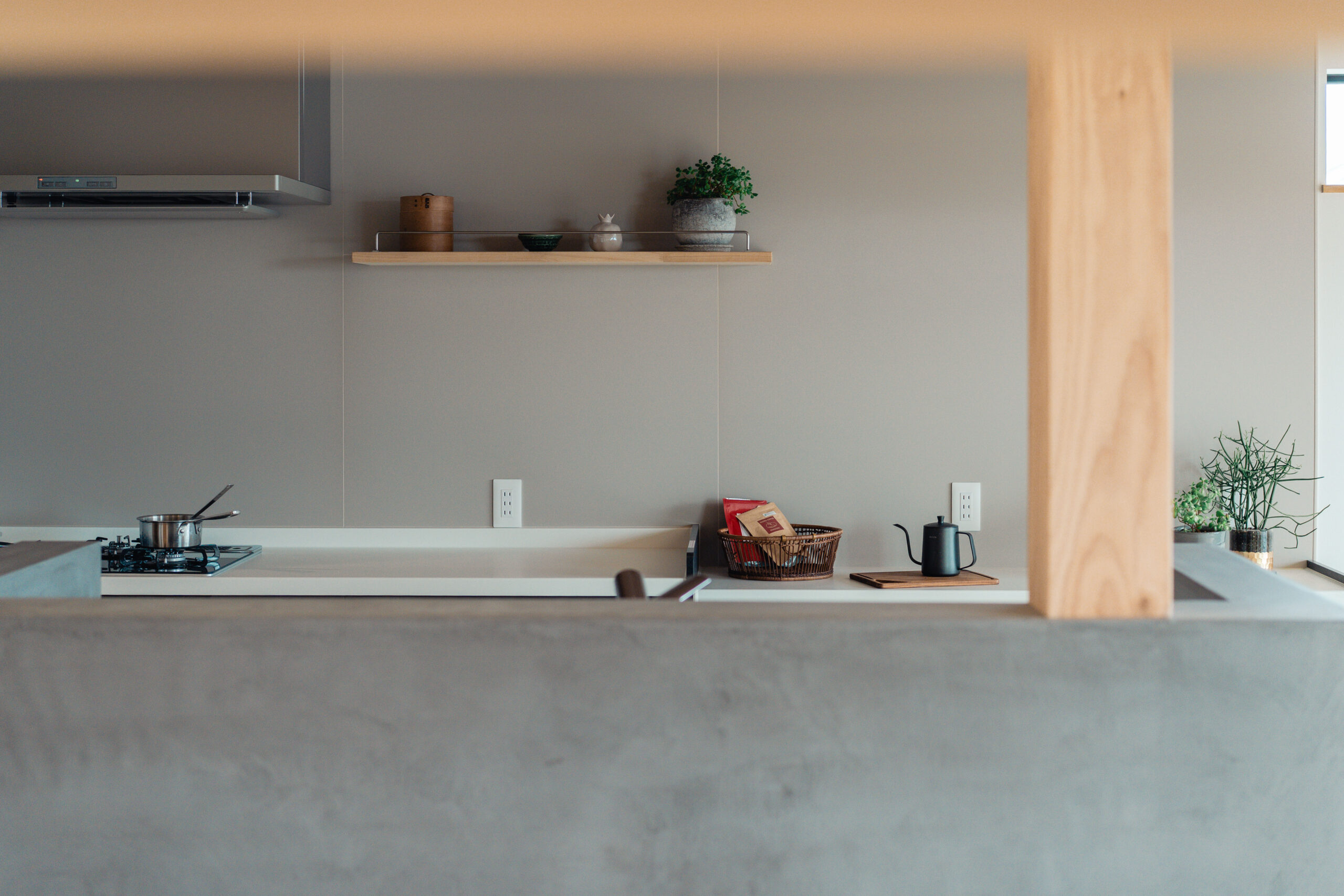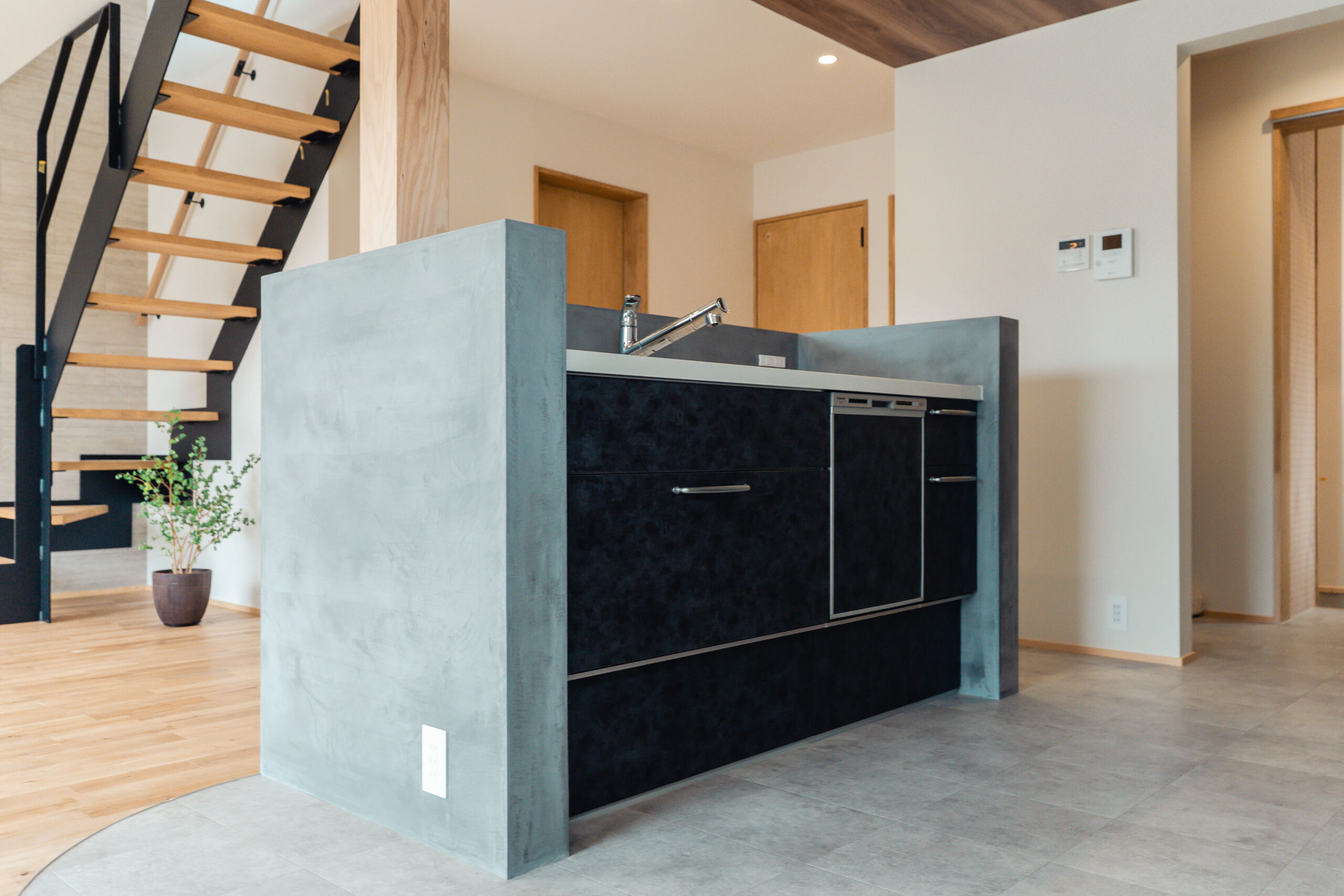 キッチンの腰壁にはモールテックスを使用し、下がり天井と床のカーブを活かしたデザインで、リビングとの一体感と空間にアクセントを加えました。