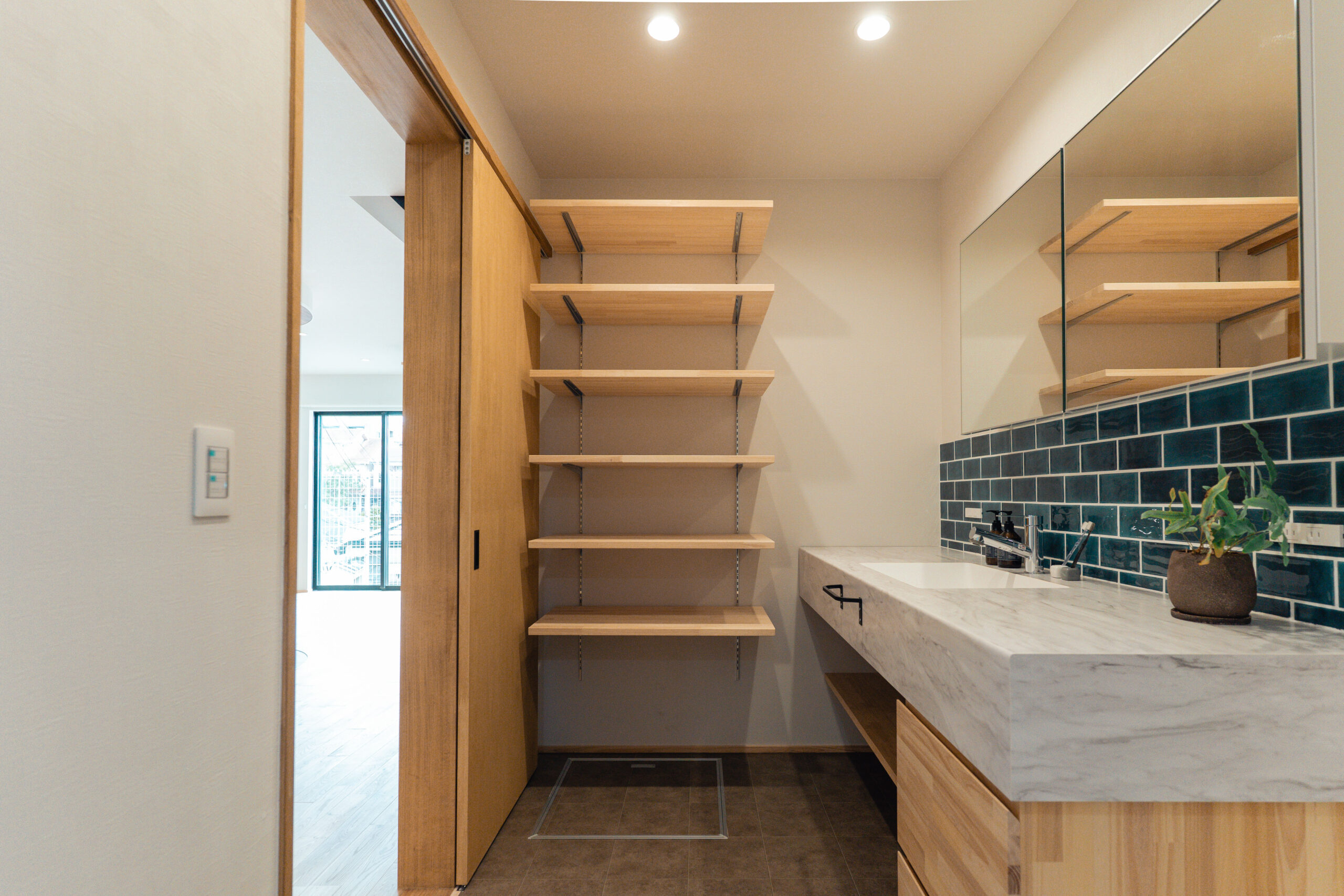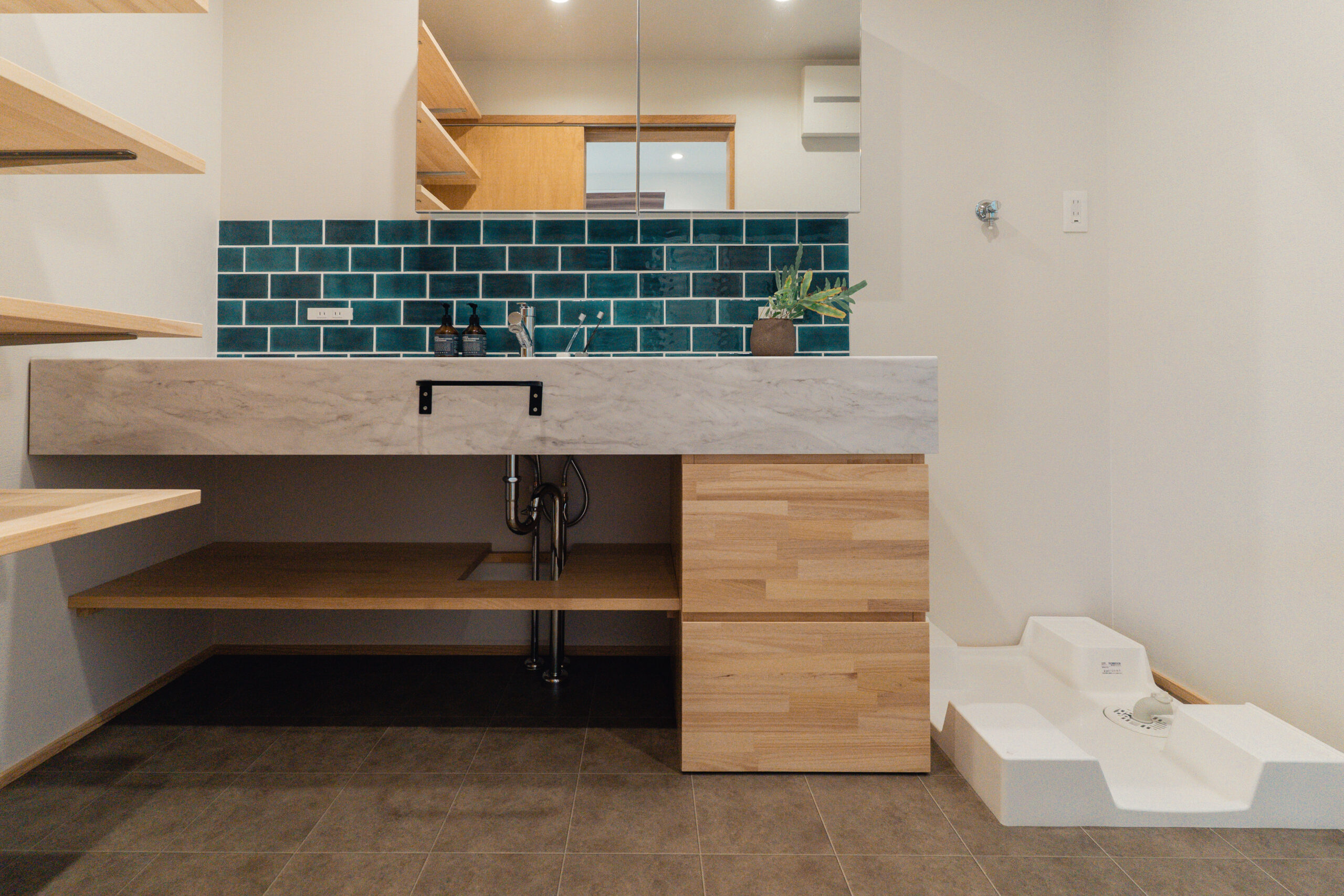子育てのしやすさを第一に考えた設計で、開放的なLDKにはアイランドキッチンを採用。キッチンを中心に、土間収納から直接アクセスできる動線や、ランドリールームへスムーズにつながる動線を確保し、家事の効率を高めています。