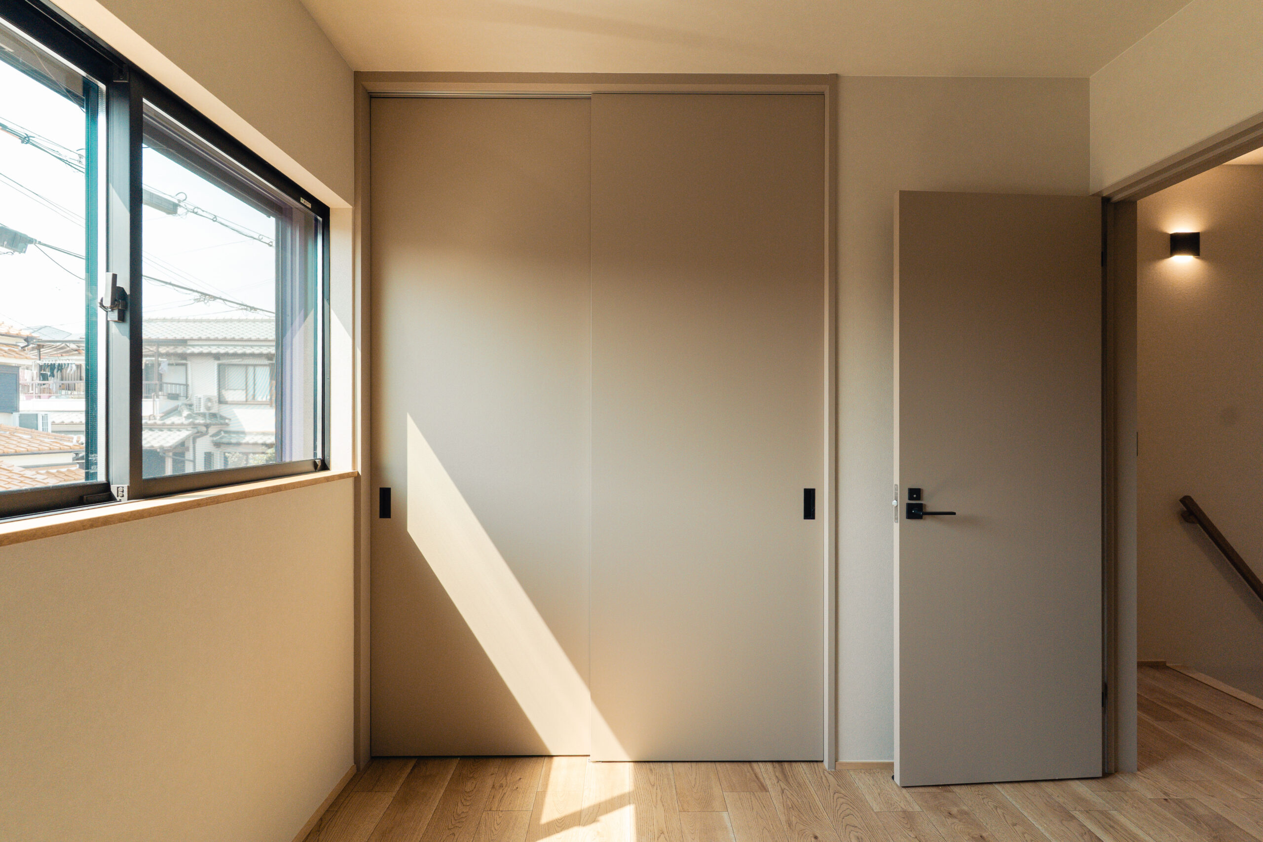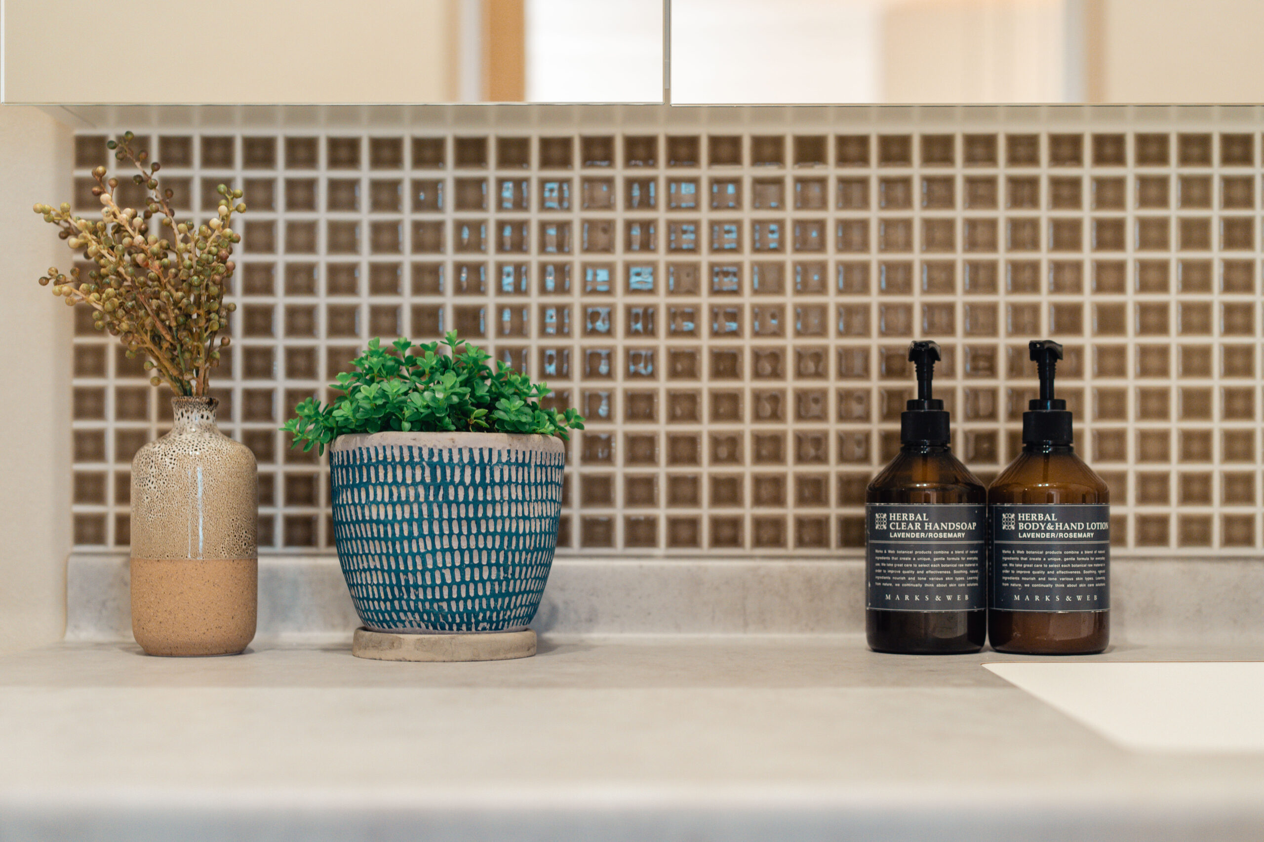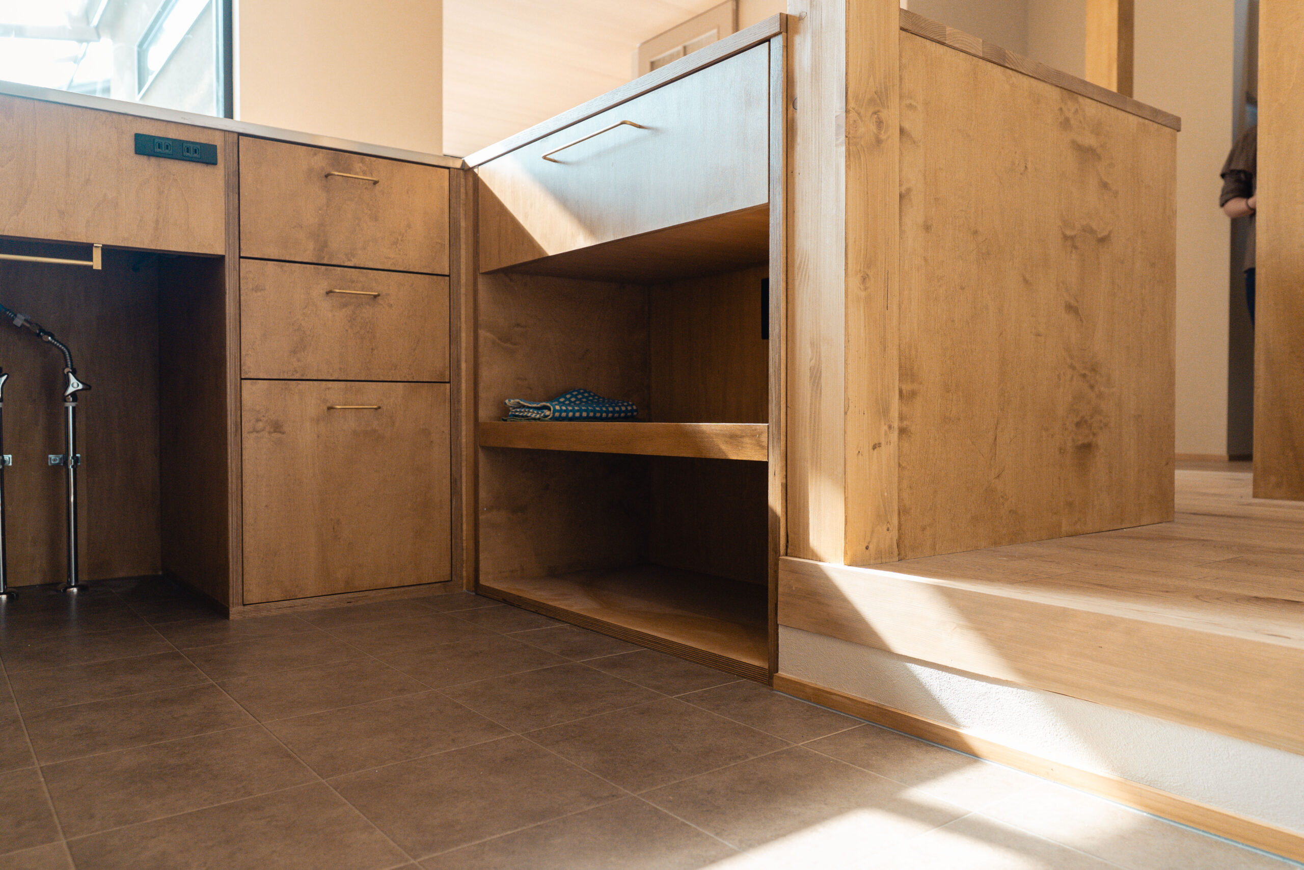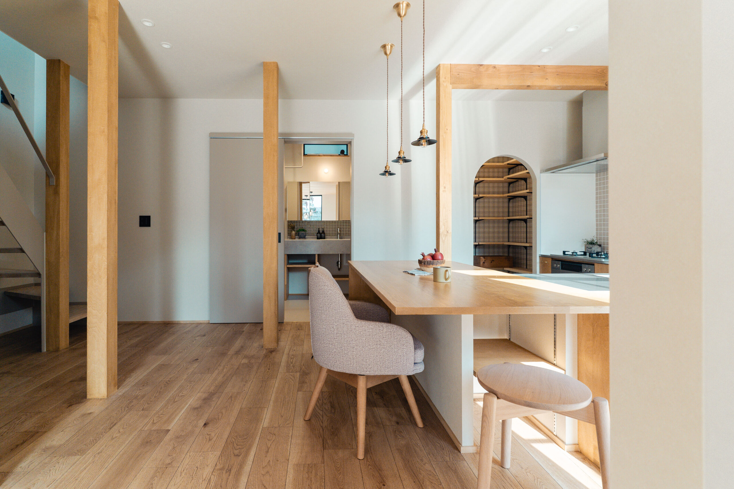 1階のLDKは壁を取り払い、開放的な一体空間に改修。機能性とデザイン性を兼ね備えた造作のコの字型キッチンを中心に据え、グレージュとオーク色を基調とすることで、ナチュラルで上質な印象を演出しています。キッチンの床を一段下げることで、キッチンカウンターで過ごす家族と視線の高さが合い、コミュニケーションが自然と生まれるよう配慮しました。キッチンは使い手の生活をイメージし、オーダーメイドで制作したことで、使い勝手の良い空間となっています。キッチン横には大容量のパントリーを設け、食料品などをすっきり収納できるようにしています。見せる収納と隠す収納を明確に分けることで、暮らしにメリハリをもたらしています。家族が自然と集まる快適な空間となっています。