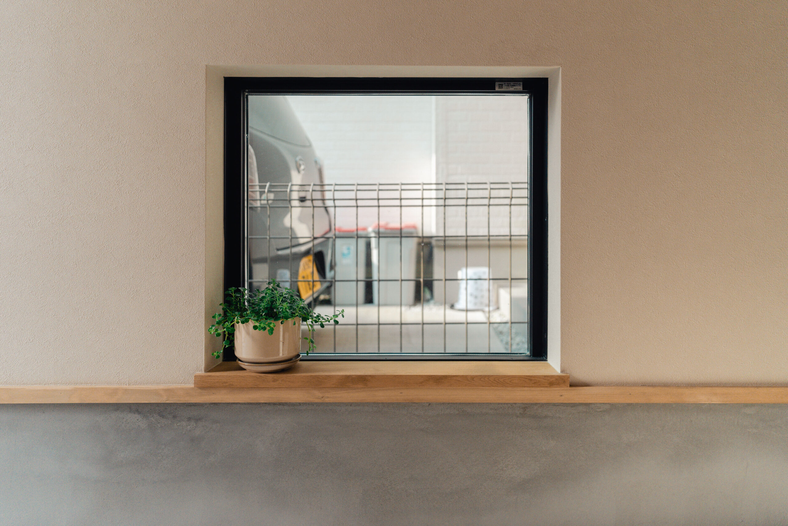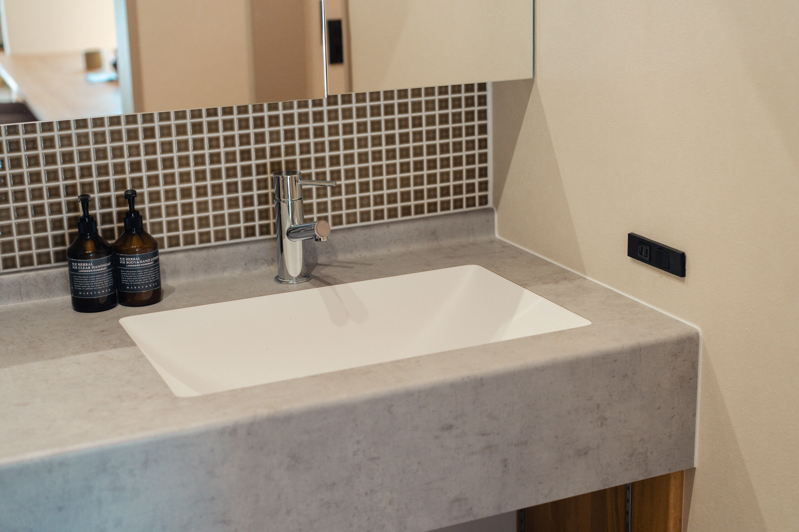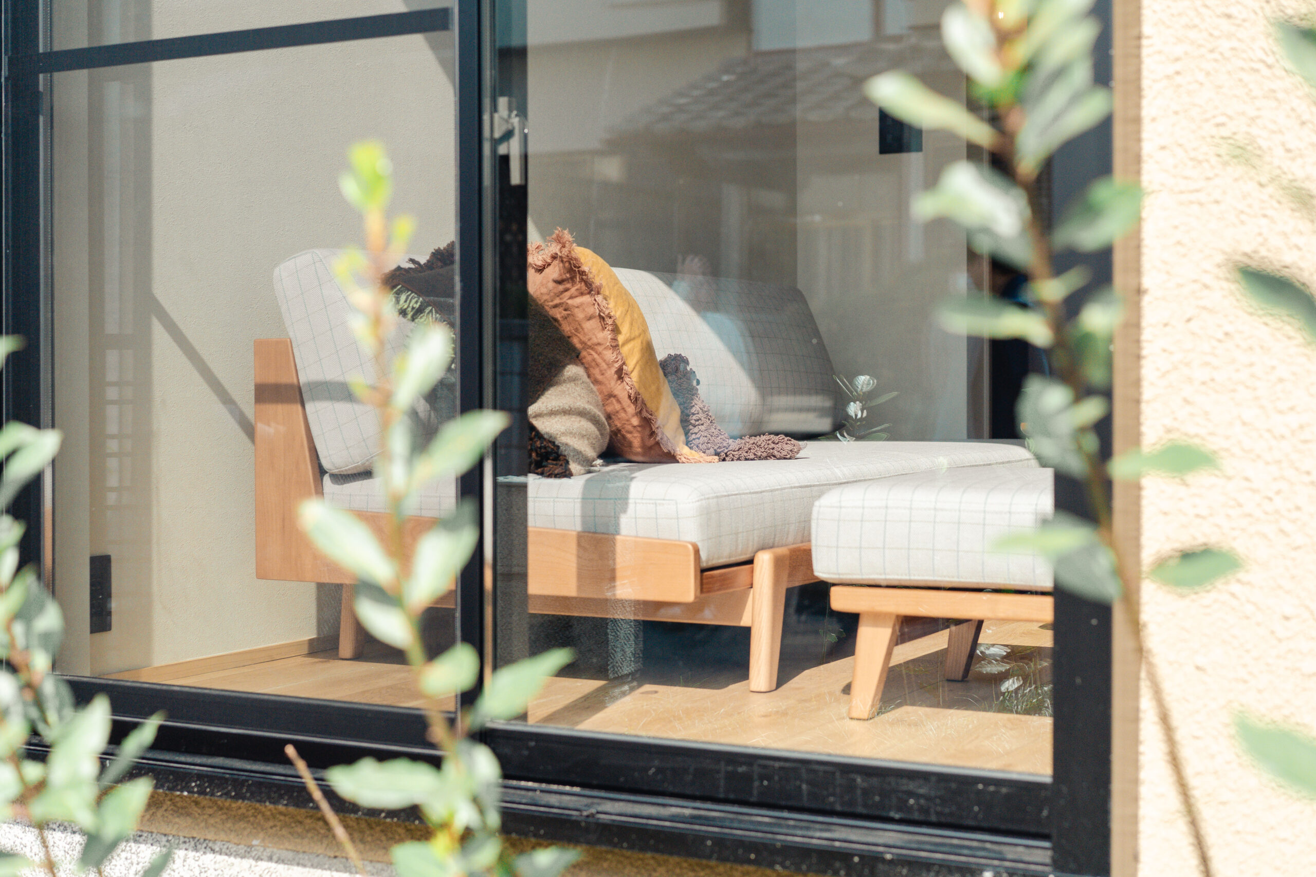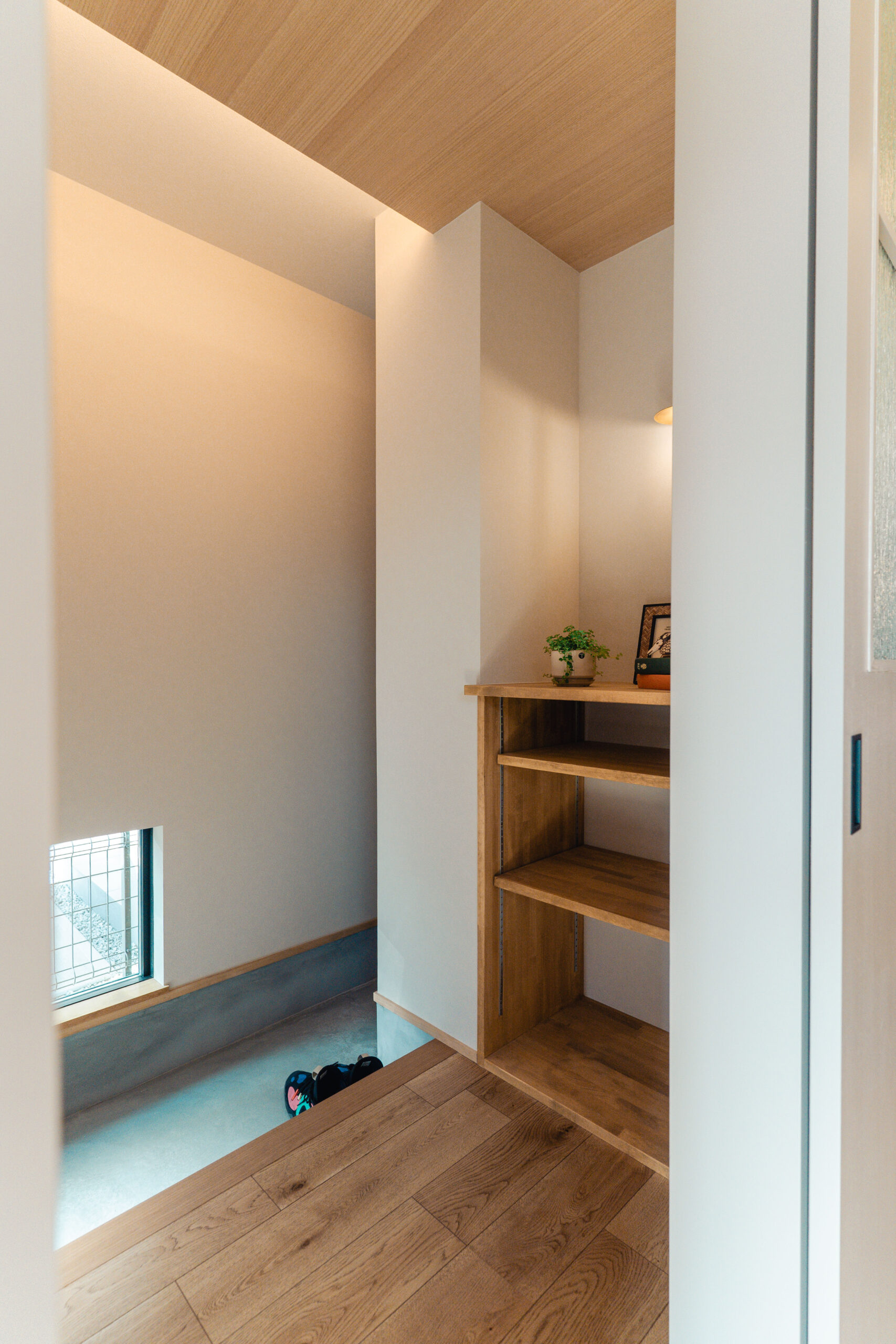 1階のLDKは壁を取り払い、開放的な一体空間に改修。機能性とデザイン性を兼ね備えた造作のコの字型キッチンを中心に据え、グレージュとオーク色を基調とすることで、ナチュラルで上質な印象を演出しています。キッチンの床を一段下げることで、キッチンカウンターで過ごす家族と視線の高さが合い、コミュニケーションが自然と生まれるよう配慮しました。キッチンは使い手の生活をイメージし、オーダーメイドで制作したことで、使い勝手の良い空間となっています。キッチン横には大容量のパントリーを設け、食料品などをすっきり収納できるようにしています。見せる収納と隠す収納を明確に分けることで、暮らしにメリハリをもたらしています。家族が自然と集まる快適な空間となっています。