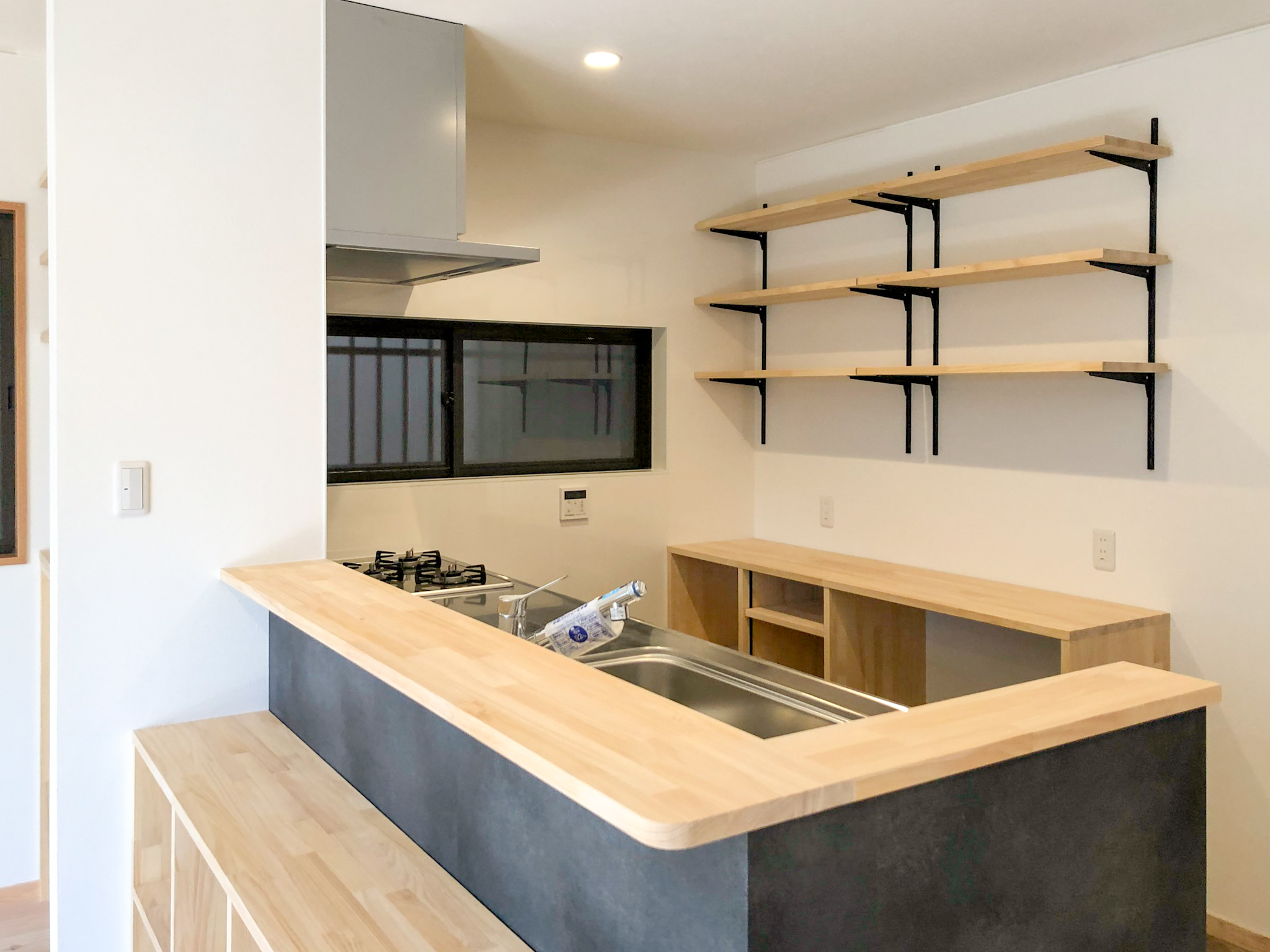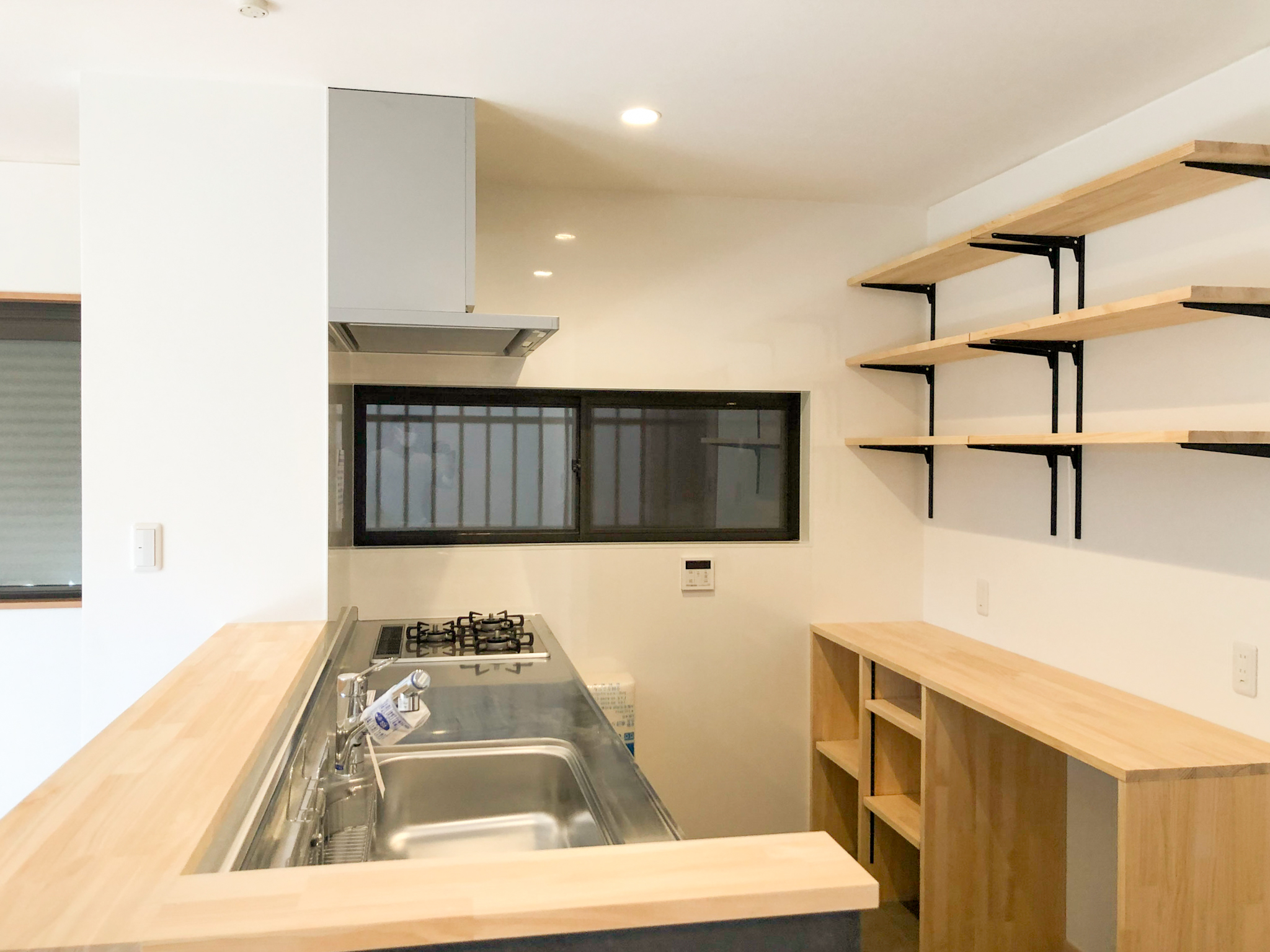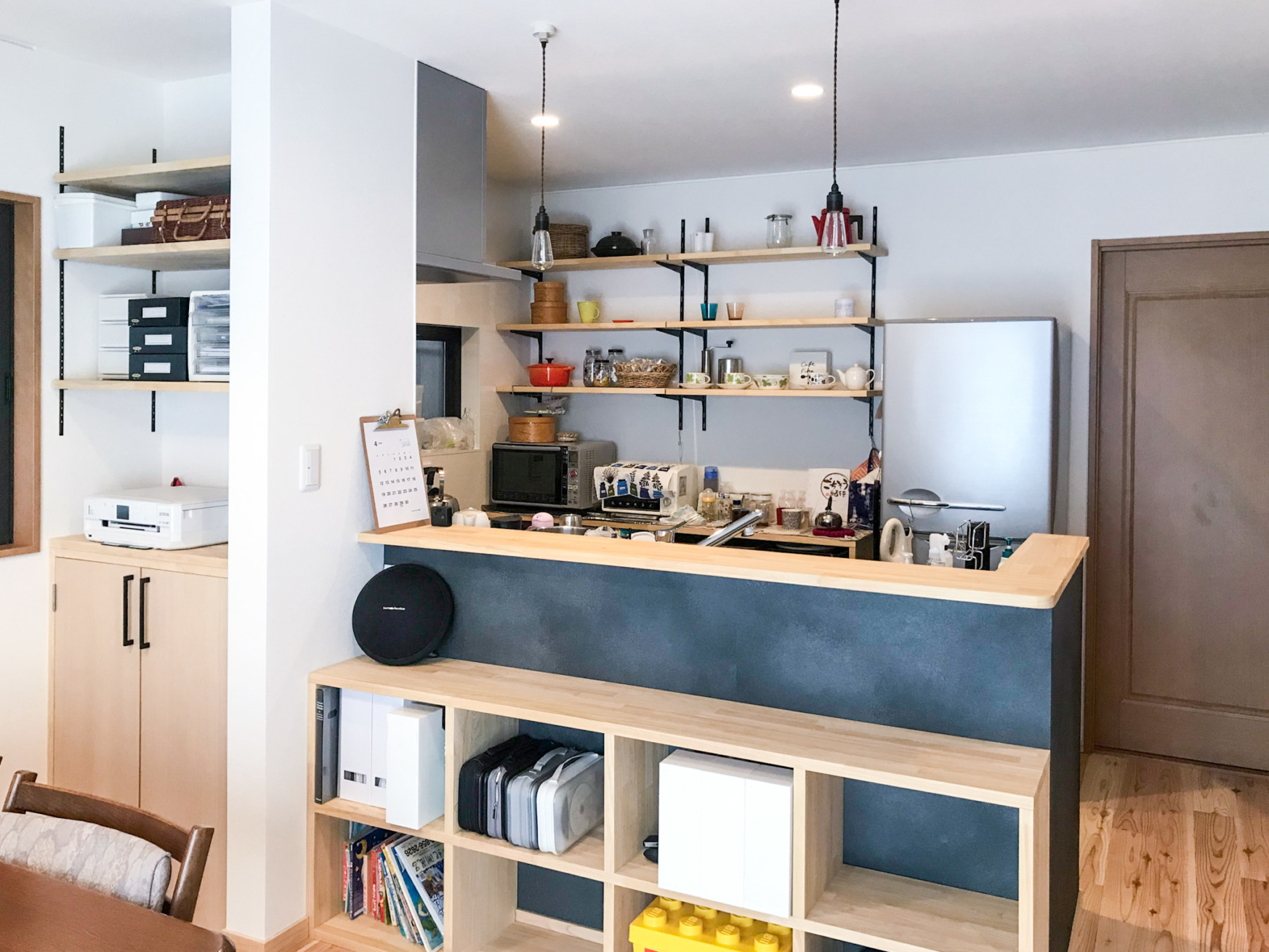 もともとあったキッチンの配置を変え、まだ小さなお子様を見守りながら家事ができるよう対面式に変更し、背面、全面共に多め棚は収納とインテリアを楽しむ飾り棚に。