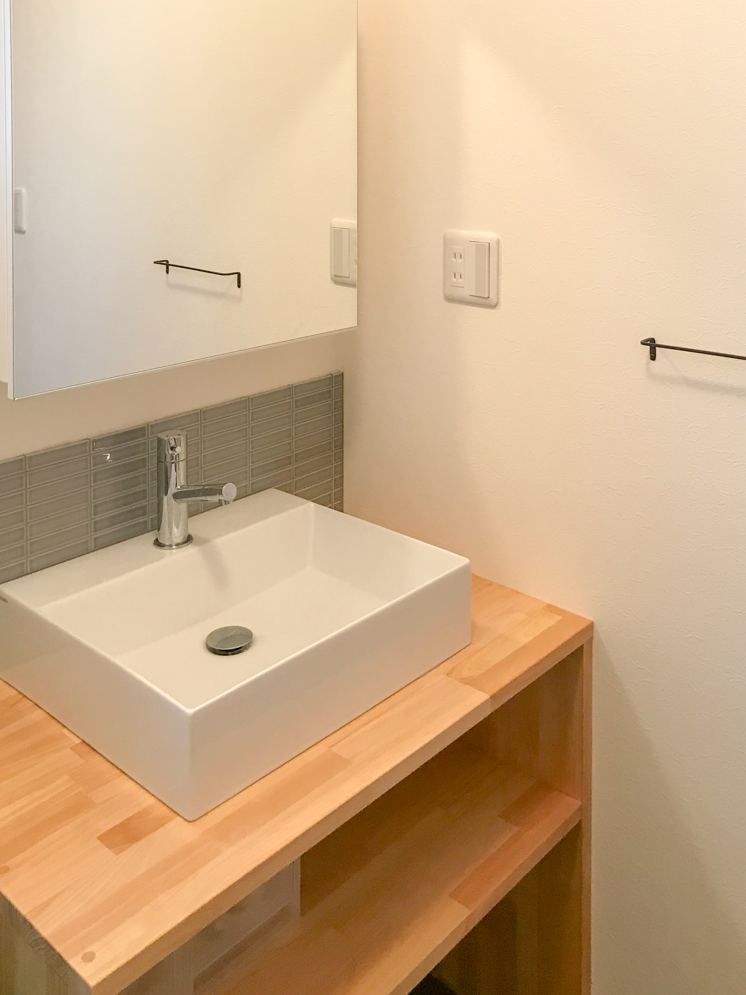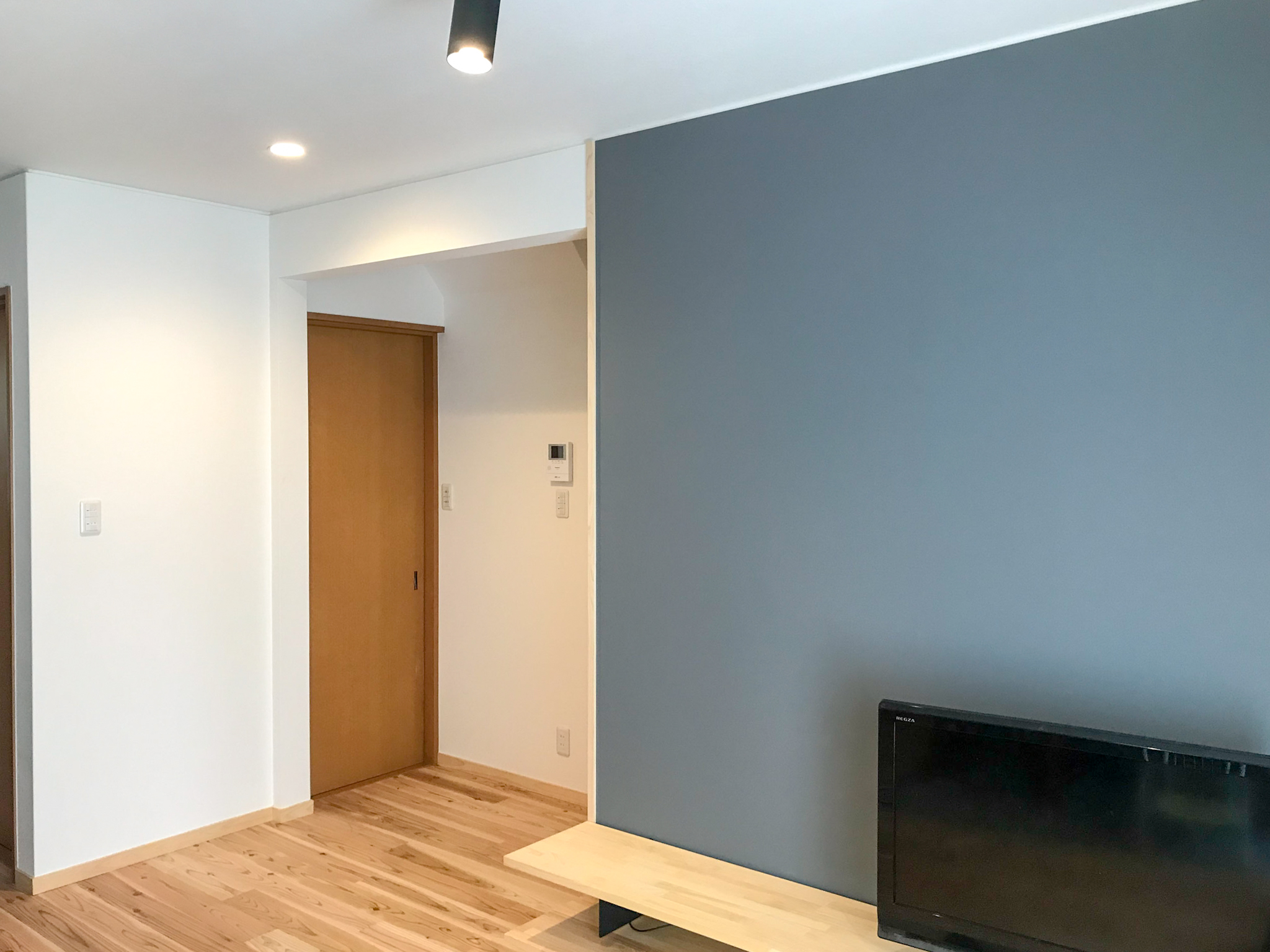 アクセント壁には、塗り壁調のクロスとグレーのクロスを使用し、モダンなカッコイイ印象に仕上げています。