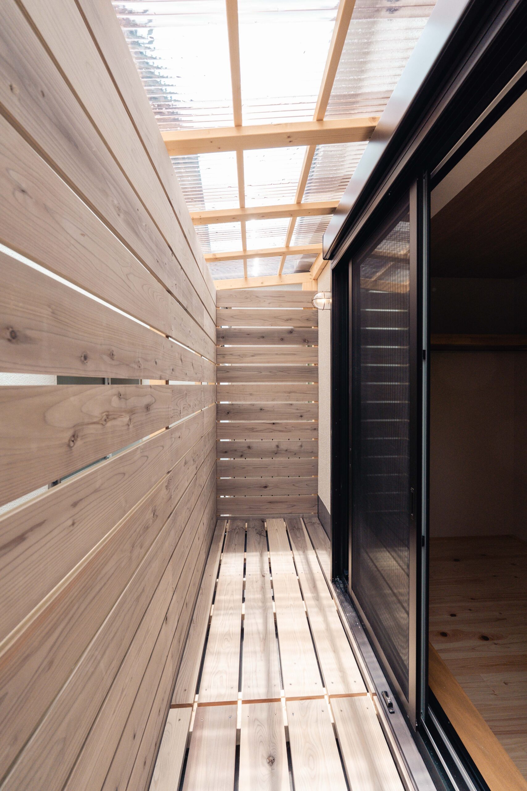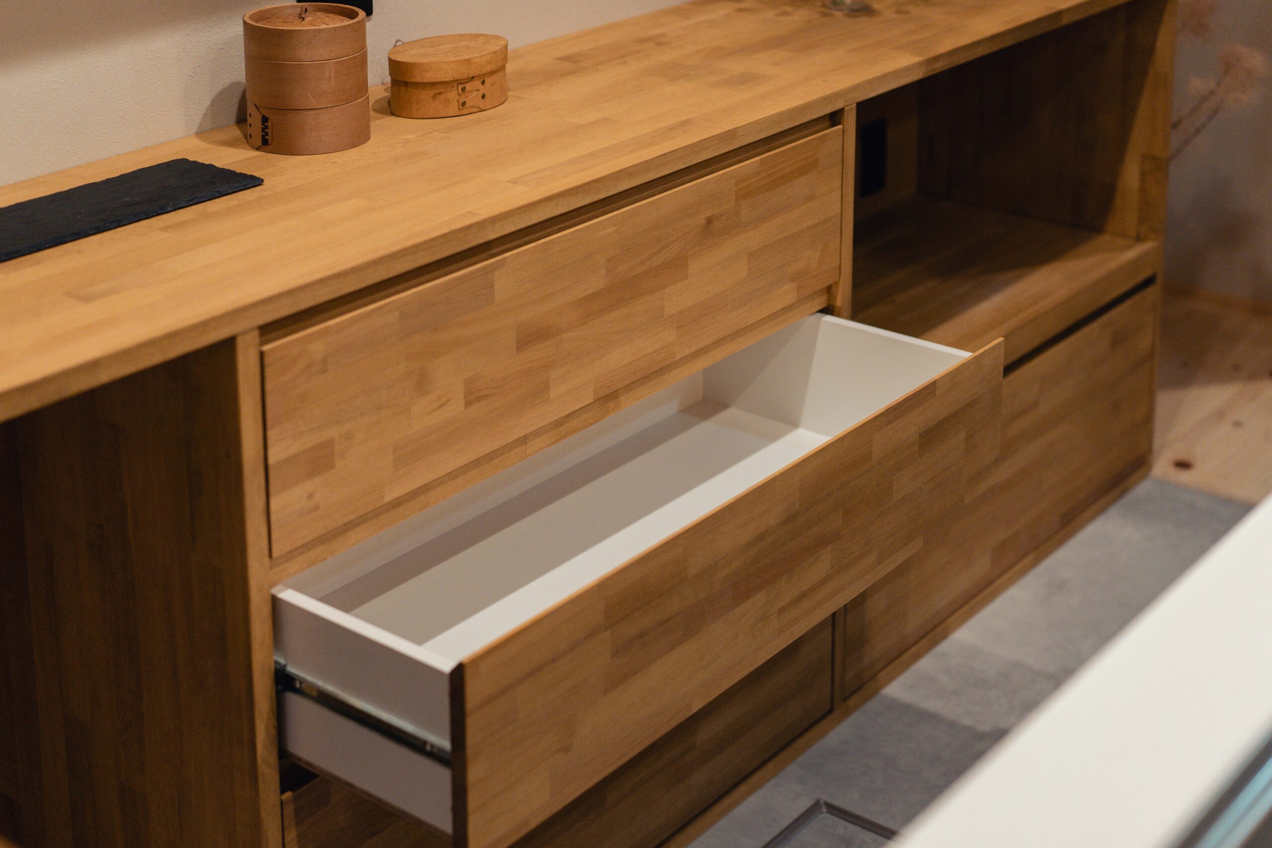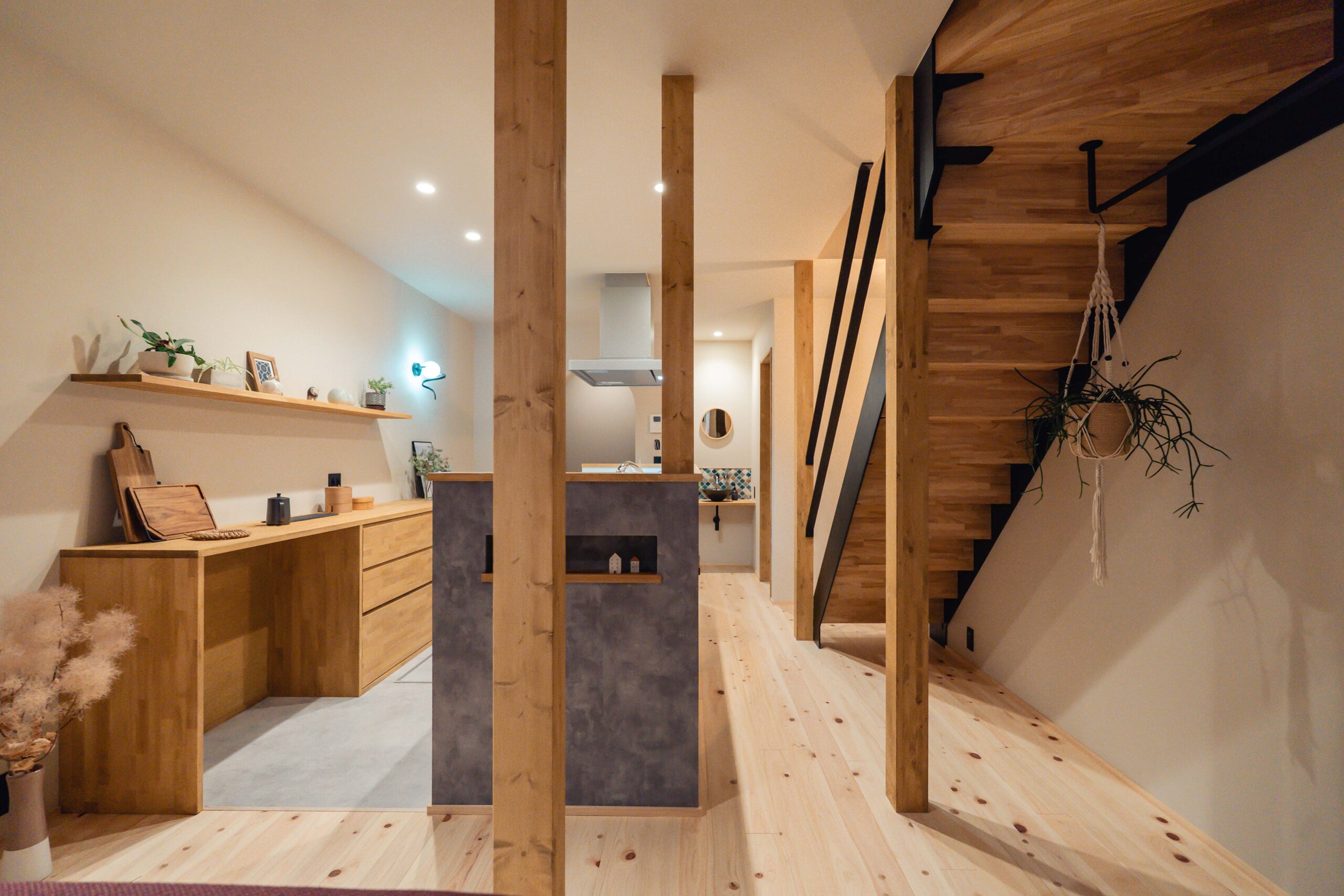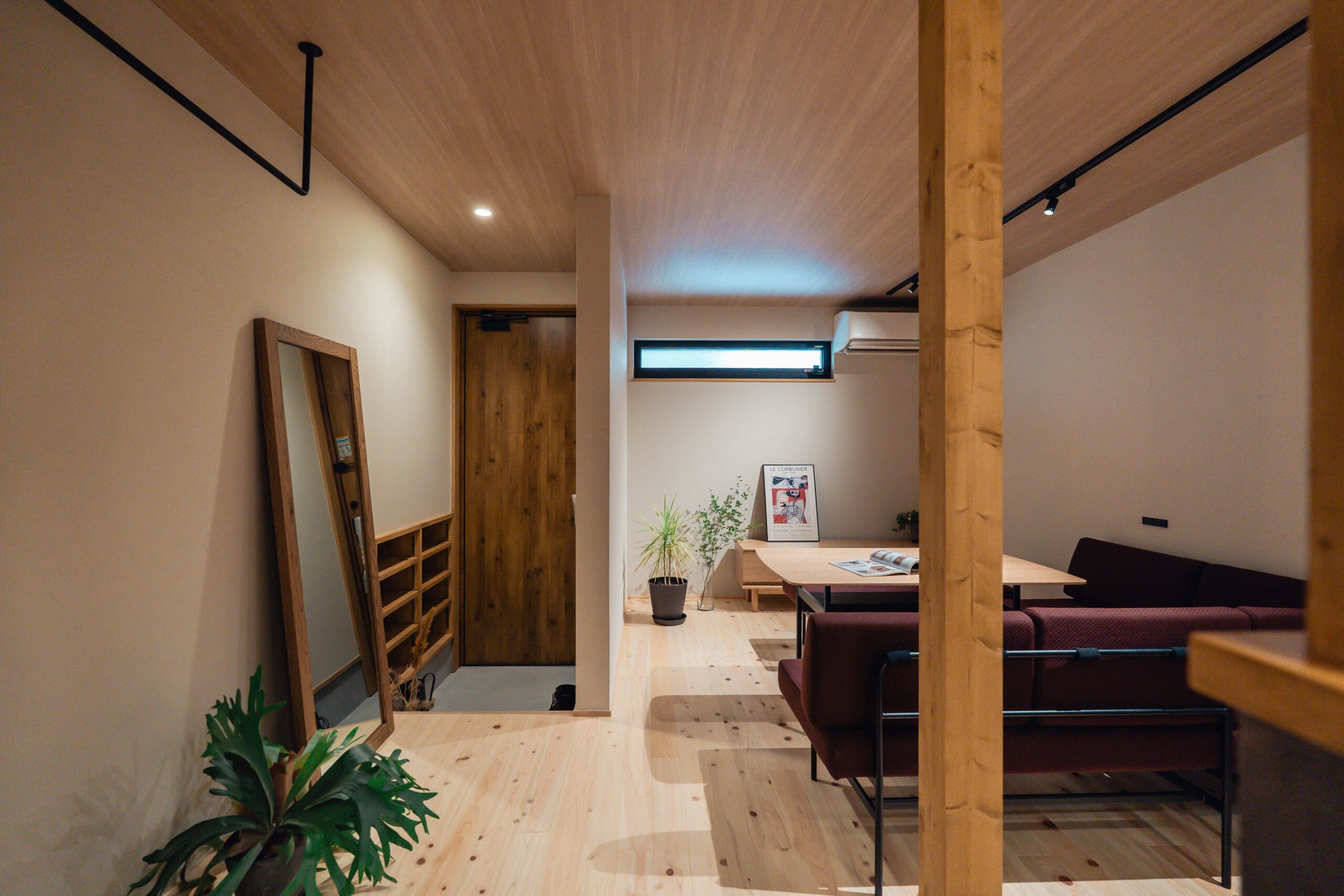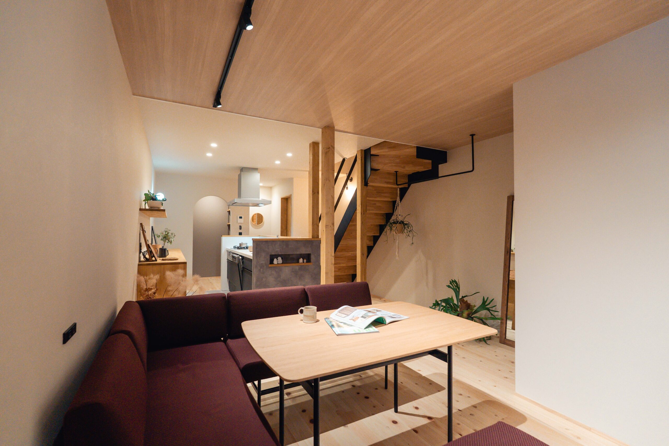 壁をできるだけ取り払い、LDKをひとつながりにすることで、木目の天井と無垢床が連続し、視線が奥まで抜ける伸びやかな空間が生まれました。
