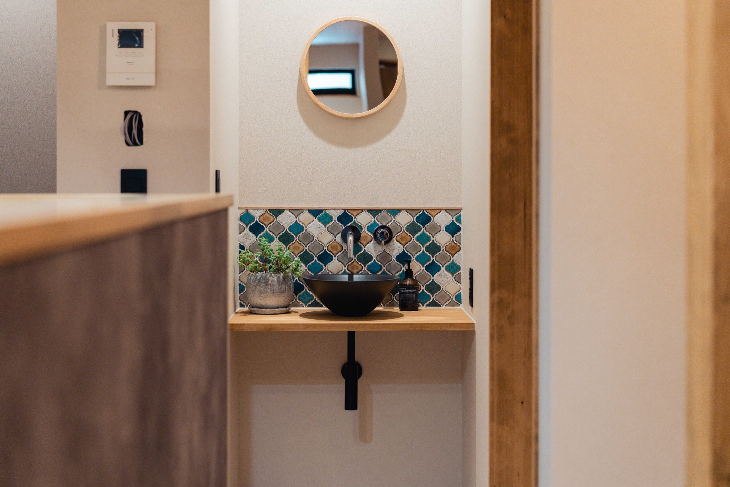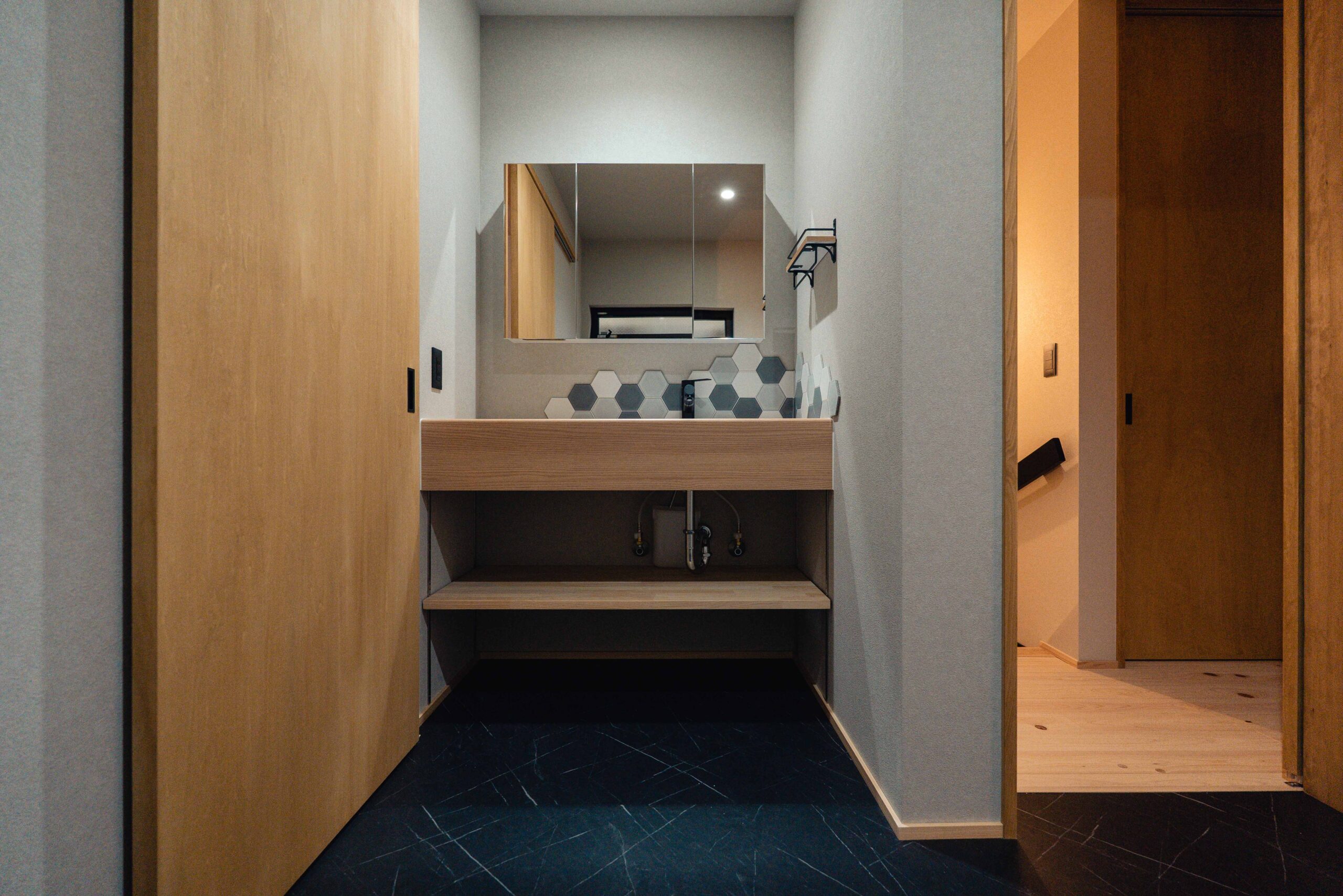 洗面スペースには造作カウンターと六角タイルを取り入れ、機能性の中にさりげない個性を添えています。