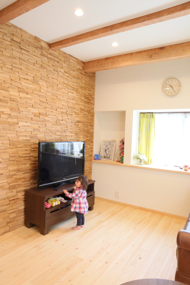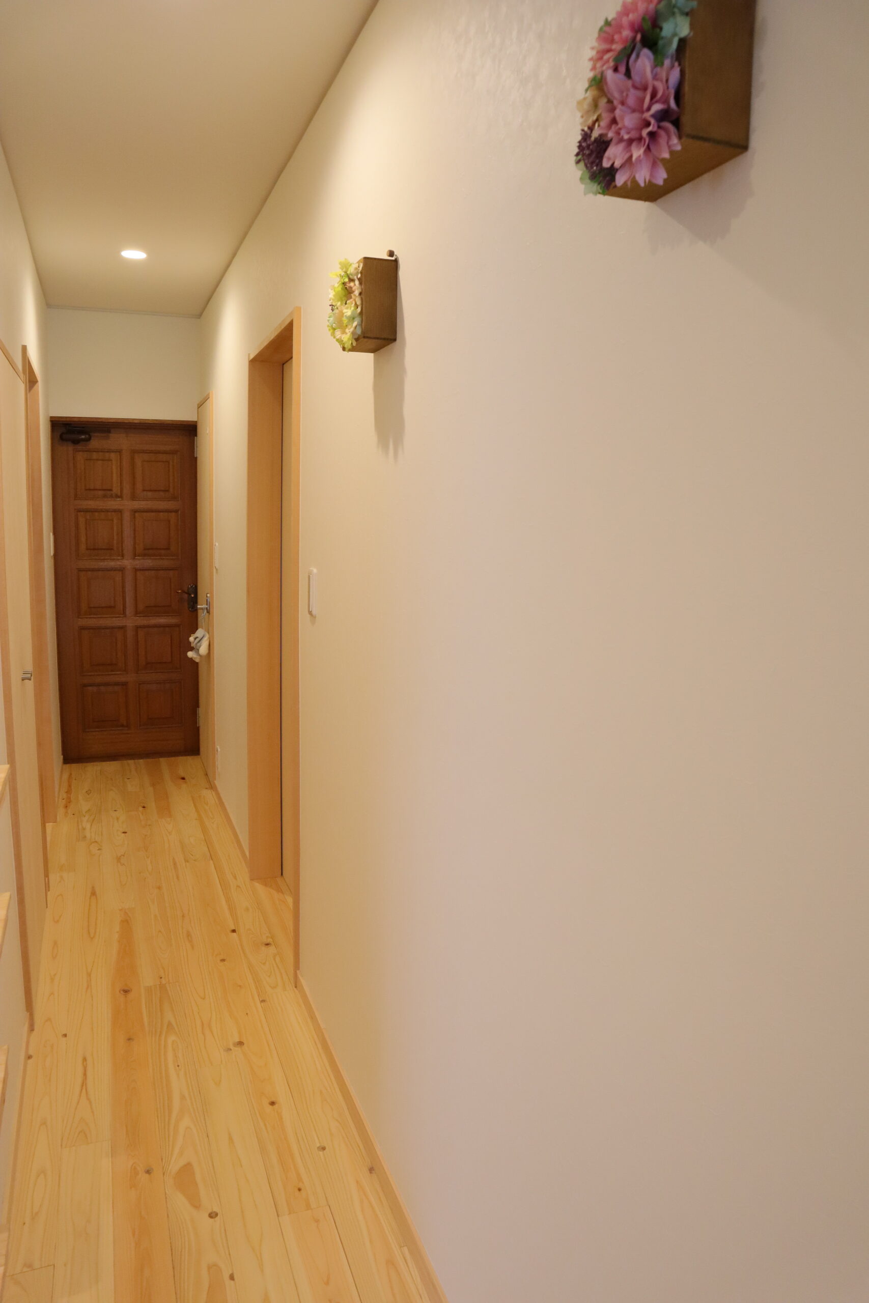 築33年の2世帯戸建ての子世帯部分をリノベーションしました。区切られていた壁を取っ払ったり、天井を高くすることで広さを確保しました。全体的に無垢の素材を使用し、木の温もり、香りを楽しめる優しさを感じる空間になりました。造作食器棚は、天井までの大容量の収納があり、扉を閉めればスッキリと出来ます。生活の様子を伺った際は、笑顔で温かく迎えてくださりありがとうございました。