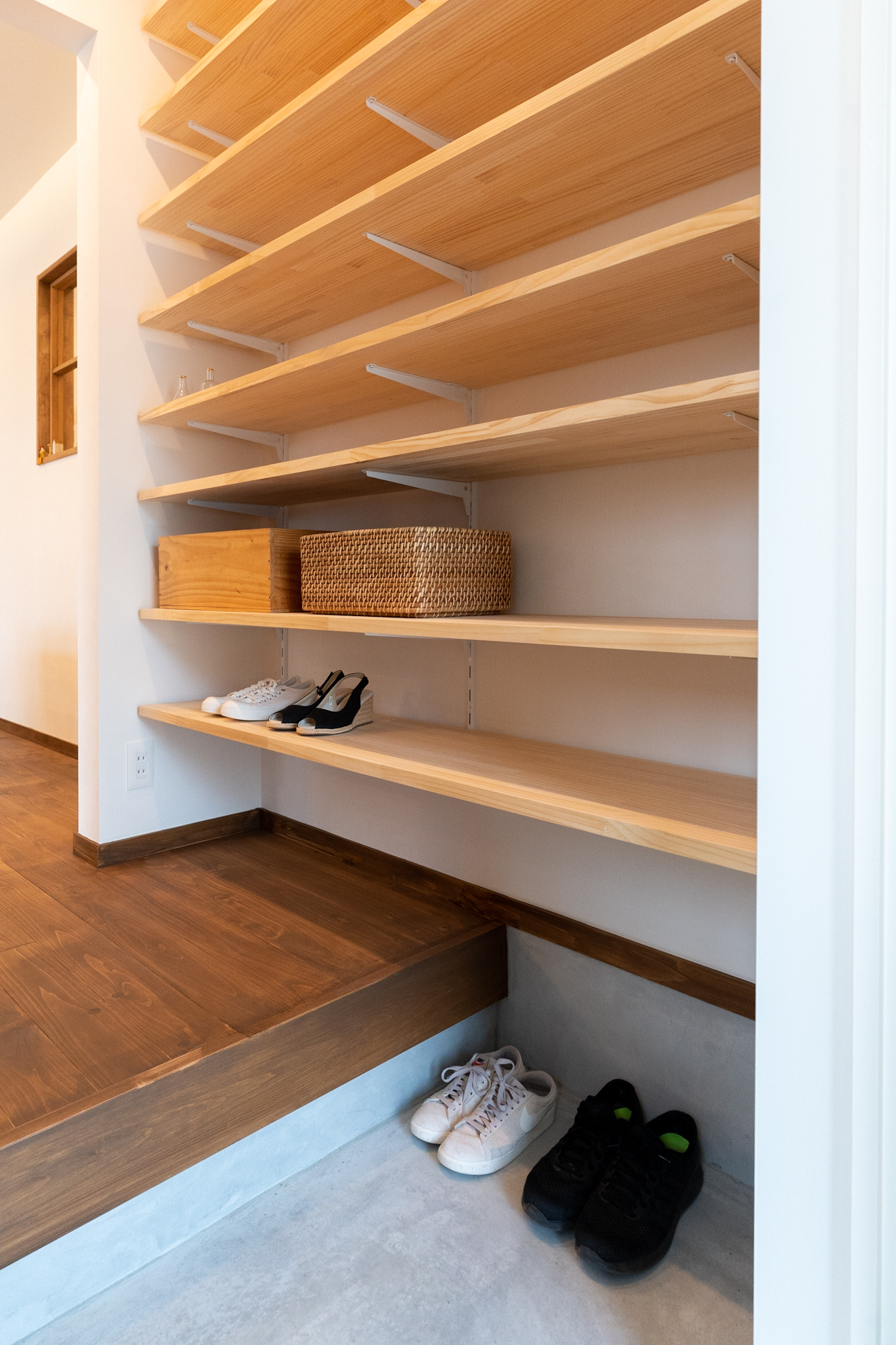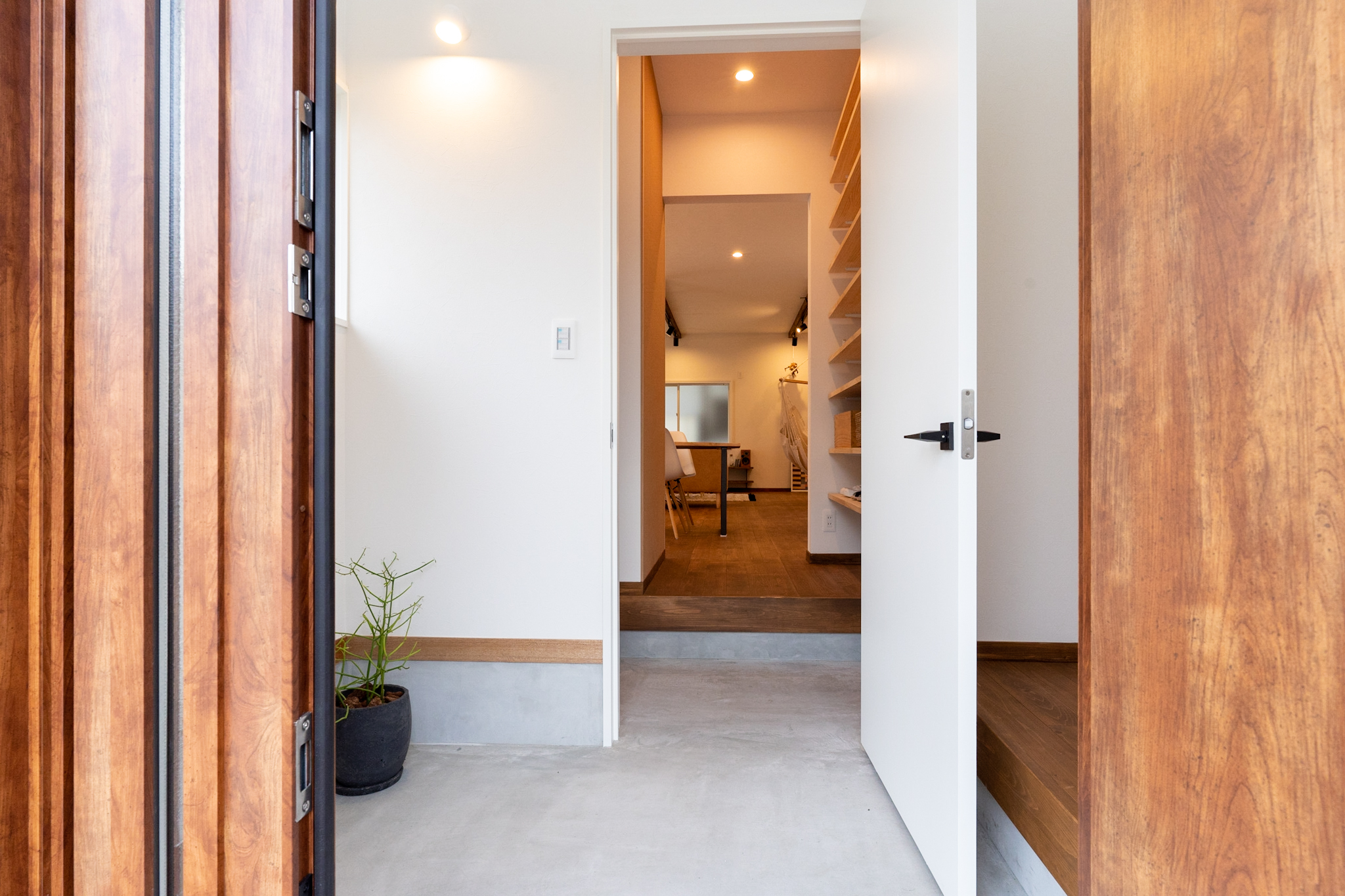 玄関はお客様用と家族用の玄関土間スペースのある2WAY。すぐにキッチンへ繋がり買い物後の荷物の持ち運びもラクラクです。