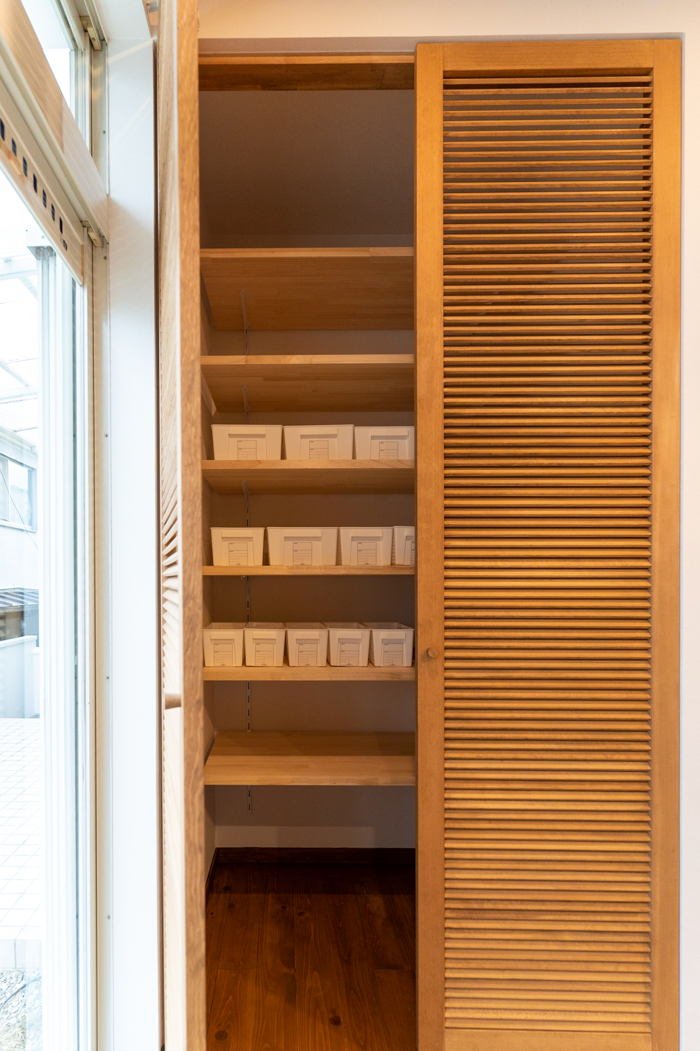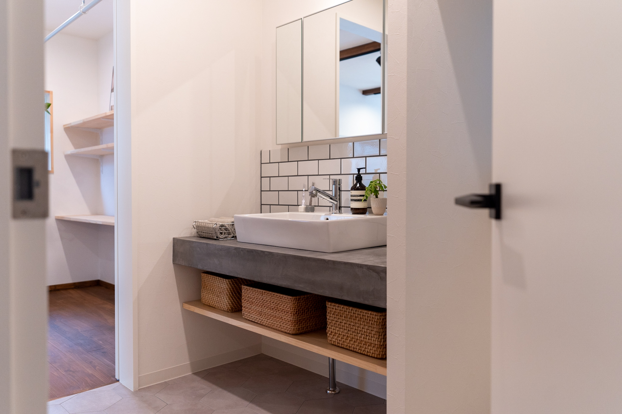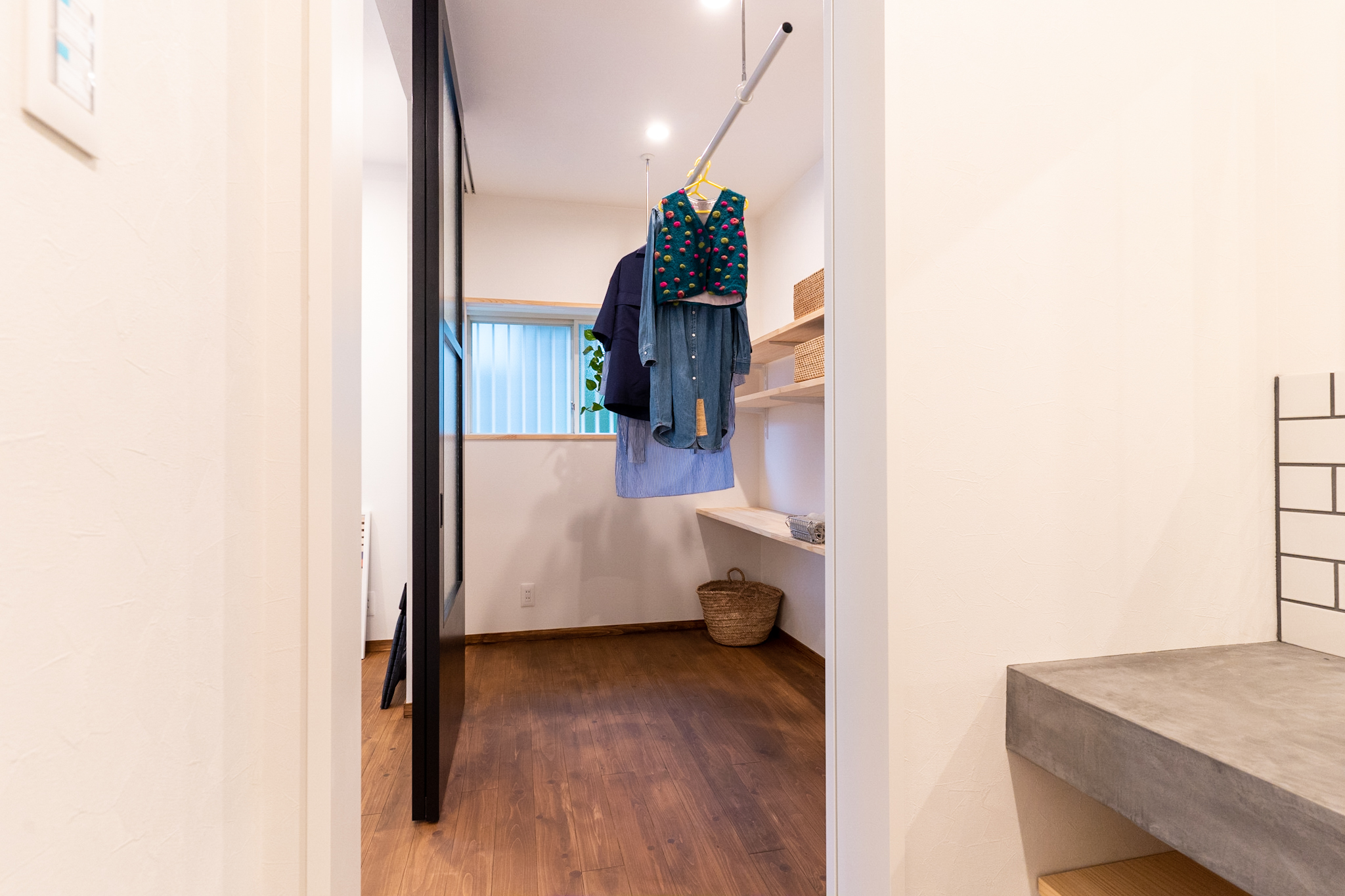 また日々の家事の負担が減らせるよう、洗濯は『洗う→干す→しまう』がスムーズにできる広々としたランドリースペースがLDKと繋がり、グルグルと回遊できます。必要に応じてドアを開閉できるので、スッキリとごちゃつきも気にならないようにしています。